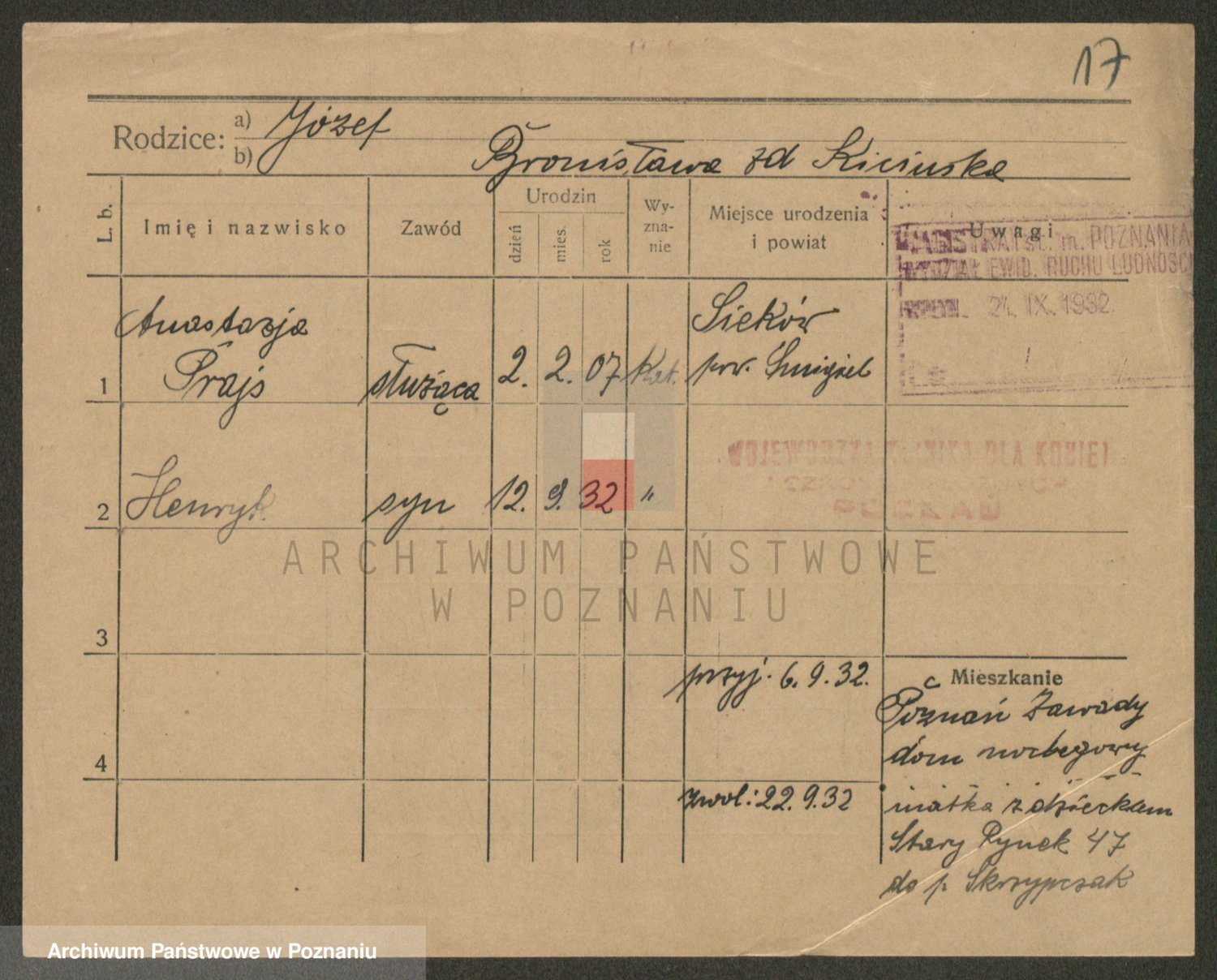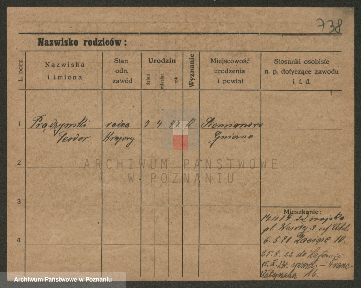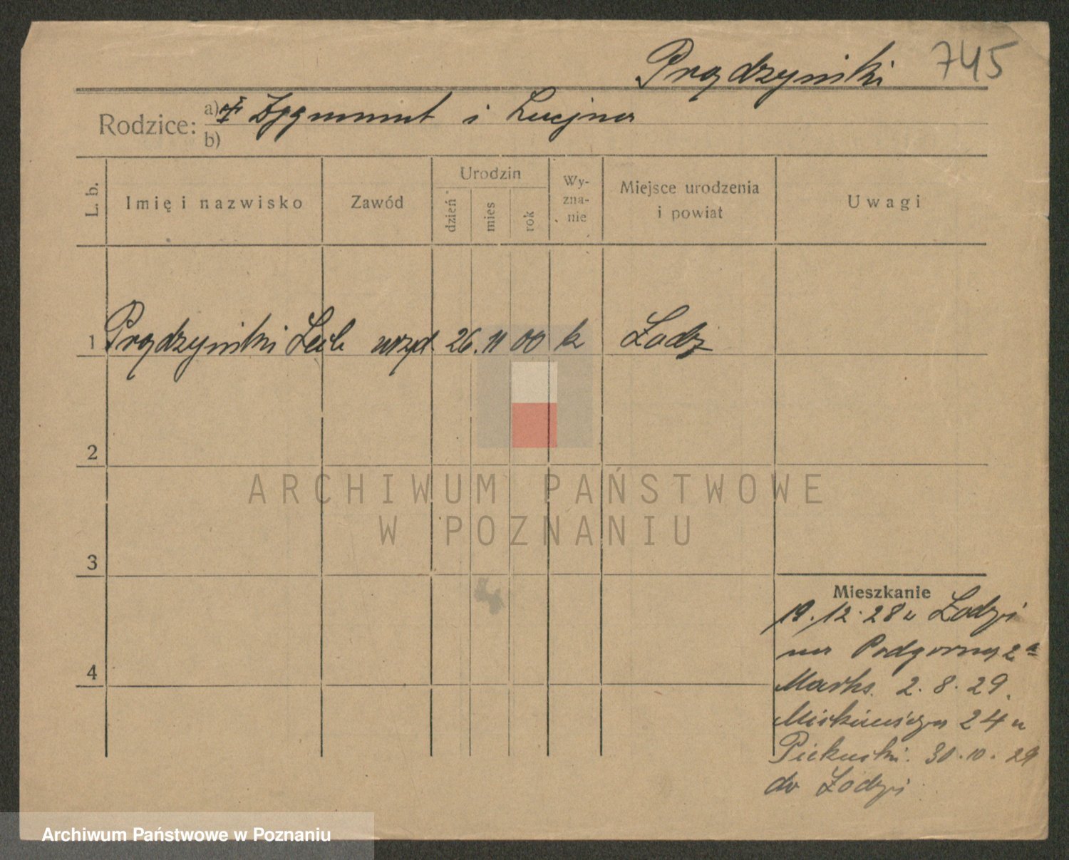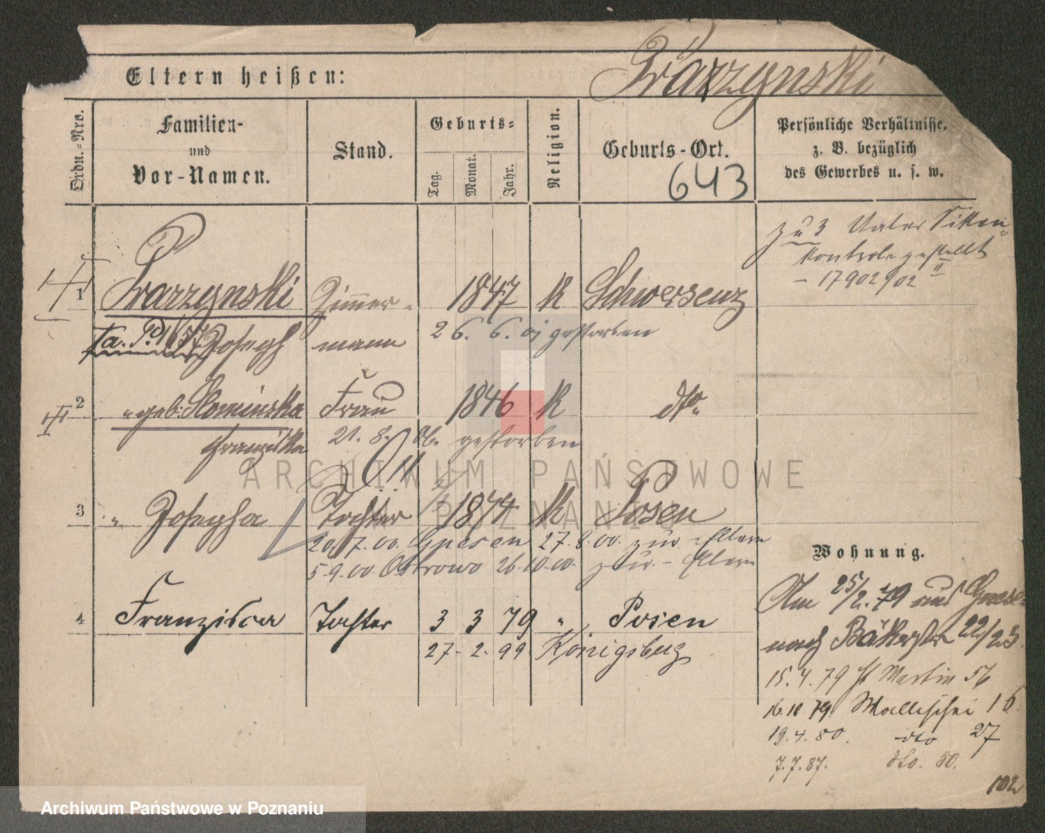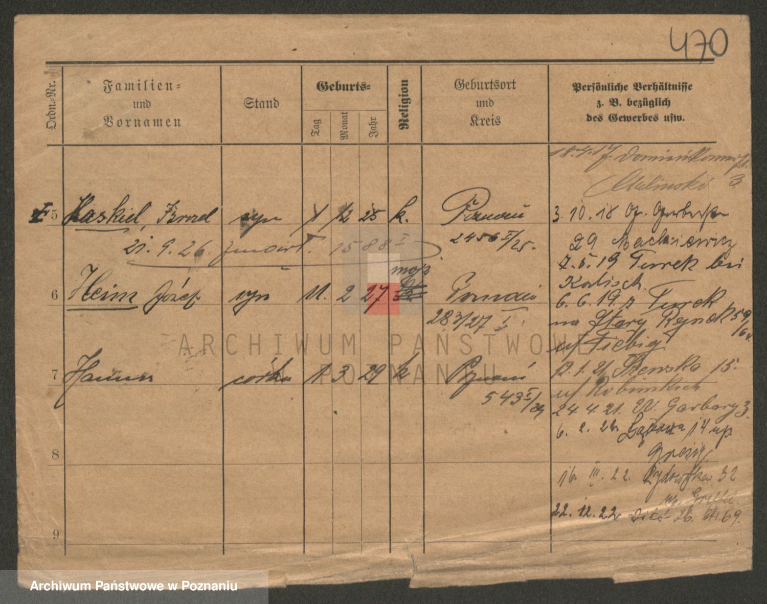 Podgląd karty osobowej dostępny jest po kliknięciu na nazwisko lub ikonkę karty. Można dokonywać powiększenia (ikony na górze) lub przechodzić między kolejnymi skanami (strzałki po bokach).