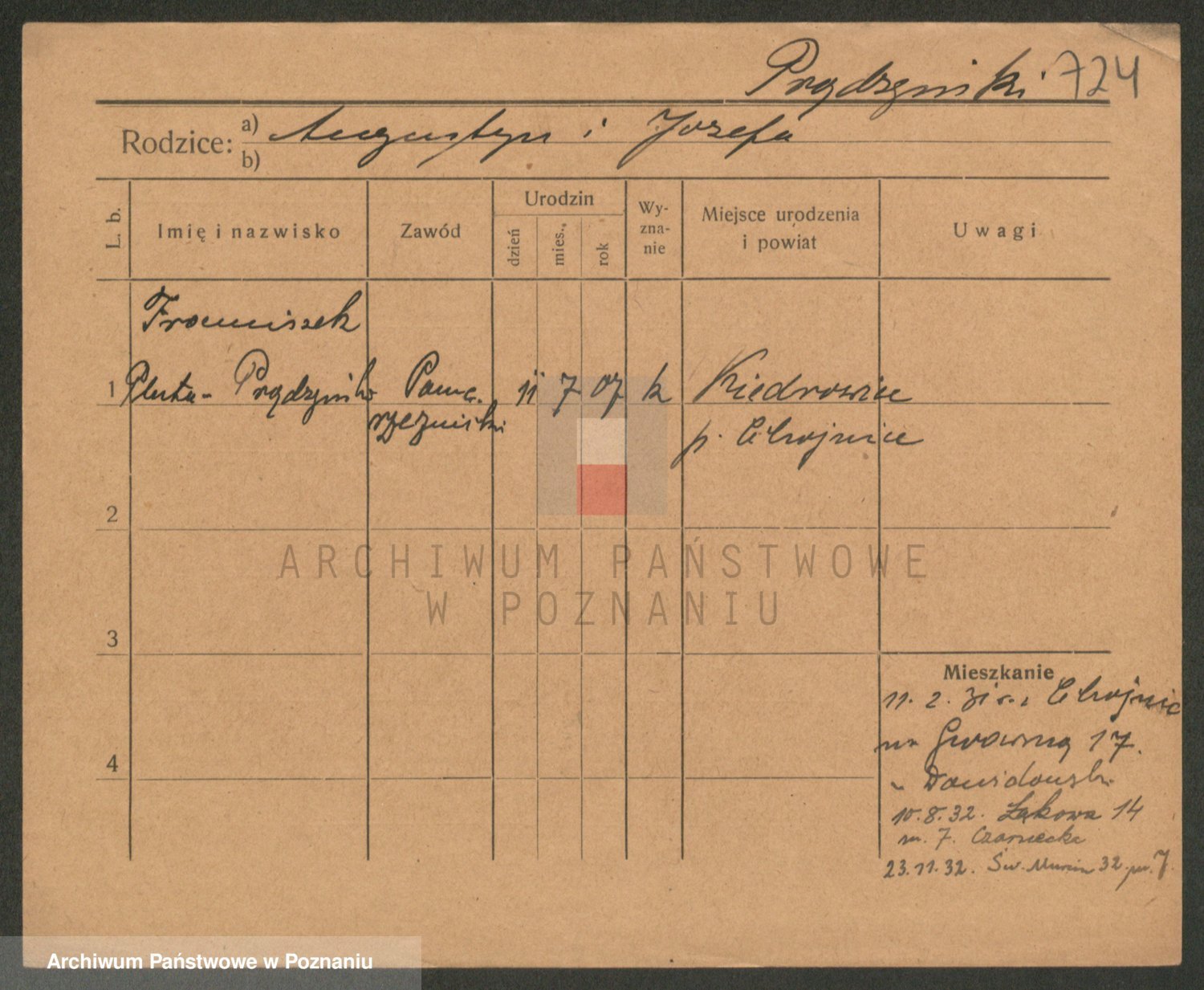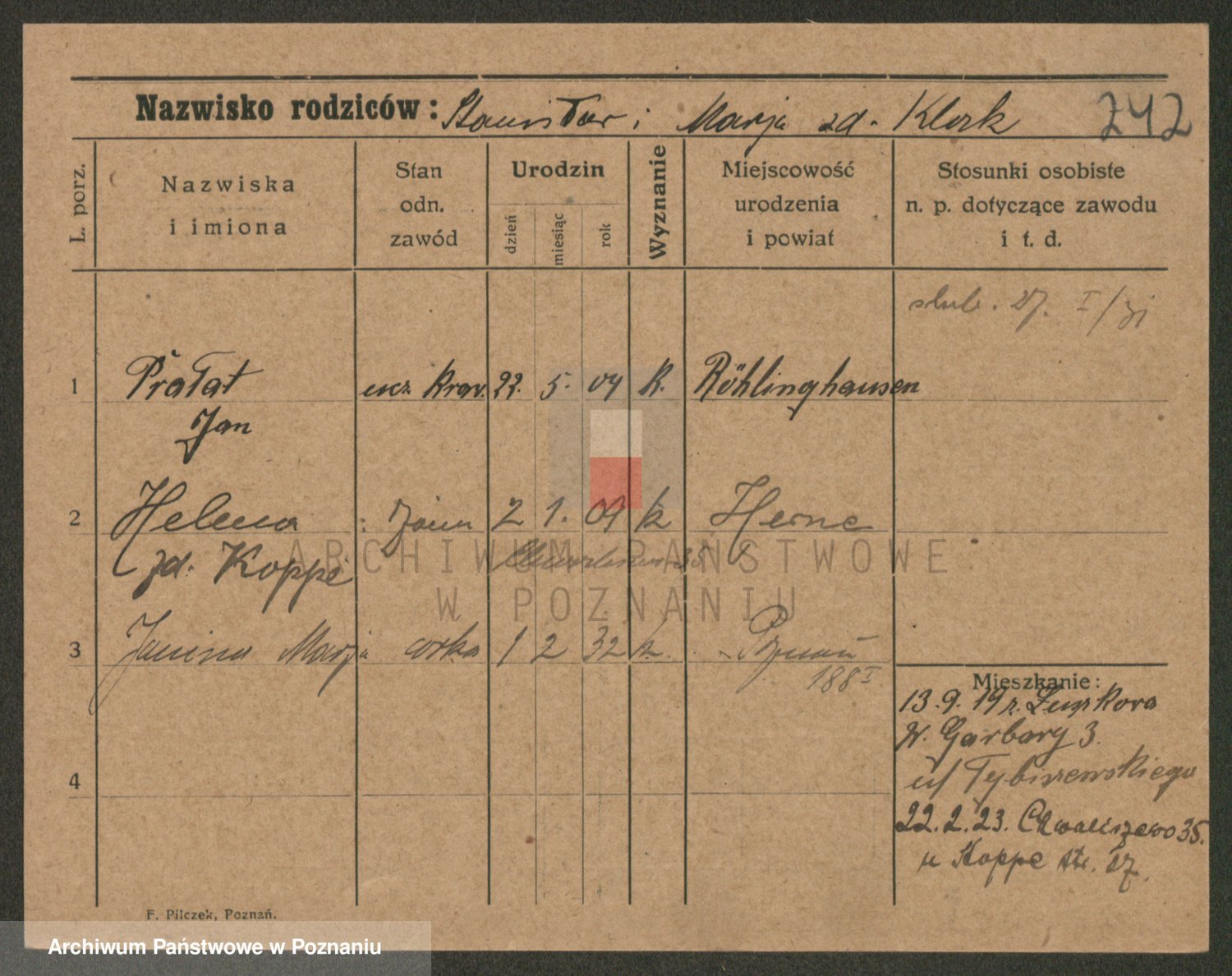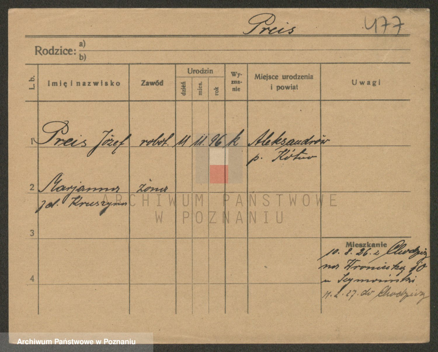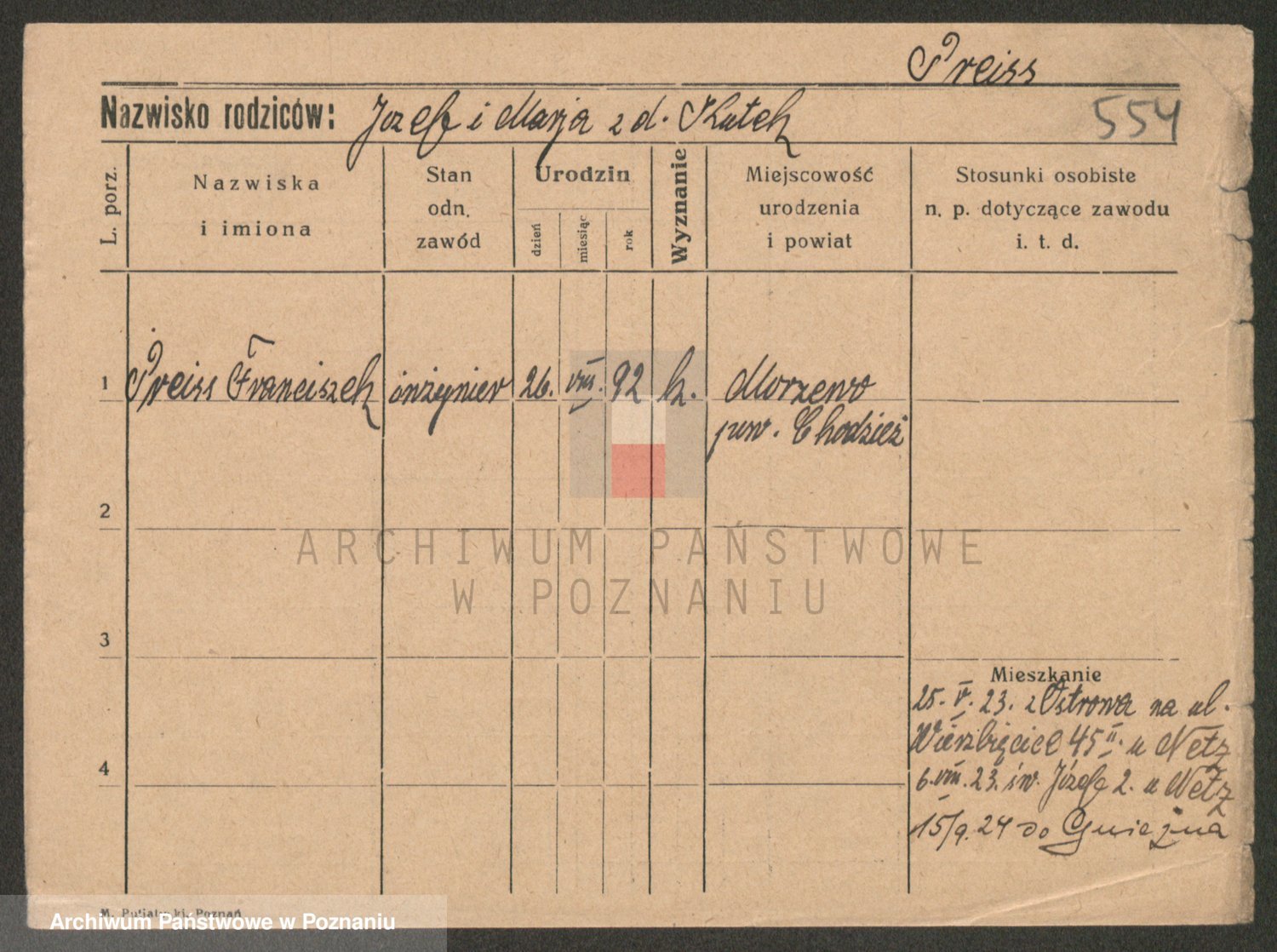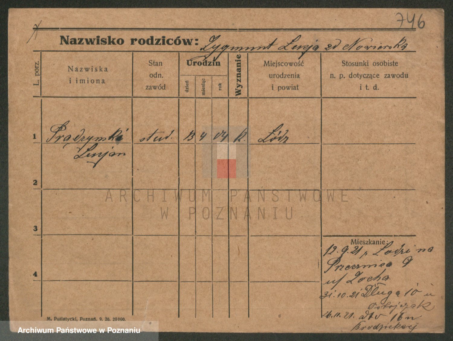 Podgląd karty osobowej dostępny jest po kliknięciu na nazwisko lub ikonkę karty. Można dokonywać powiększenia (ikony na górze) lub przechodzić między kolejnymi skanami (strzałki po bokach).