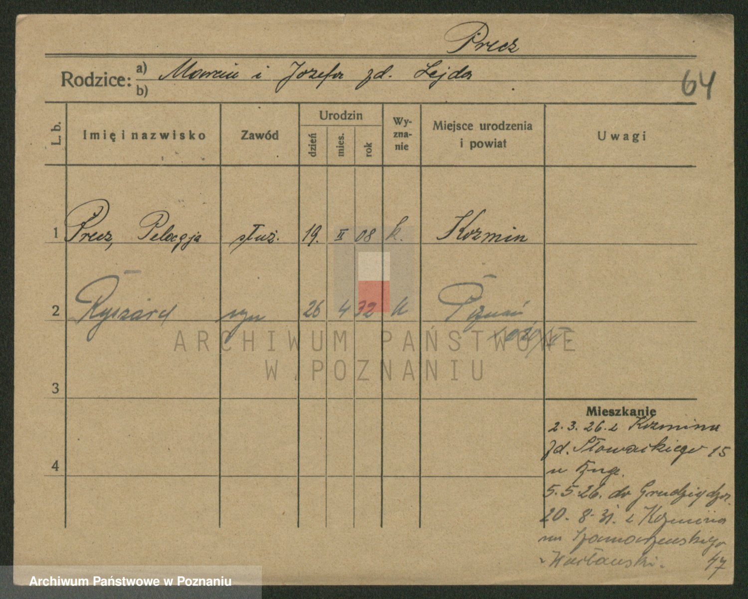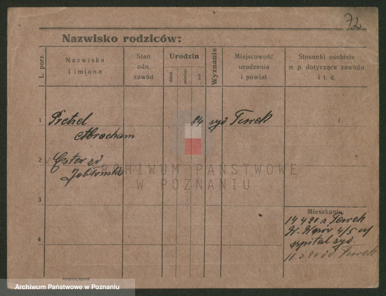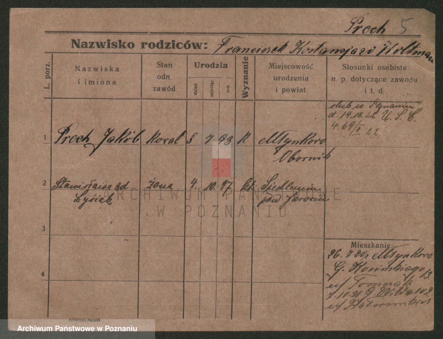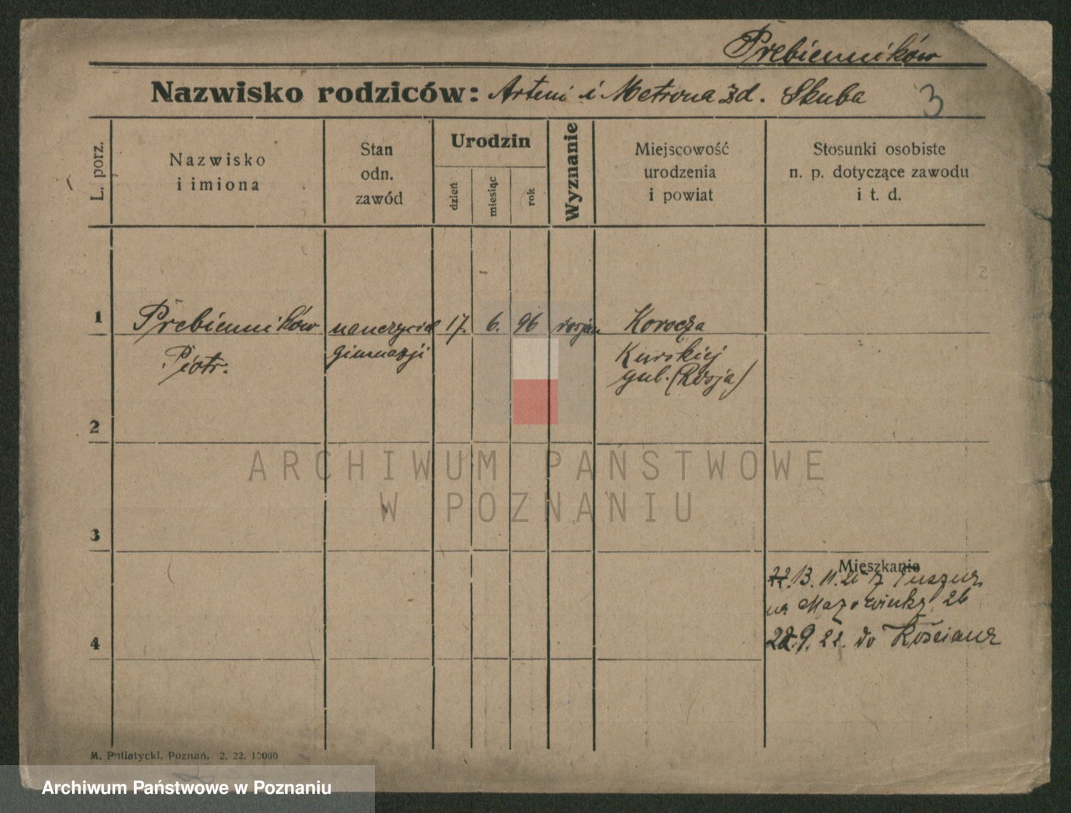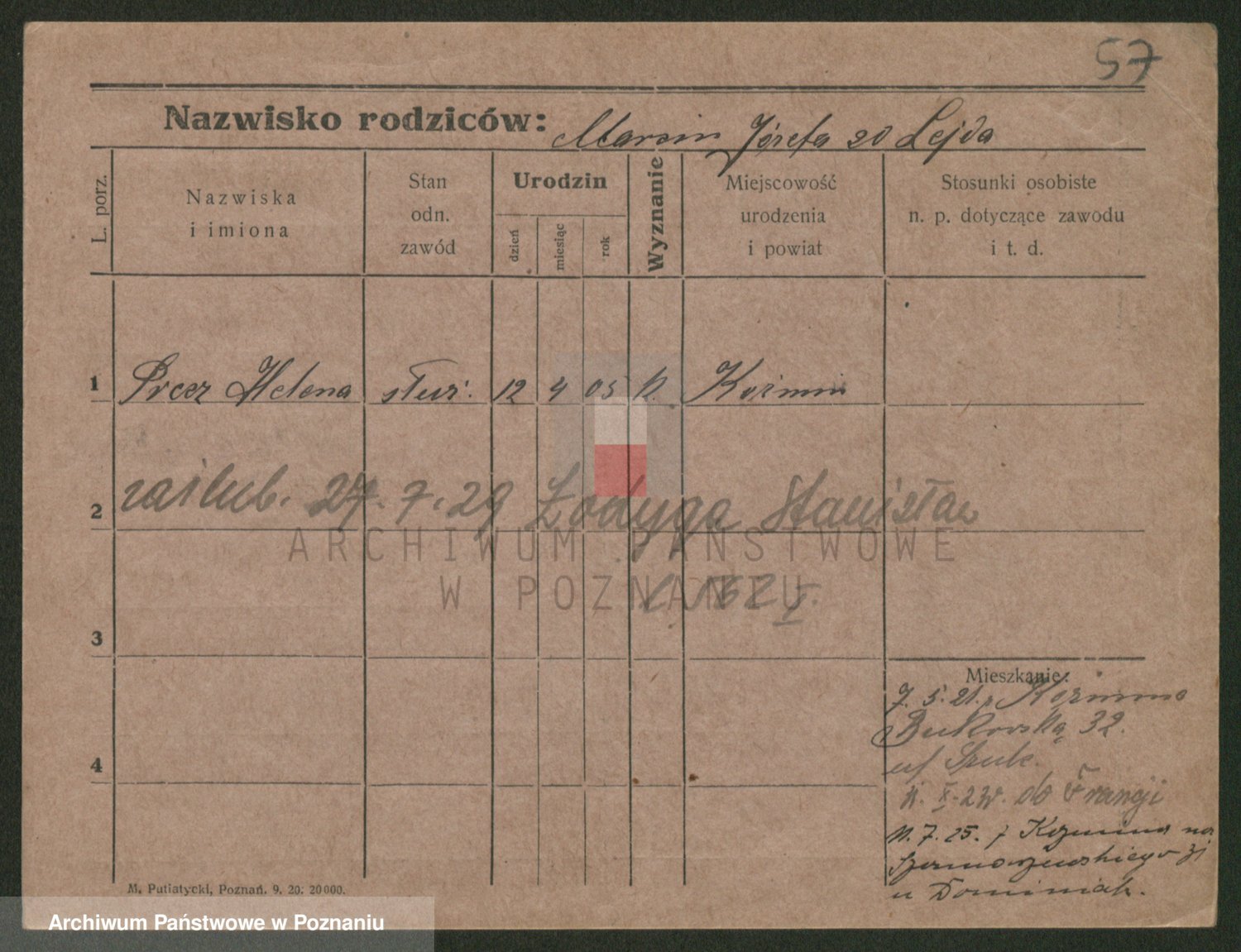 Podgląd karty osobowej dostępny jest po kliknięciu na nazwisko lub ikonkę karty. Można dokonywać powiększenia (ikony na górze) lub przechodzić między kolejnymi skanami (strzałki po bokach).