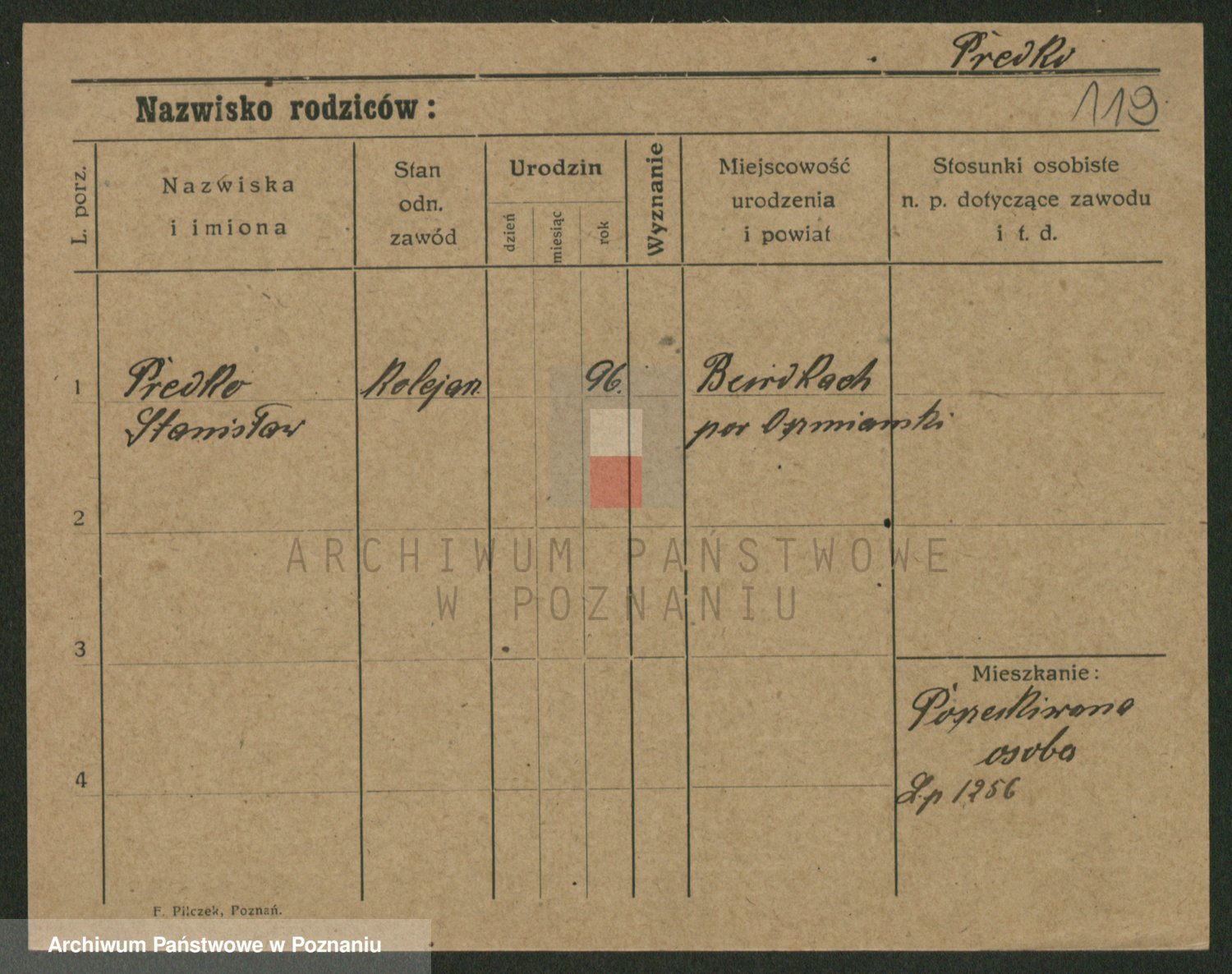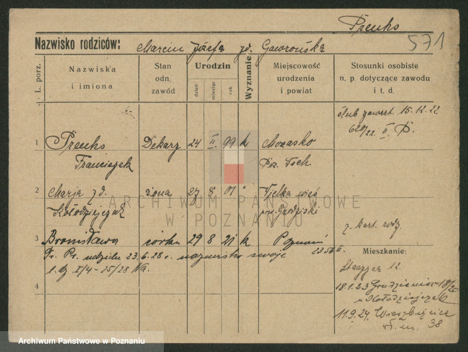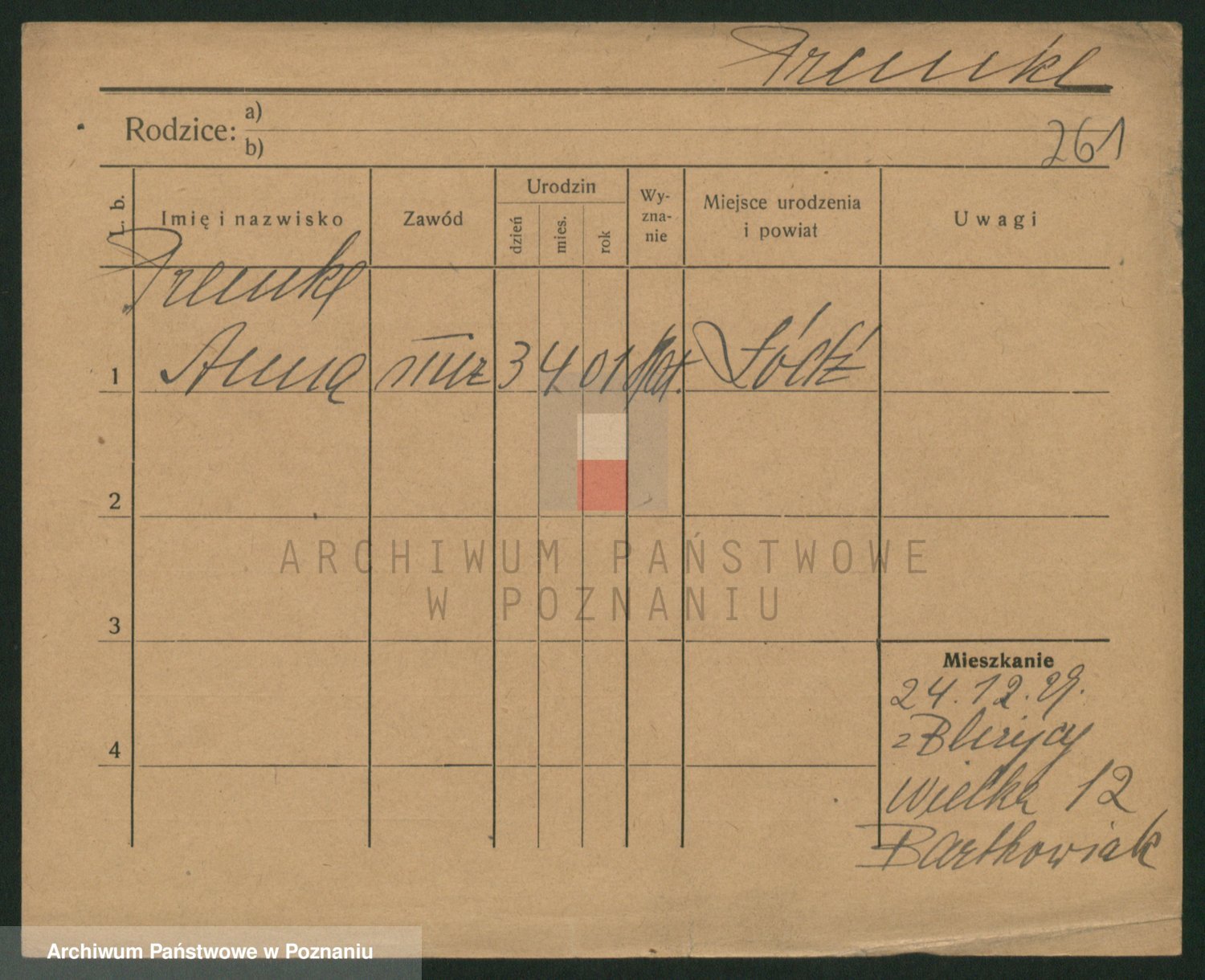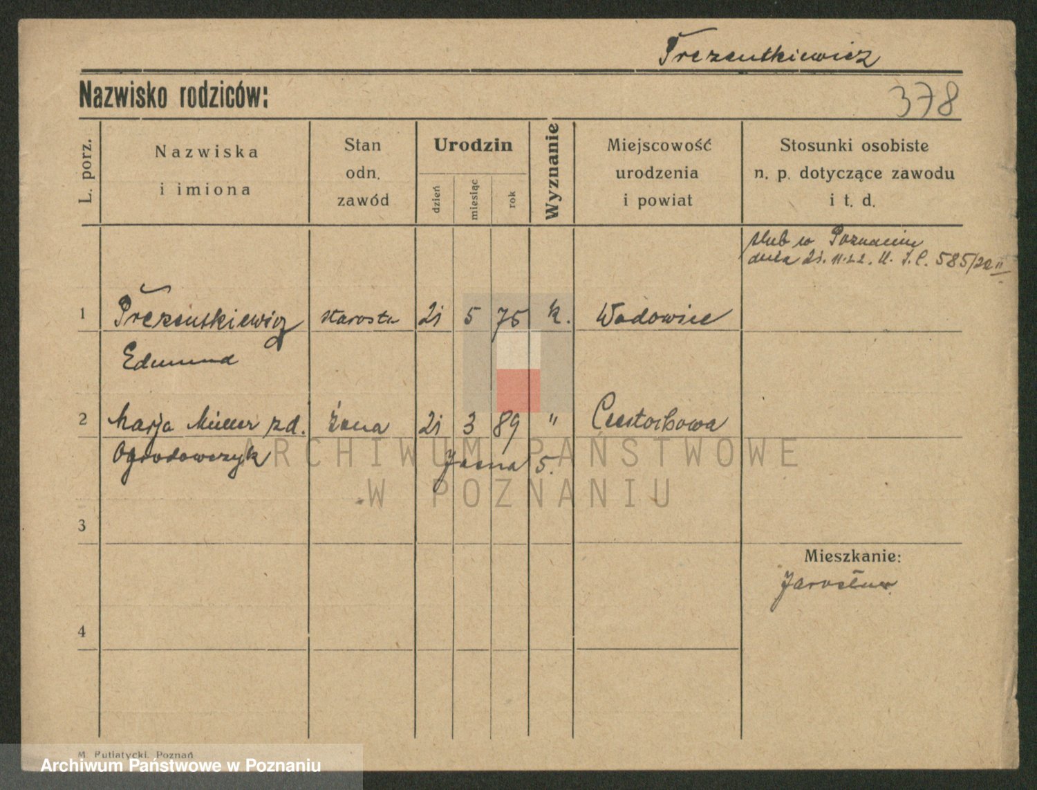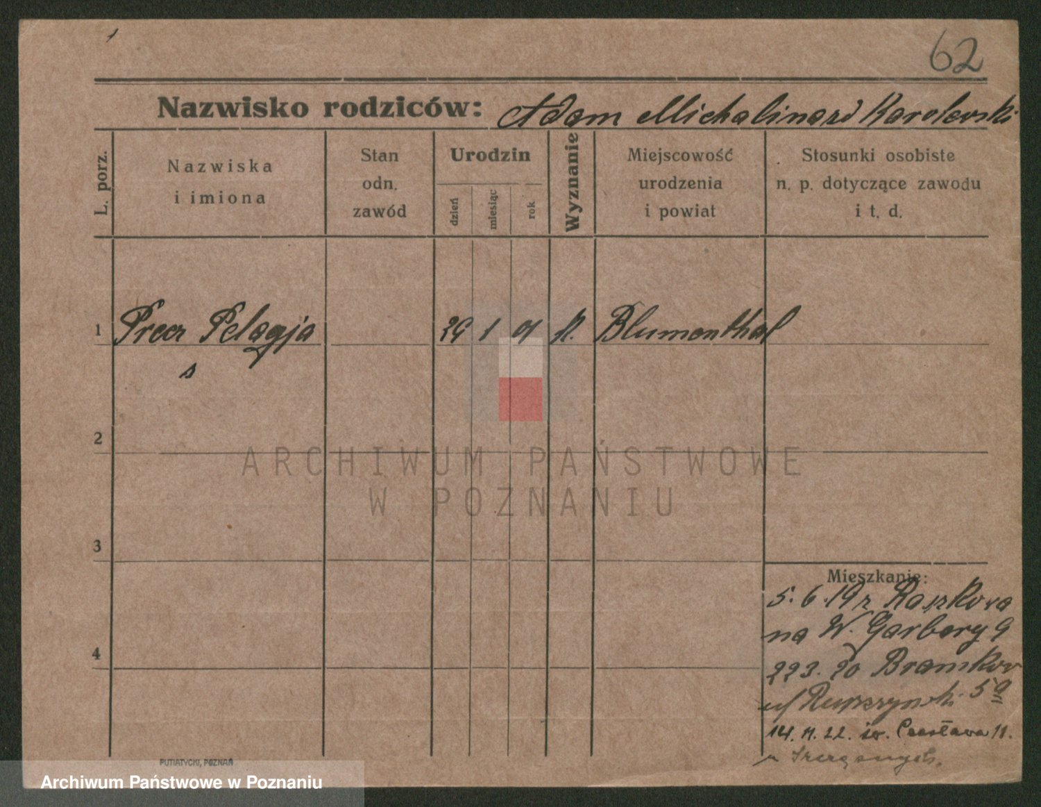 Podgląd karty osobowej dostępny jest po kliknięciu na nazwisko lub ikonkę karty. Można dokonywać powiększenia (ikony na górze) lub przechodzić między kolejnymi skanami (strzałki po bokach).