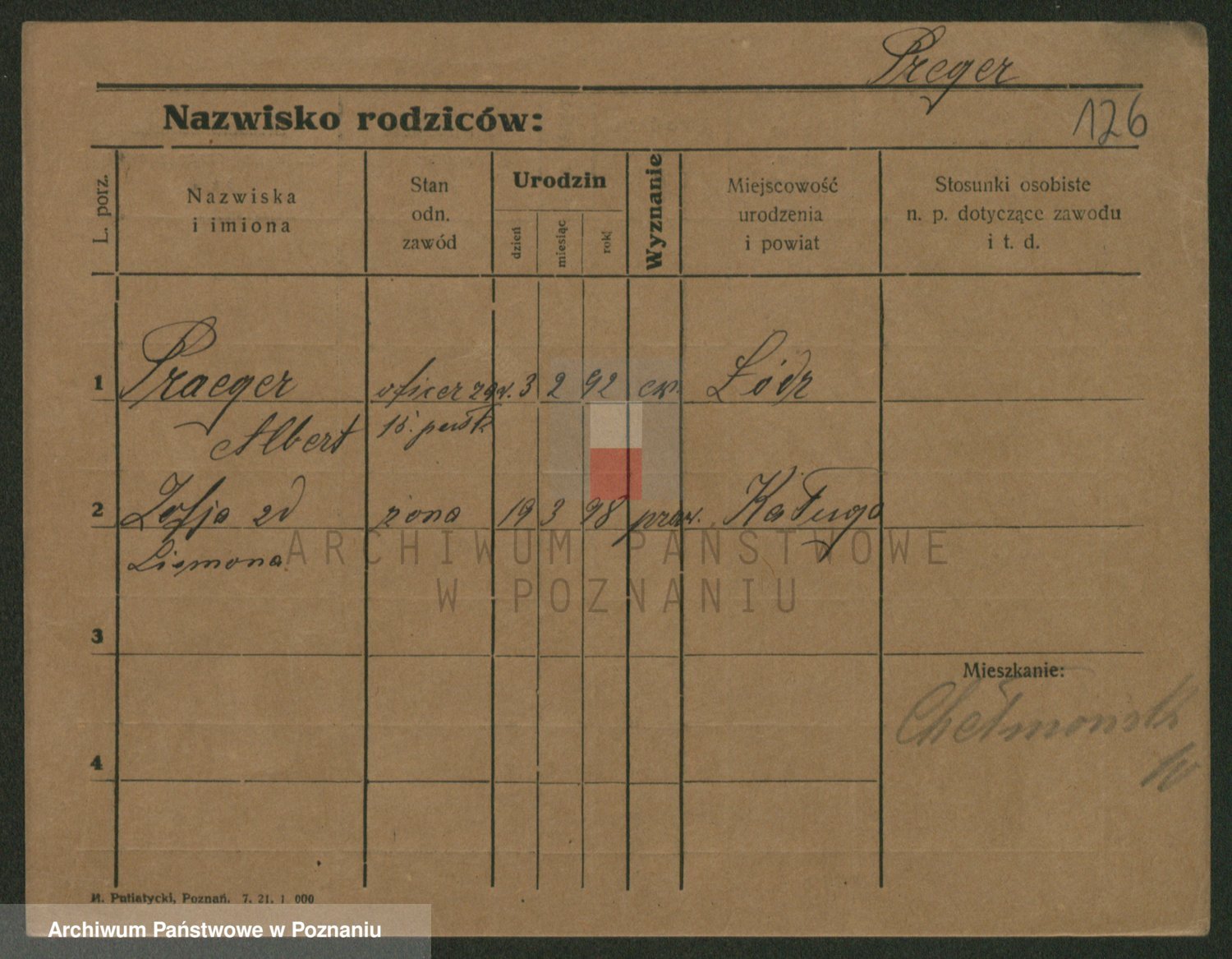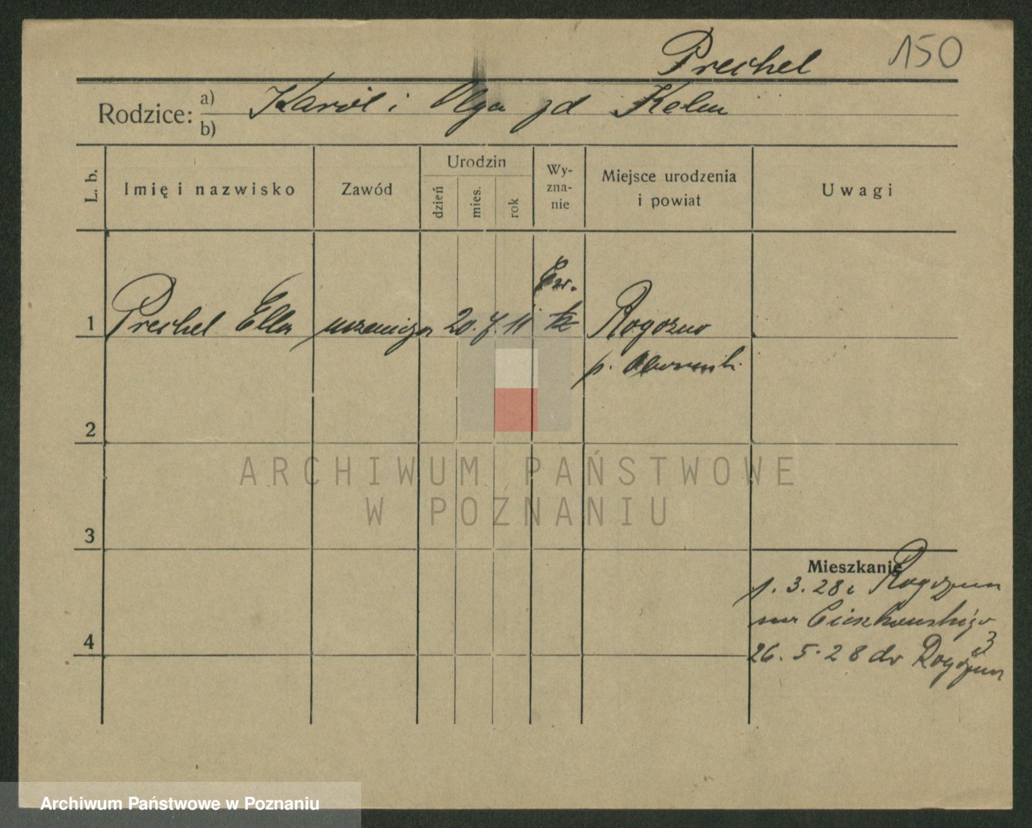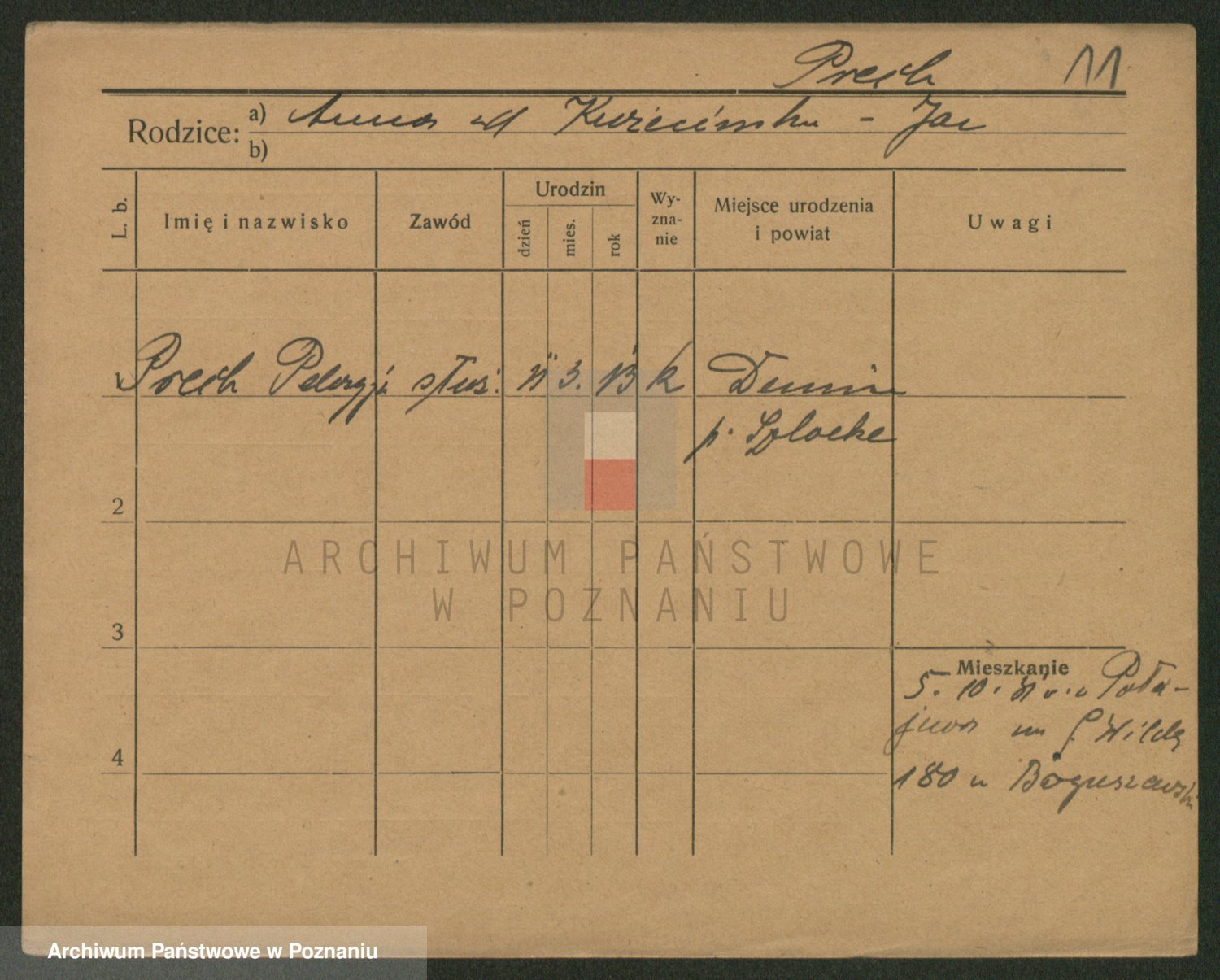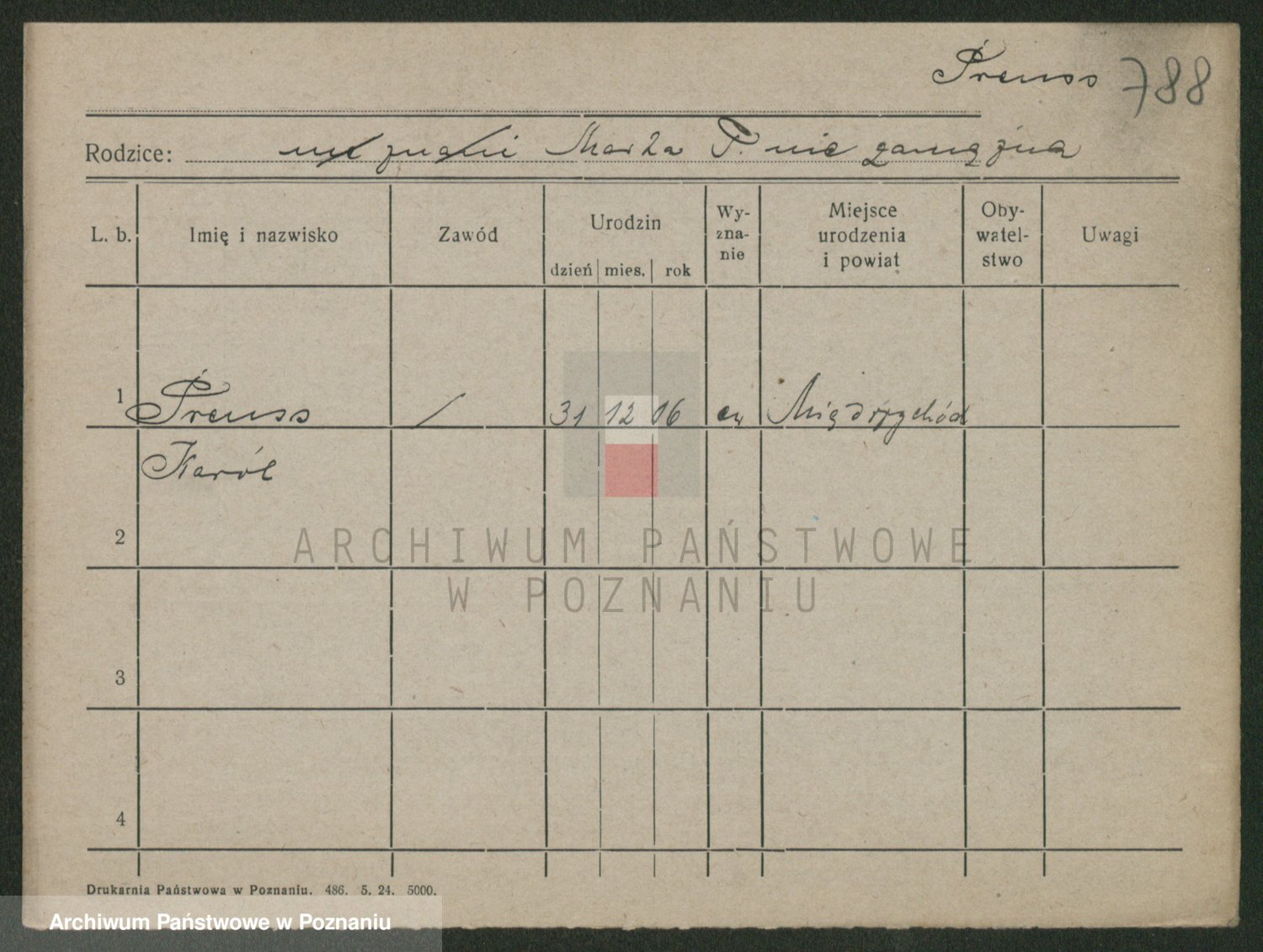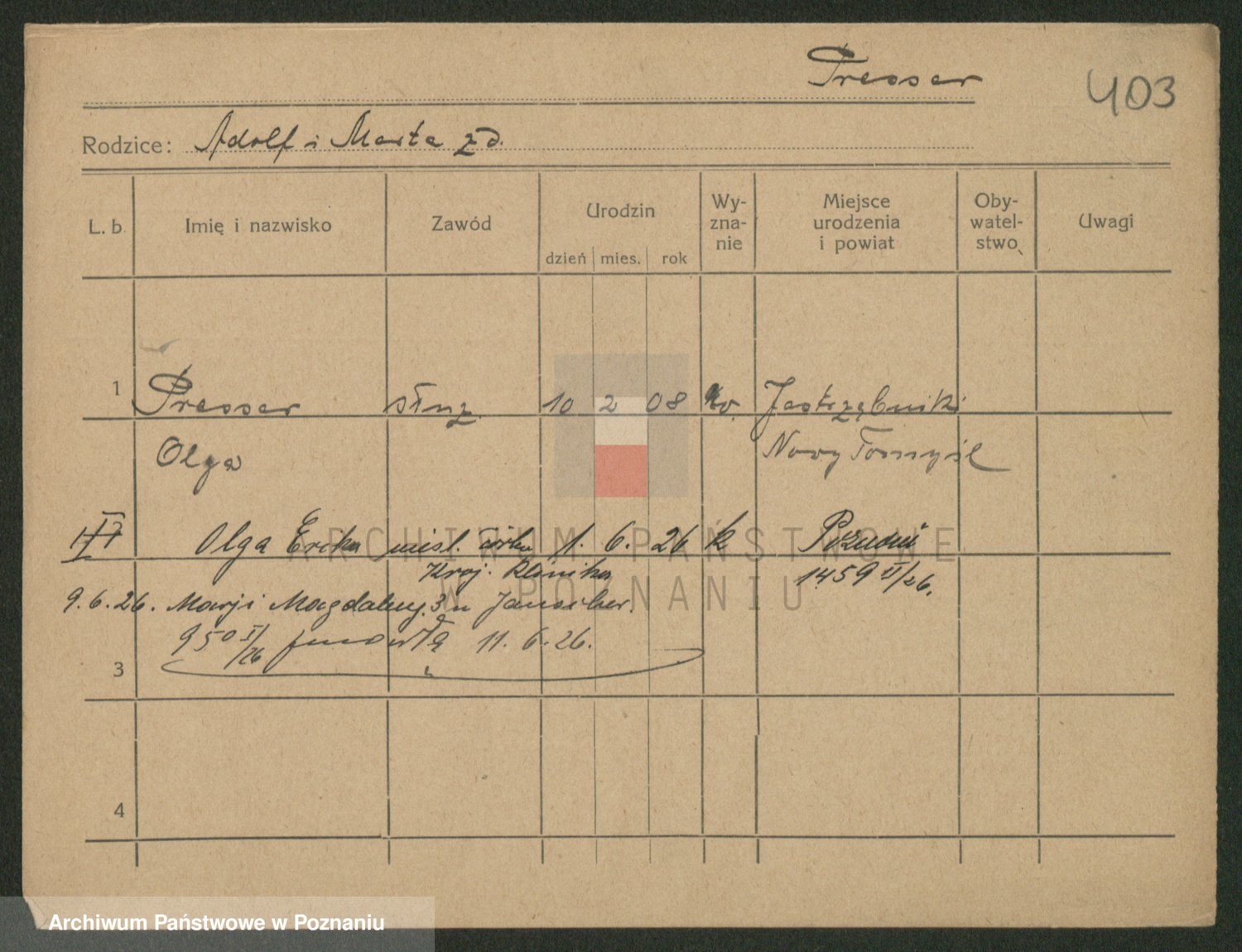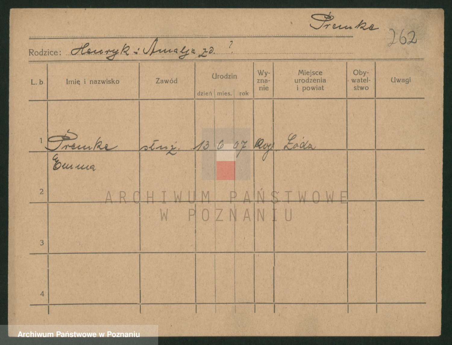 Podgląd karty osobowej dostępny jest po kliknięciu na nazwisko lub ikonkę karty. Można dokonywać powiększenia (ikony na górze) lub przechodzić między kolejnymi skanami (strzałki po bokach).