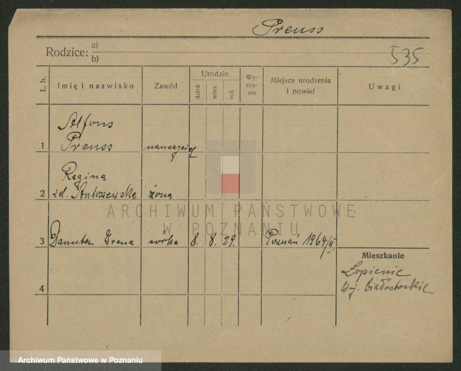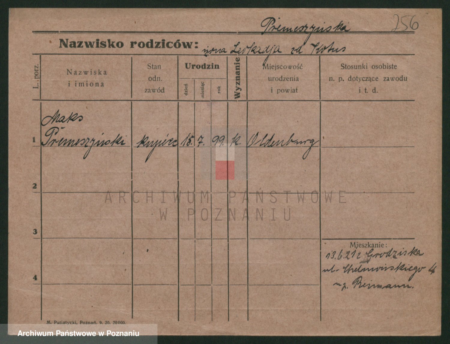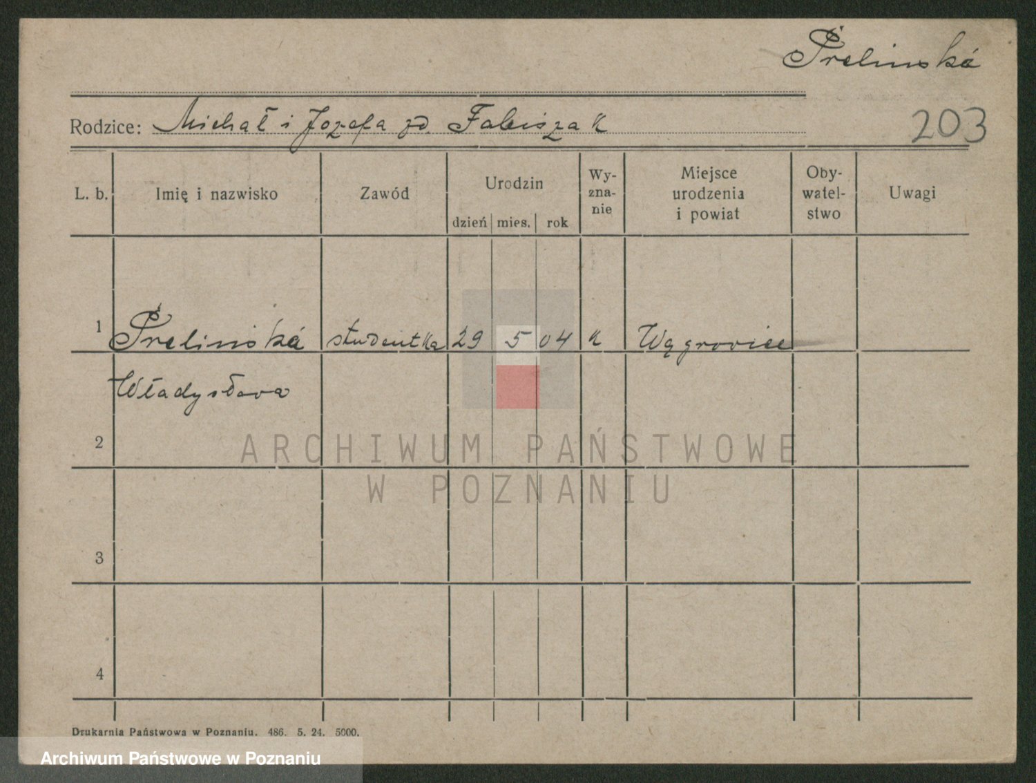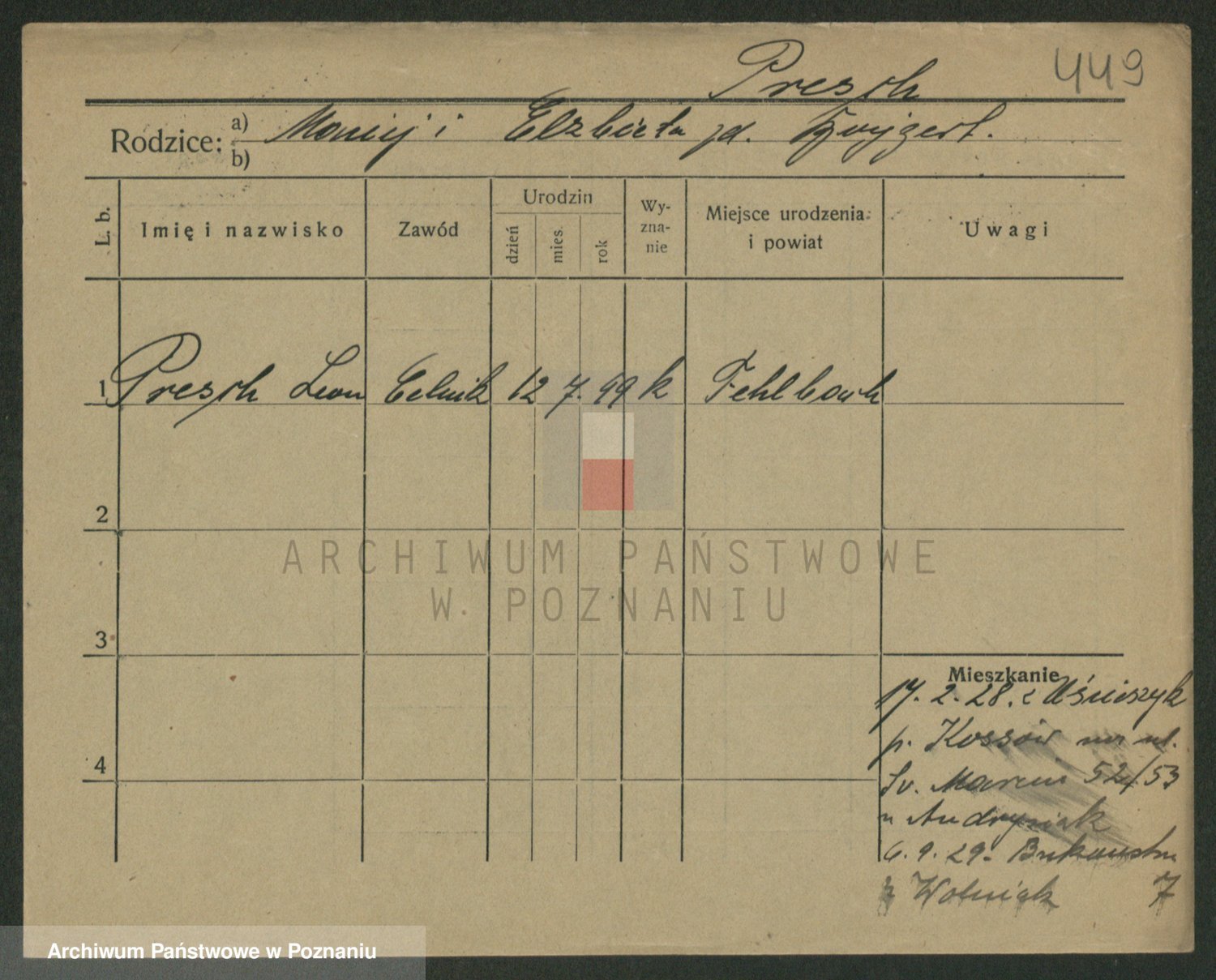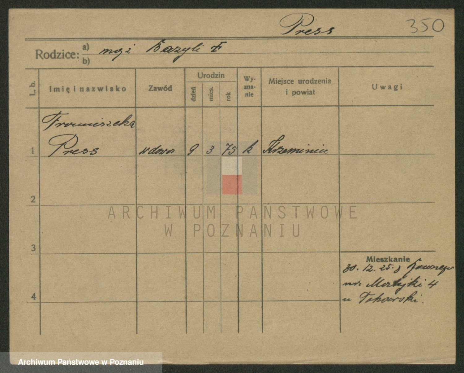 Podgląd karty osobowej dostępny jest po kliknięciu na nazwisko lub ikonkę karty. Można dokonywać powiększenia (ikony na górze) lub przechodzić między kolejnymi skanami (strzałki po bokach).