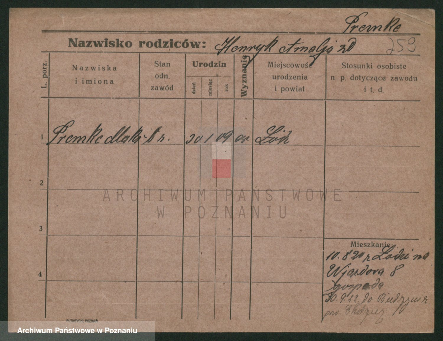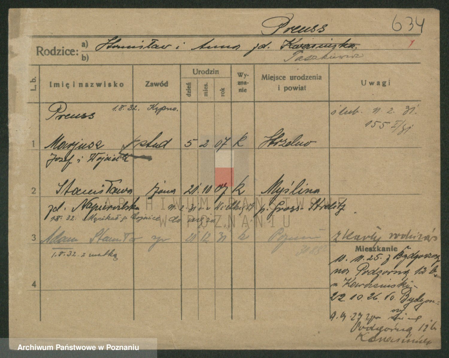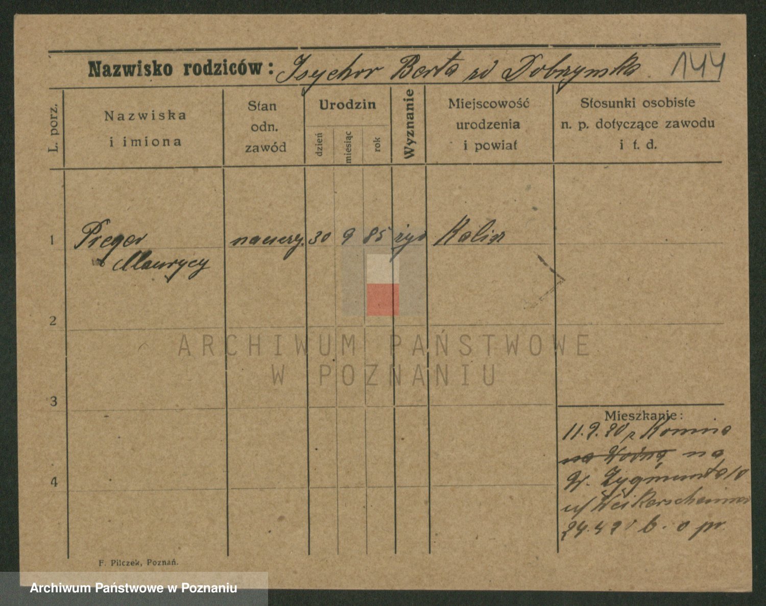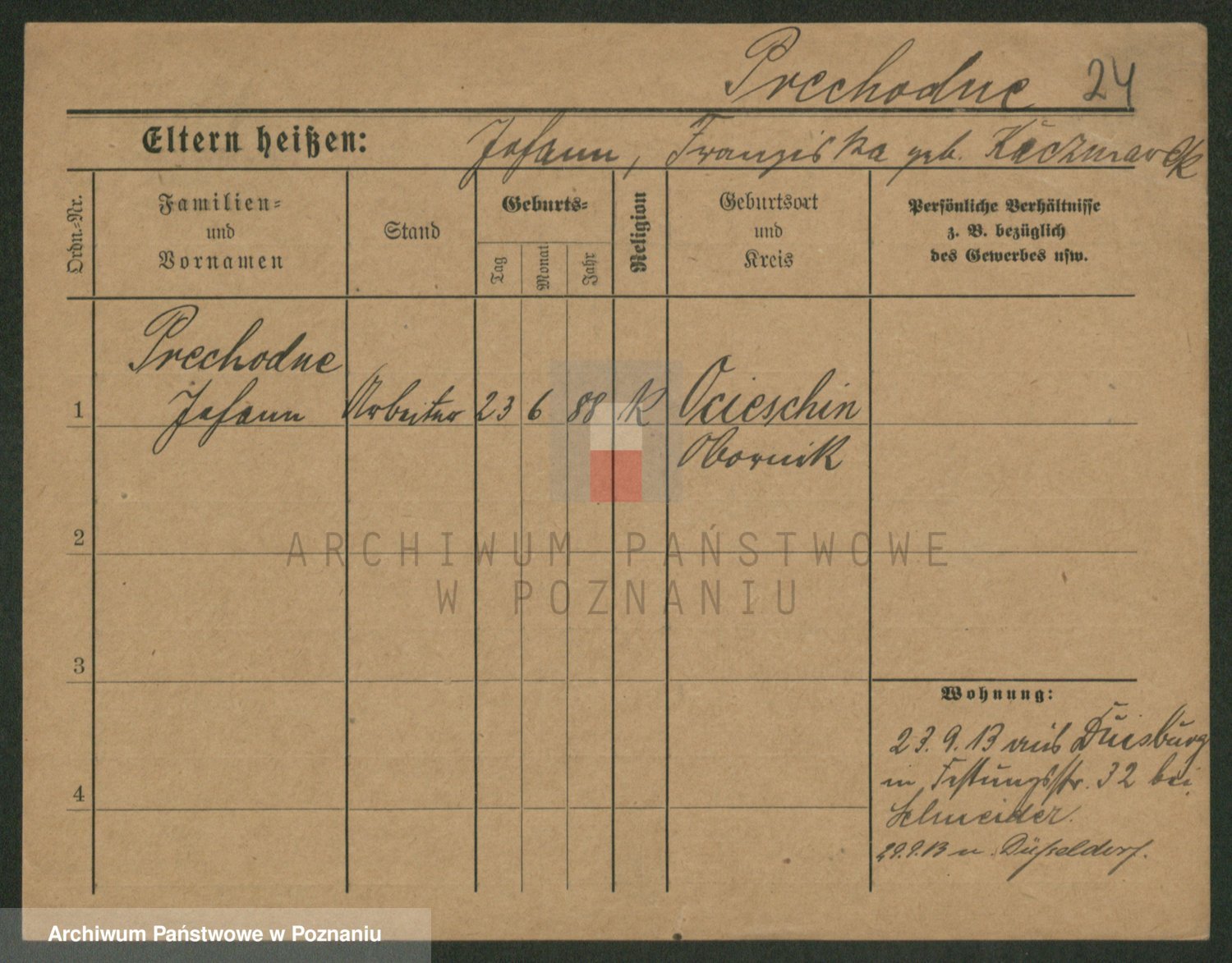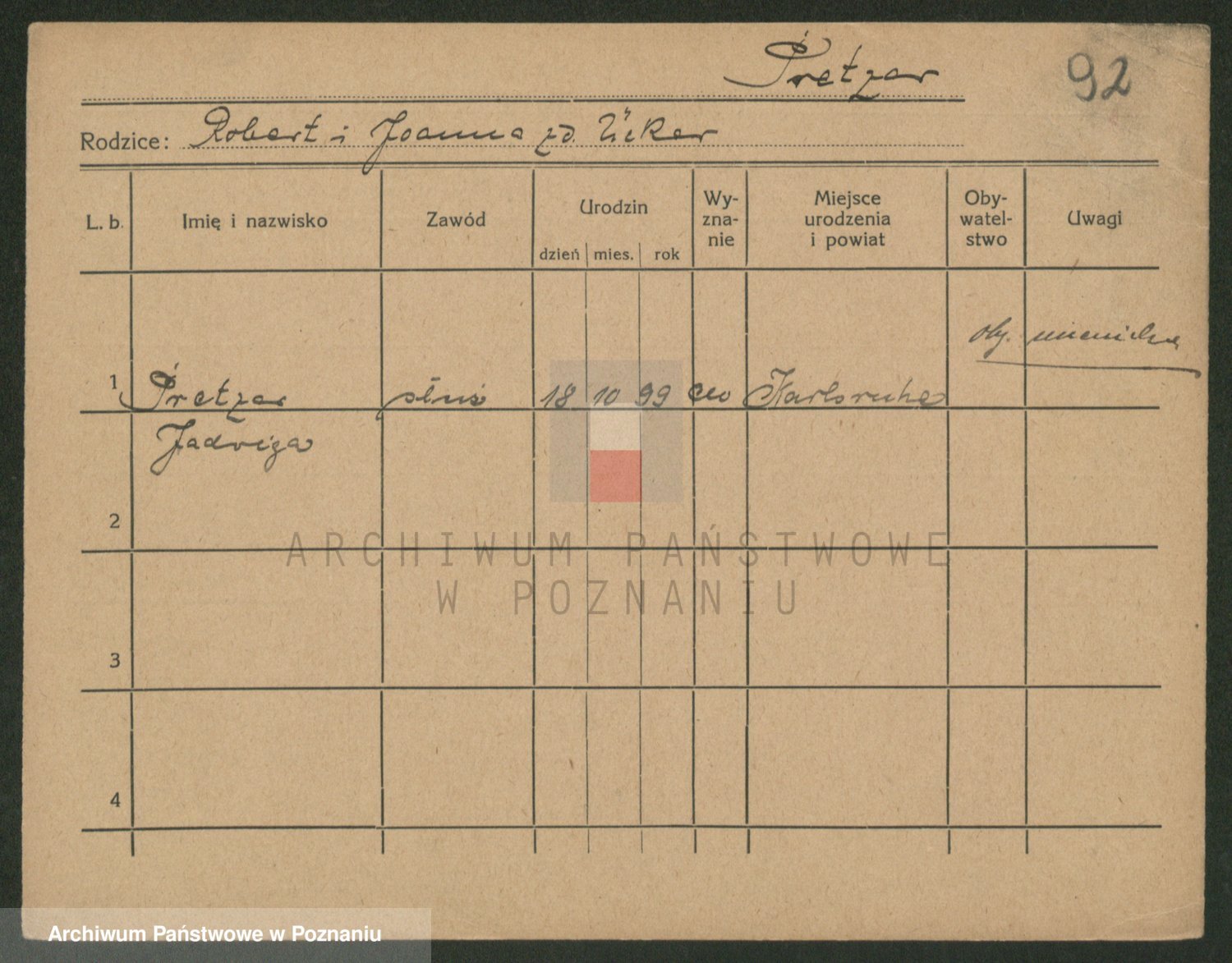 Podgląd karty osobowej dostępny jest po kliknięciu na nazwisko lub ikonkę karty. Można dokonywać powiększenia (ikony na górze) lub przechodzić między kolejnymi skanami (strzałki po bokach).