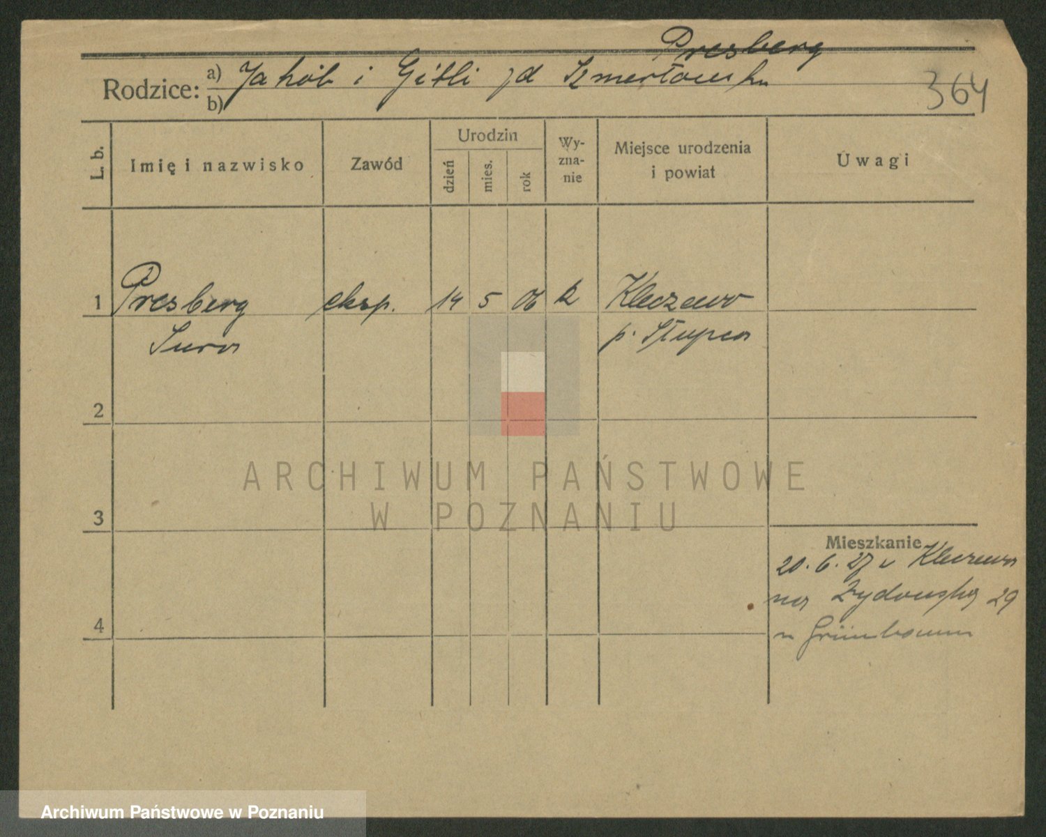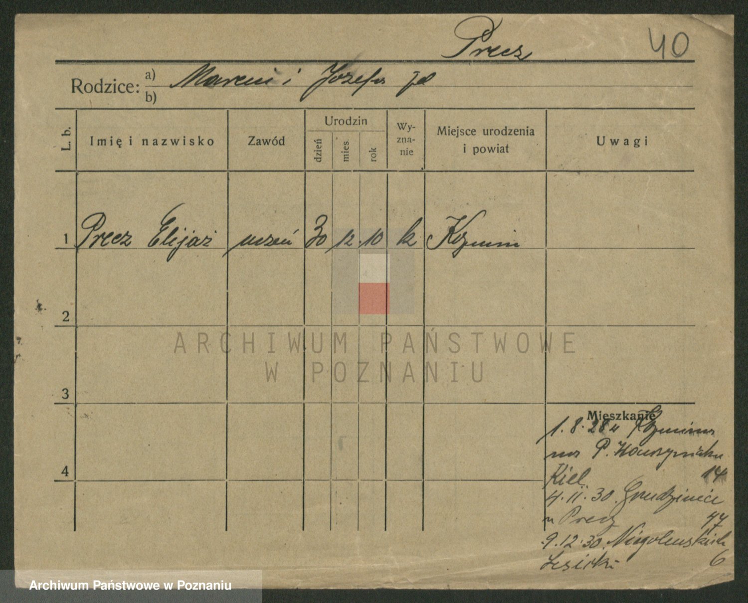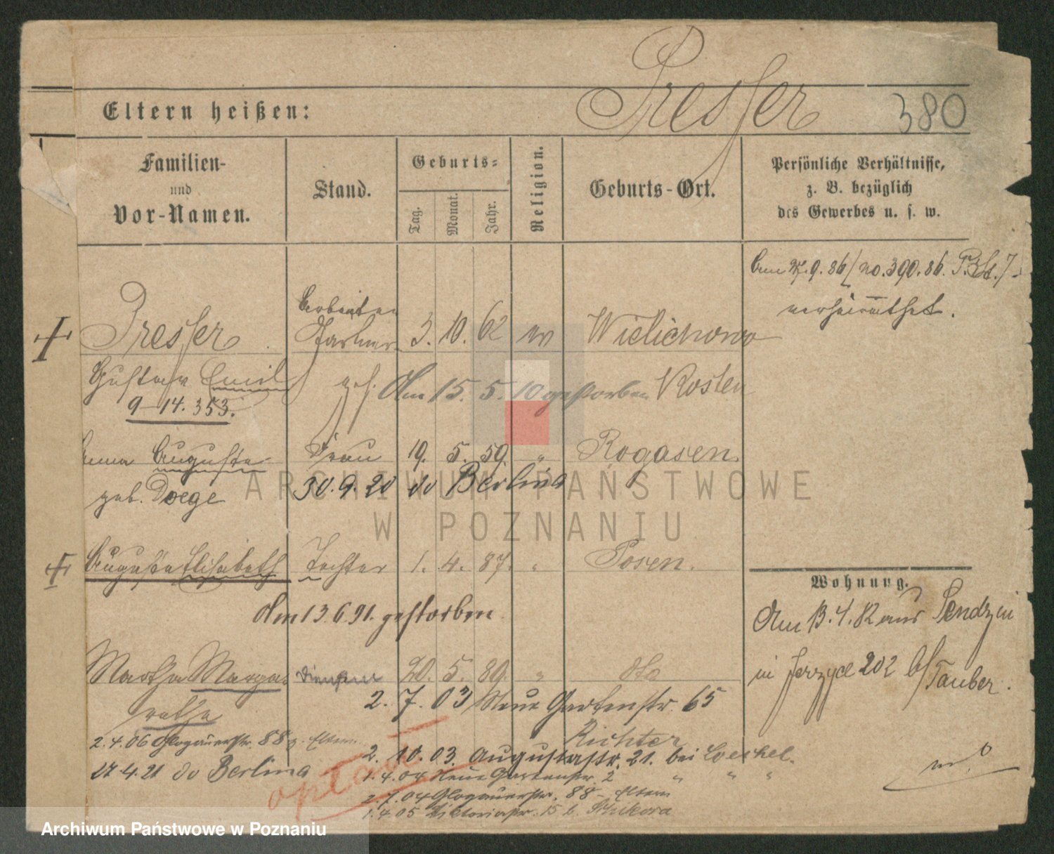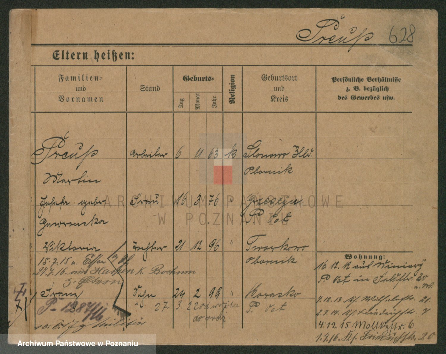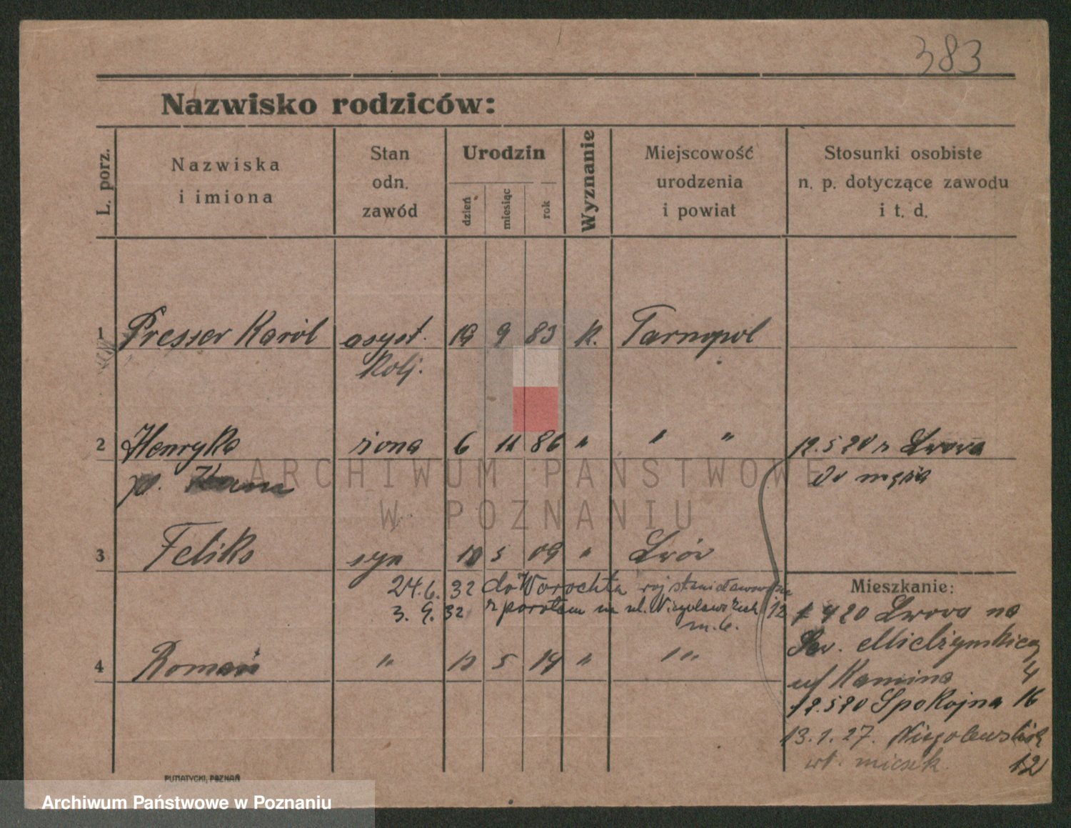 Podgląd karty osobowej dostępny jest po kliknięciu na nazwisko lub ikonkę karty. Można dokonywać powiększenia (ikony na górze) lub przechodzić między kolejnymi skanami (strzałki po bokach).
