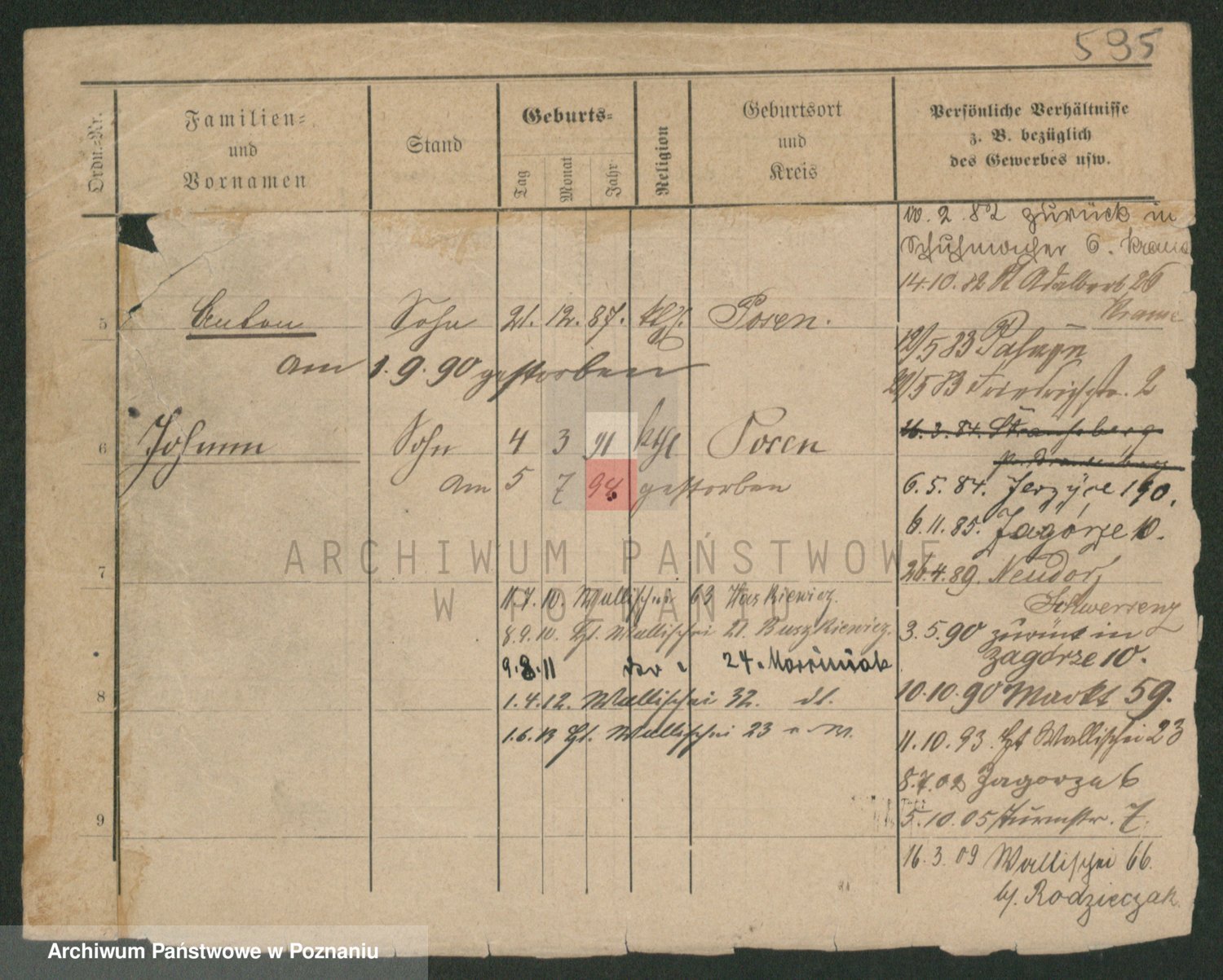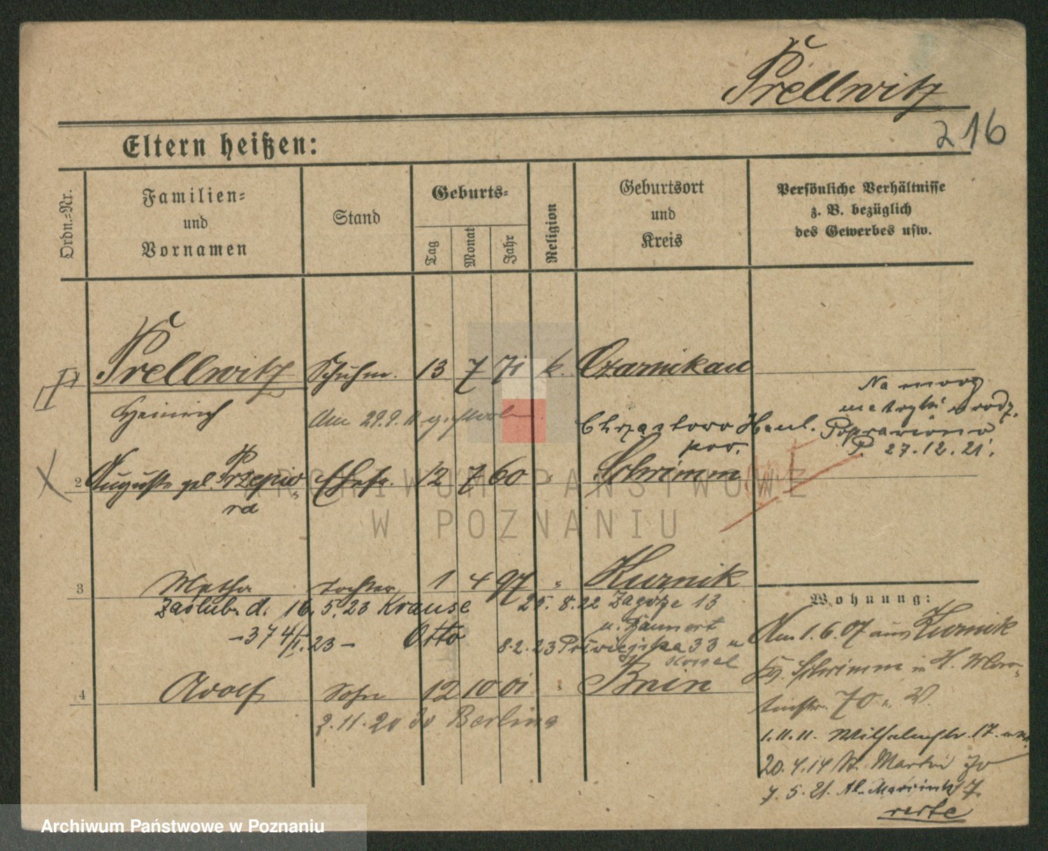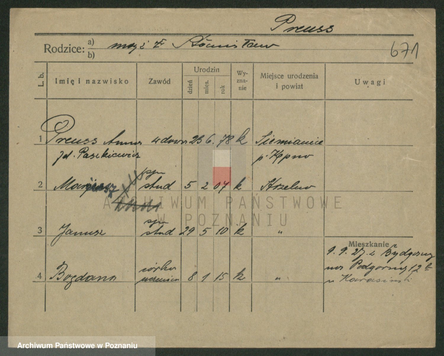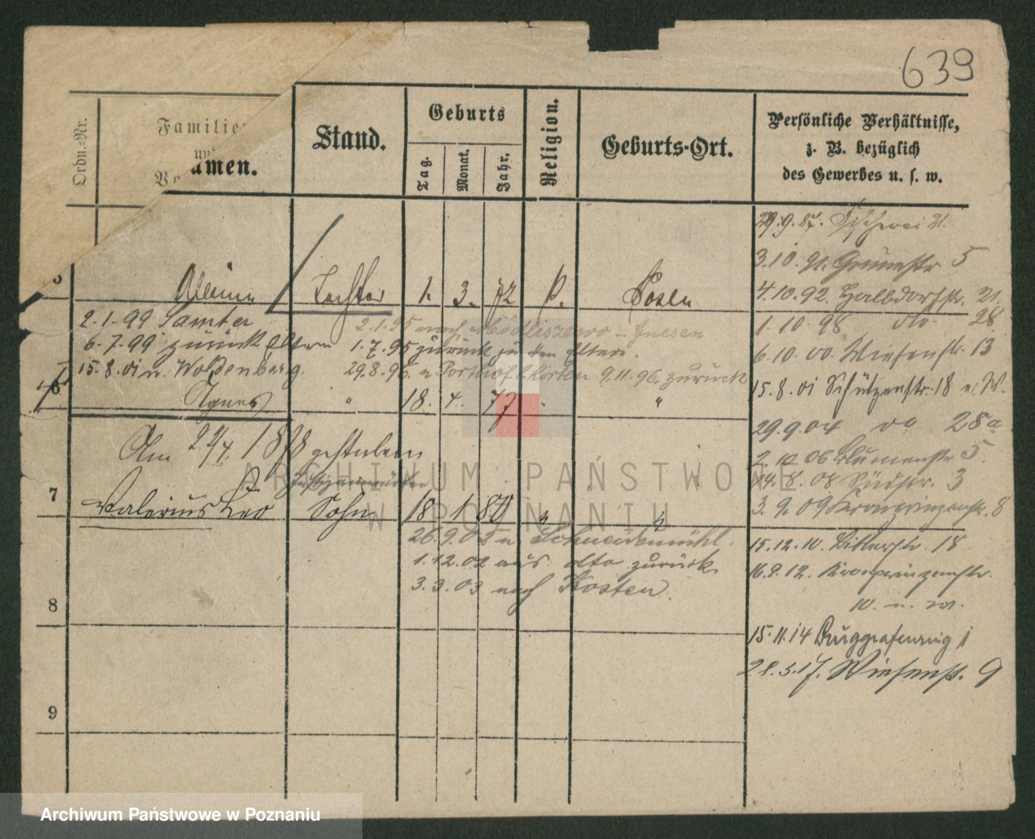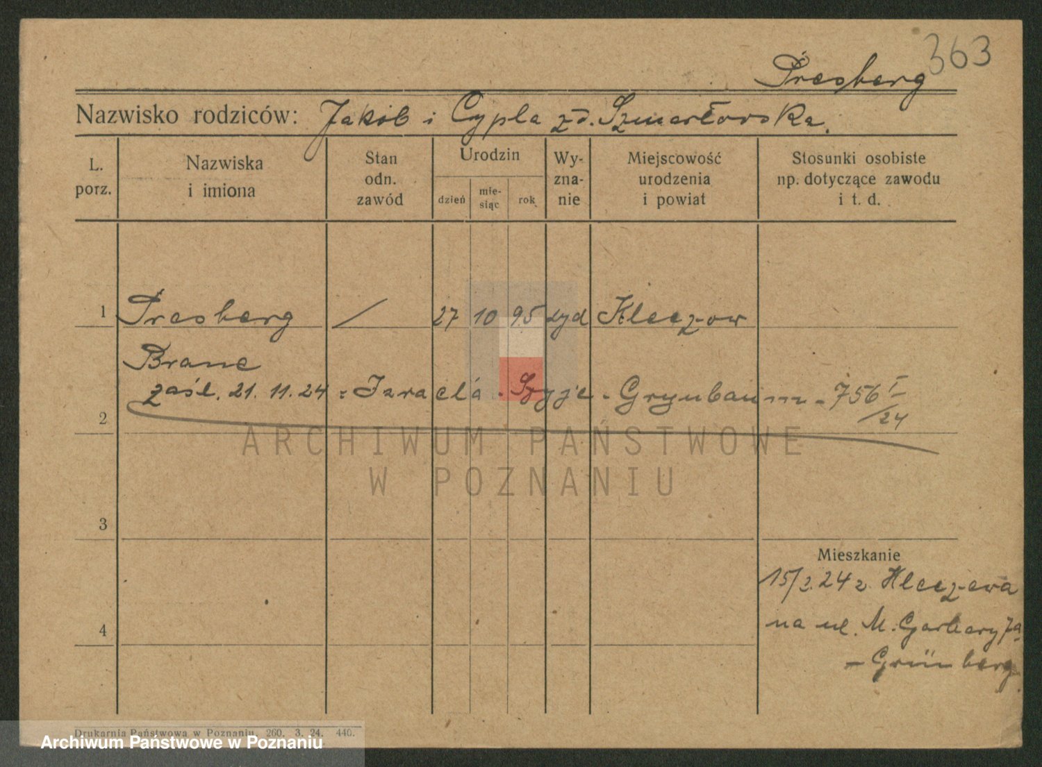 Podgląd karty osobowej dostępny jest po kliknięciu na nazwisko lub ikonkę karty. Można dokonywać powiększenia (ikony na górze) lub przechodzić między kolejnymi skanami (strzałki po bokach).