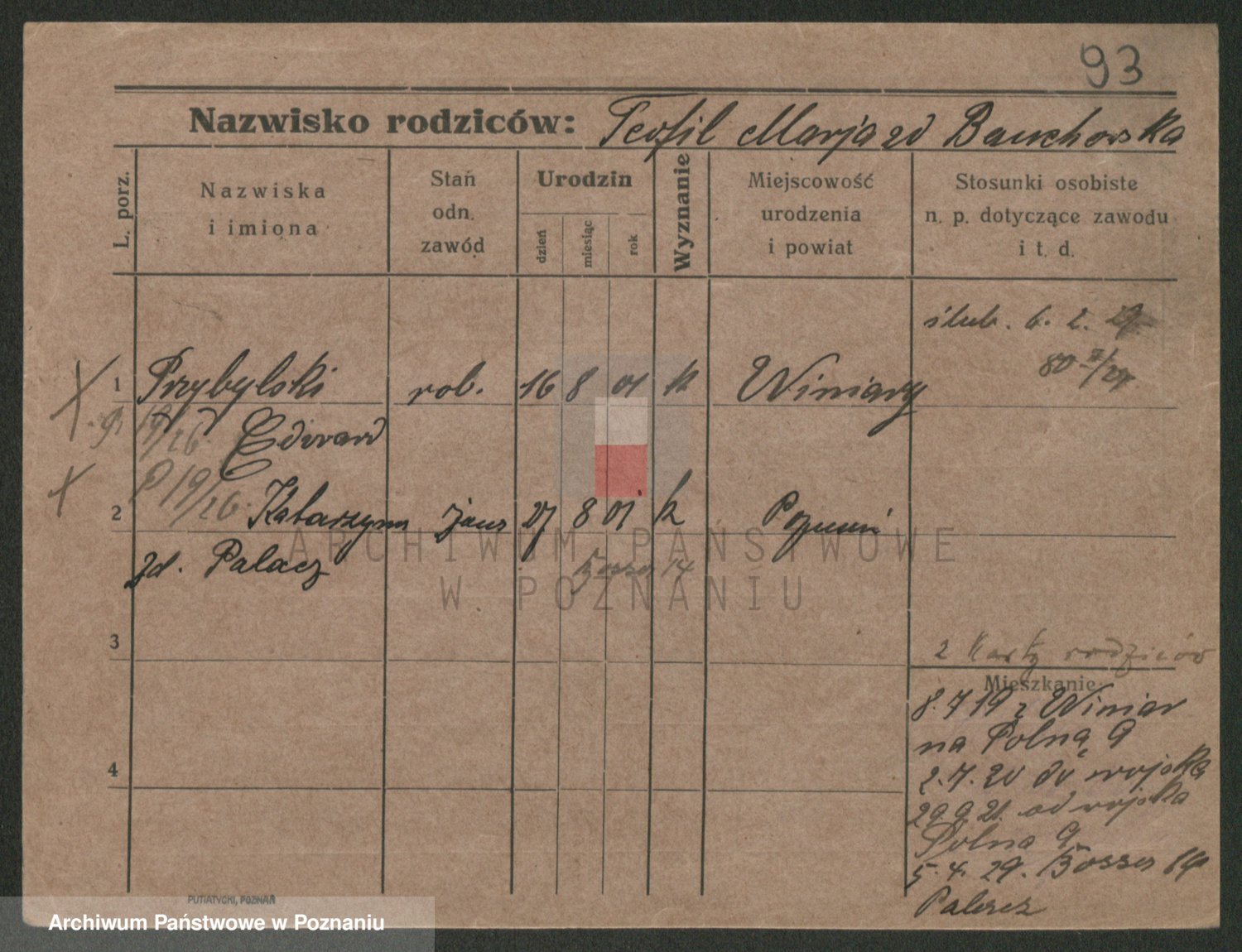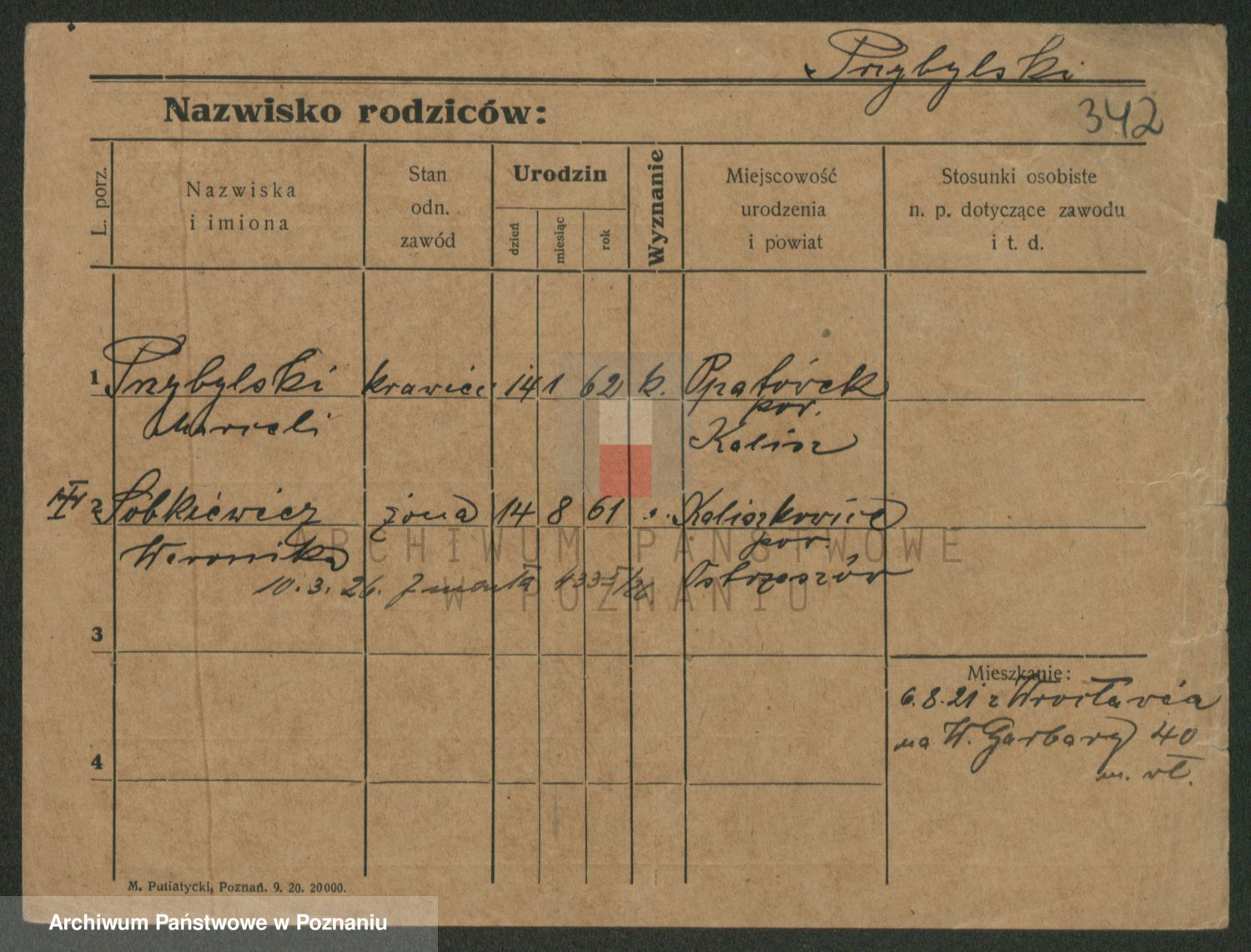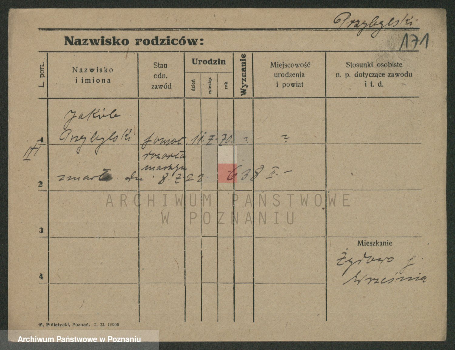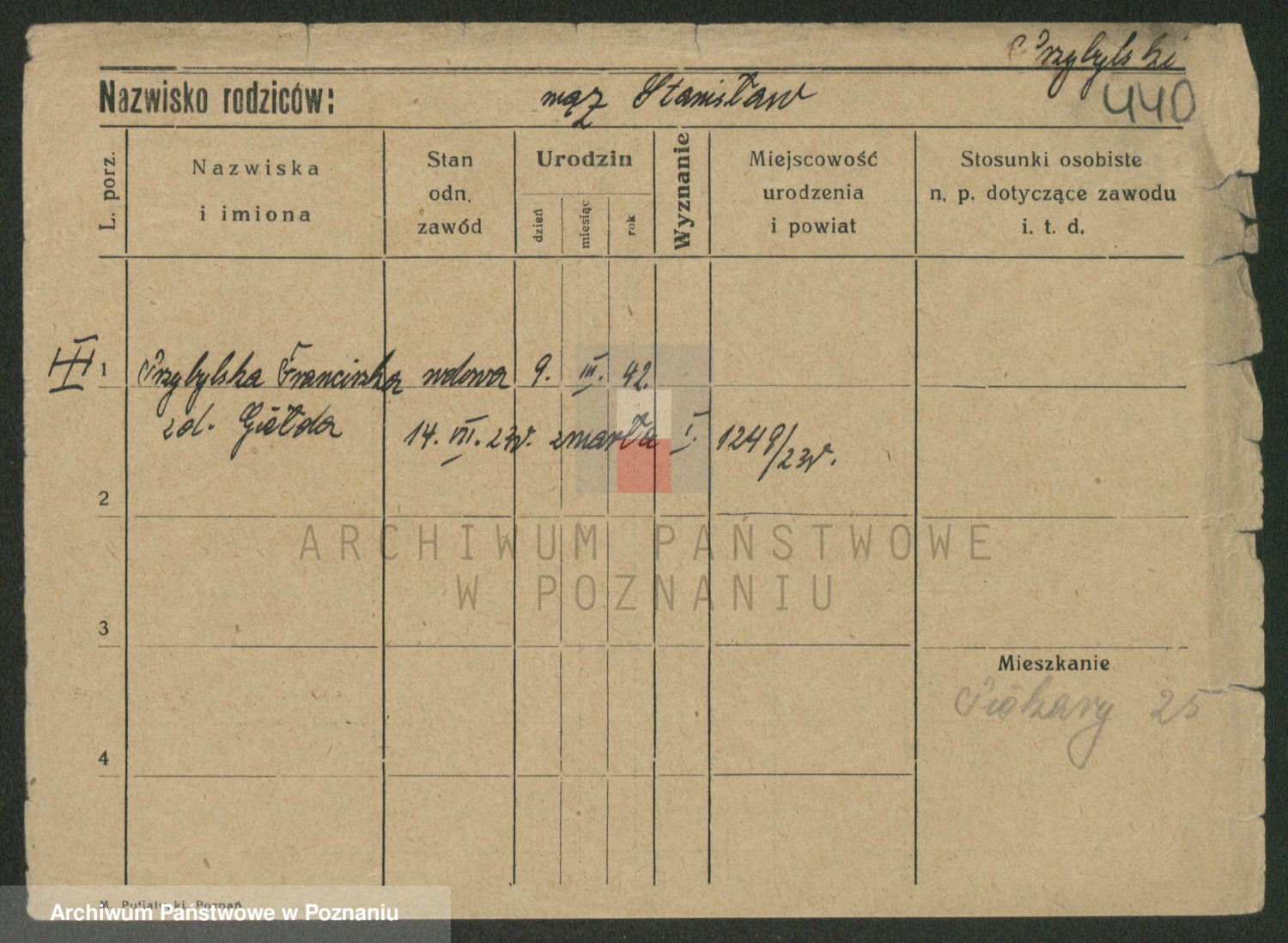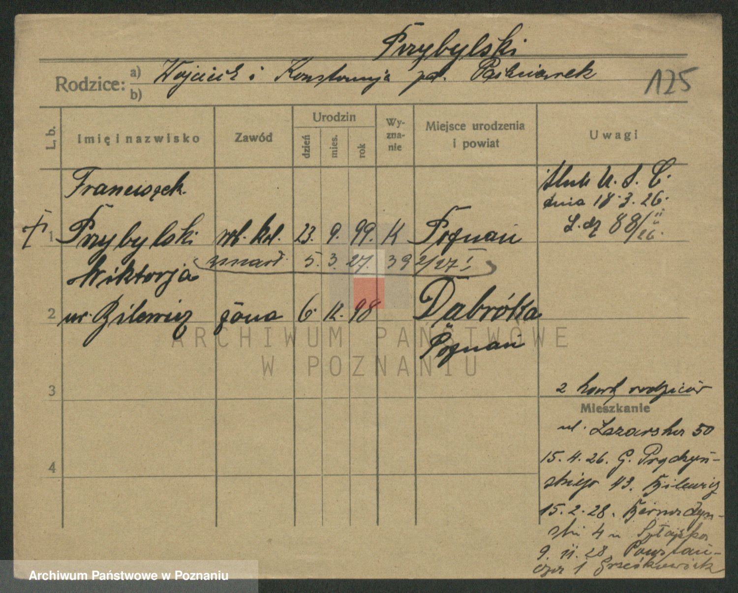 Podgląd karty osobowej dostępny jest po kliknięciu na nazwisko lub ikonkę karty. Można dokonywać powiększenia (ikony na górze) lub przechodzić między kolejnymi skanami (strzałki po bokach).