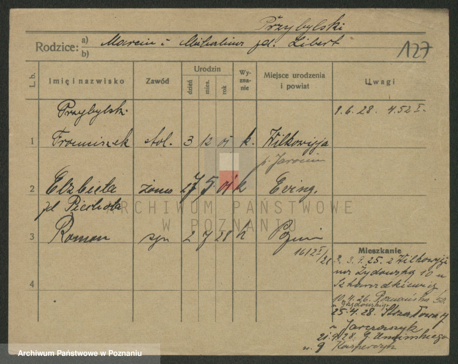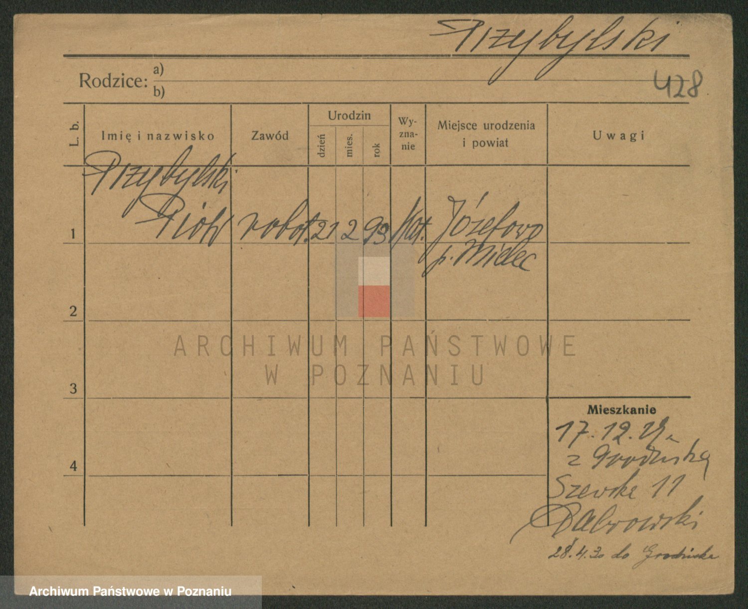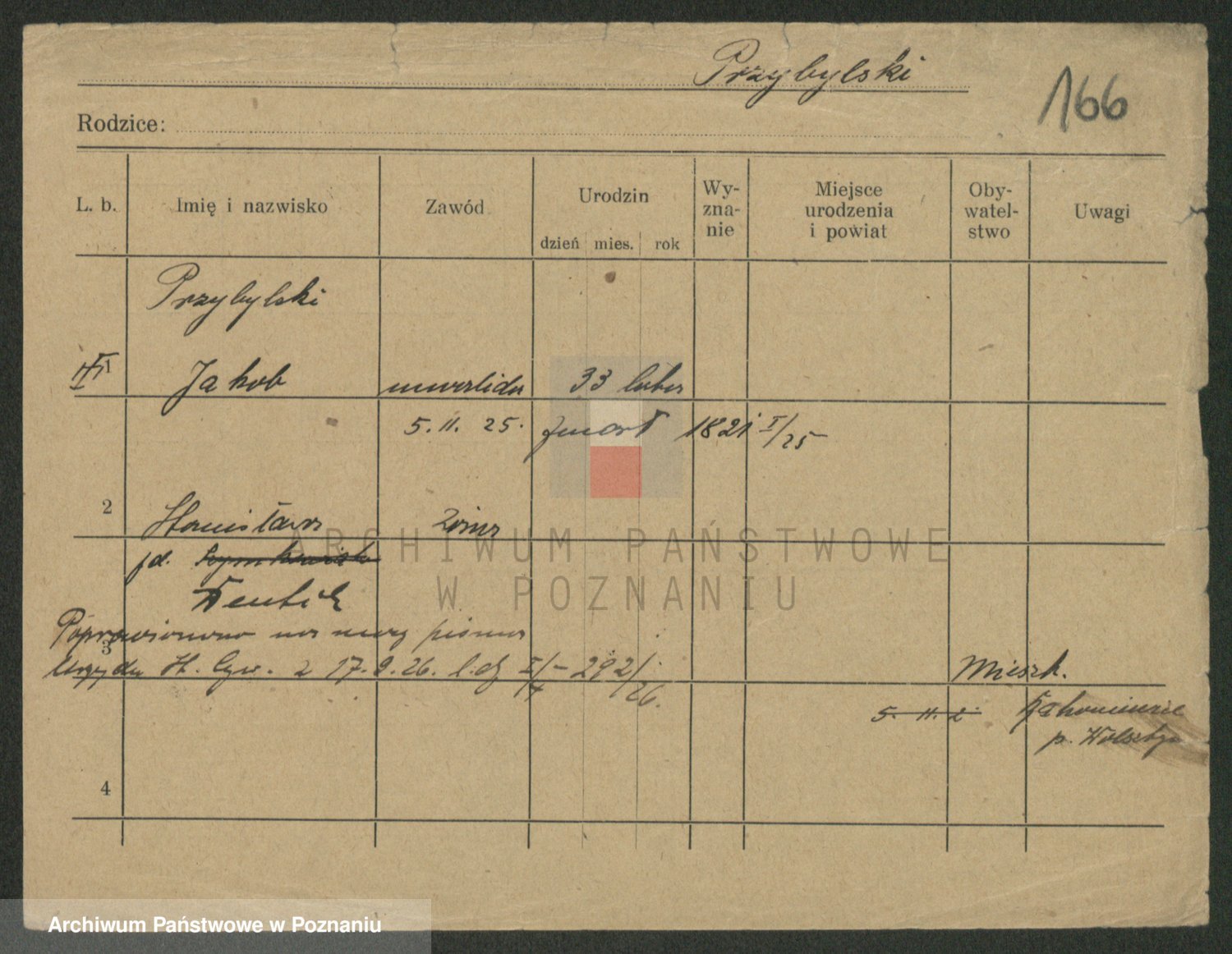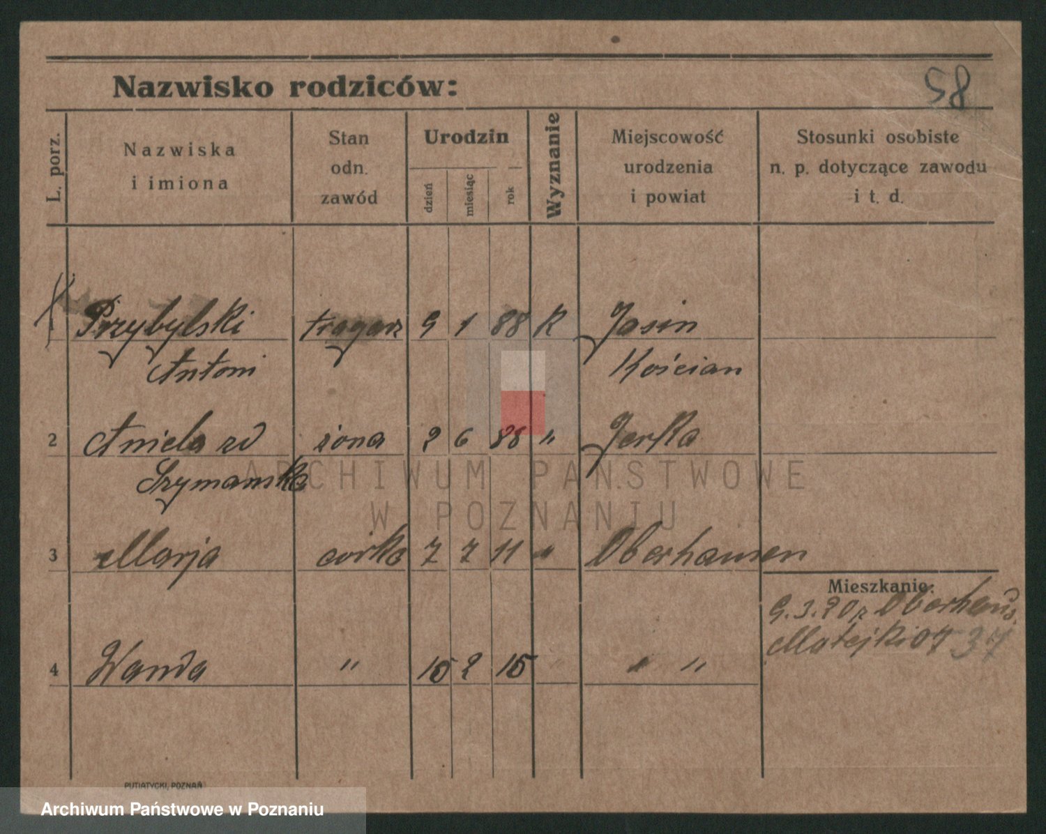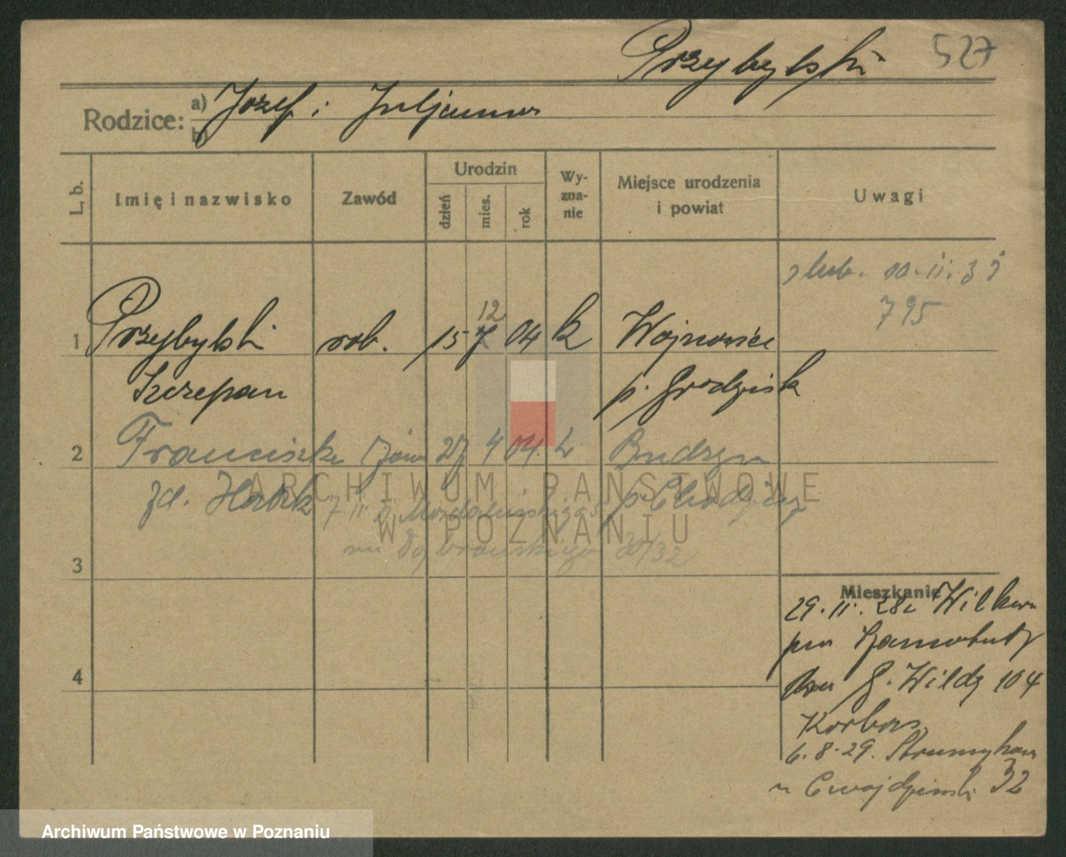 Podgląd karty osobowej dostępny jest po kliknięciu na nazwisko lub ikonkę karty. Można dokonywać powiększenia (ikony na górze) lub przechodzić między kolejnymi skanami (strzałki po bokach).