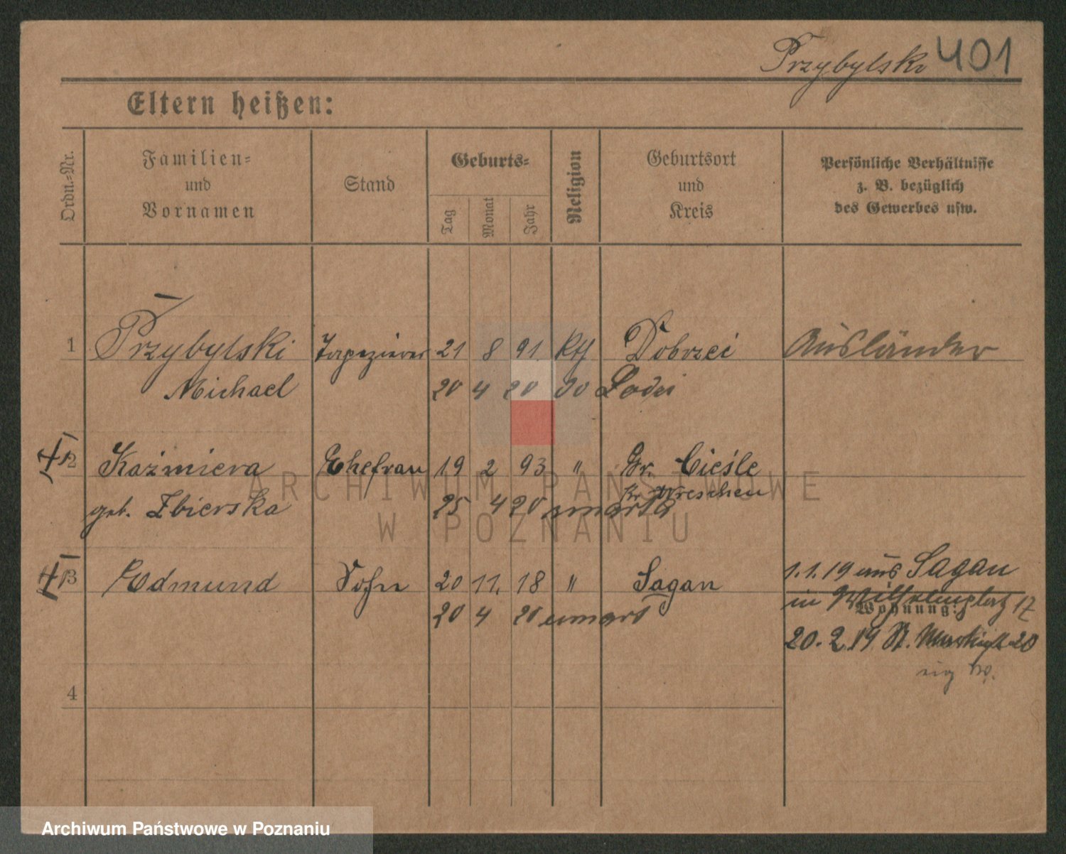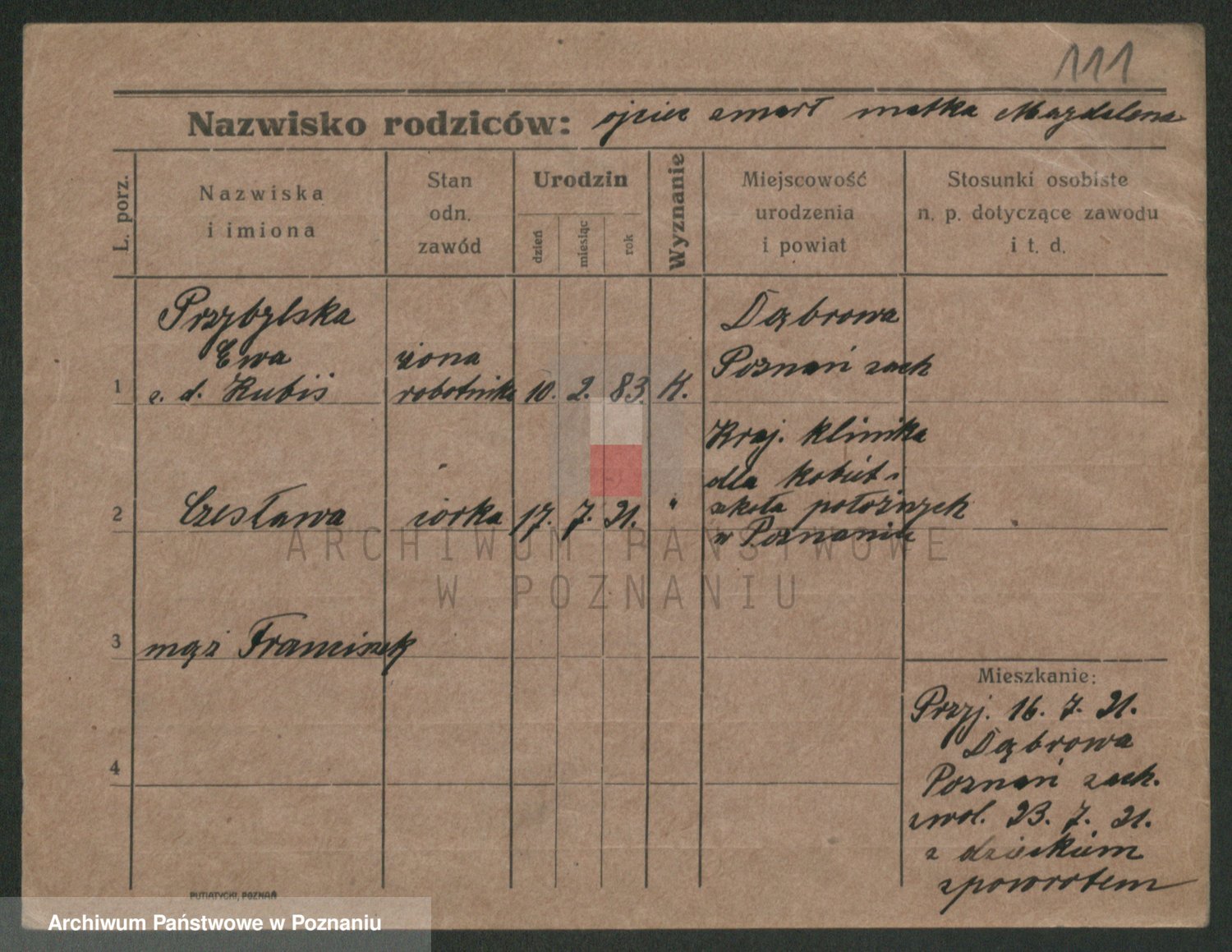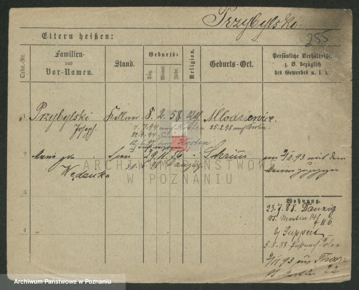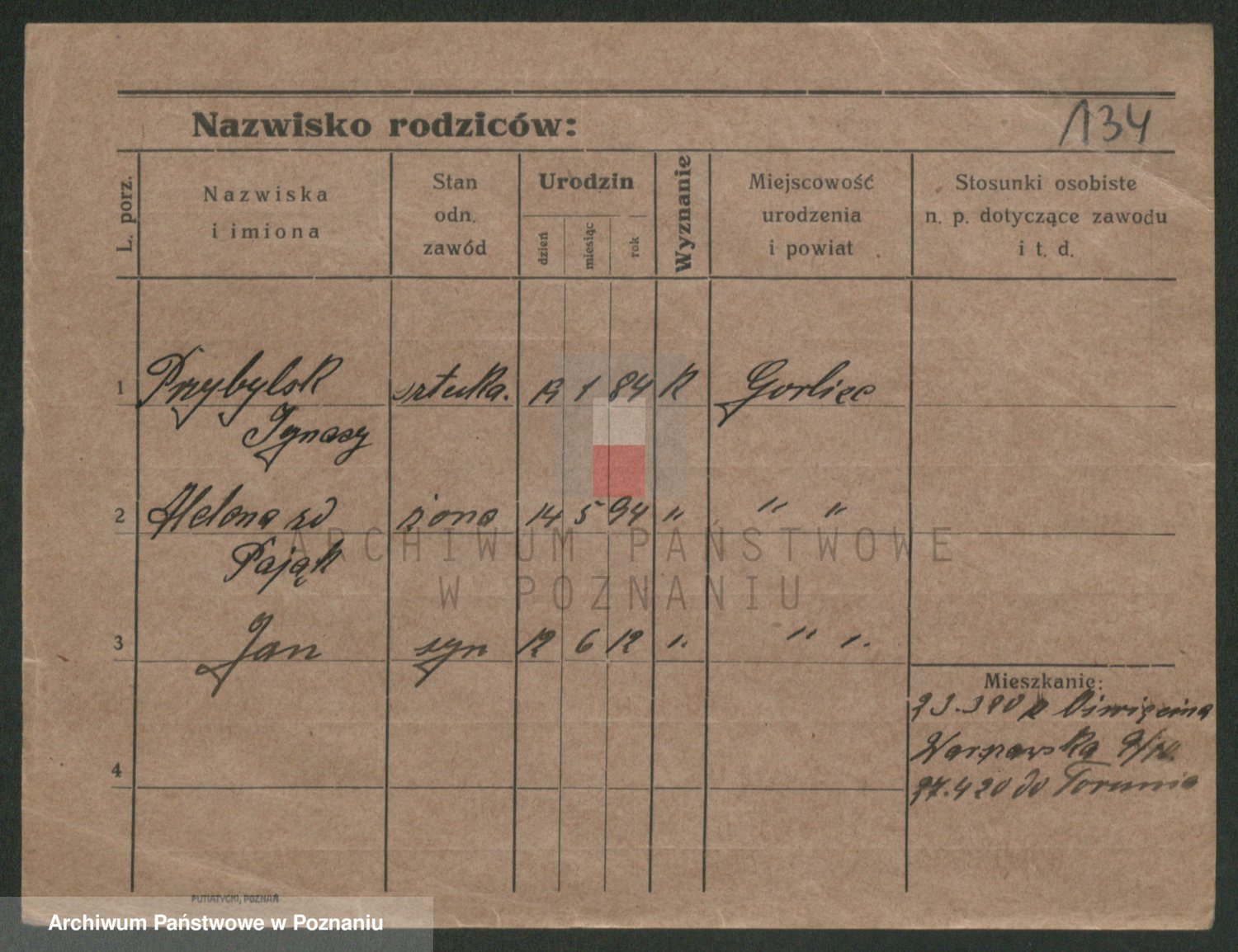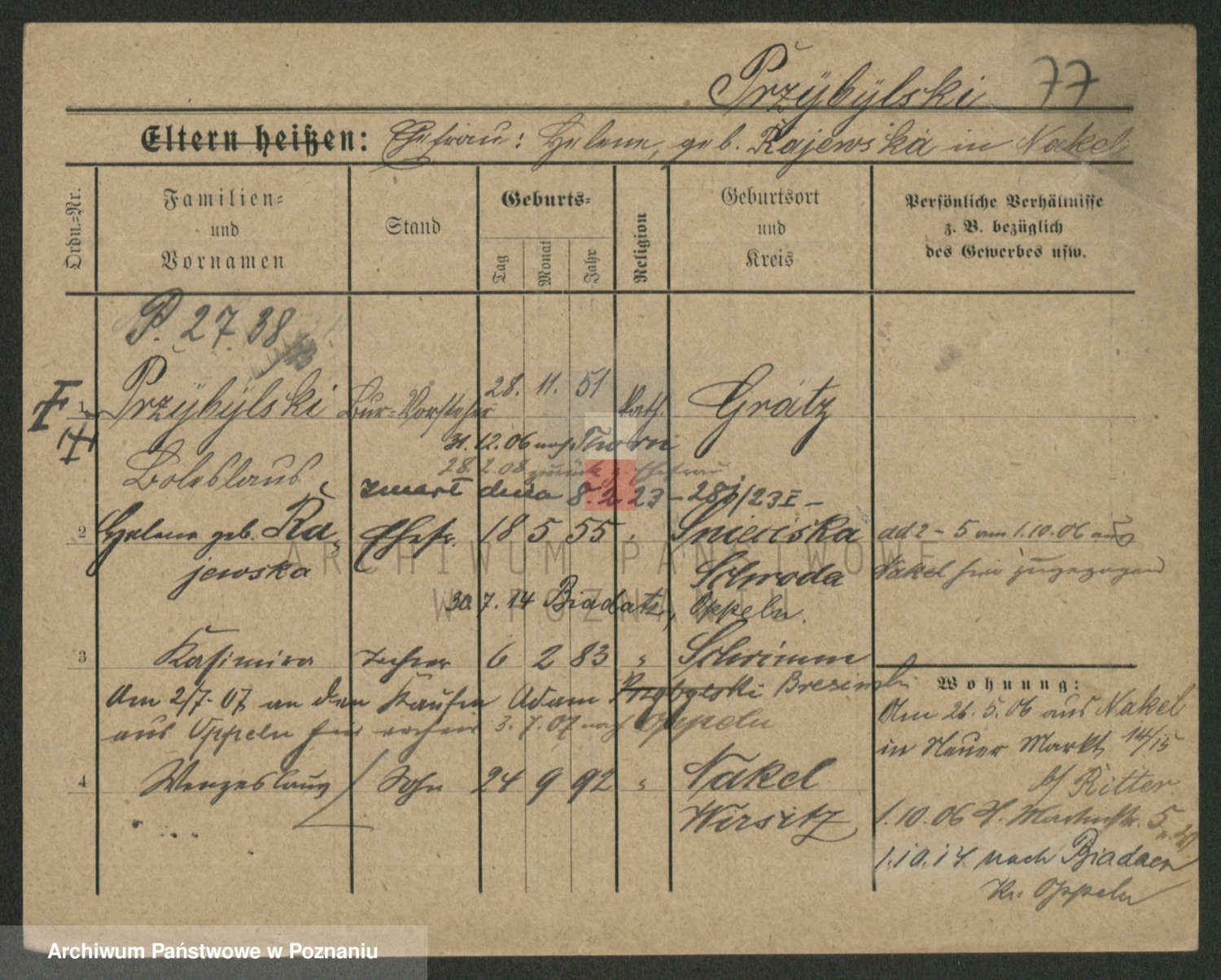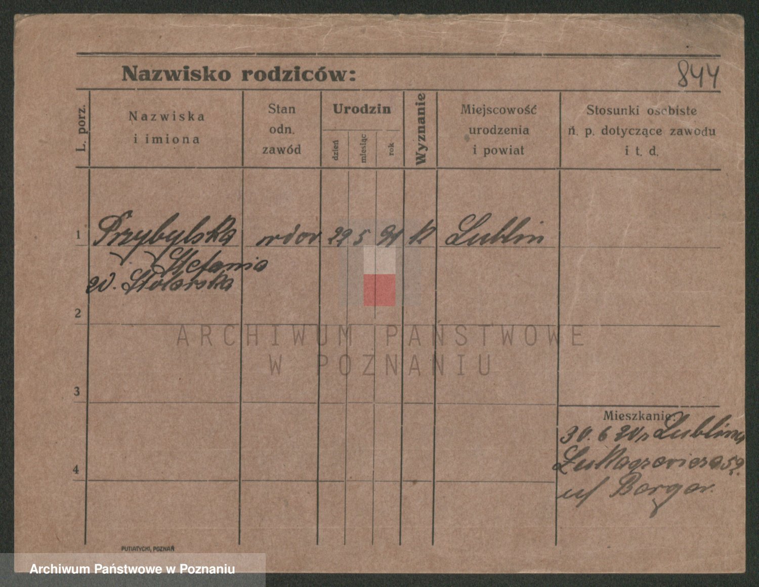 Podgląd karty osobowej dostępny jest po kliknięciu na nazwisko lub ikonkę karty. Można dokonywać powiększenia (ikony na górze) lub przechodzić między kolejnymi skanami (strzałki po bokach).