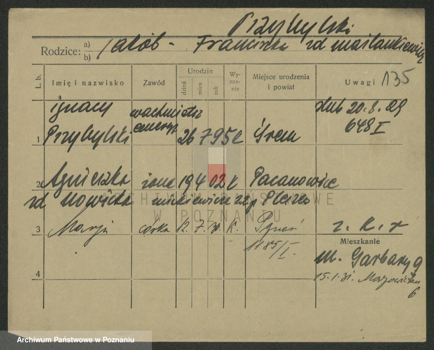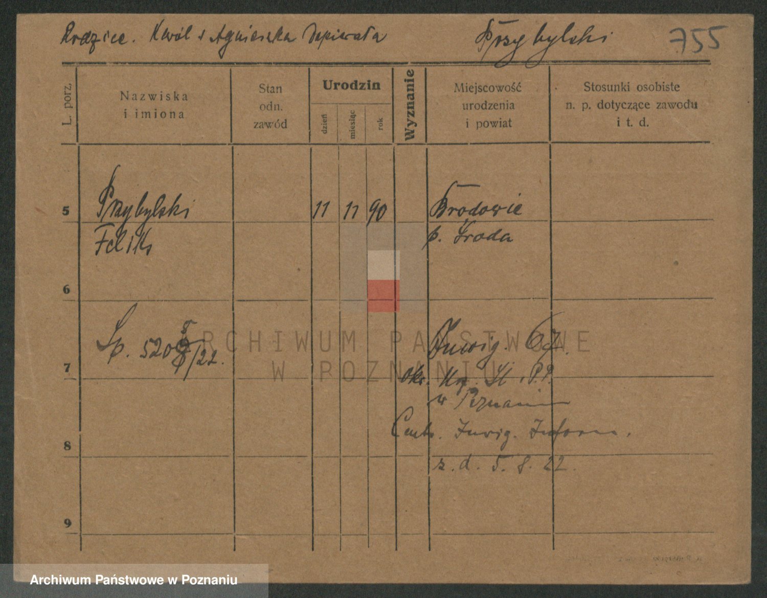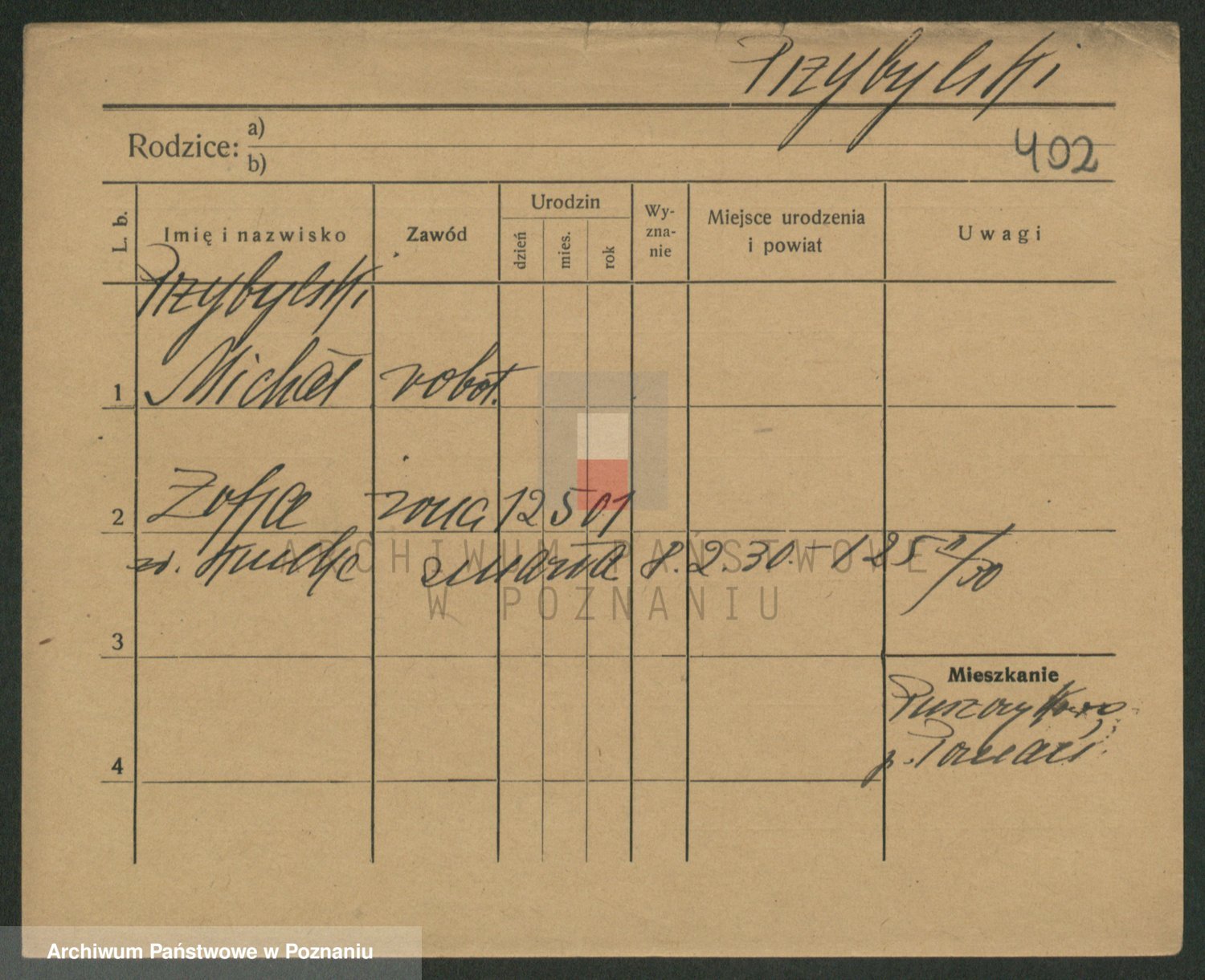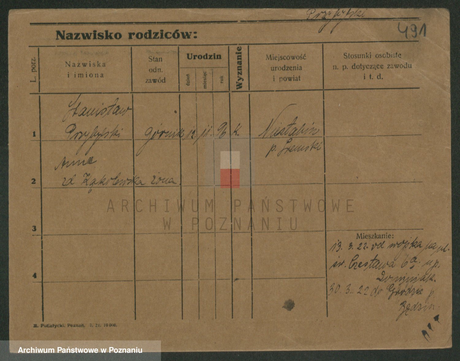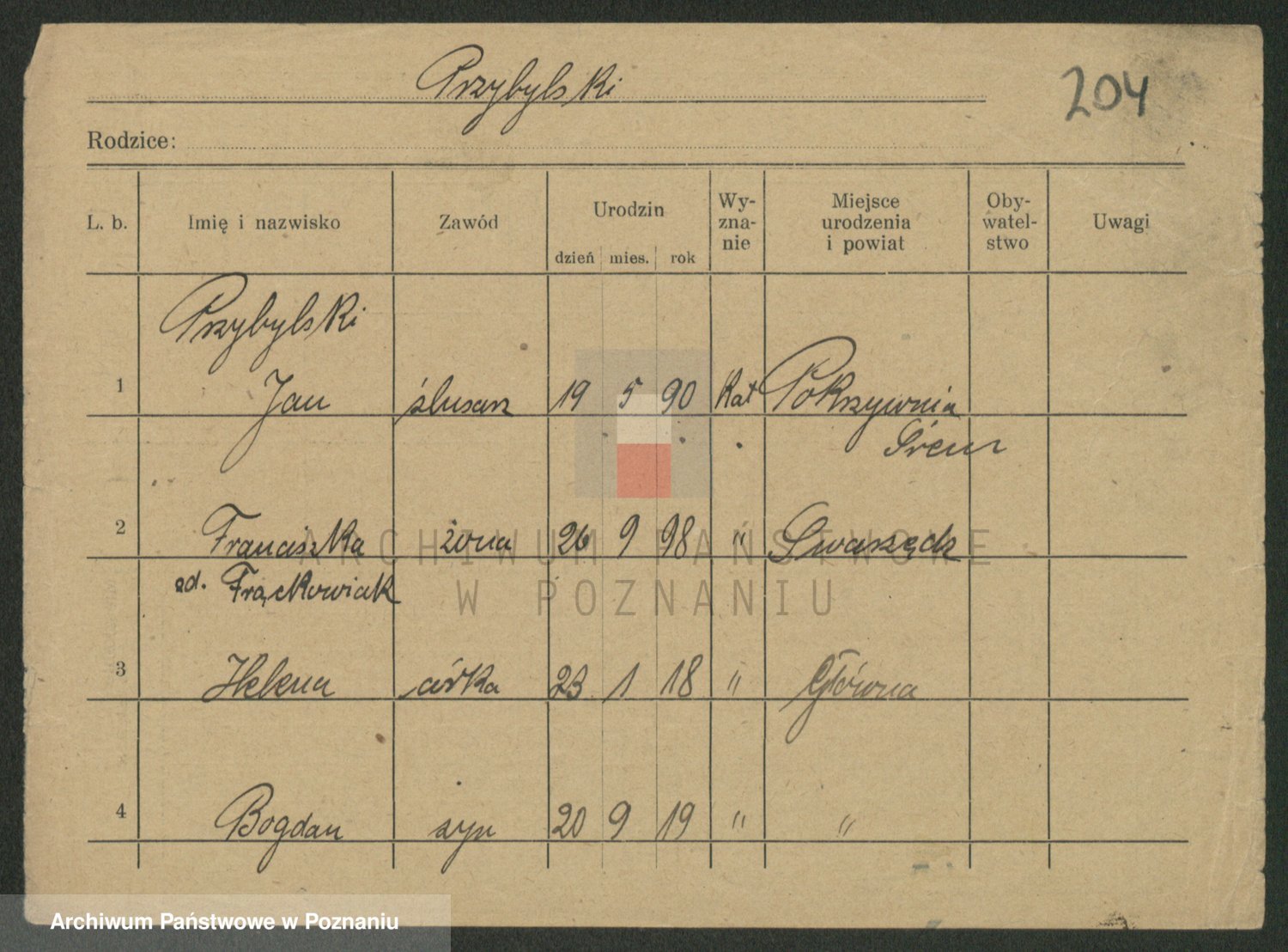 Podgląd karty osobowej dostępny jest po kliknięciu na nazwisko lub ikonkę karty. Można dokonywać powiększenia (ikony na górze) lub przechodzić między kolejnymi skanami (strzałki po bokach).