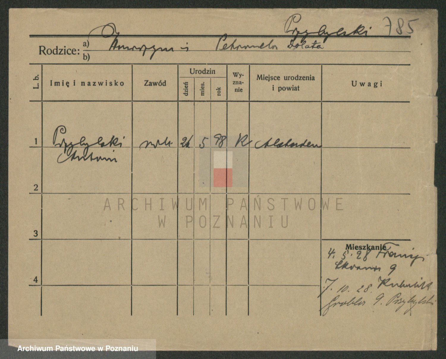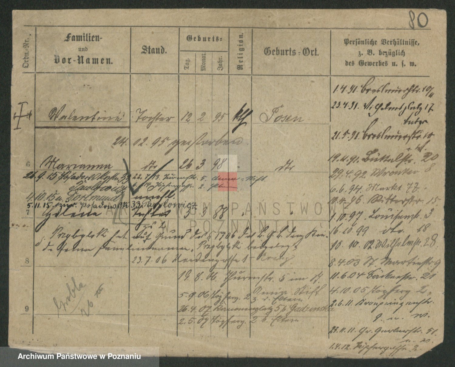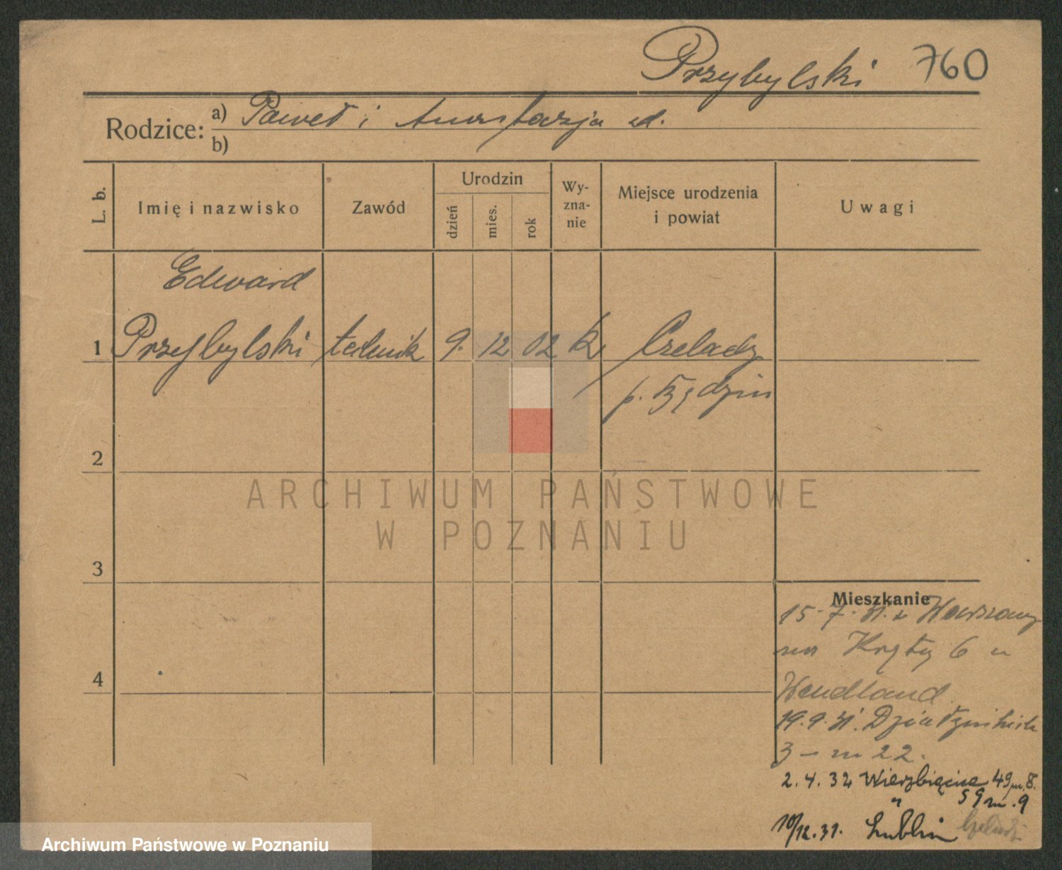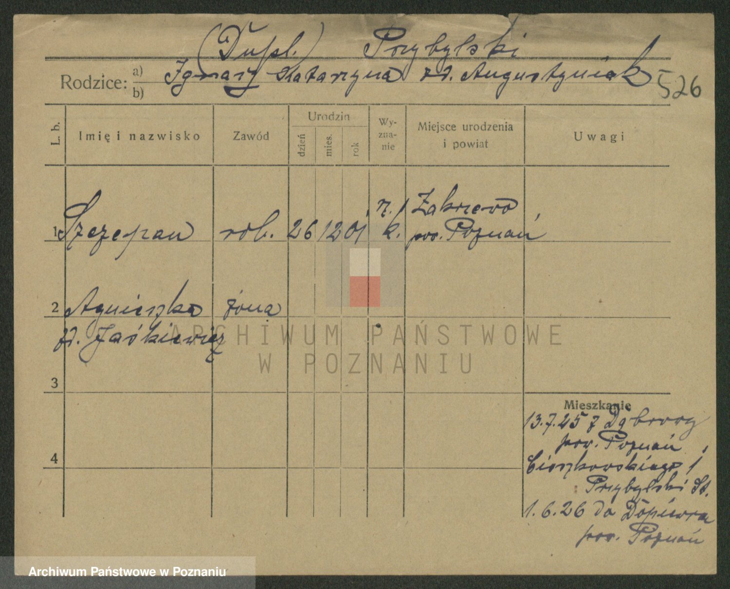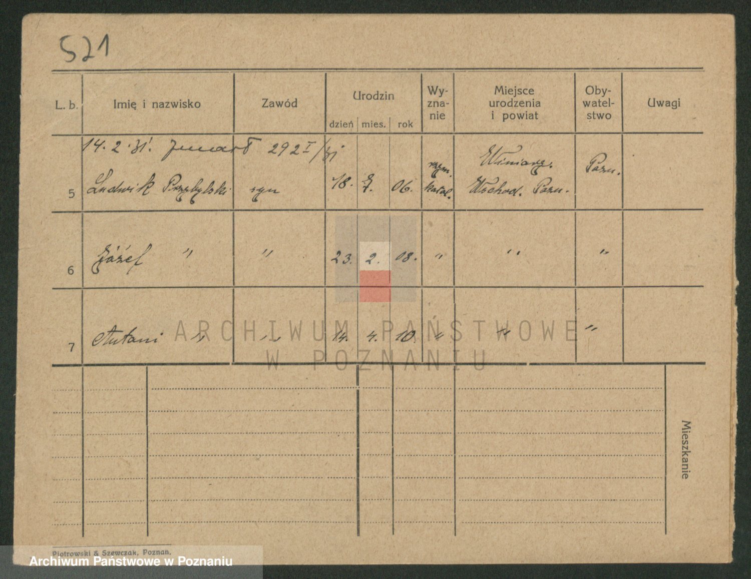 Podgląd karty osobowej dostępny jest po kliknięciu na nazwisko lub ikonkę karty. Można dokonywać powiększenia (ikony na górze) lub przechodzić między kolejnymi skanami (strzałki po bokach).