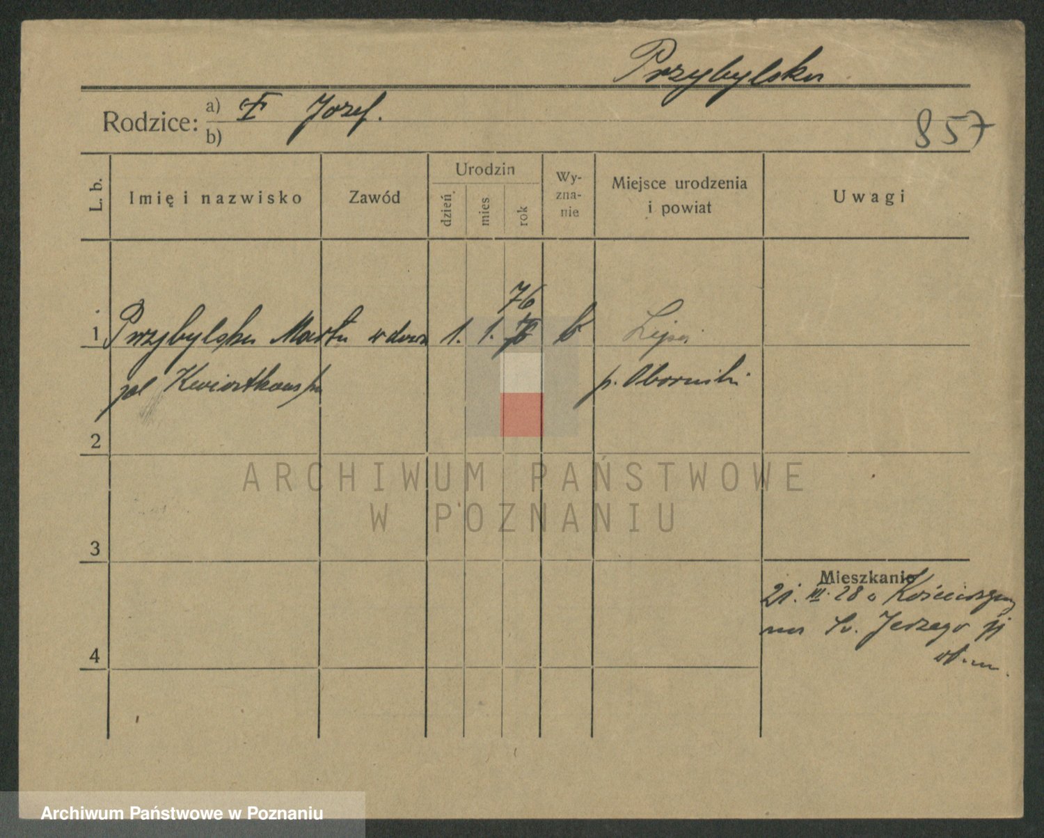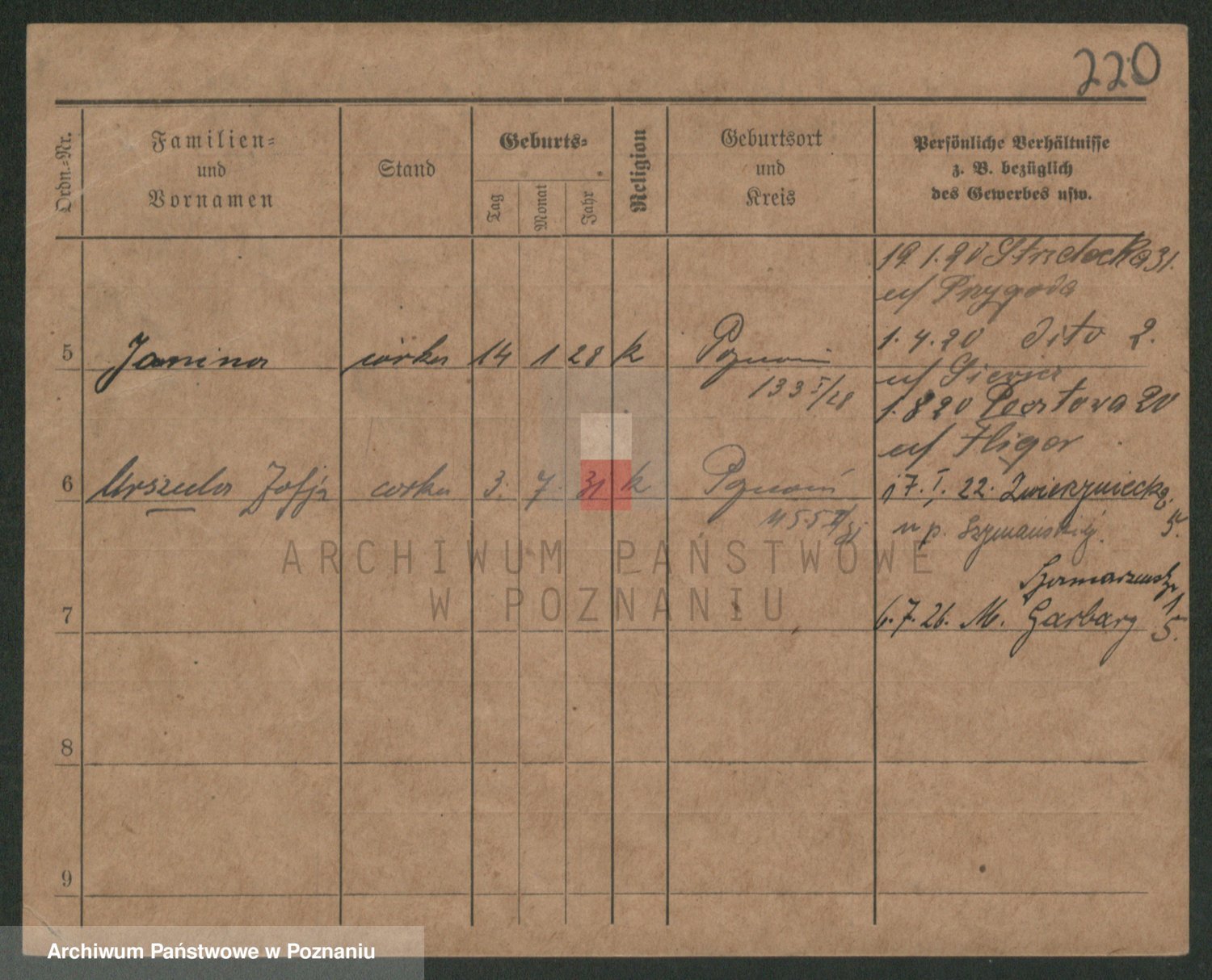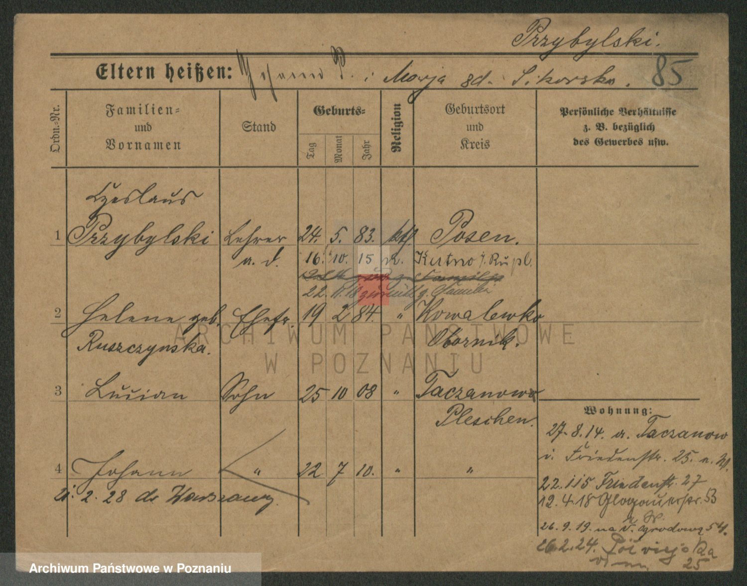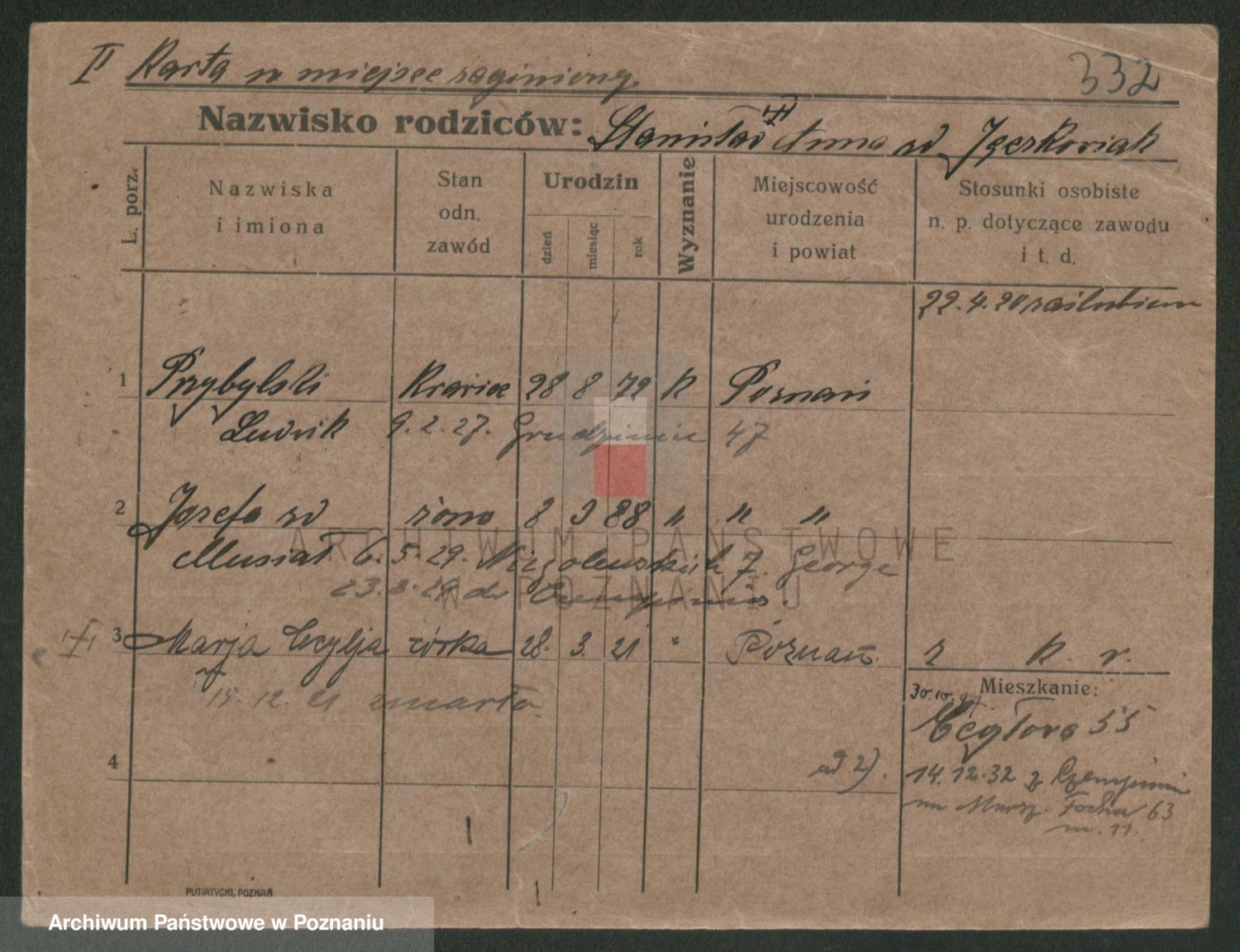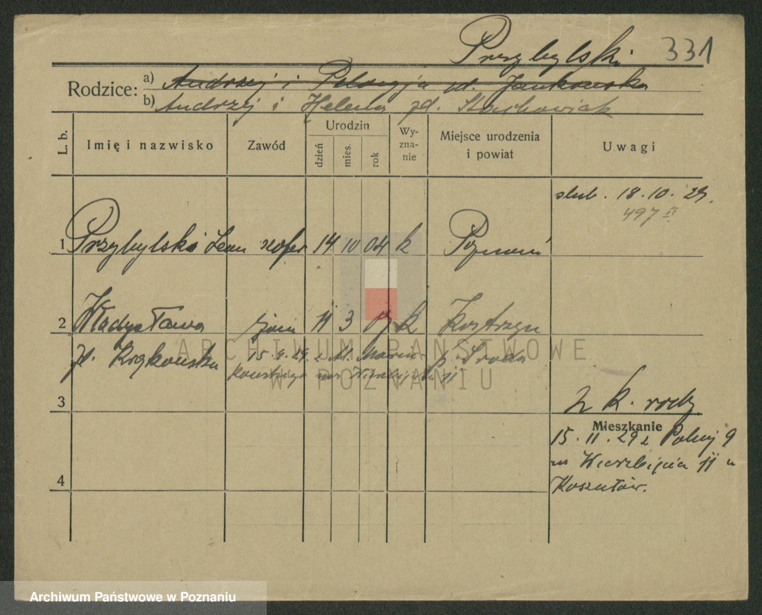 Podgląd karty osobowej dostępny jest po kliknięciu na nazwisko lub ikonkę karty. Można dokonywać powiększenia (ikony na górze) lub przechodzić między kolejnymi skanami (strzałki po bokach).