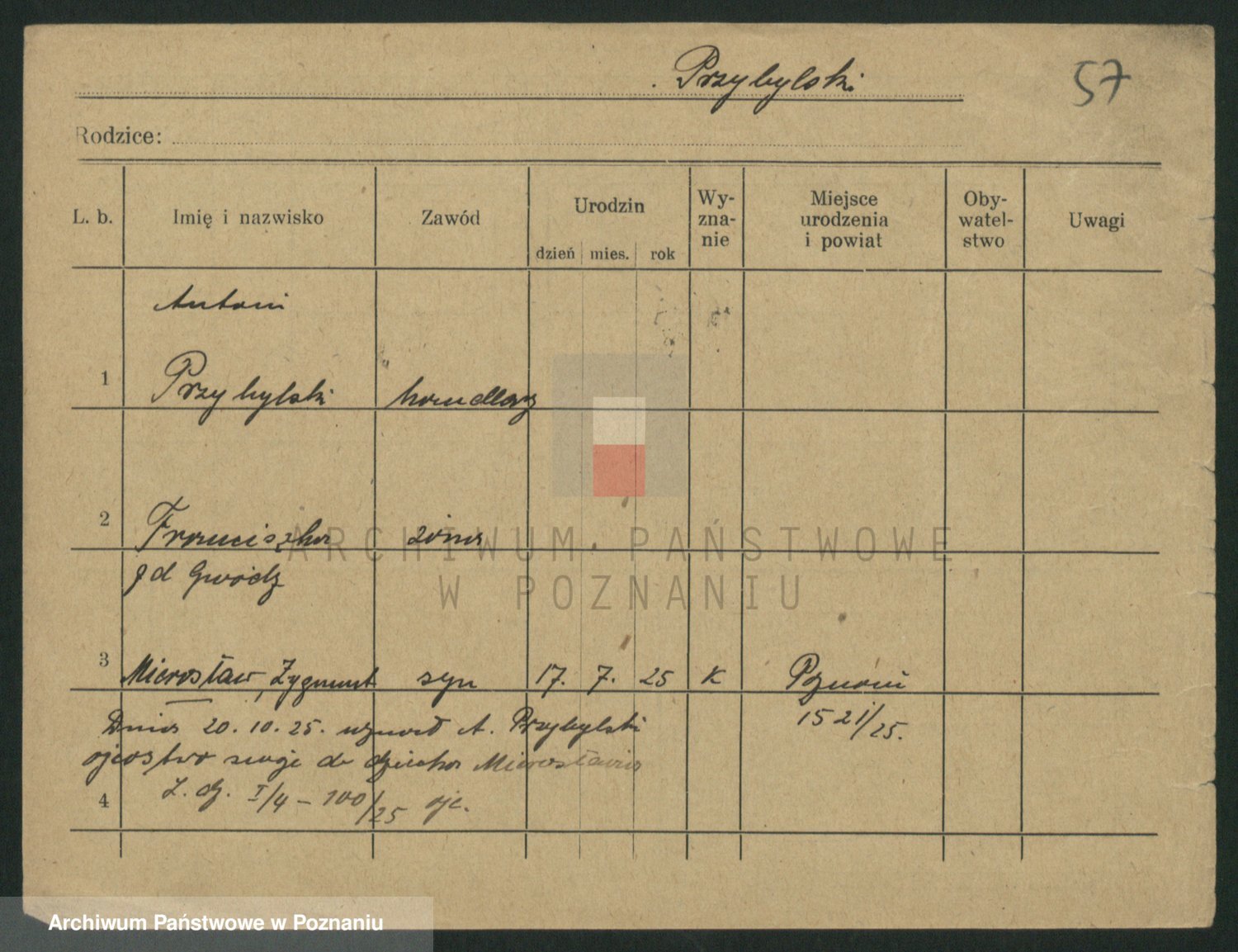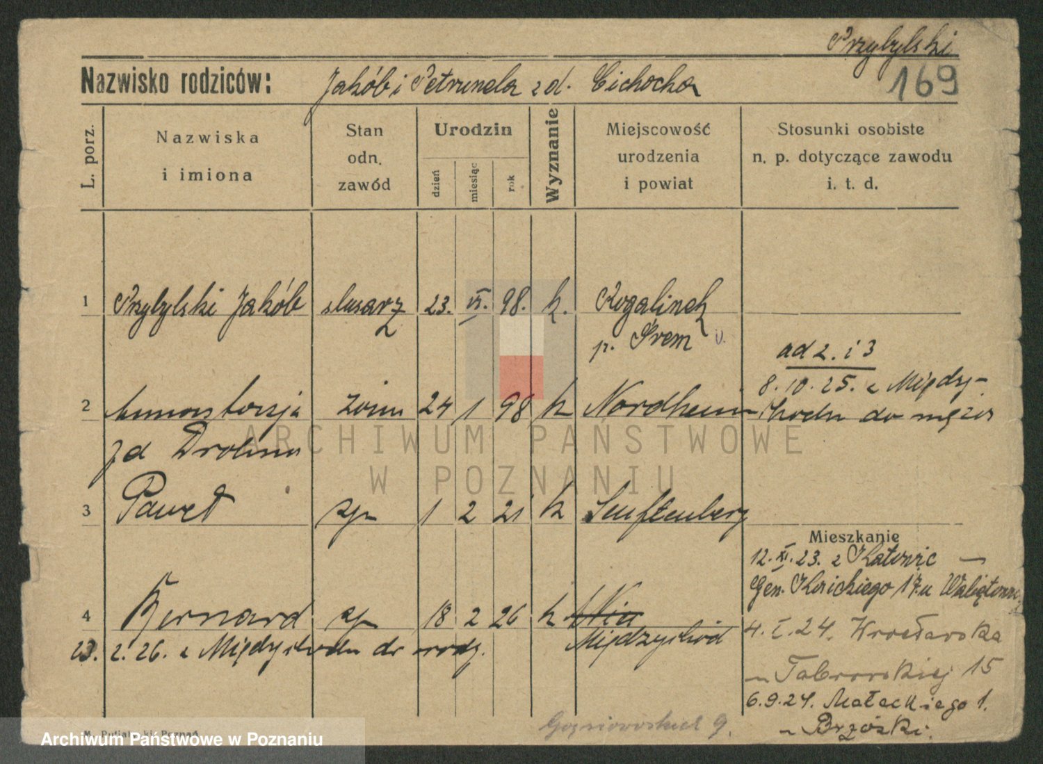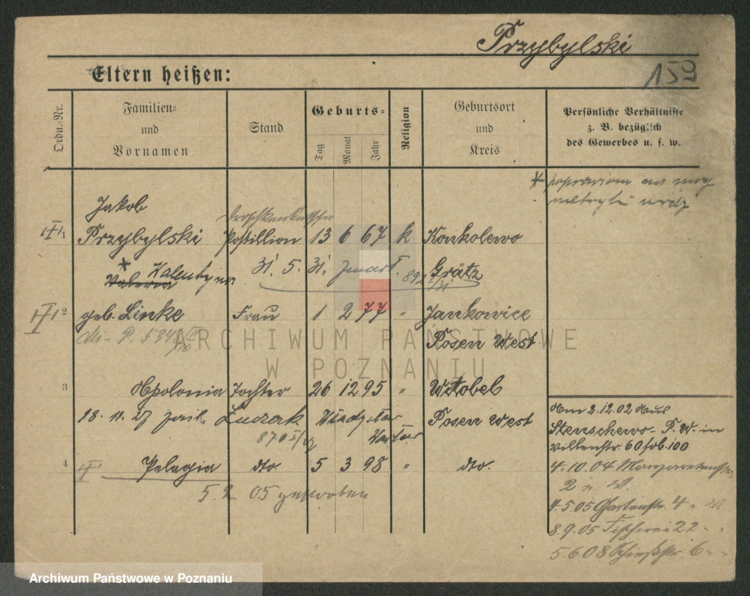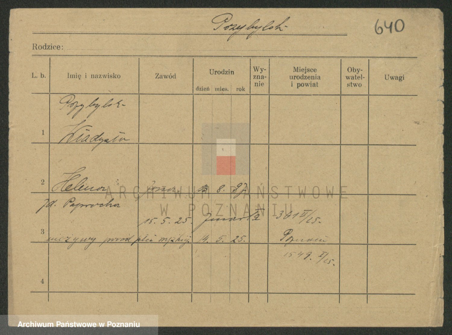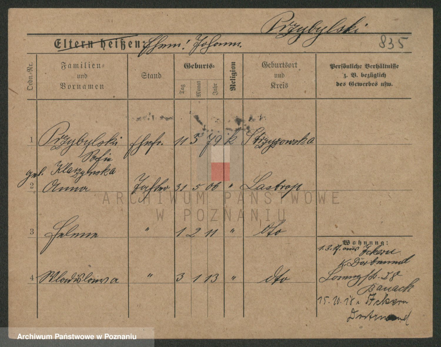 Podgląd karty osobowej dostępny jest po kliknięciu na nazwisko lub ikonkę karty. Można dokonywać powiększenia (ikony na górze) lub przechodzić między kolejnymi skanami (strzałki po bokach).
