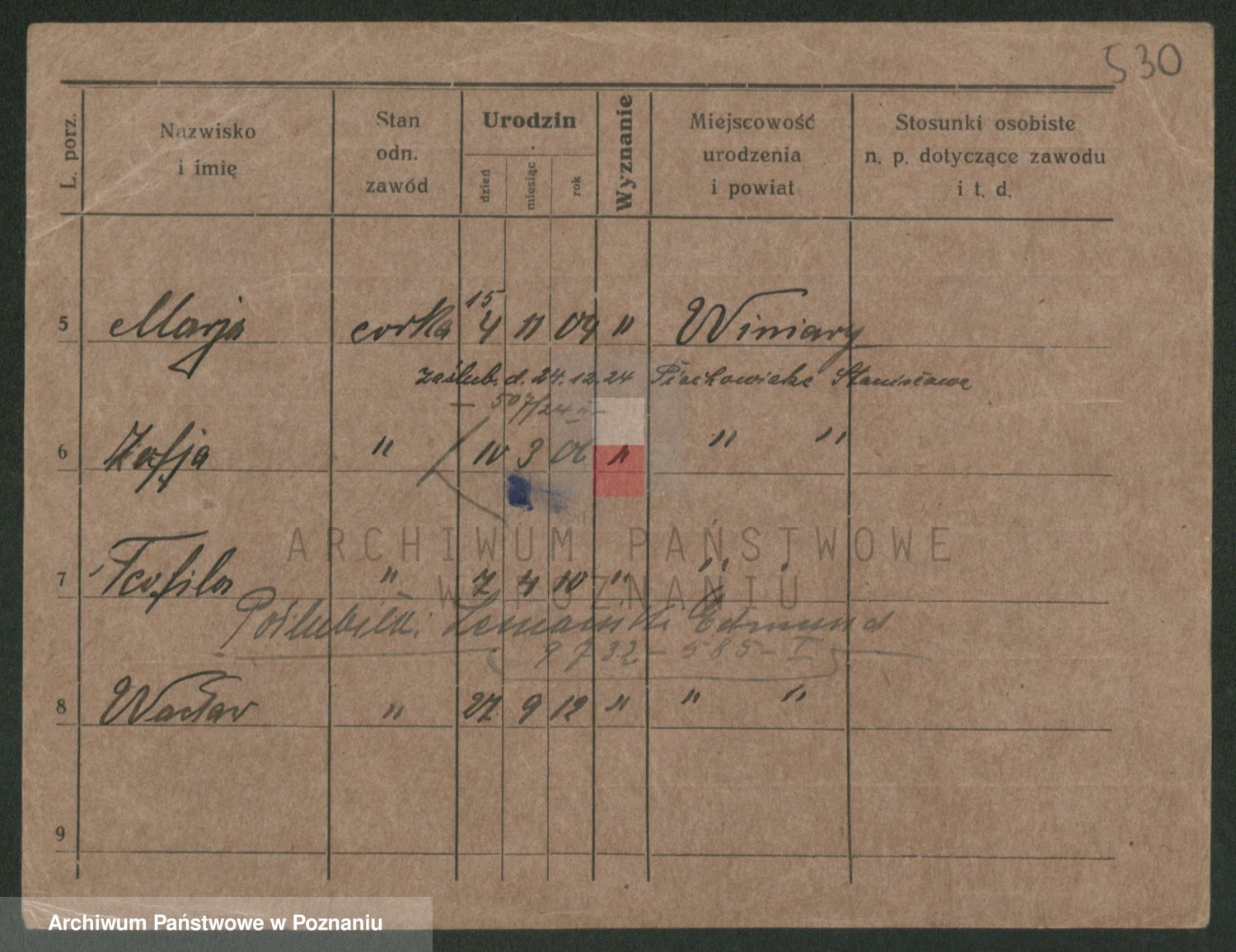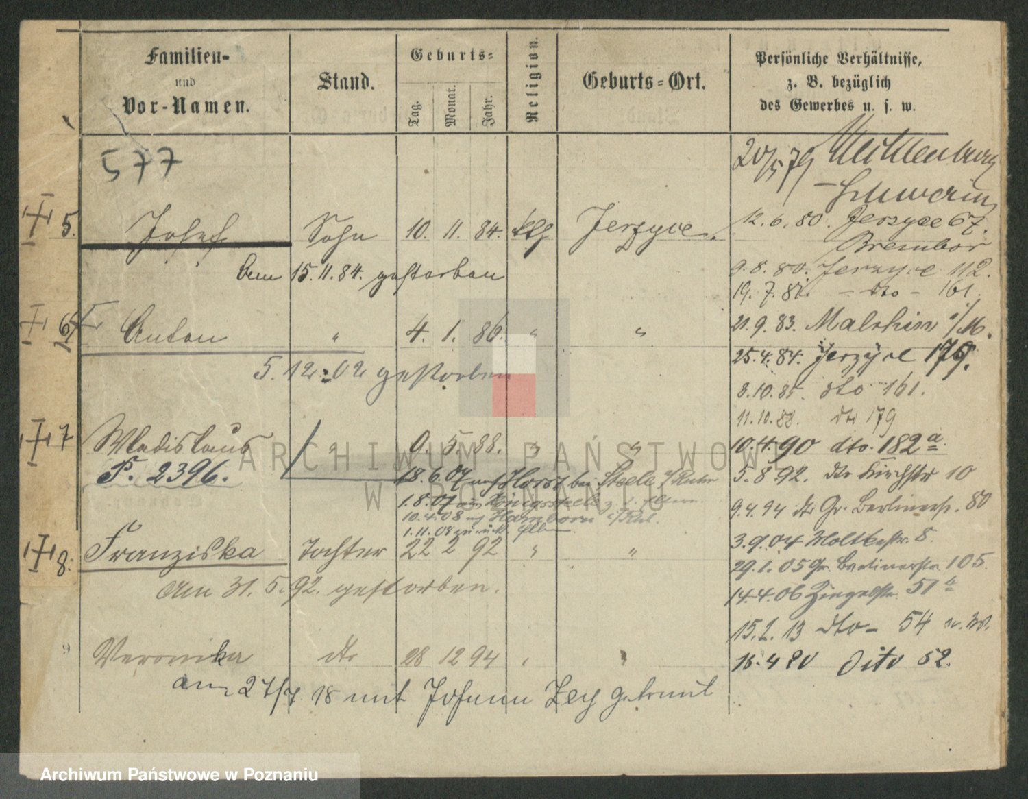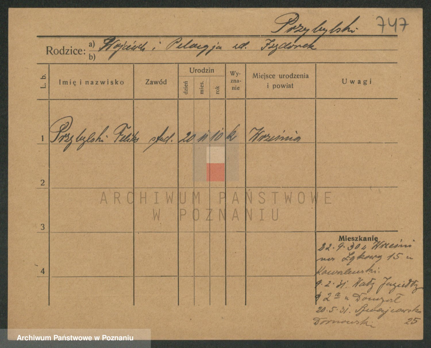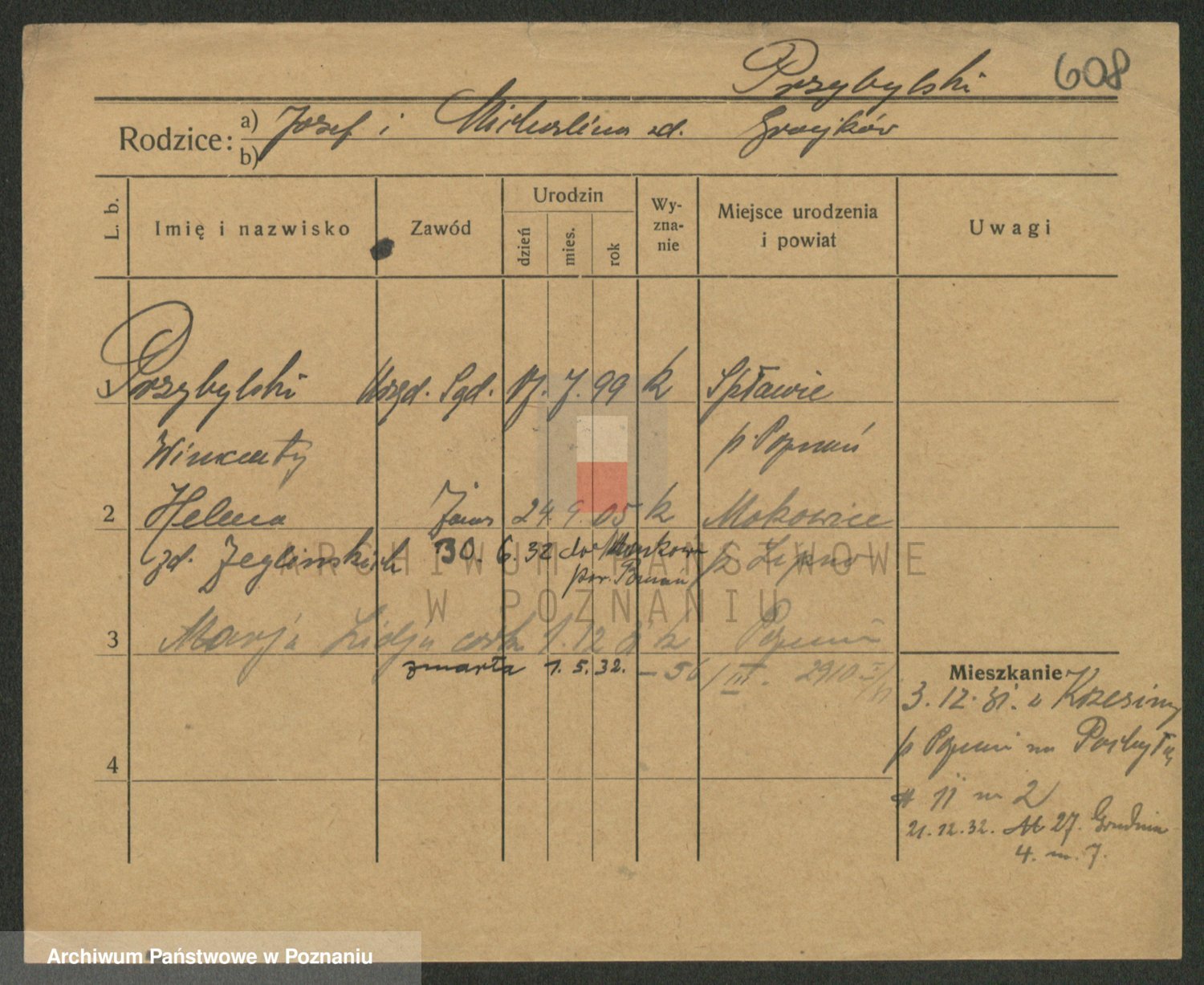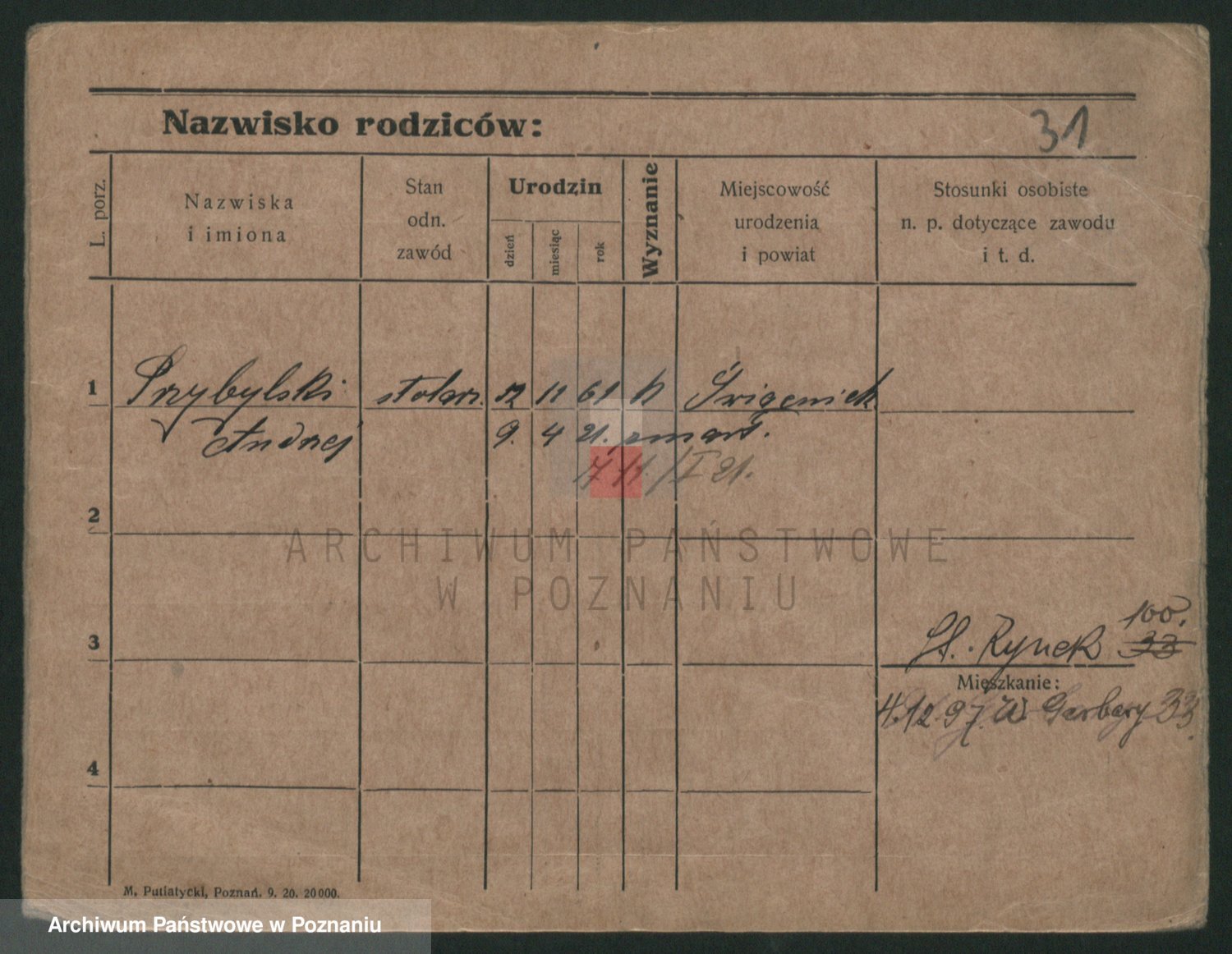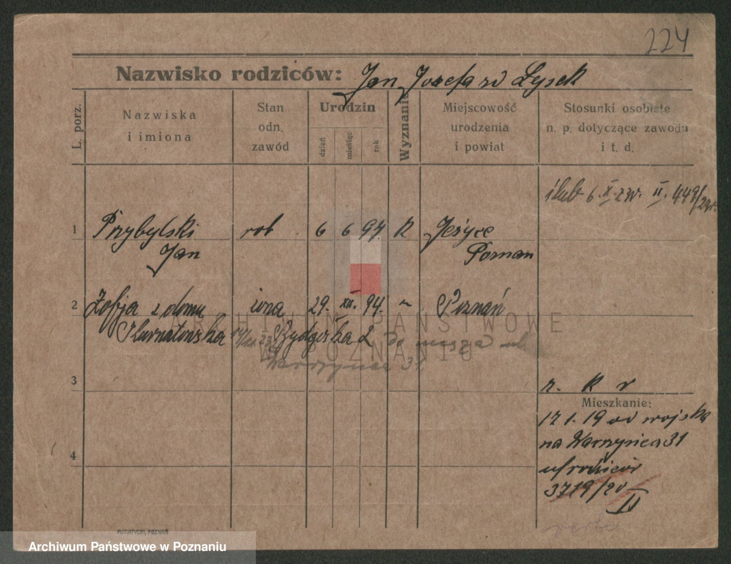 Podgląd karty osobowej dostępny jest po kliknięciu na nazwisko lub ikonkę karty. Można dokonywać powiększenia (ikony na górze) lub przechodzić między kolejnymi skanami (strzałki po bokach).