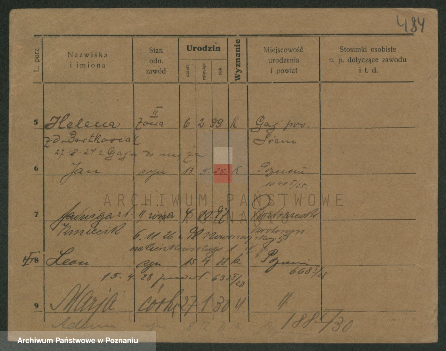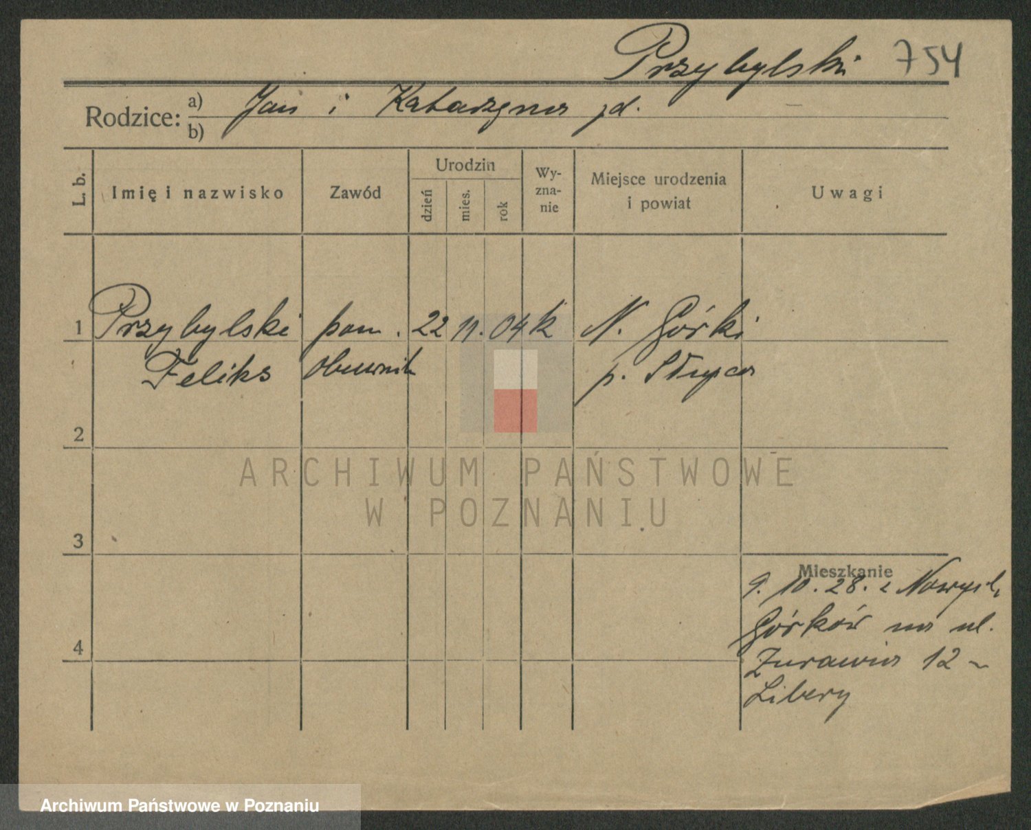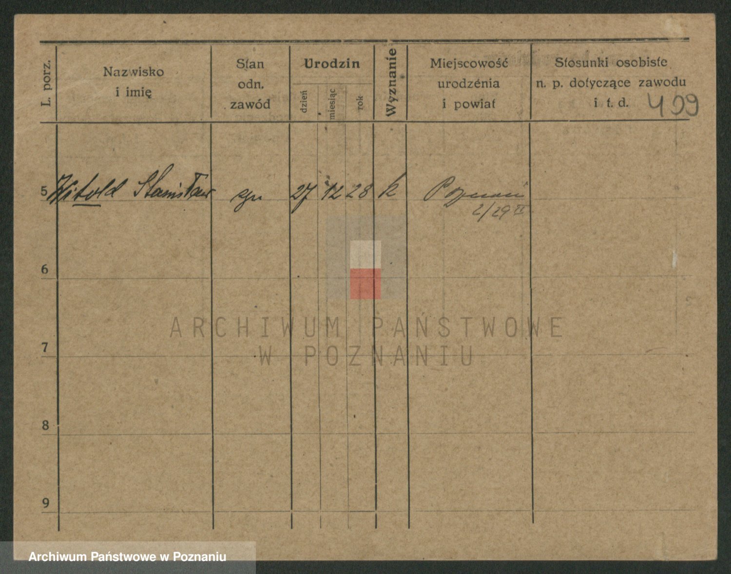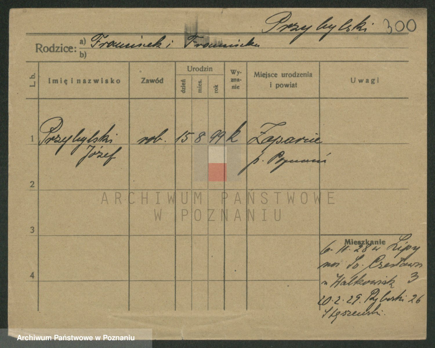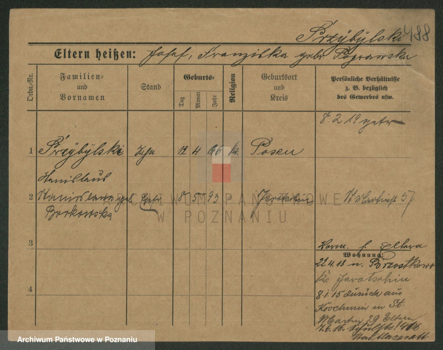 Podgląd karty osobowej dostępny jest po kliknięciu na nazwisko lub ikonkę karty. Można dokonywać powiększenia (ikony na górze) lub przechodzić między kolejnymi skanami (strzałki po bokach).