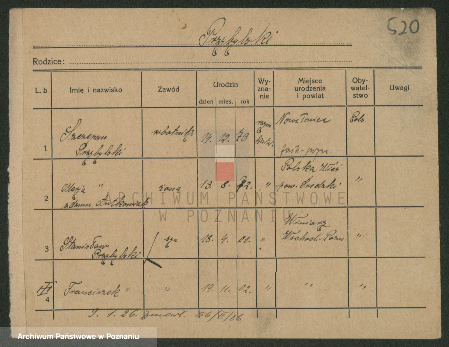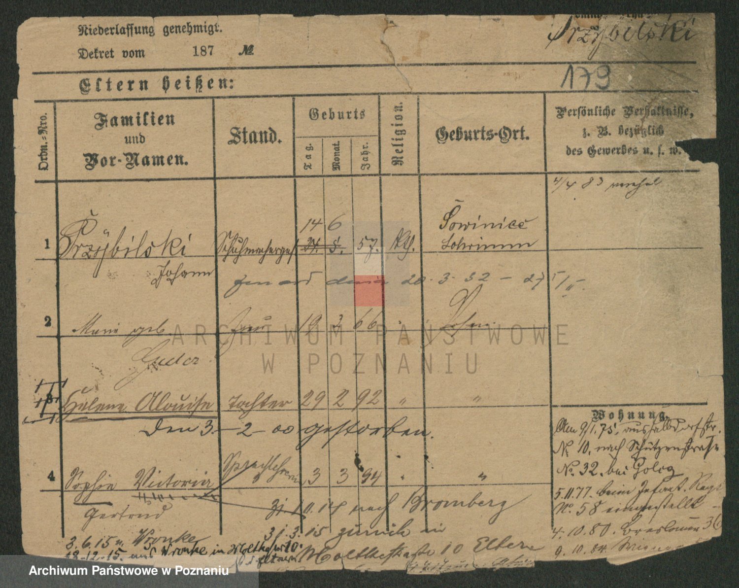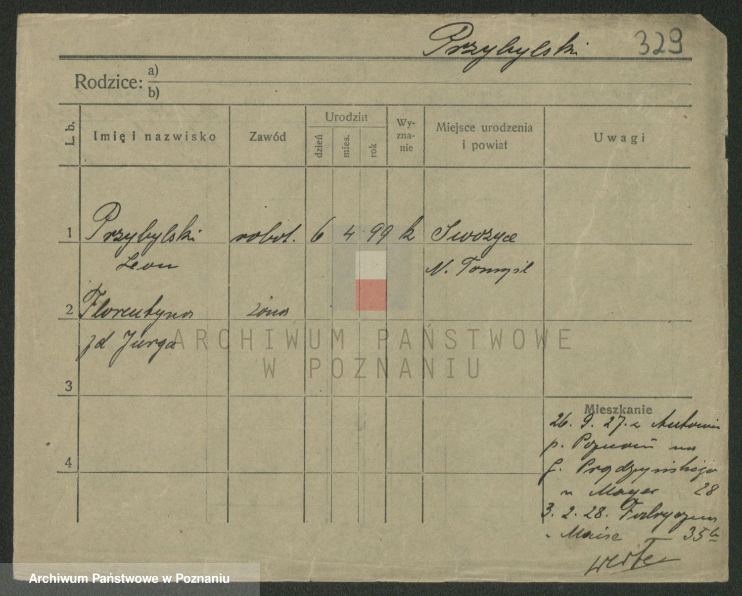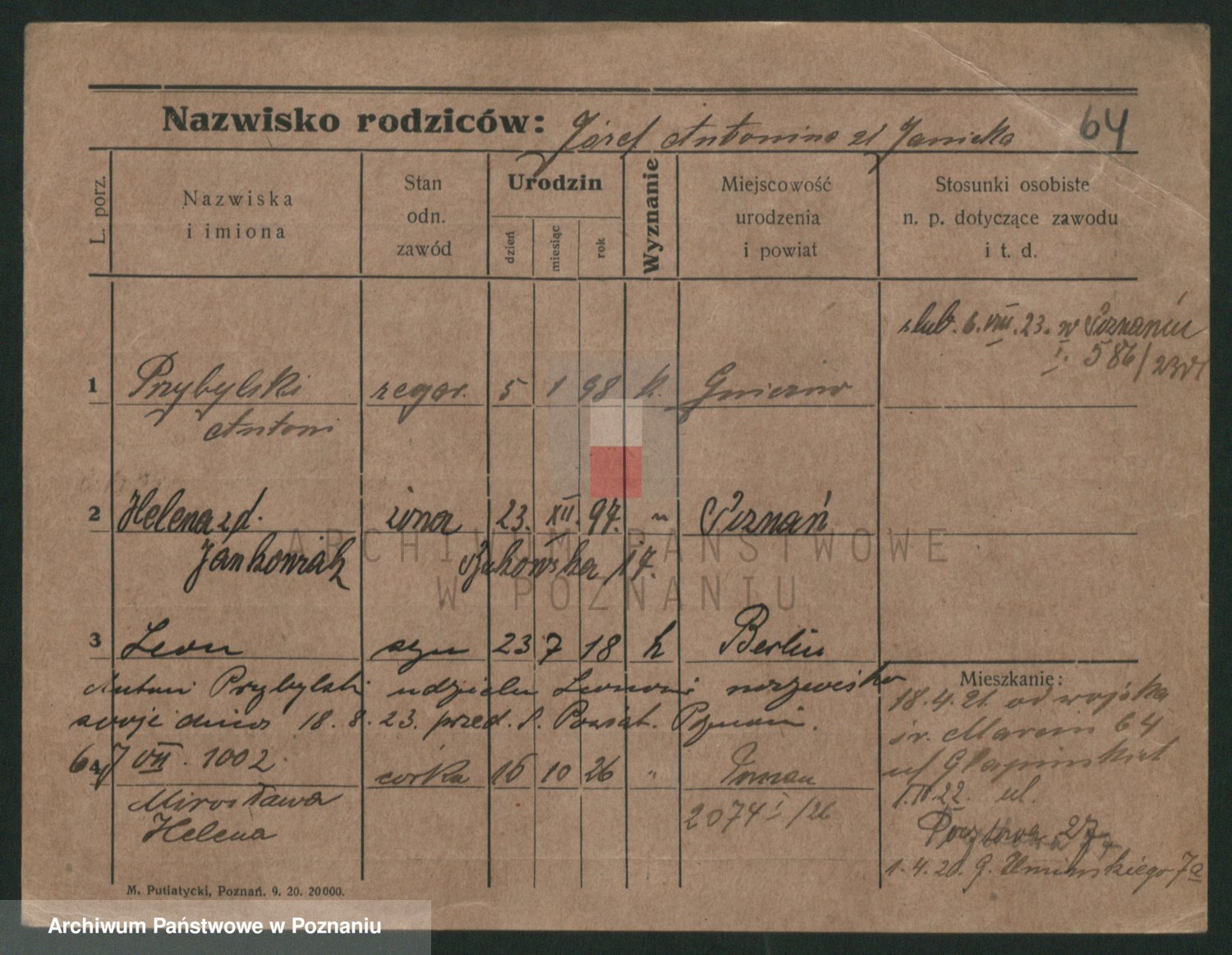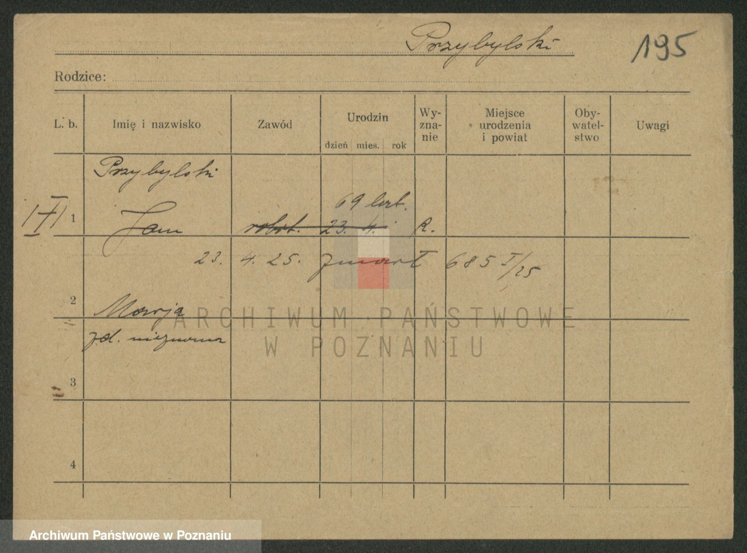 Podgląd karty osobowej dostępny jest po kliknięciu na nazwisko lub ikonkę karty. Można dokonywać powiększenia (ikony na górze) lub przechodzić między kolejnymi skanami (strzałki po bokach).