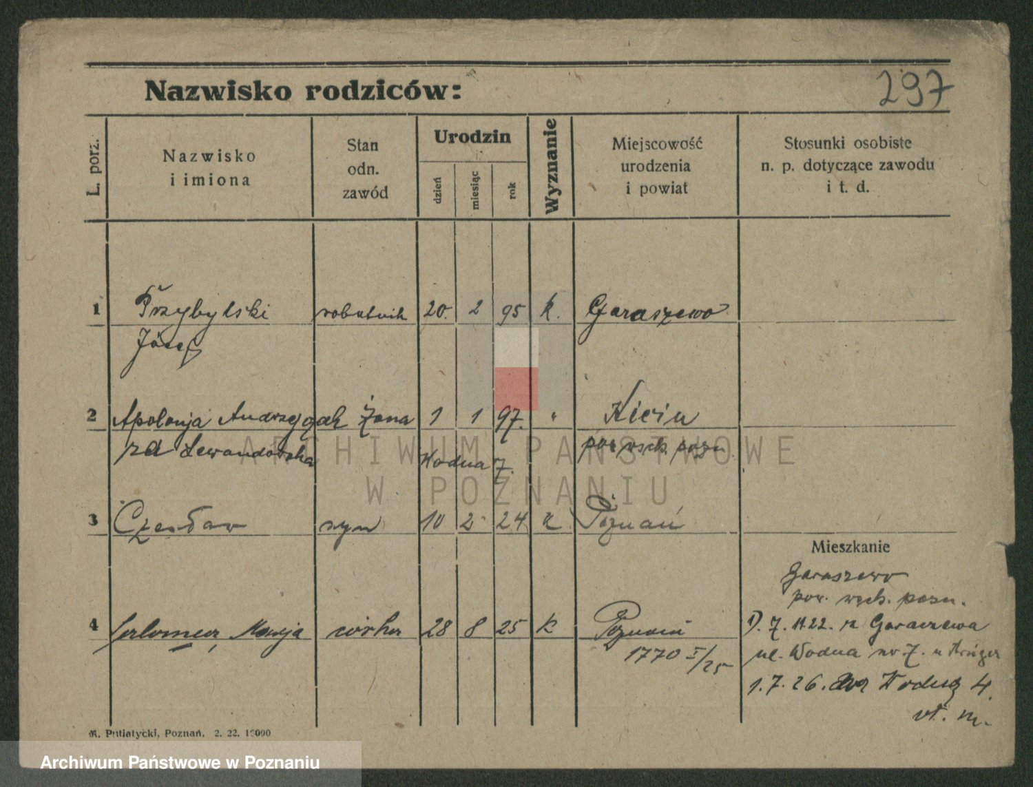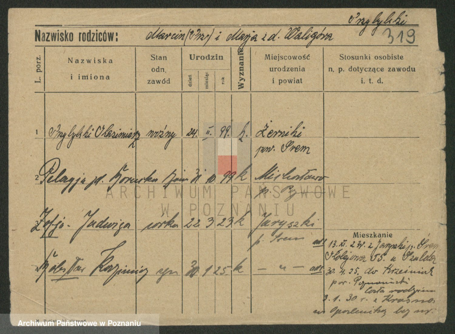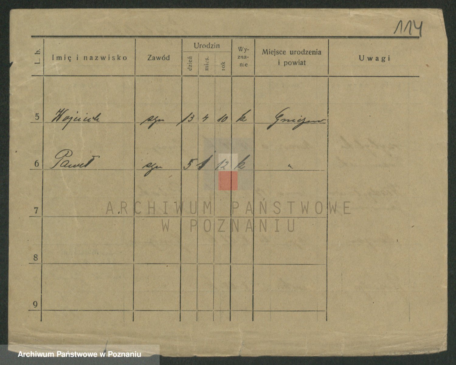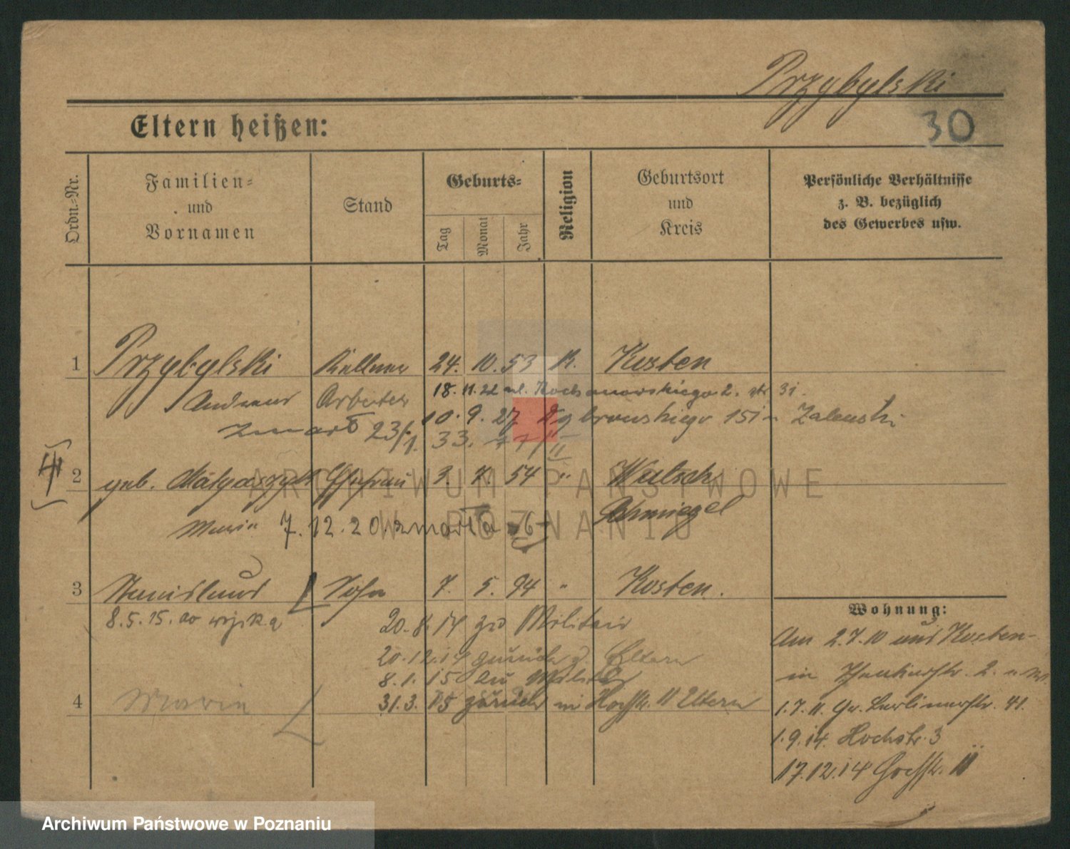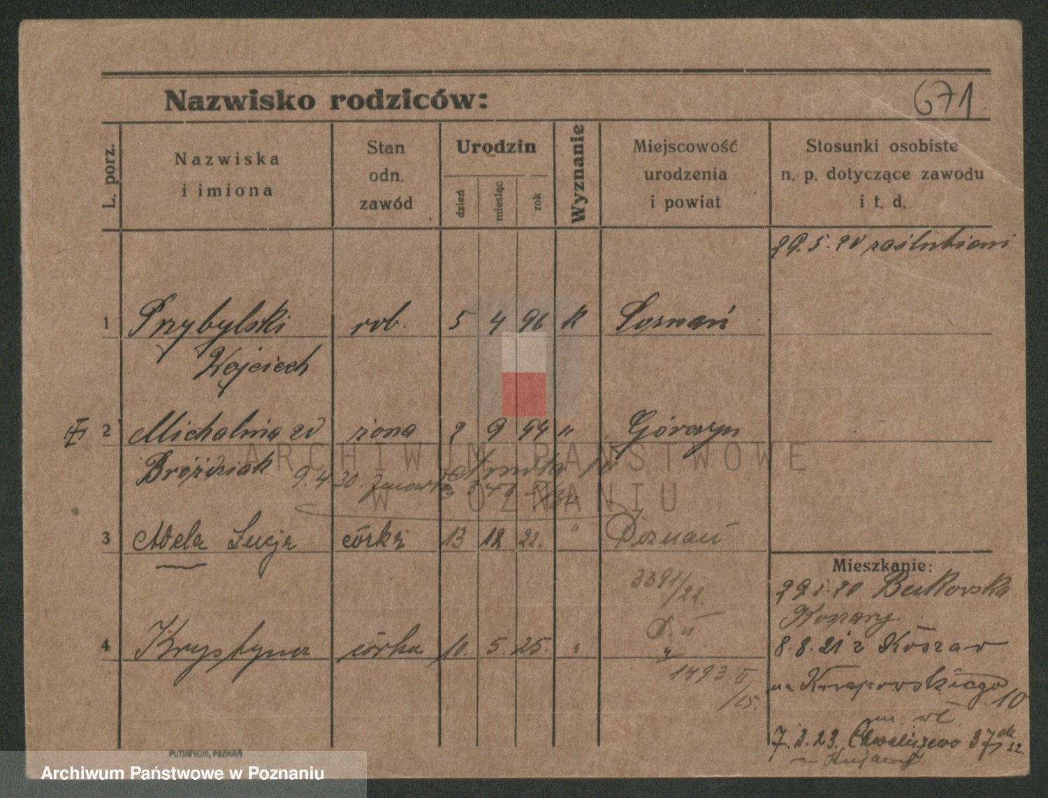 Podgląd karty osobowej dostępny jest po kliknięciu na nazwisko lub ikonkę karty. Można dokonywać powiększenia (ikony na górze) lub przechodzić między kolejnymi skanami (strzałki po bokach).