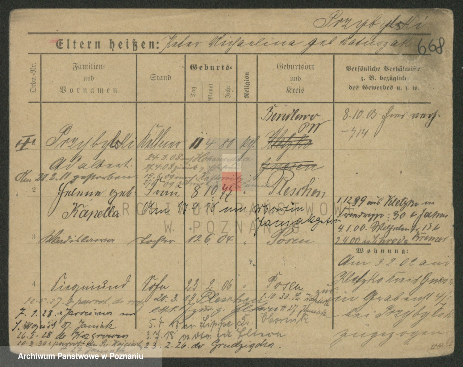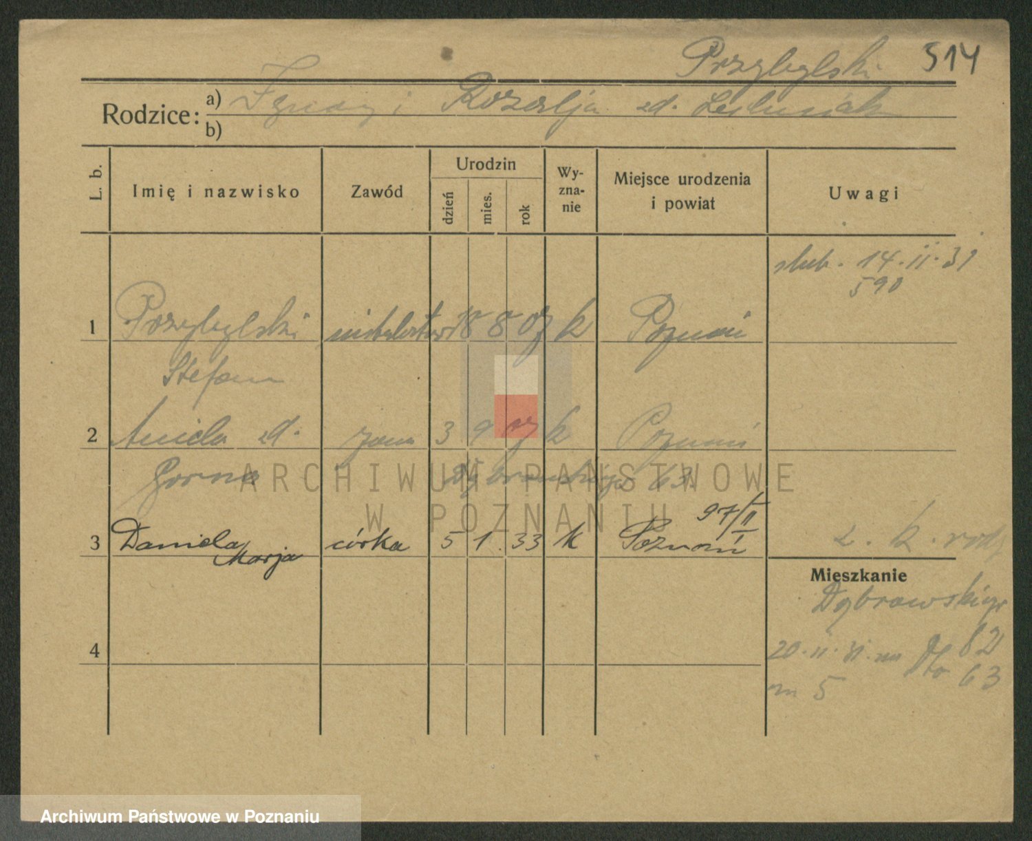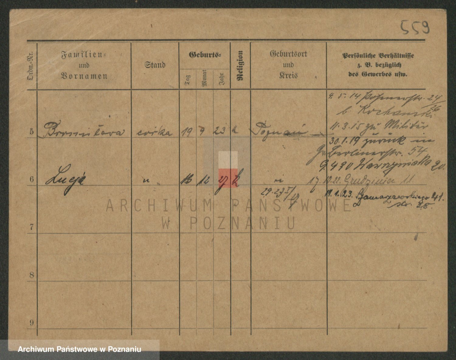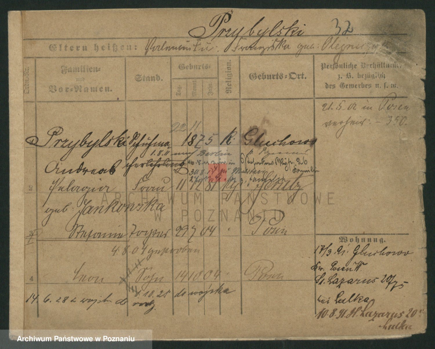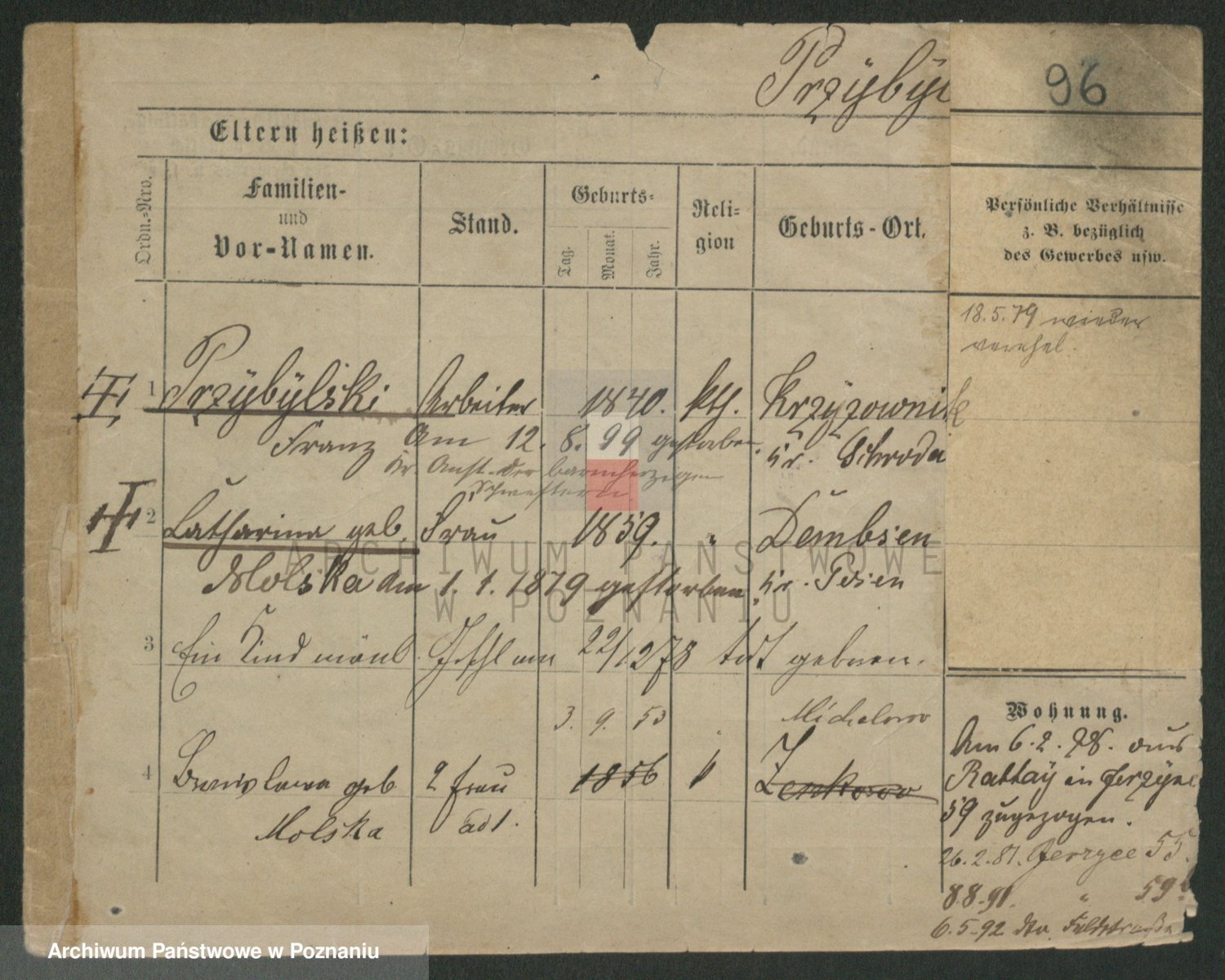 Podgląd karty osobowej dostępny jest po kliknięciu na nazwisko lub ikonkę karty. Można dokonywać powiększenia (ikony na górze) lub przechodzić między kolejnymi skanami (strzałki po bokach).
