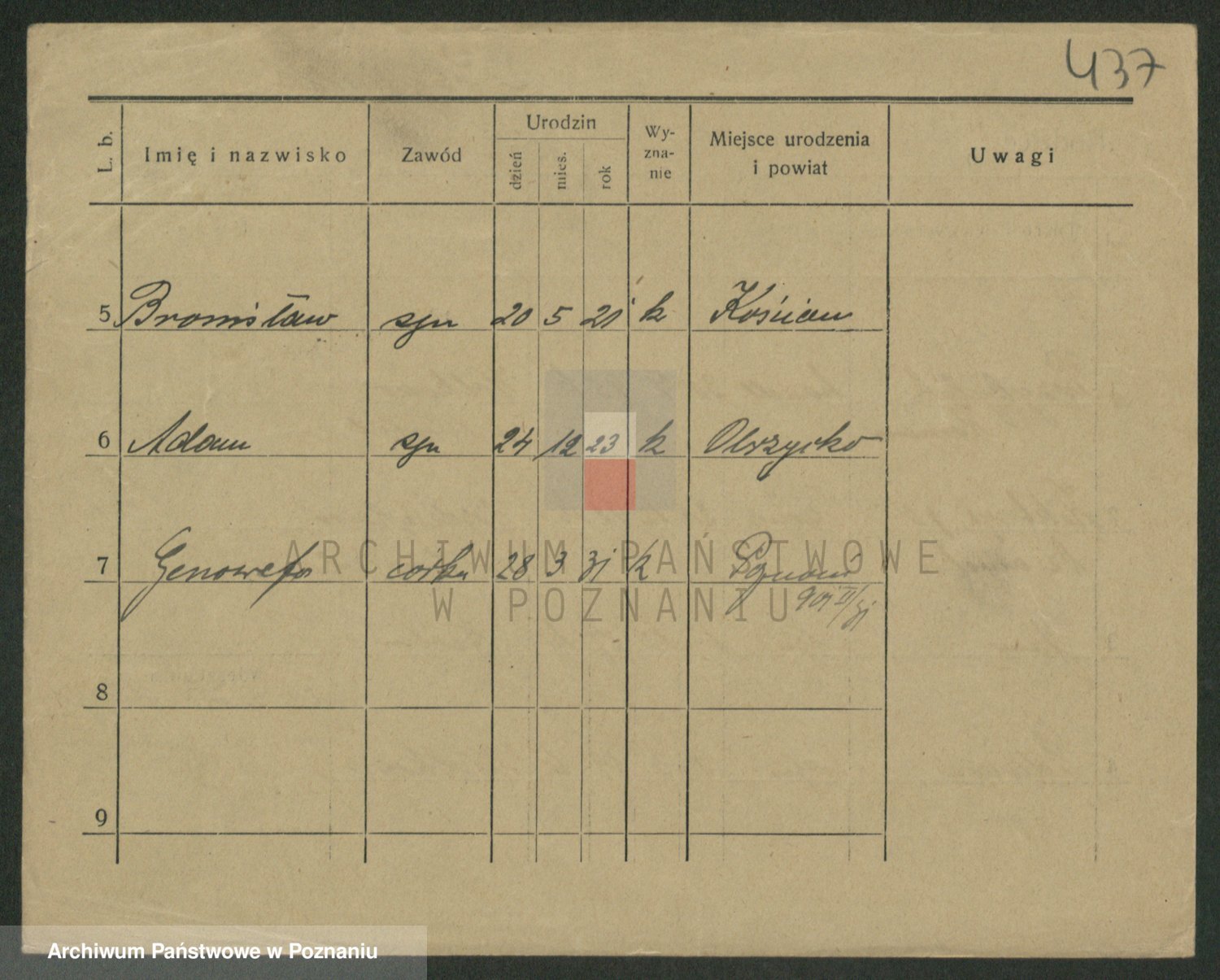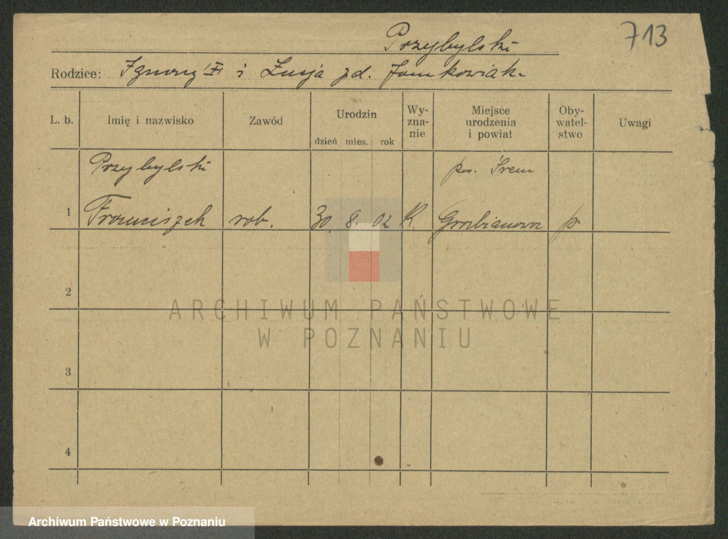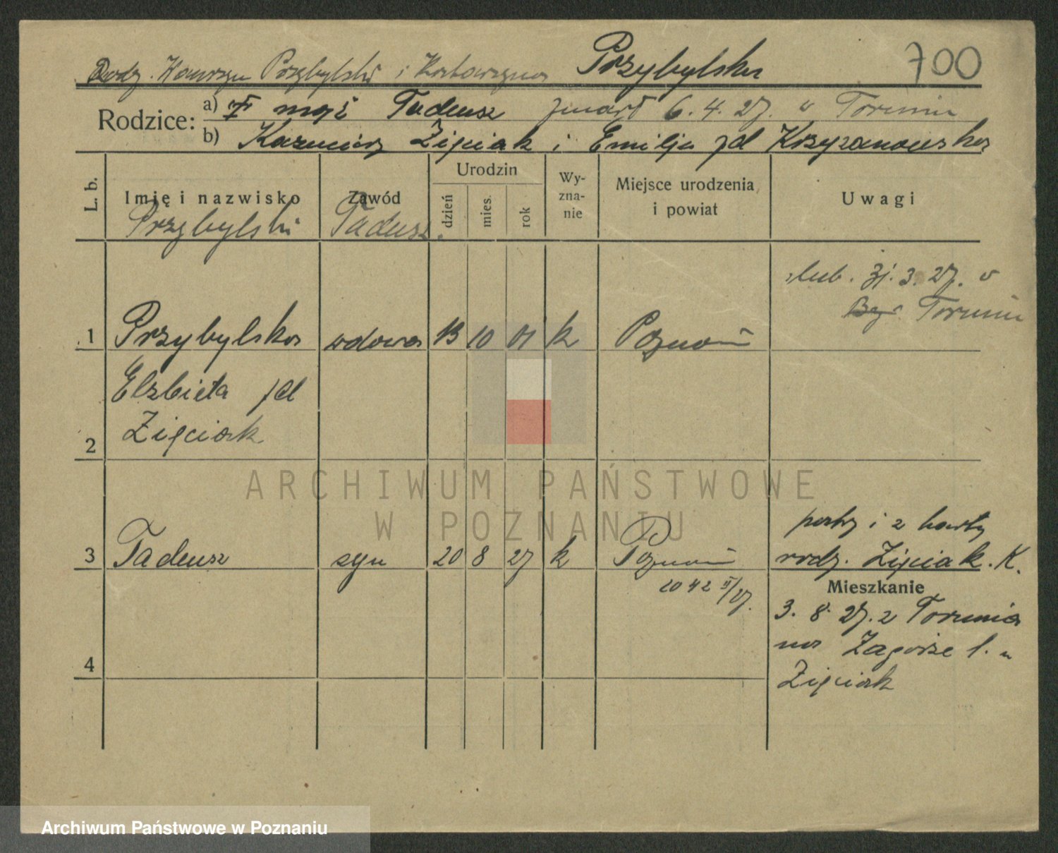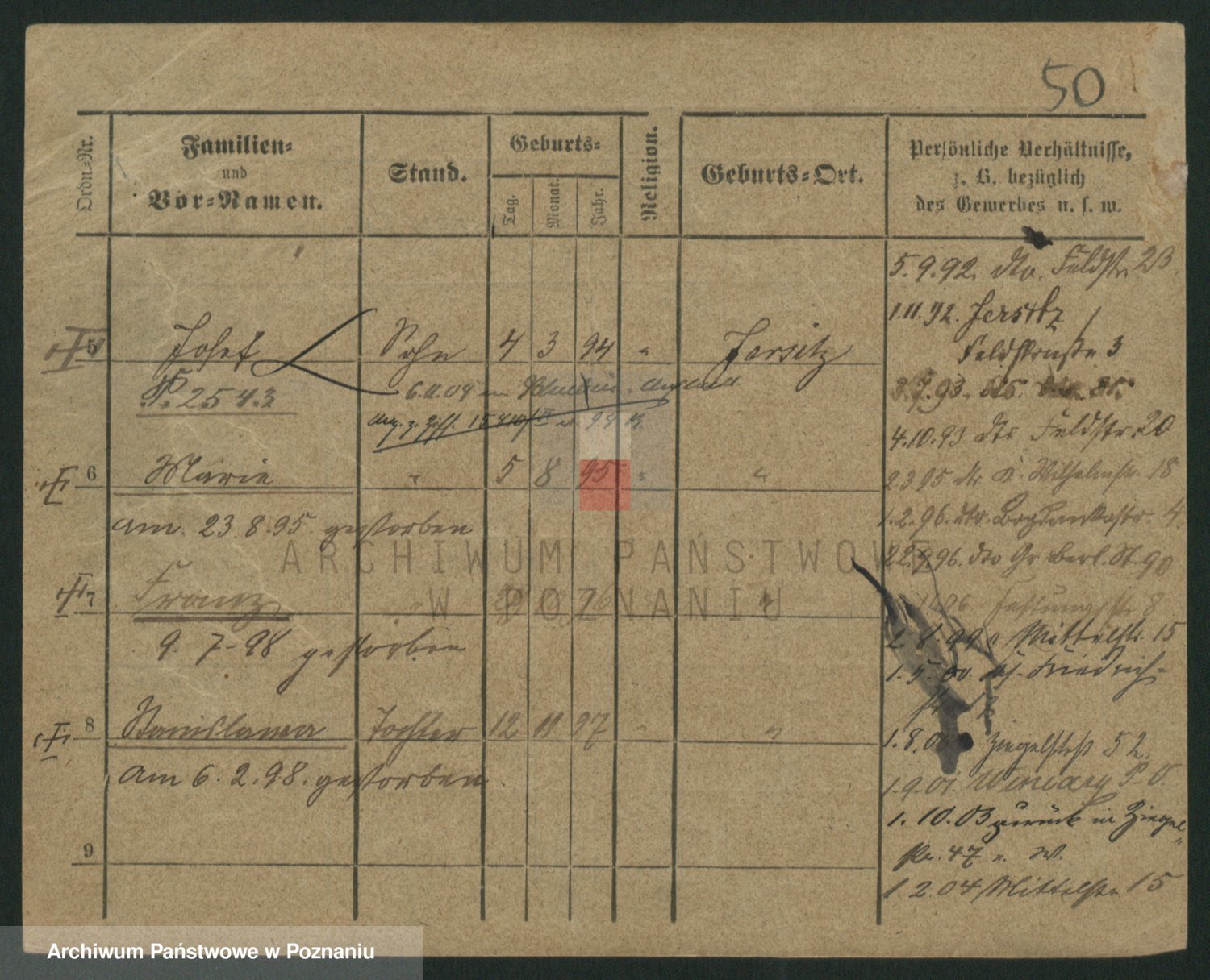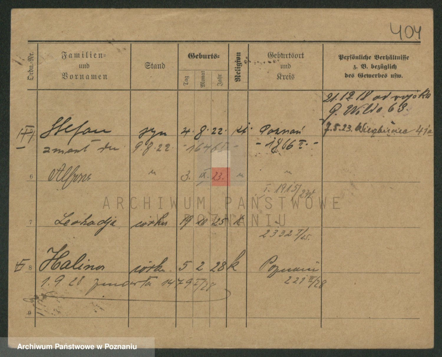 Podgląd karty osobowej dostępny jest po kliknięciu na nazwisko lub ikonkę karty. Można dokonywać powiększenia (ikony na górze) lub przechodzić między kolejnymi skanami (strzałki po bokach).