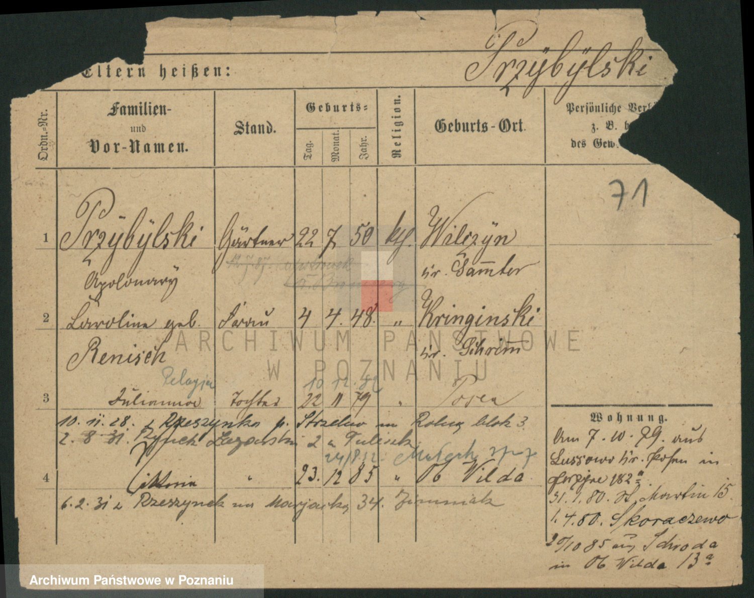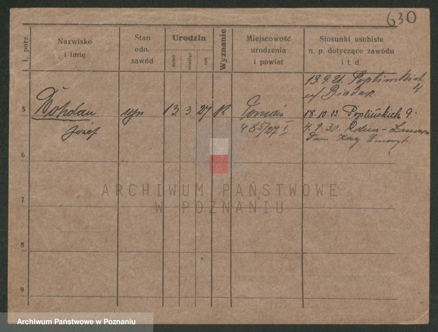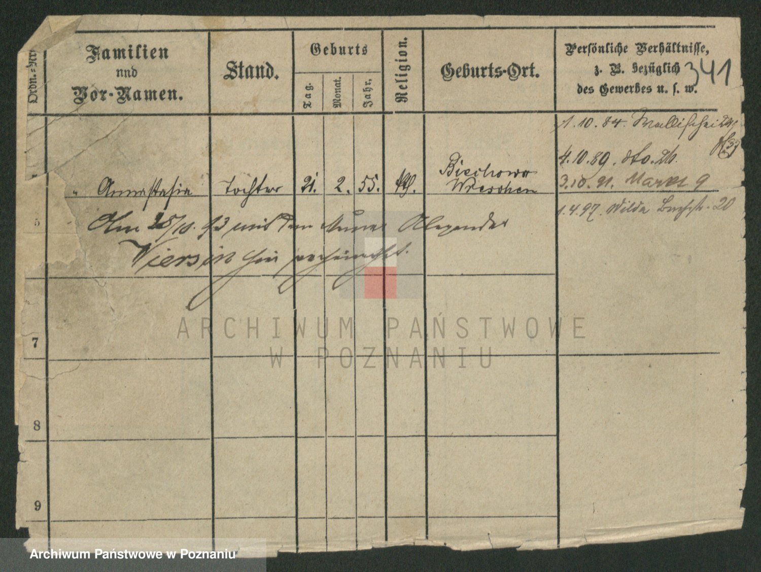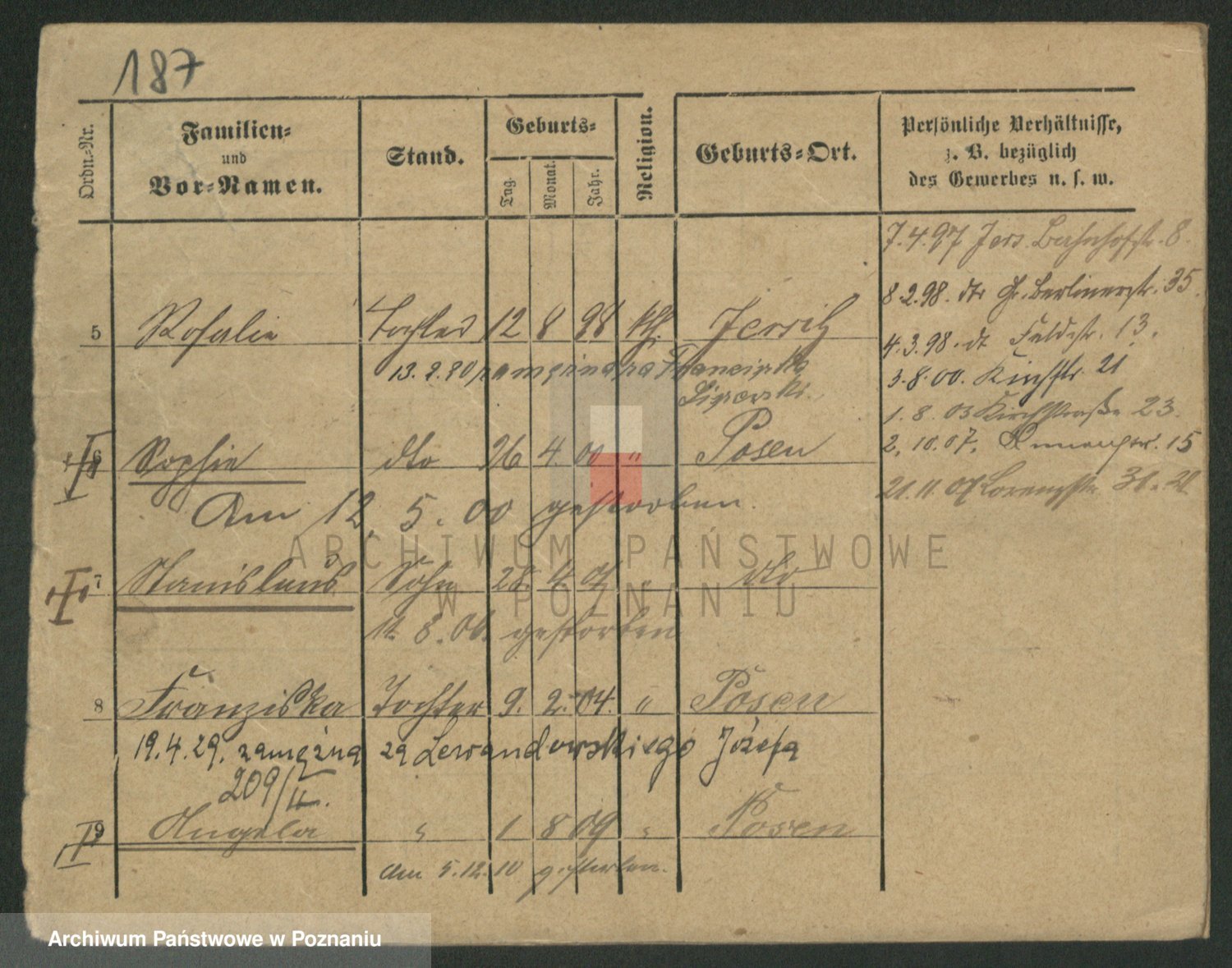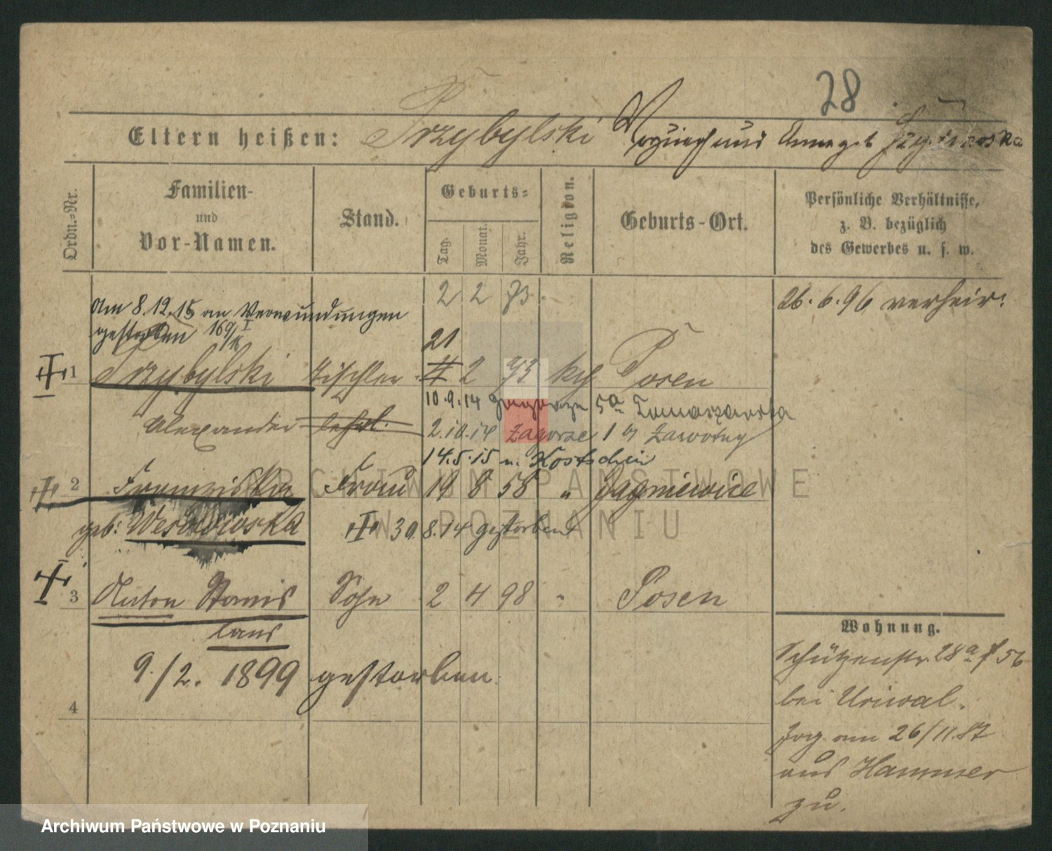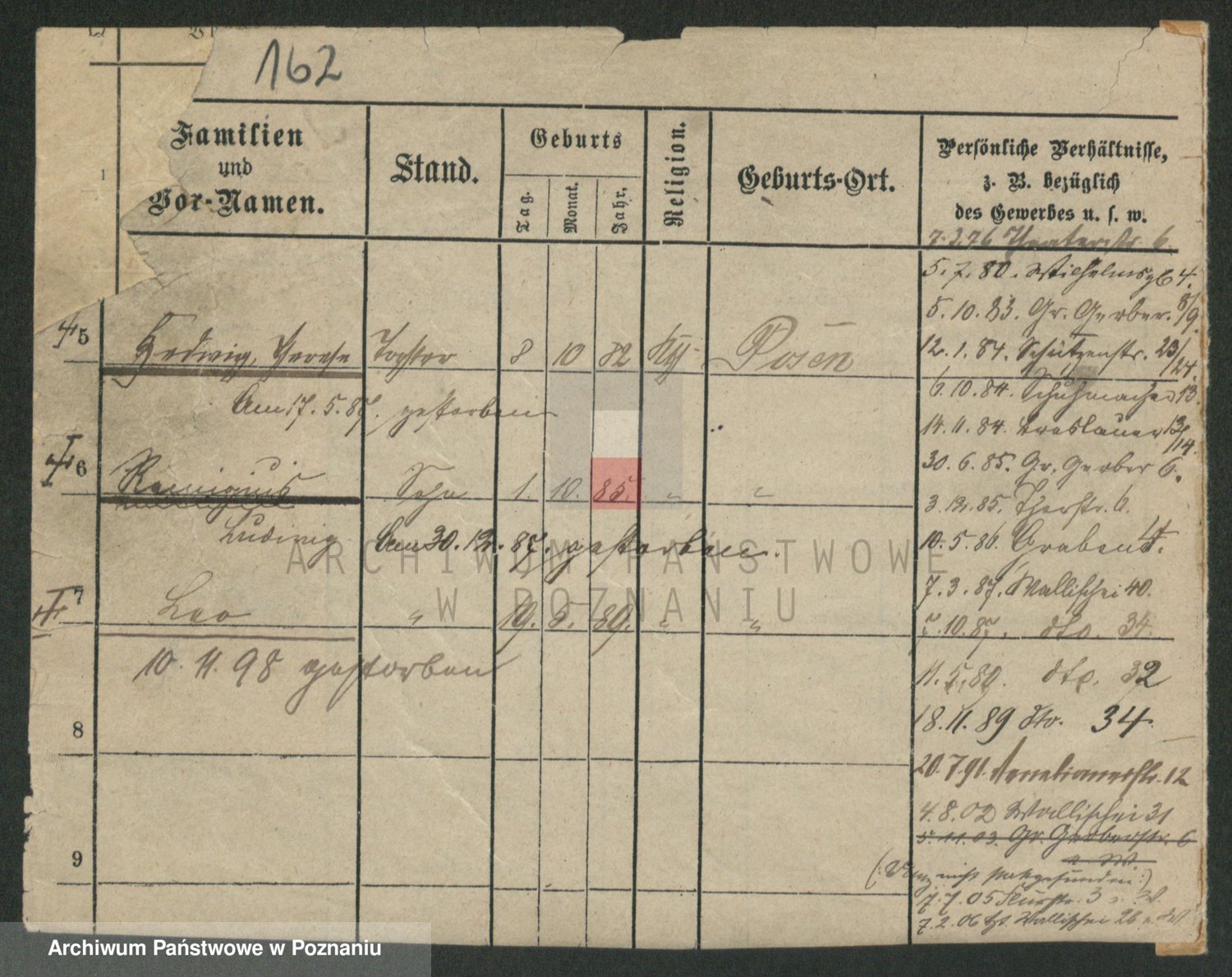 Podgląd karty osobowej dostępny jest po kliknięciu na nazwisko lub ikonkę karty. Można dokonywać powiększenia (ikony na górze) lub przechodzić między kolejnymi skanami (strzałki po bokach).