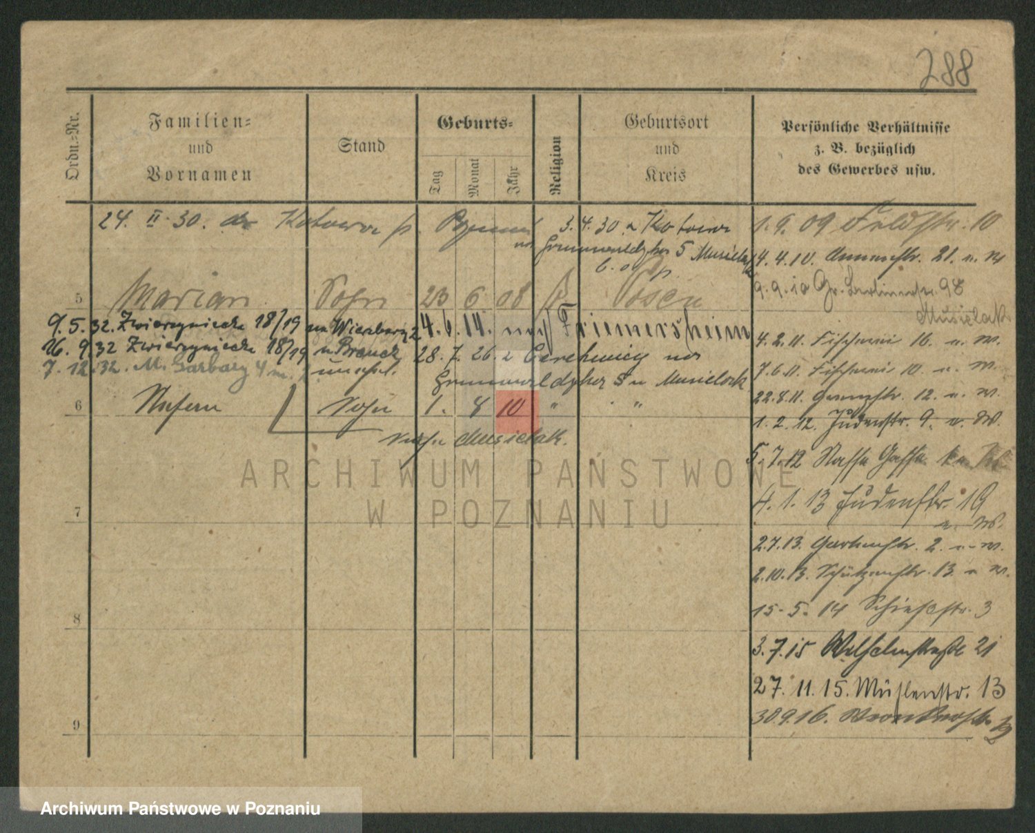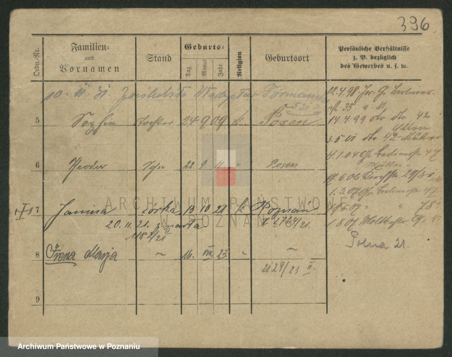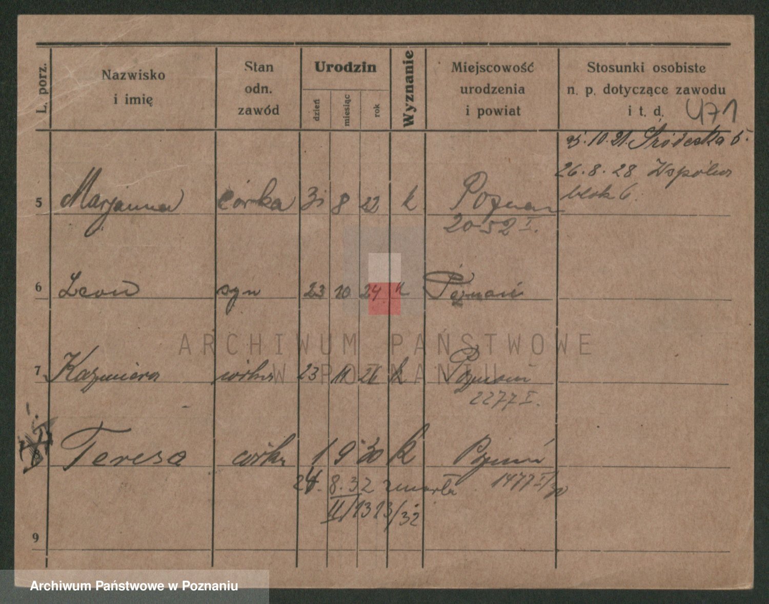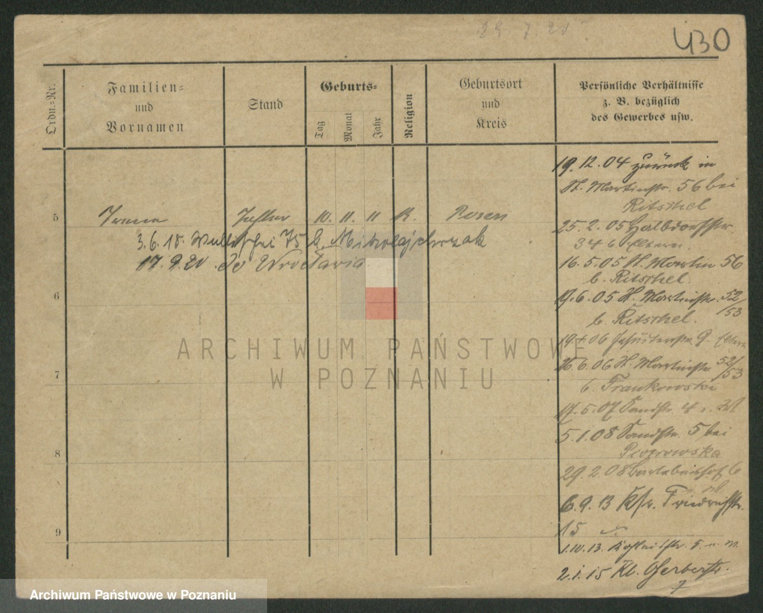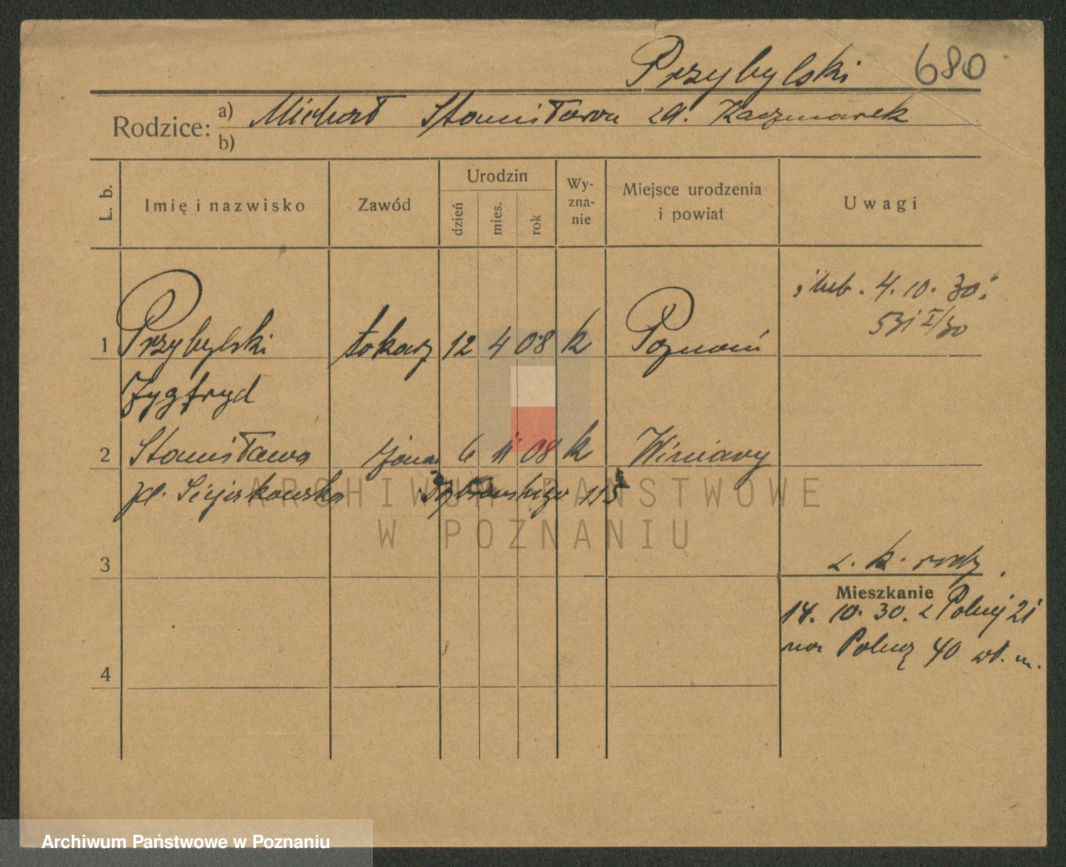 Podgląd karty osobowej dostępny jest po kliknięciu na nazwisko lub ikonkę karty. Można dokonywać powiększenia (ikony na górze) lub przechodzić między kolejnymi skanami (strzałki po bokach).