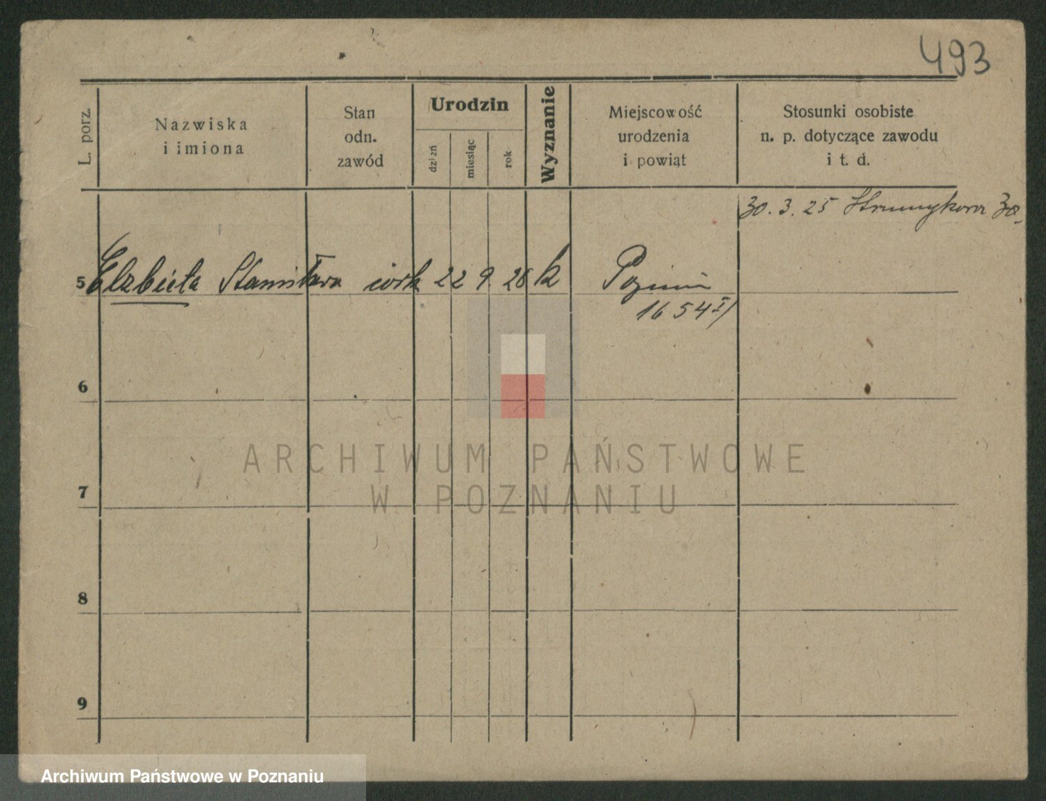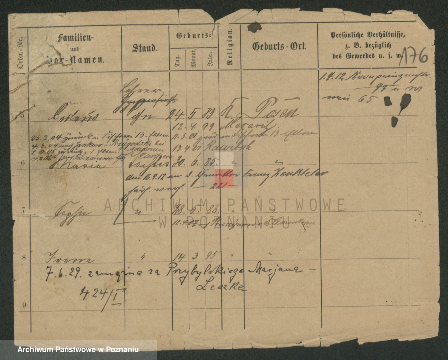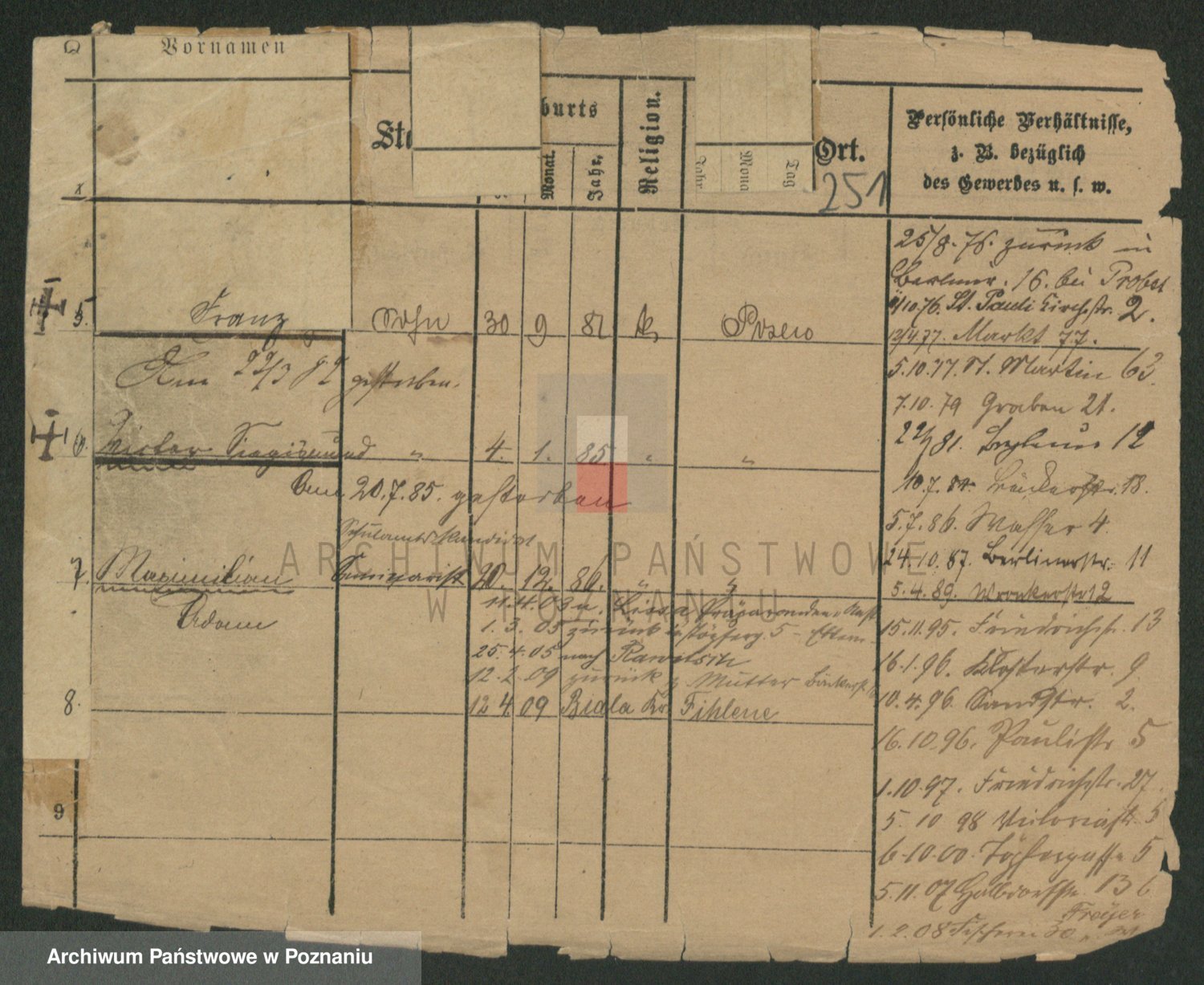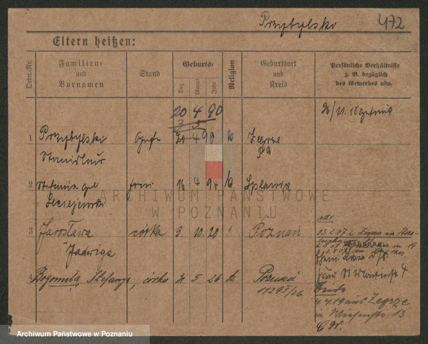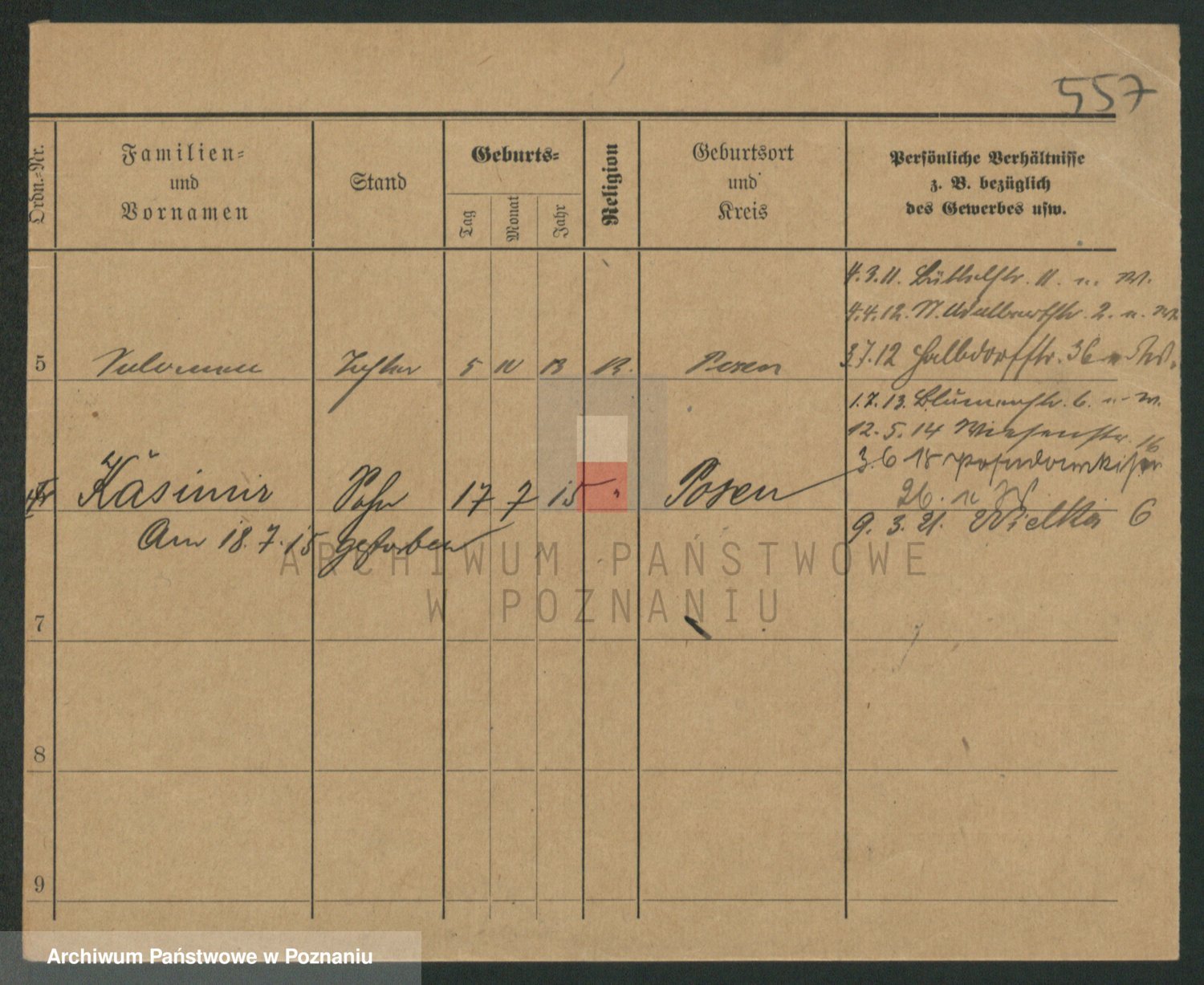 Podgląd karty osobowej dostępny jest po kliknięciu na nazwisko lub ikonkę karty. Można dokonywać powiększenia (ikony na górze) lub przechodzić między kolejnymi skanami (strzałki po bokach).