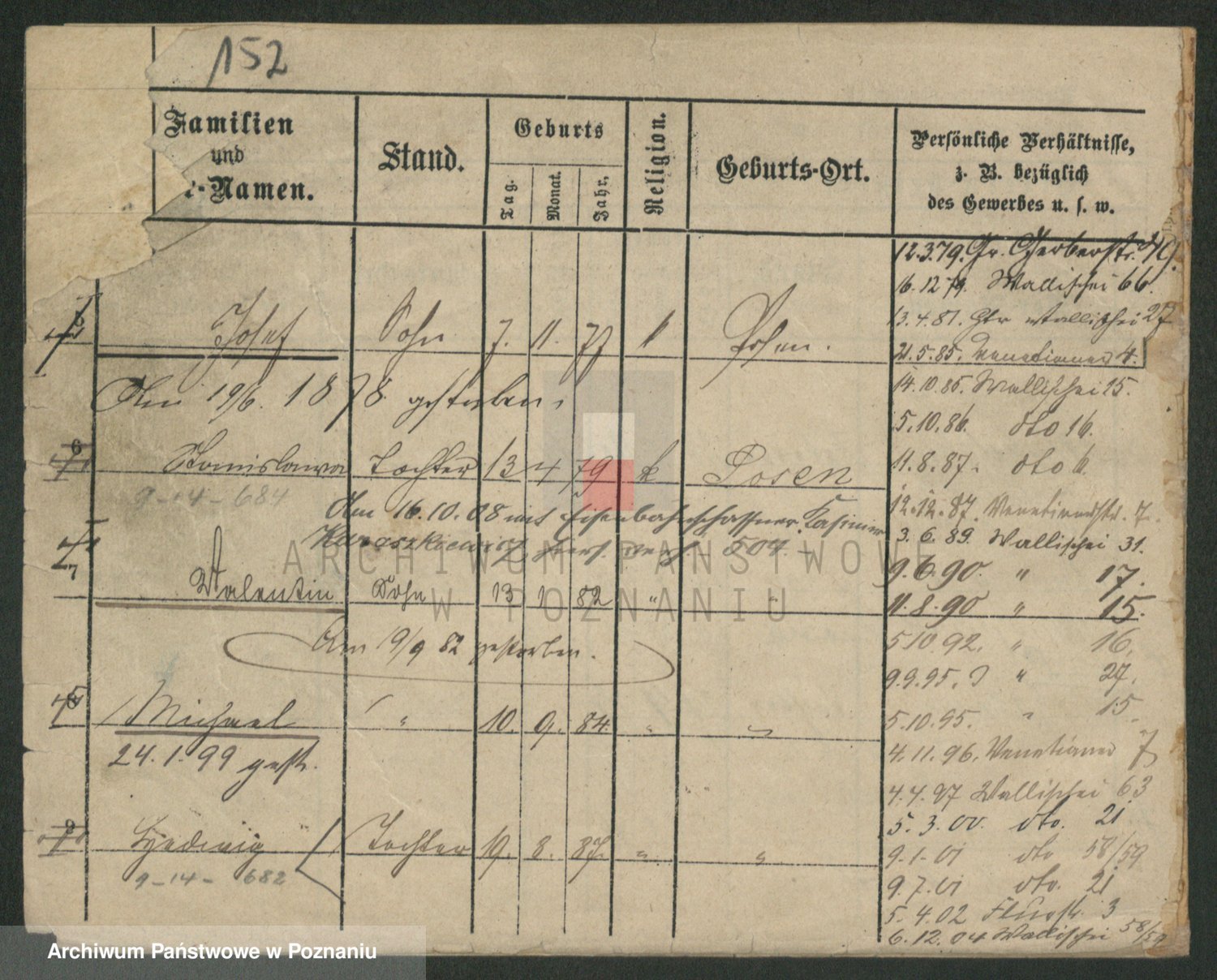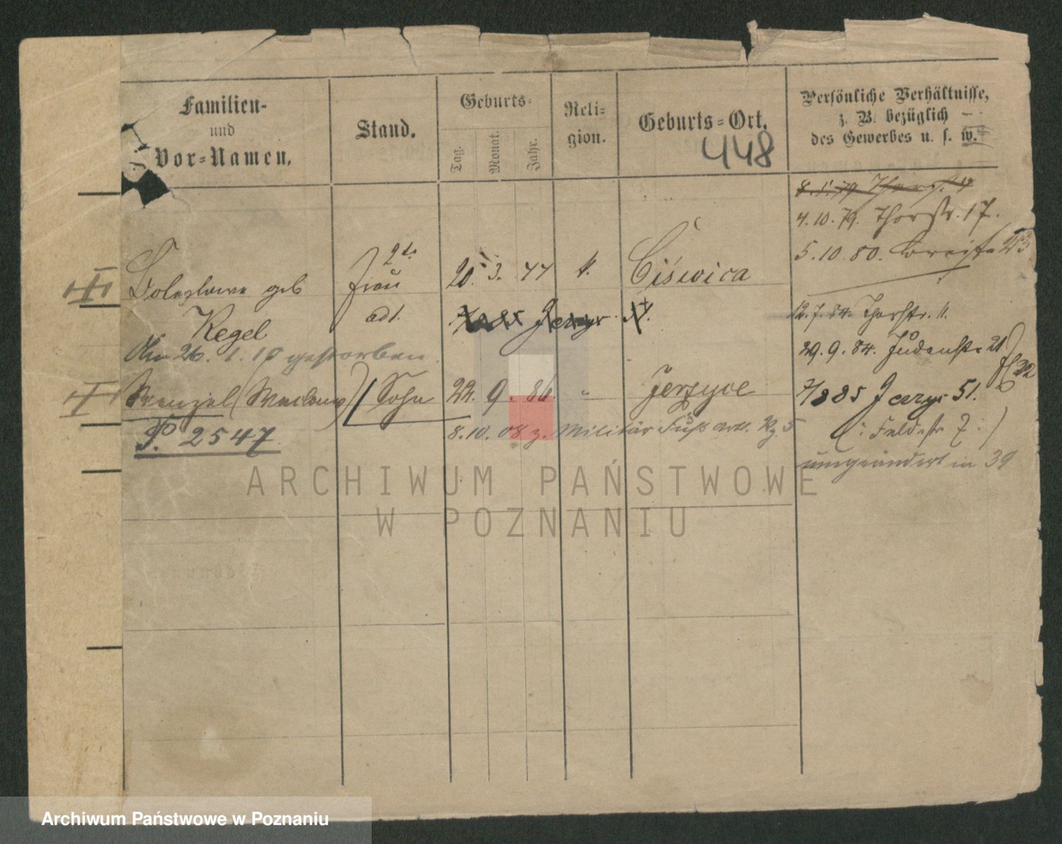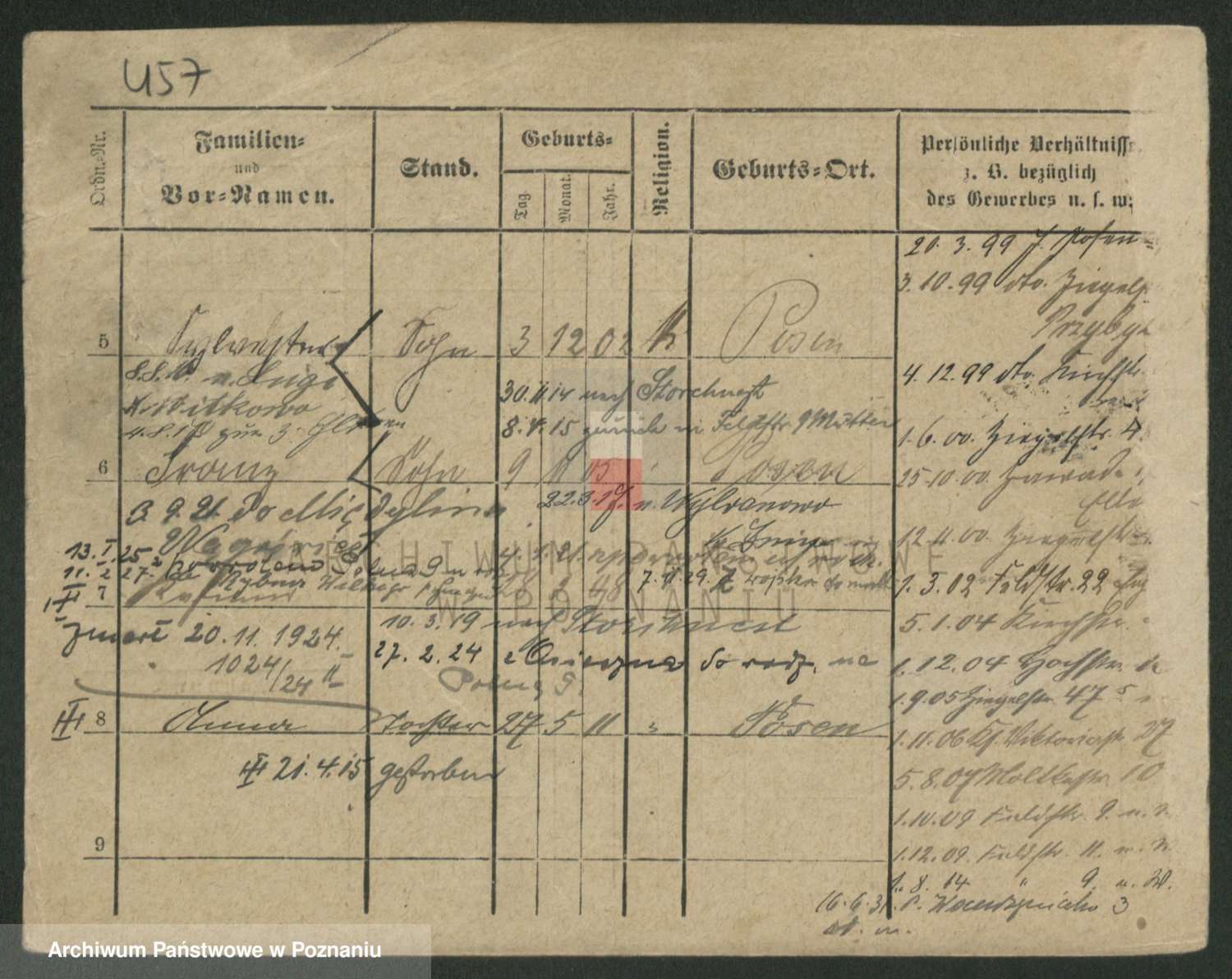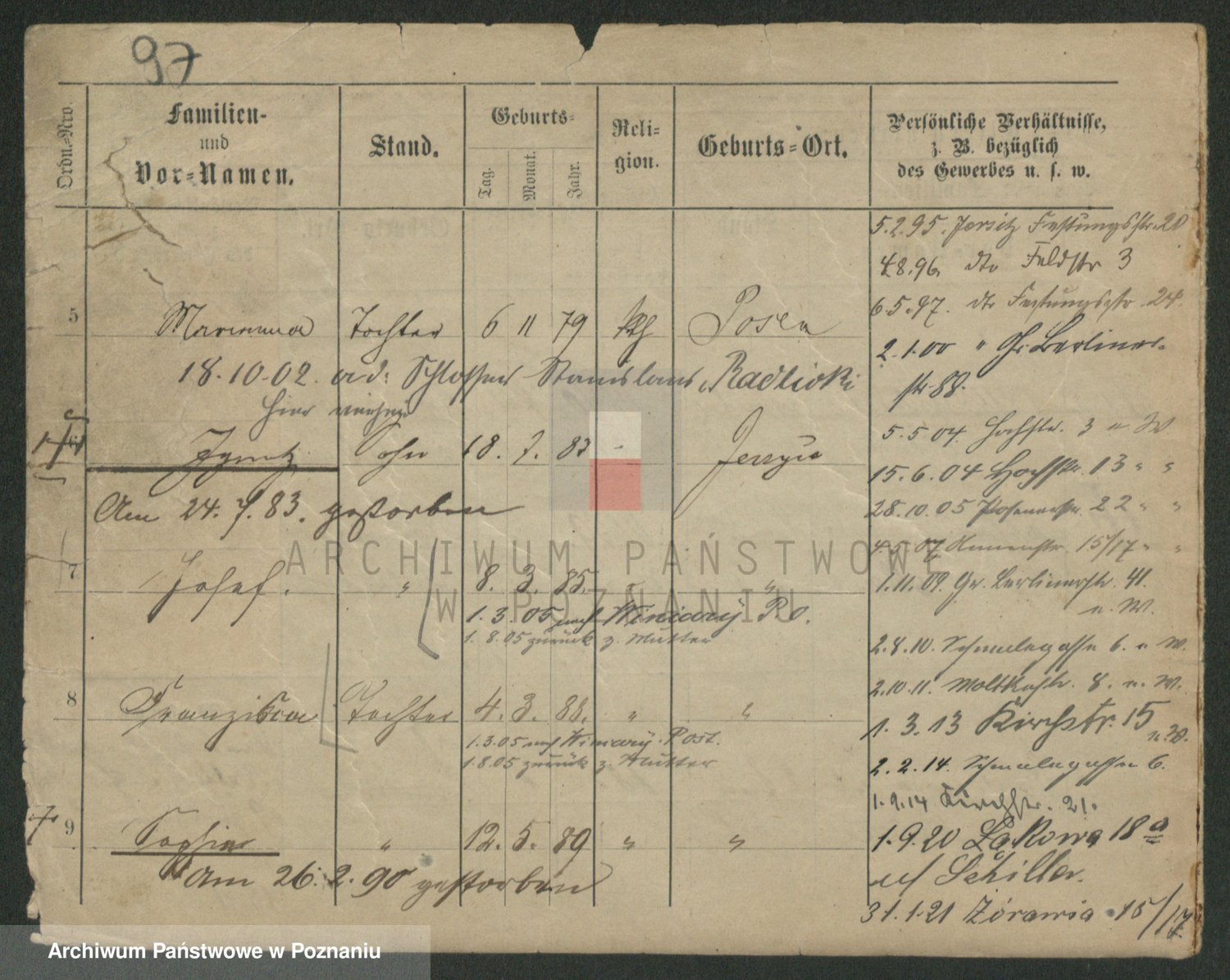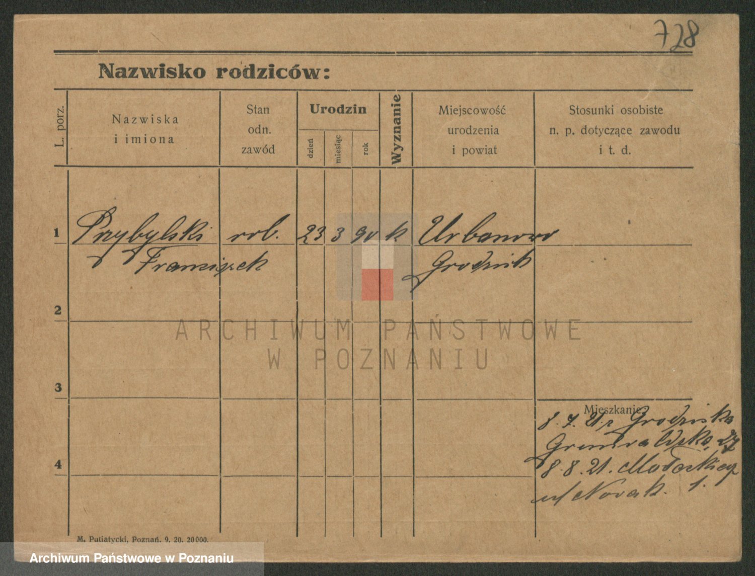 Podgląd karty osobowej dostępny jest po kliknięciu na nazwisko lub ikonkę karty. Można dokonywać powiększenia (ikony na górze) lub przechodzić między kolejnymi skanami (strzałki po bokach).