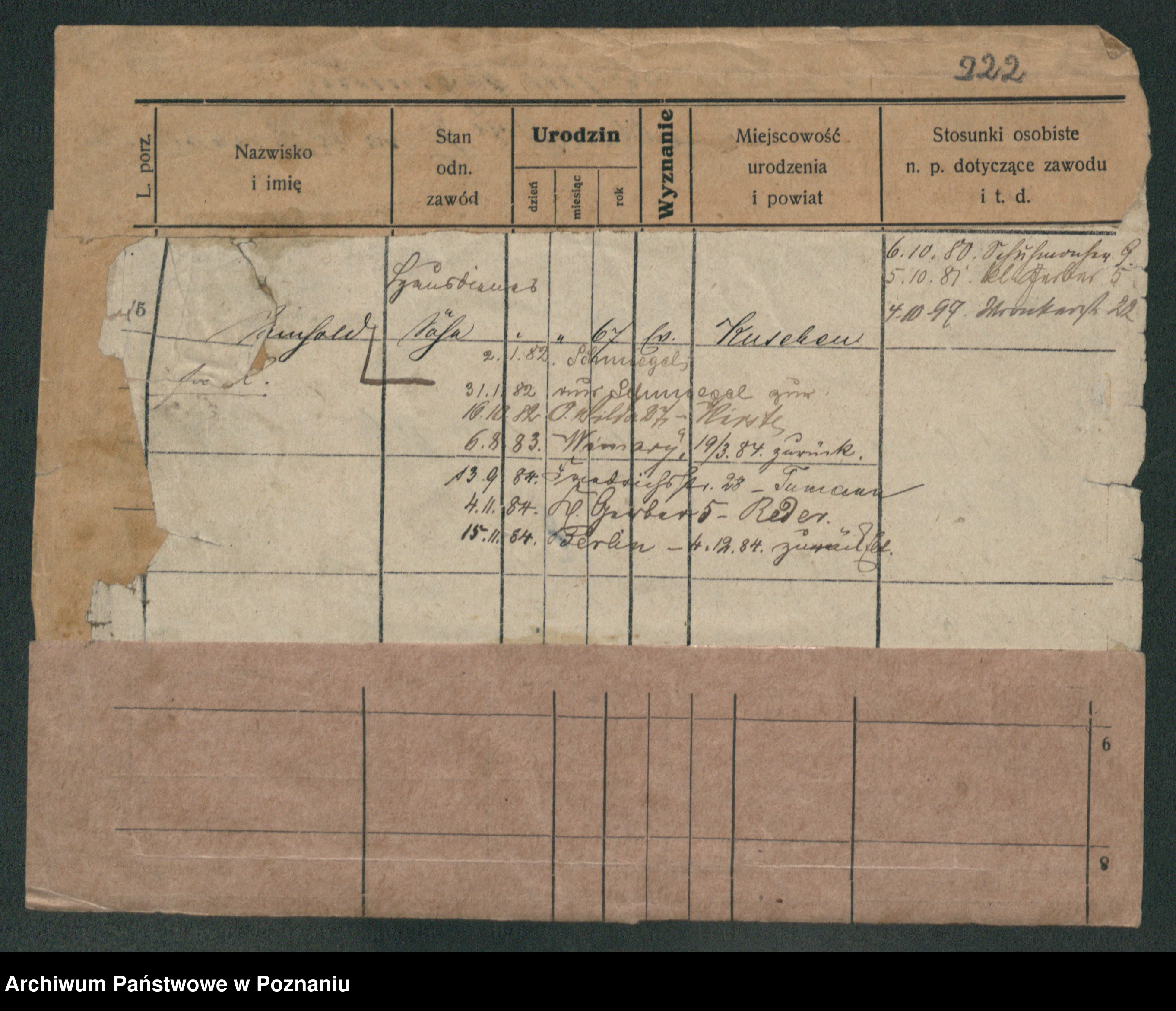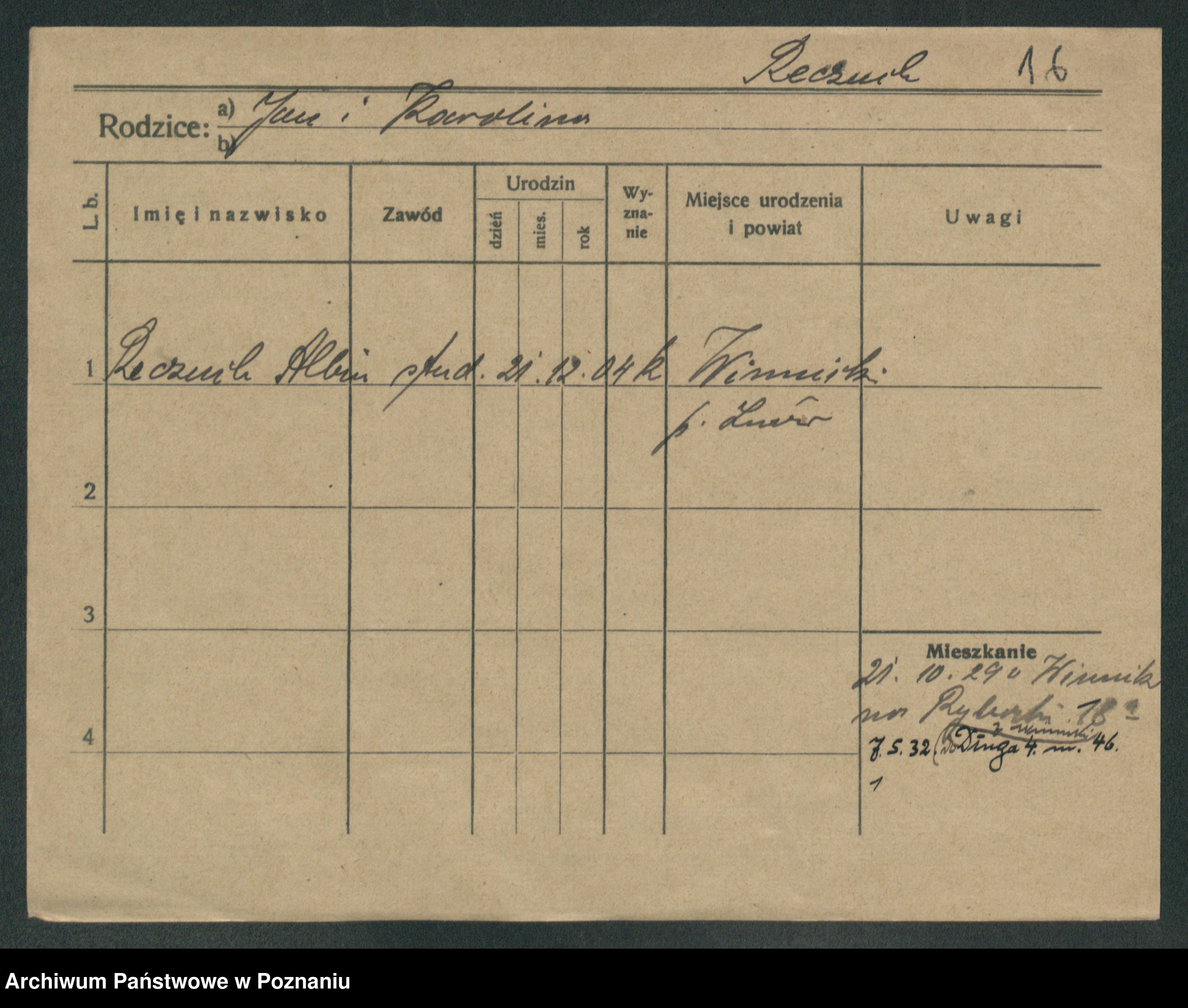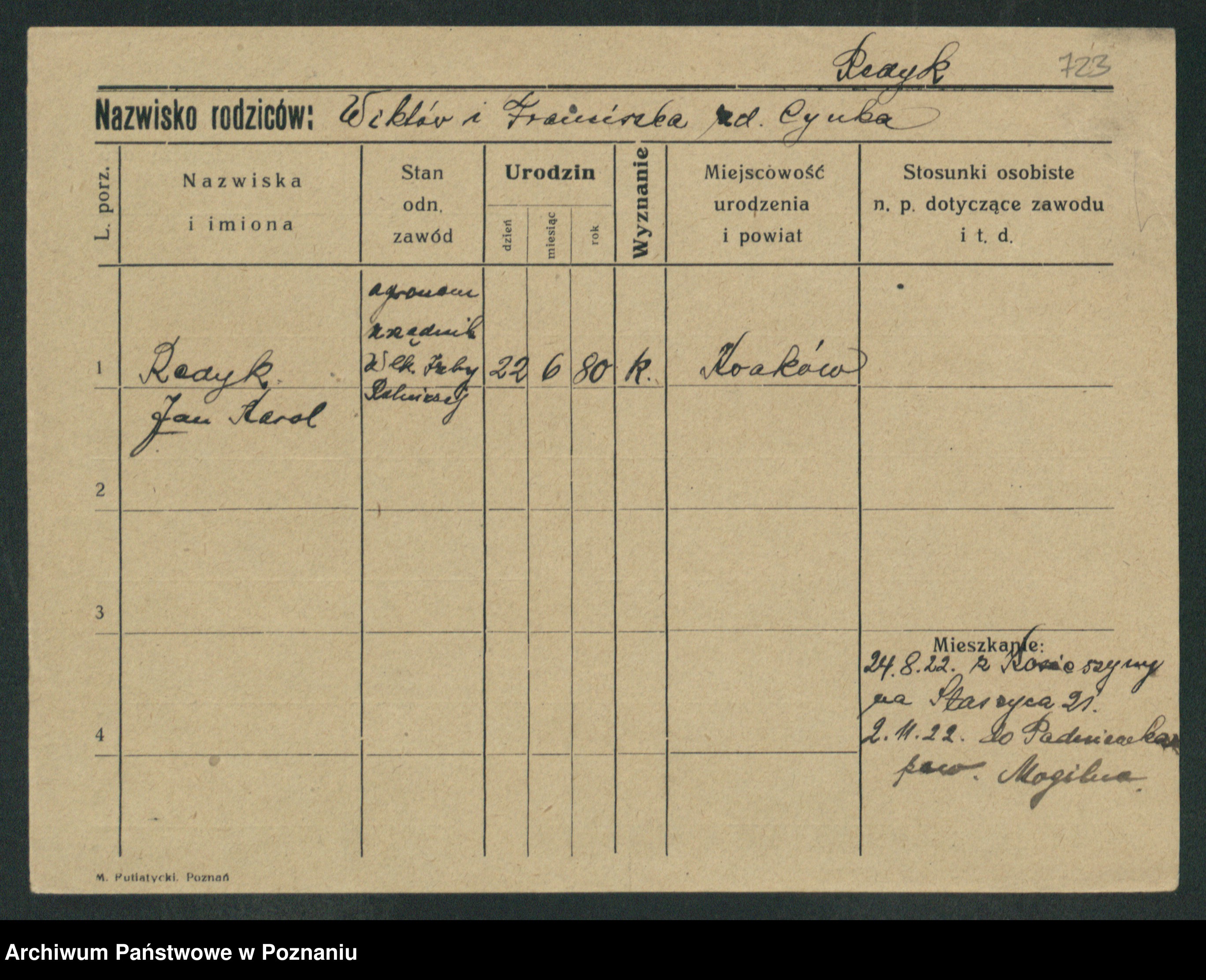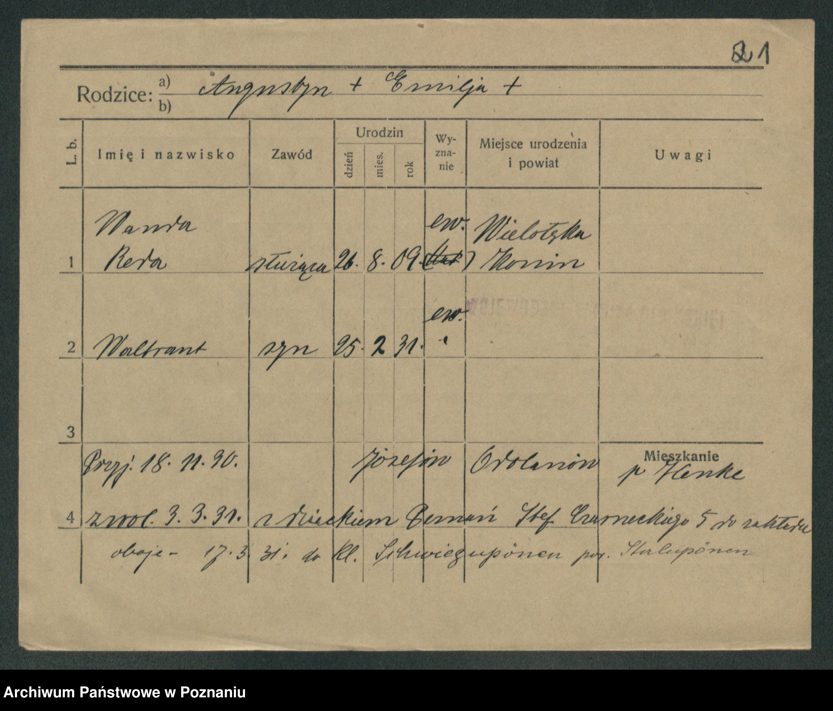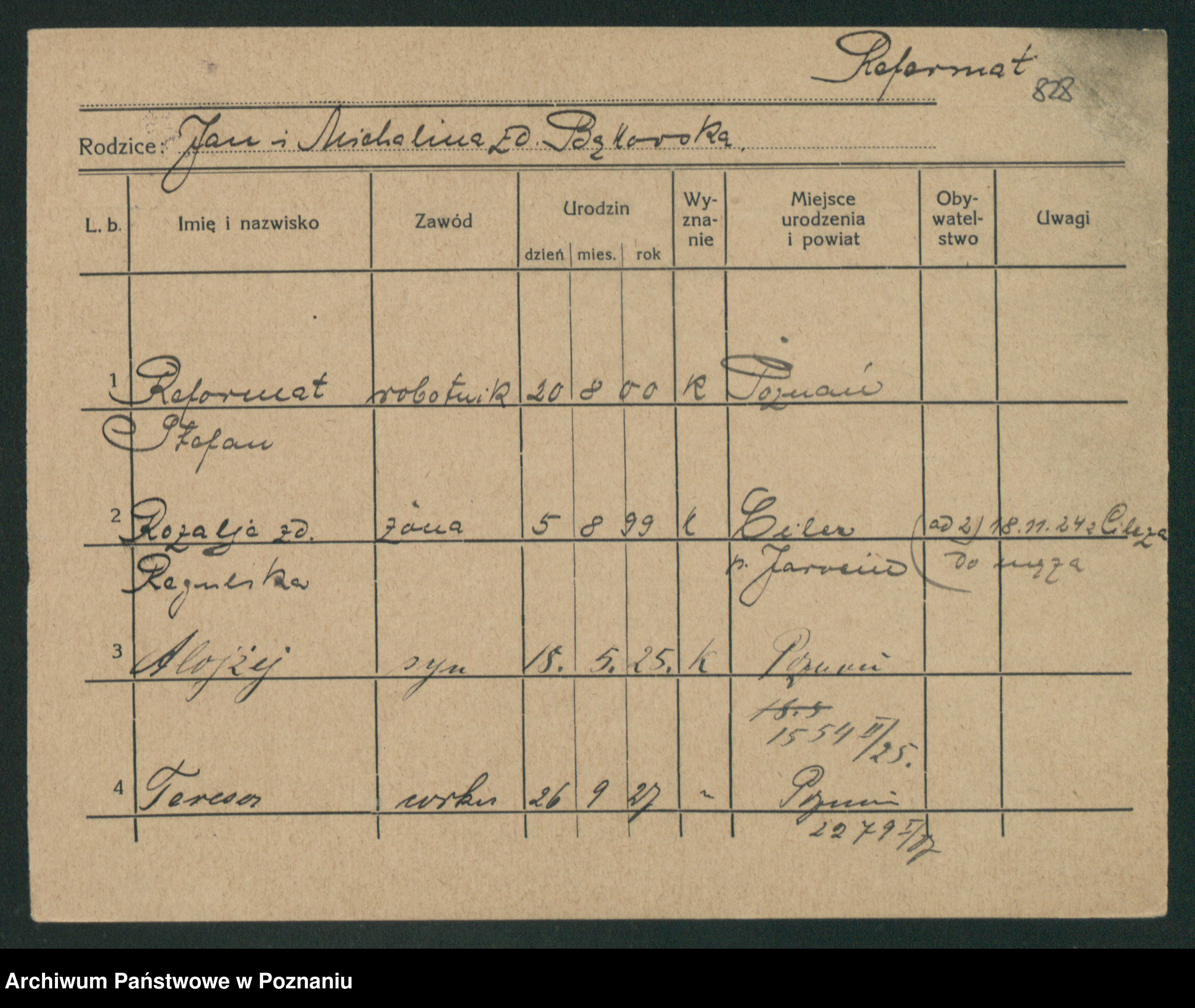 Podgląd karty osobowej dostępny jest po kliknięciu na nazwisko lub ikonkę karty. Można dokonywać powiększenia (ikony na górze) lub przechodzić między kolejnymi skanami (strzałki po bokach).
