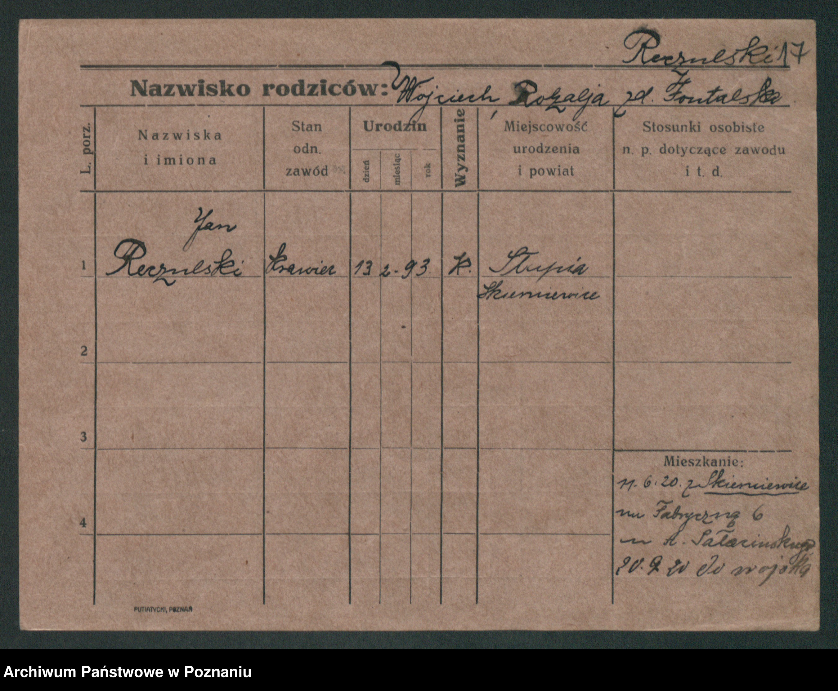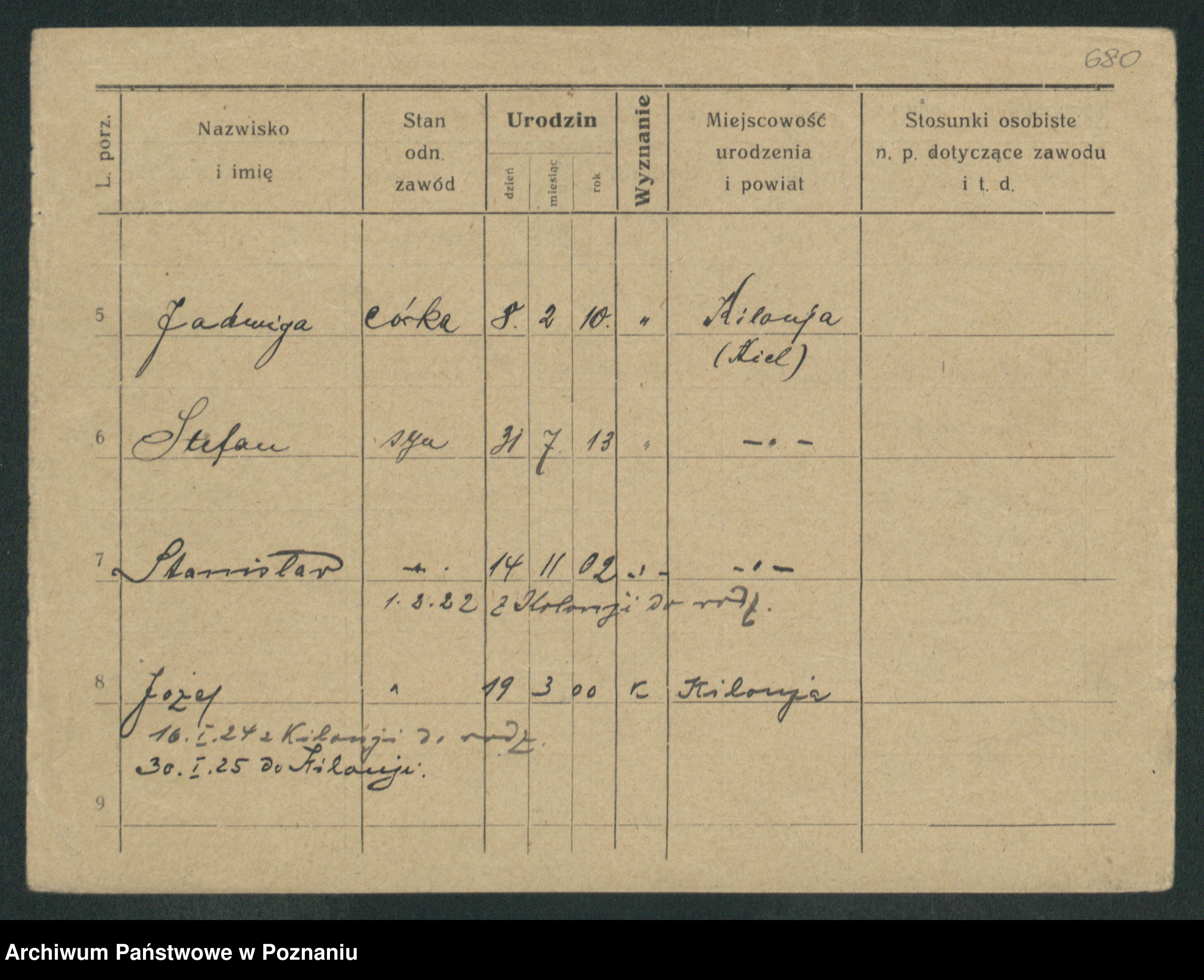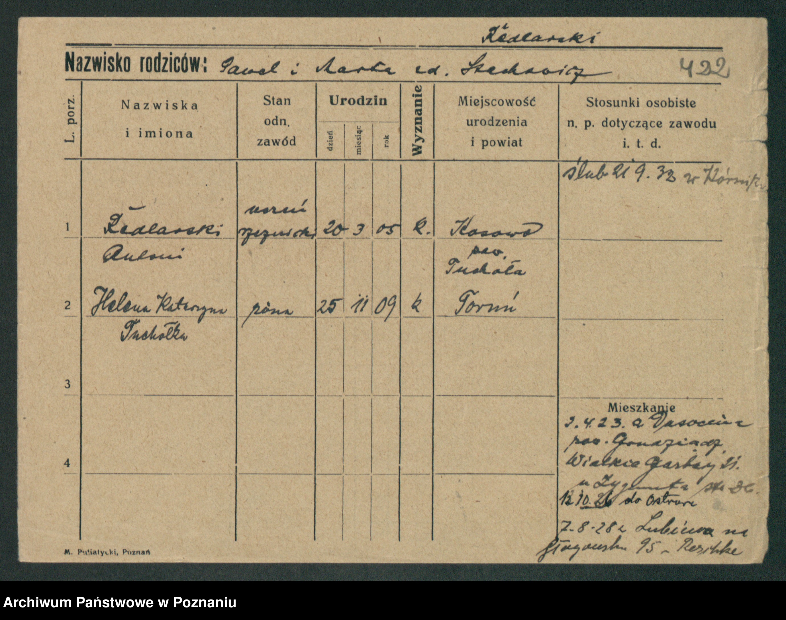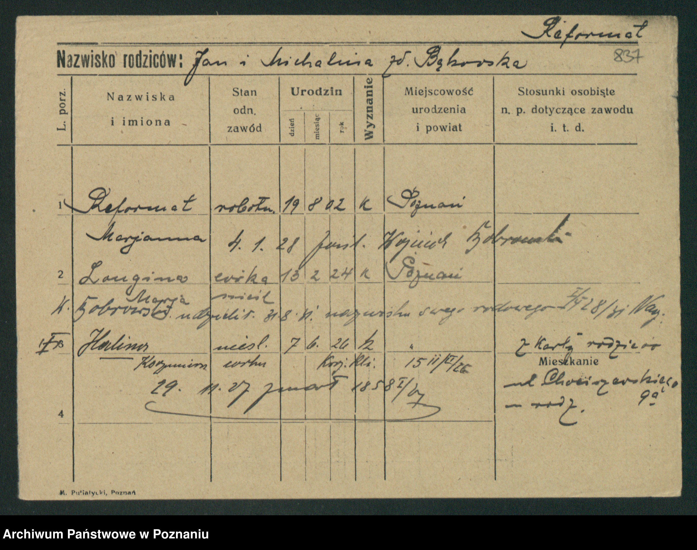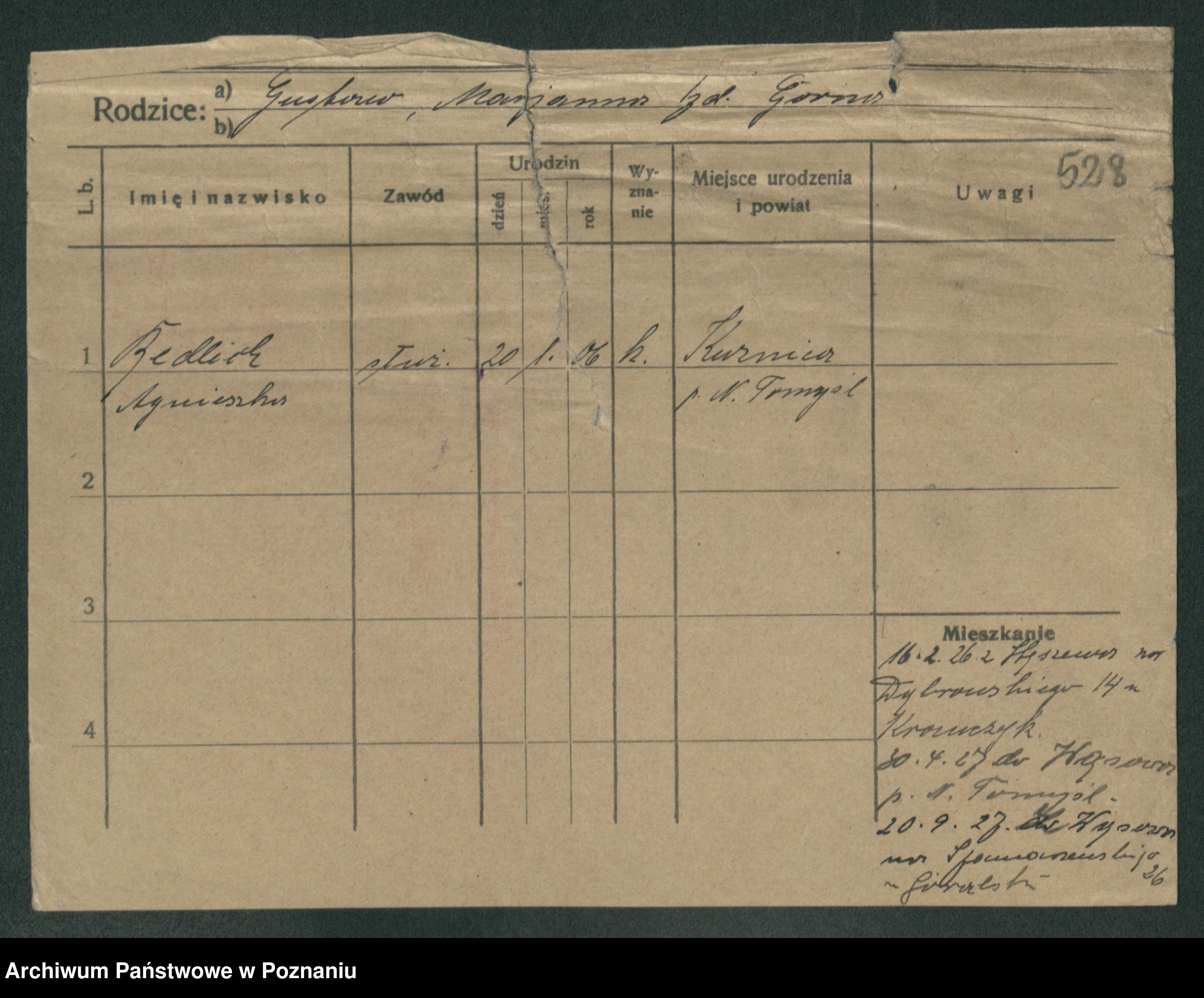Podgląd karty osobowej dostępny jest po kliknięciu na nazwisko lub ikonkę karty. Można dokonywać powiększenia (ikony na górze) lub przechodzić między kolejnymi skanami (strzałki po bokach).