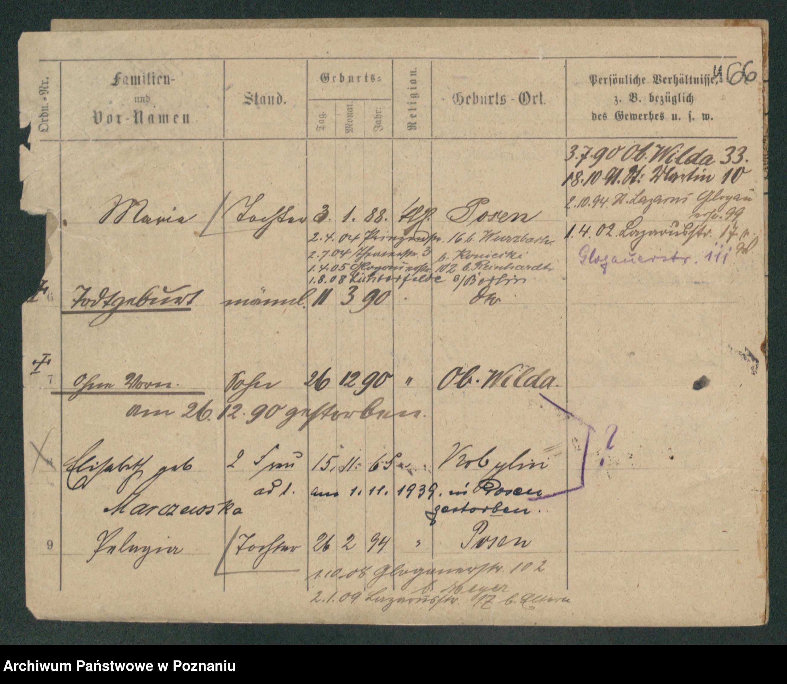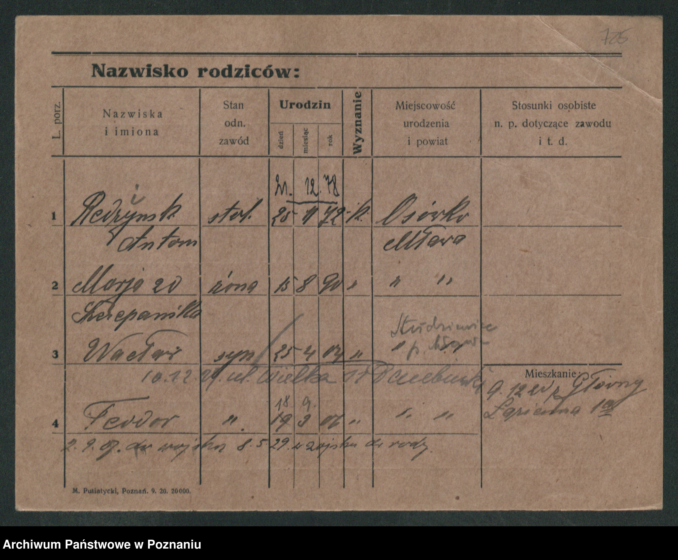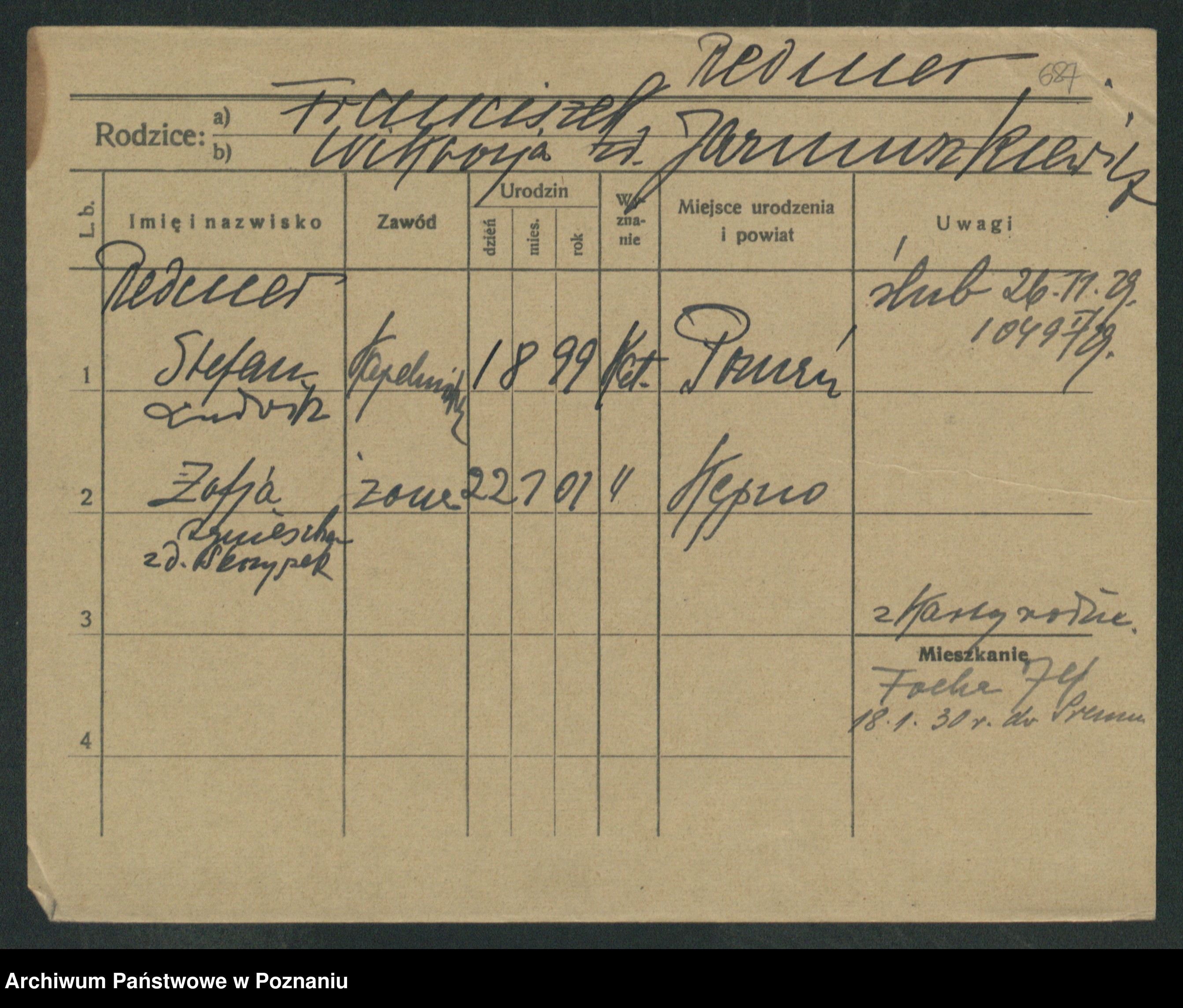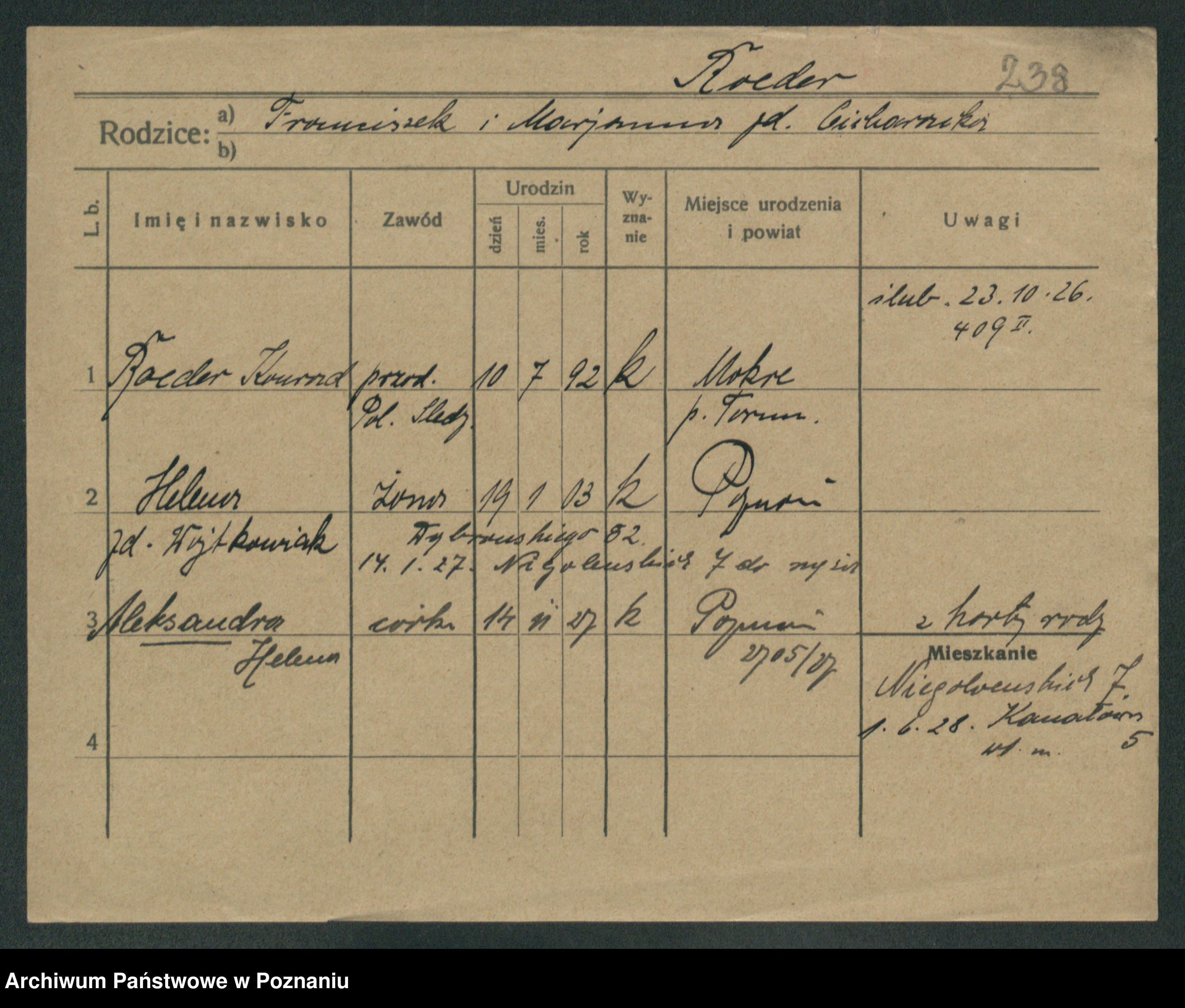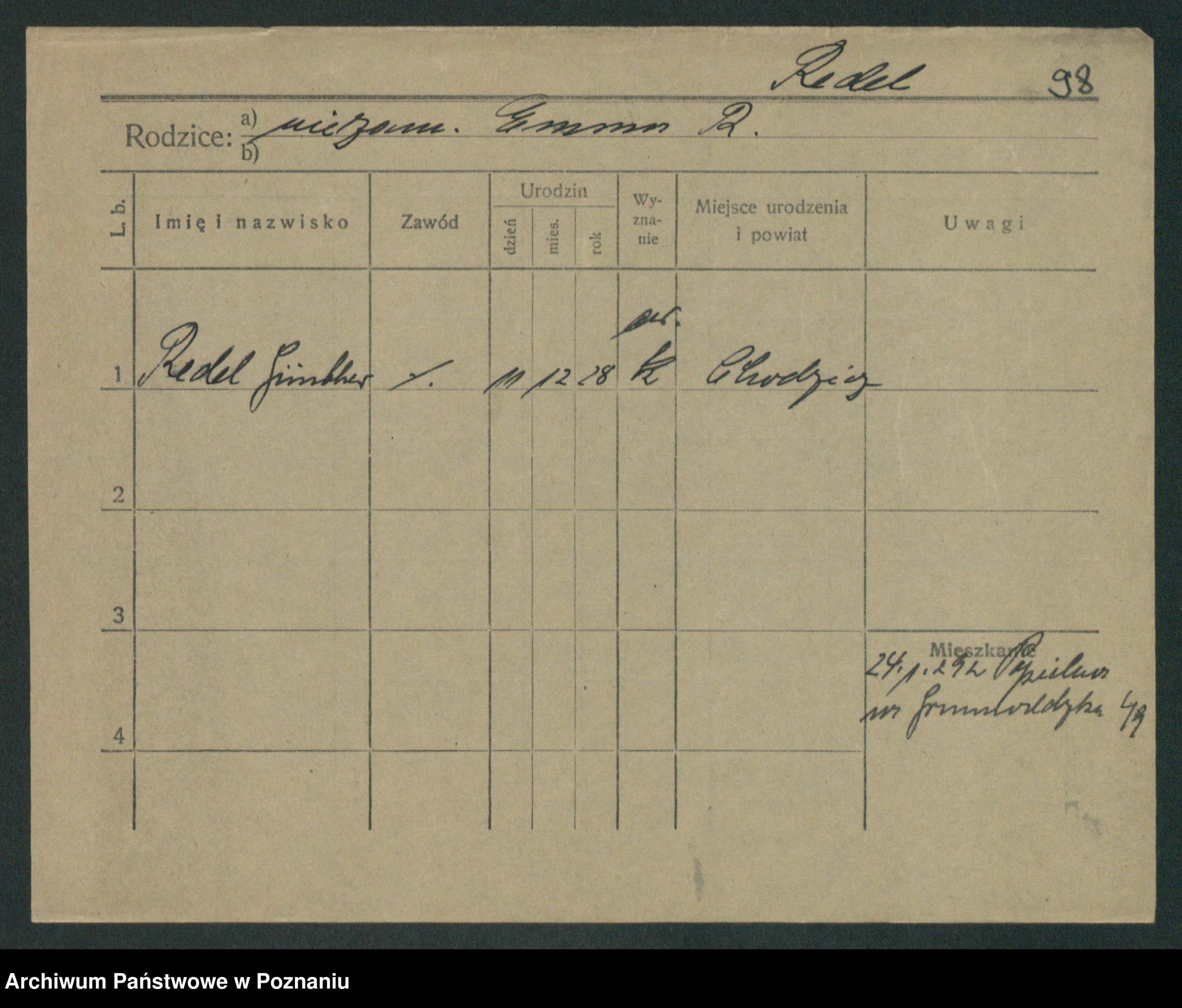 Podgląd karty osobowej dostępny jest po kliknięciu na nazwisko lub ikonkę karty. Można dokonywać powiększenia (ikony na górze) lub przechodzić między kolejnymi skanami (strzałki po bokach).