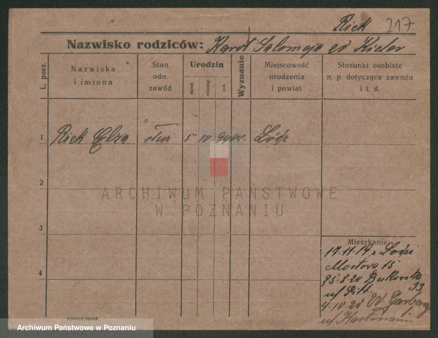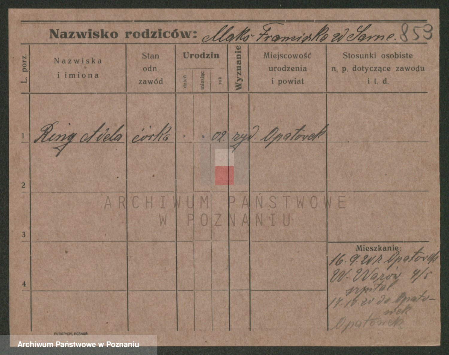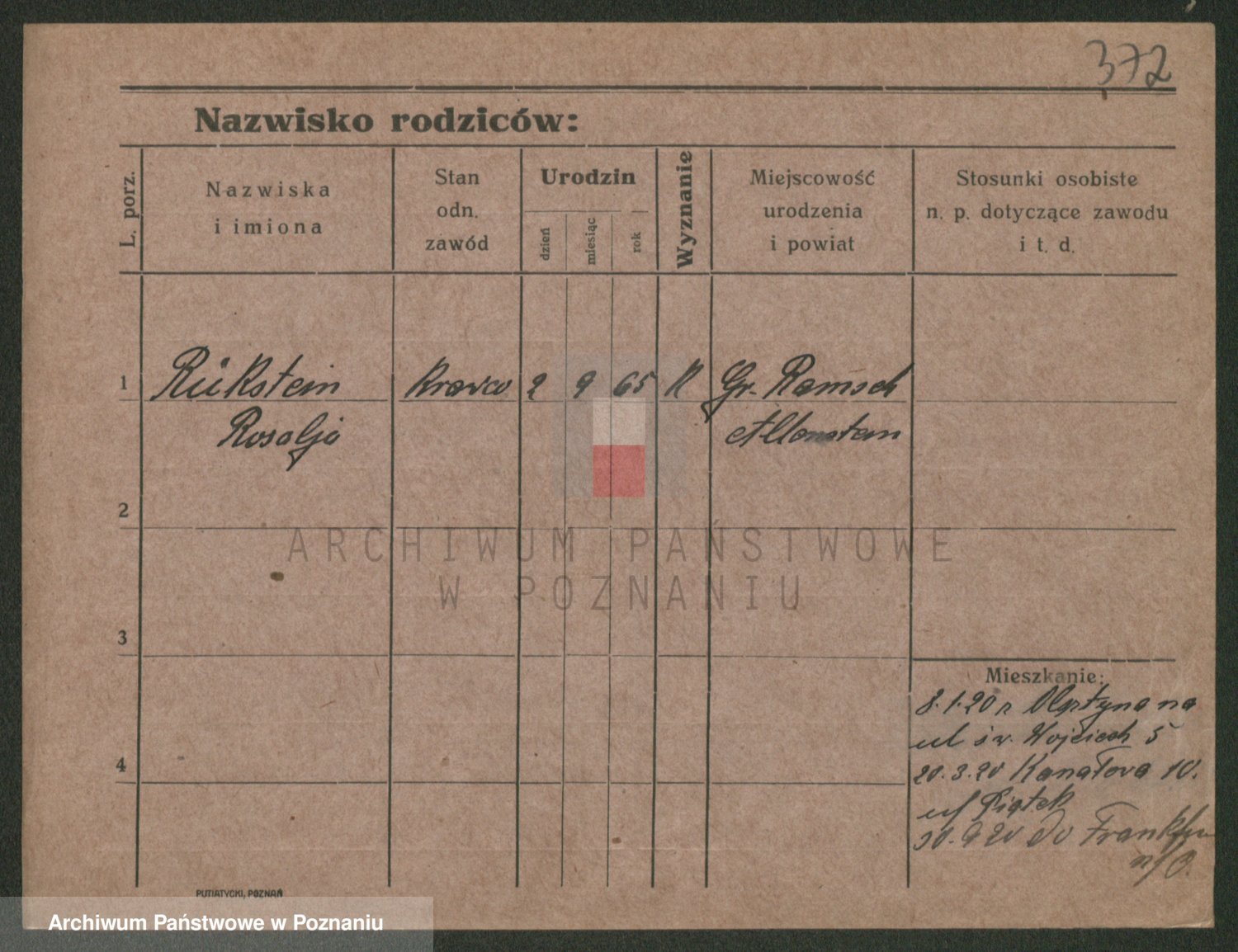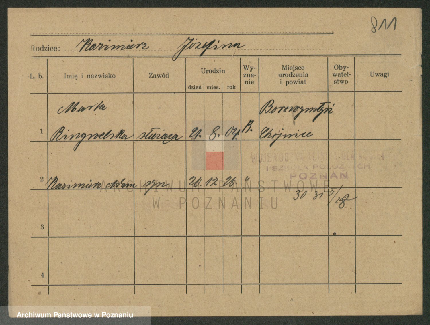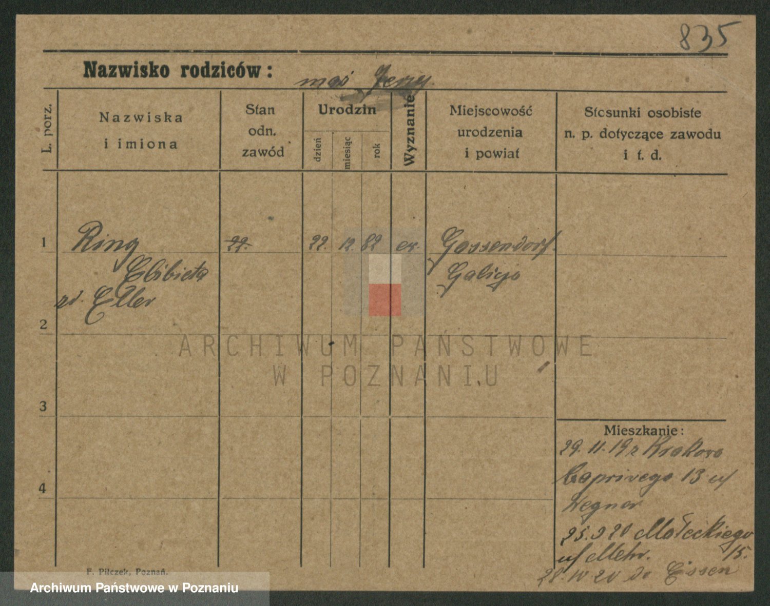 Podgląd karty osobowej dostępny jest po kliknięciu na nazwisko lub ikonkę karty. Można dokonywać powiększenia (ikony na górze) lub przechodzić między kolejnymi skanami (strzałki po bokach).