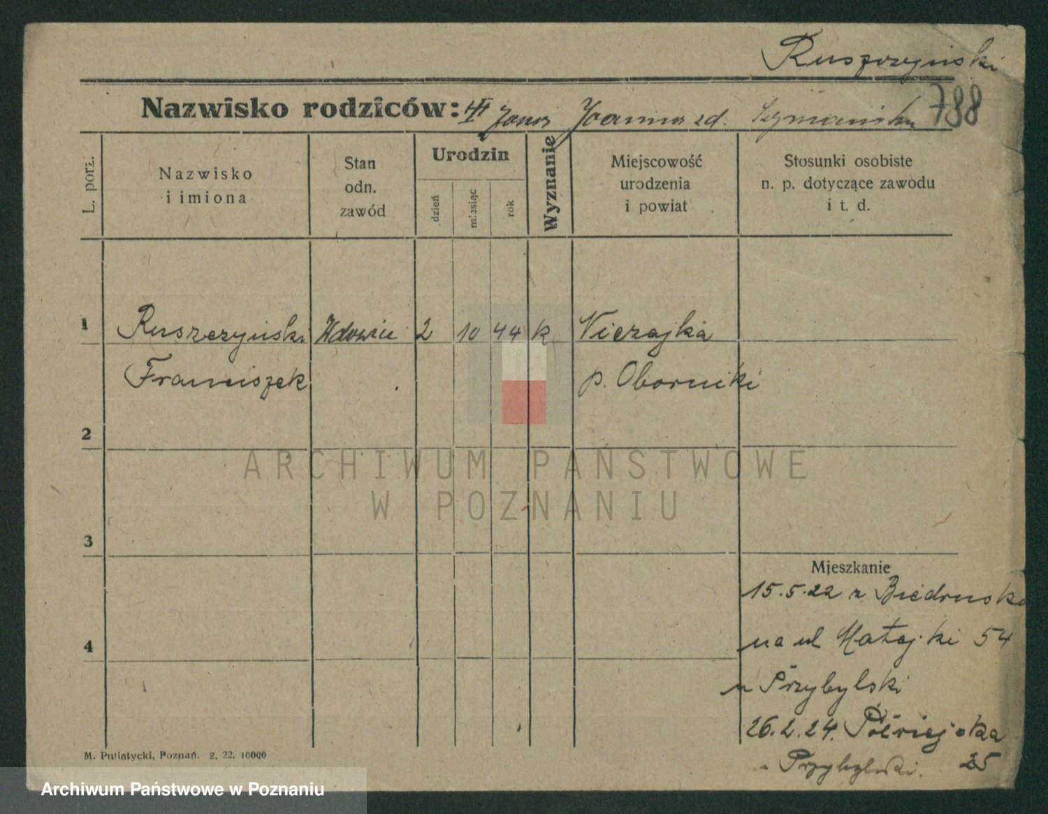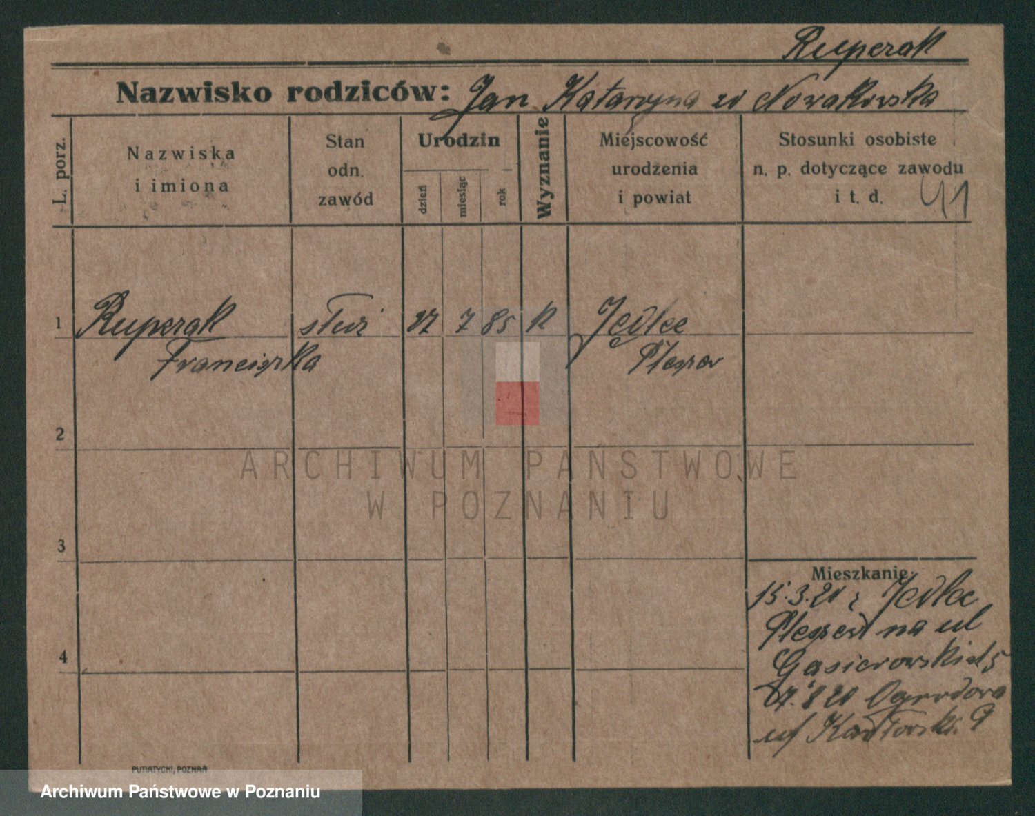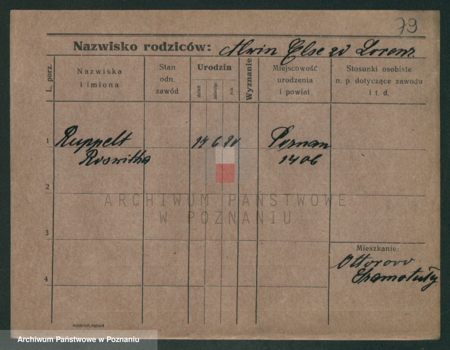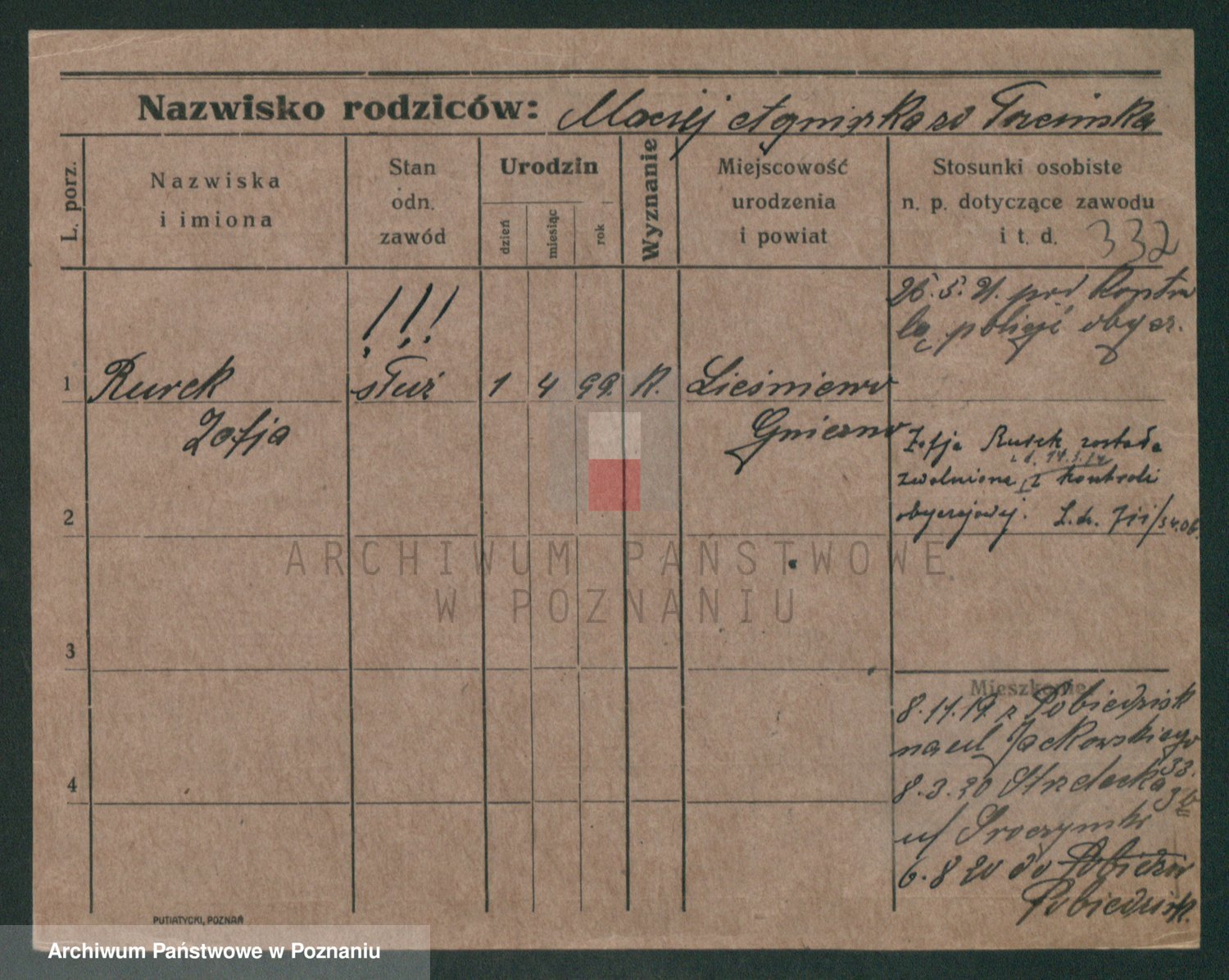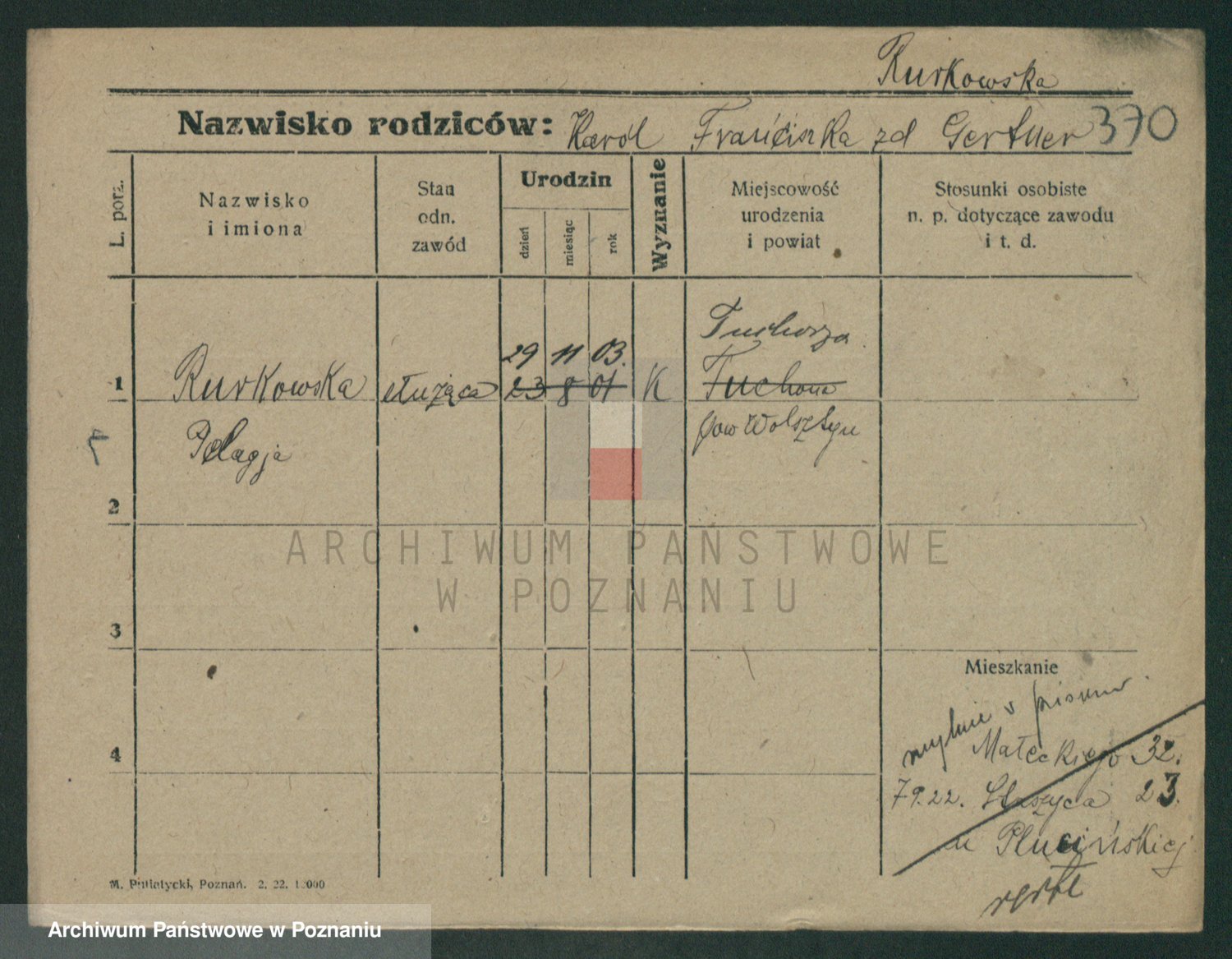Podgląd karty osobowej dostępny jest po kliknięciu na nazwisko lub ikonkę karty. Można dokonywać powiększenia (ikony na górze) lub przechodzić między kolejnymi skanami (strzałki po bokach).