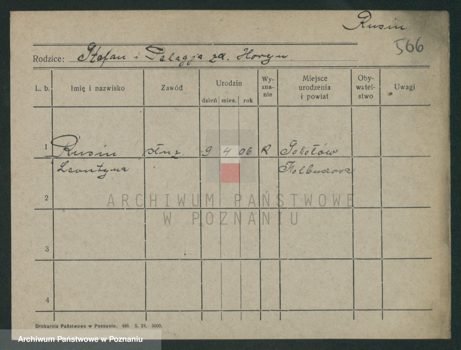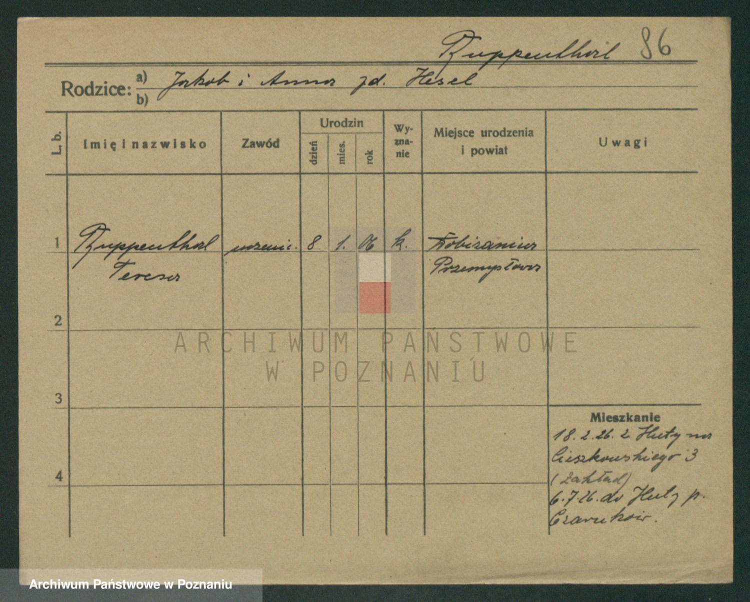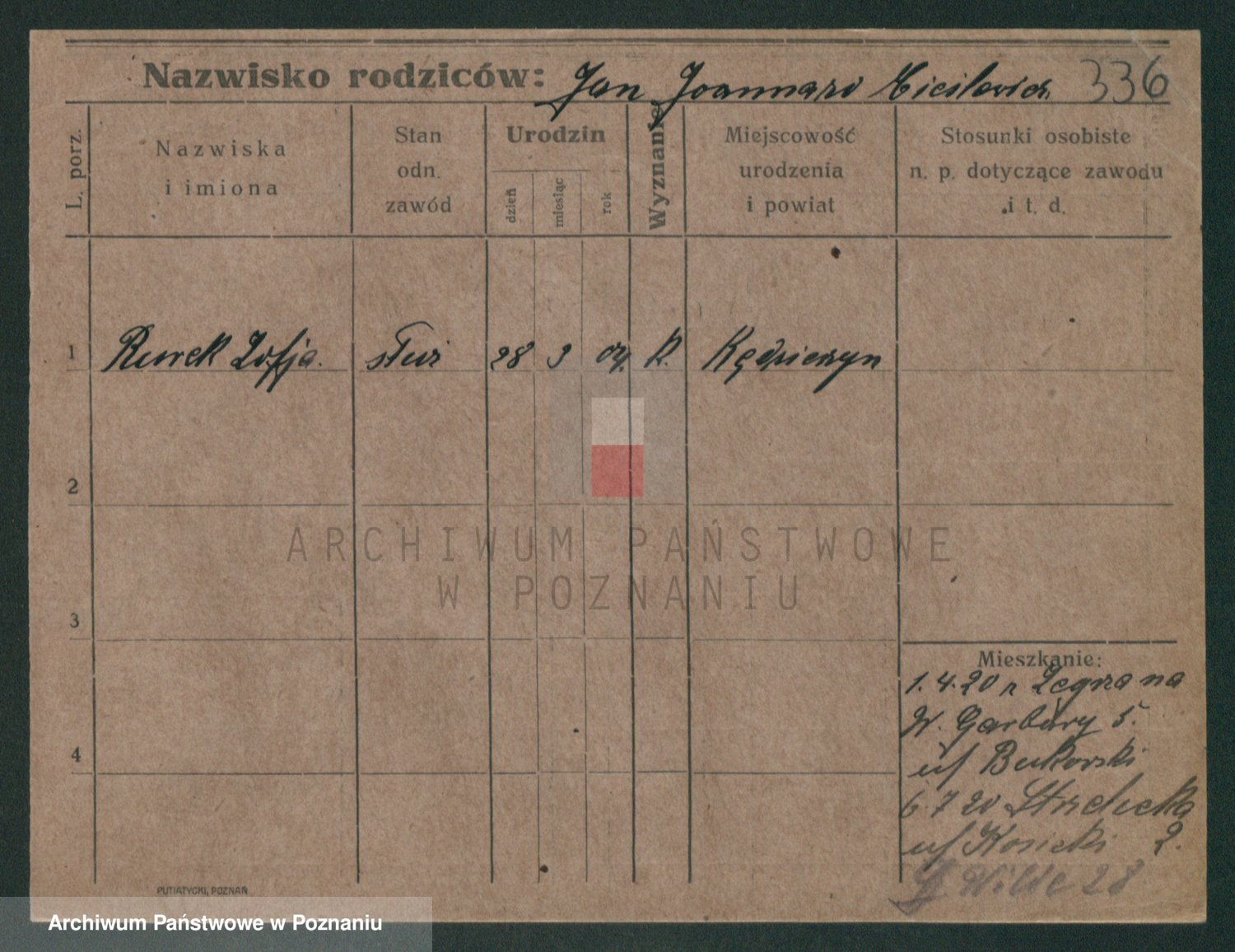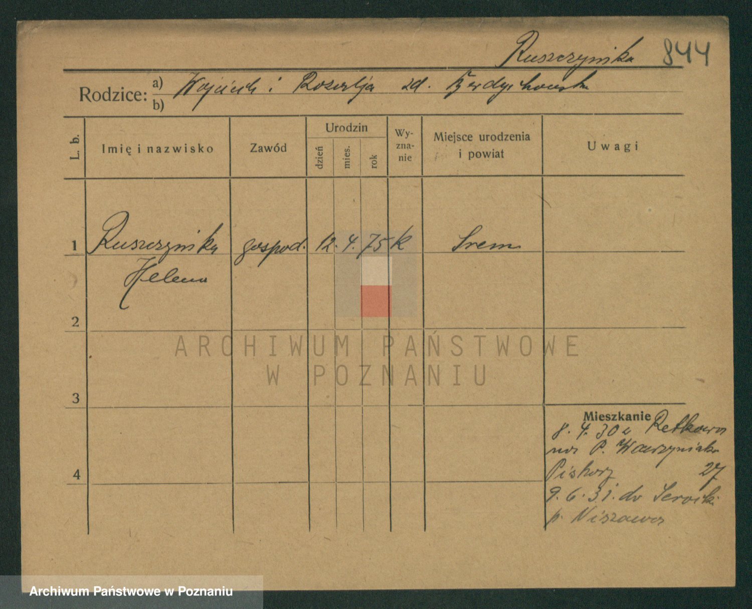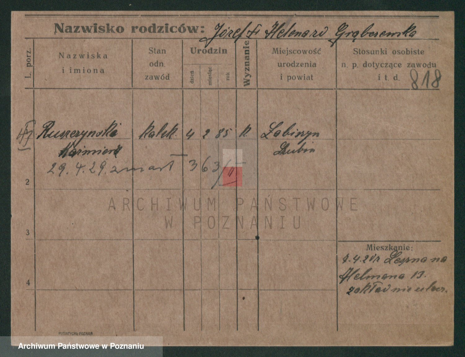Podgląd karty osobowej dostępny jest po kliknięciu na nazwisko lub ikonkę karty. Można dokonywać powiększenia (ikony na górze) lub przechodzić między kolejnymi skanami (strzałki po bokach).