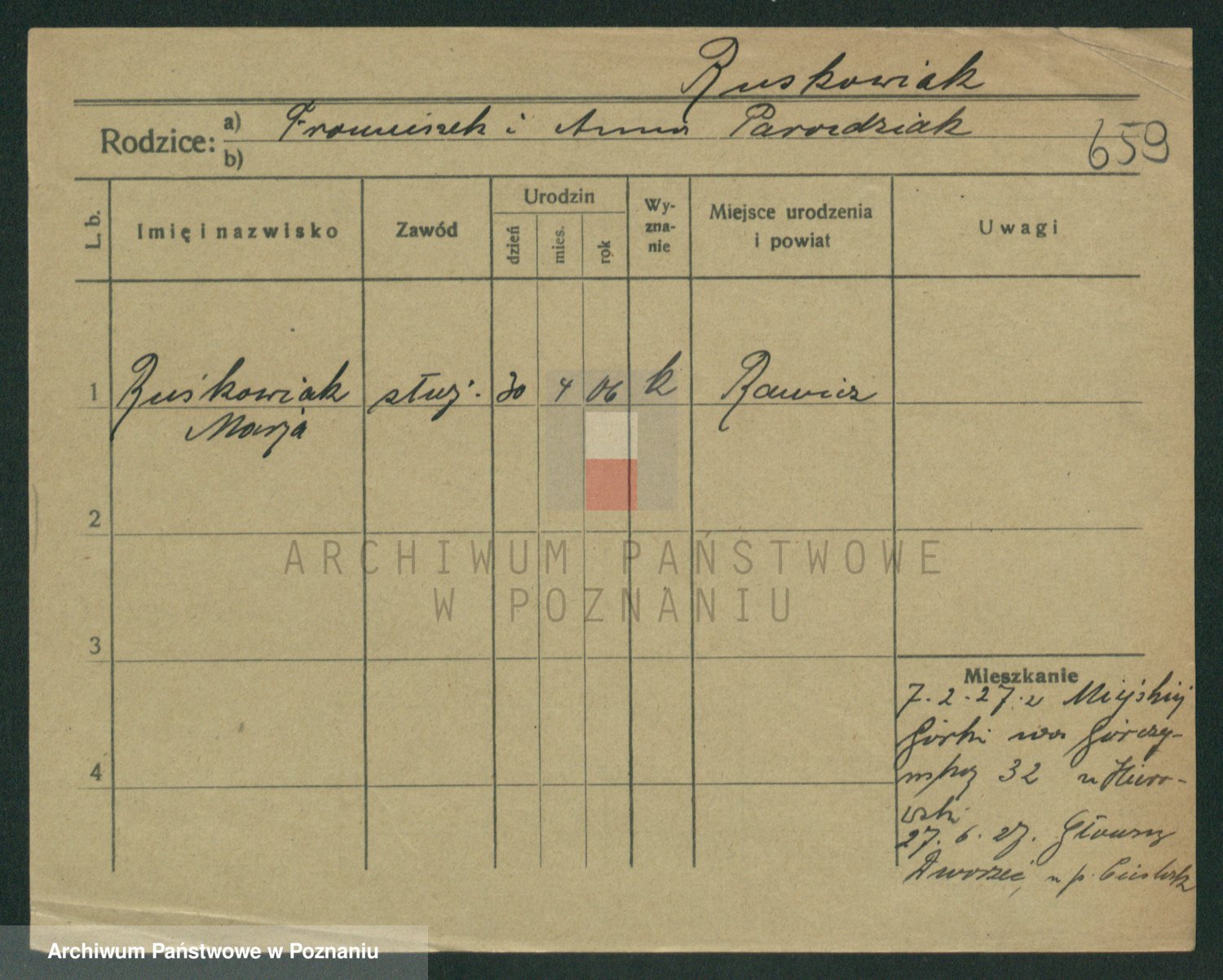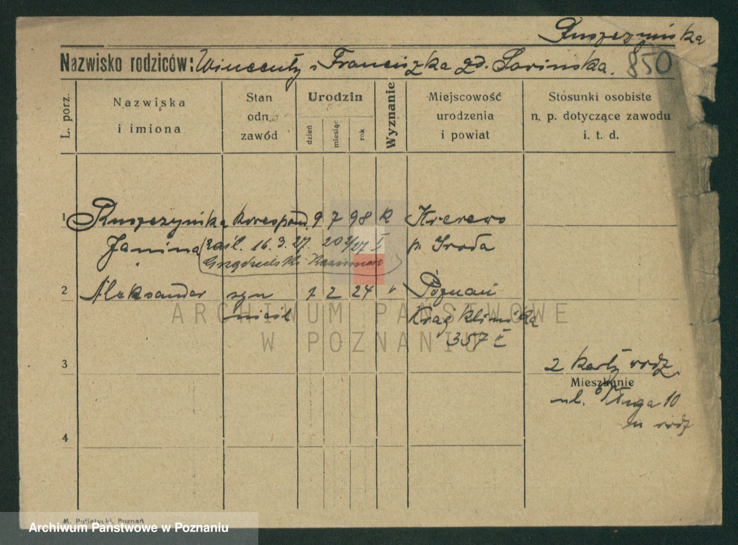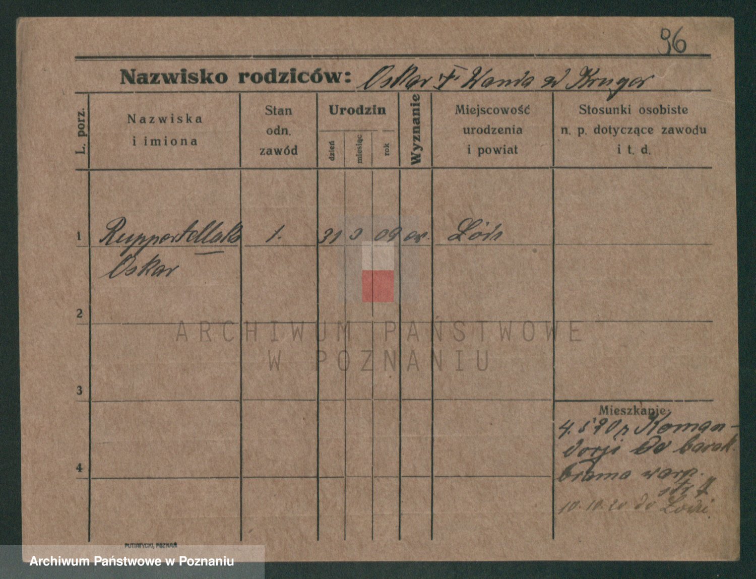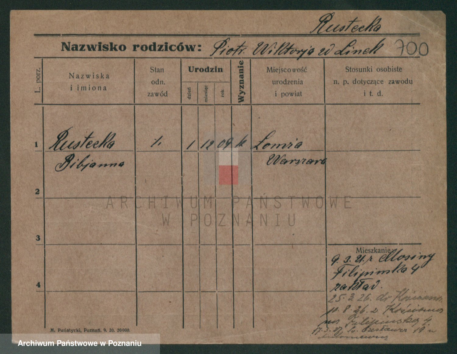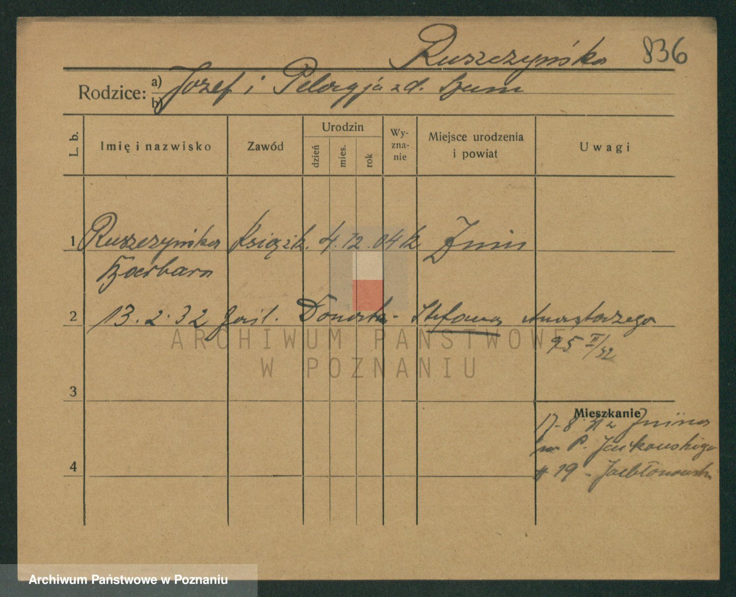 Podgląd karty osobowej dostępny jest po kliknięciu na nazwisko lub ikonkę karty. Można dokonywać powiększenia (ikony na górze) lub przechodzić między kolejnymi skanami (strzałki po bokach).