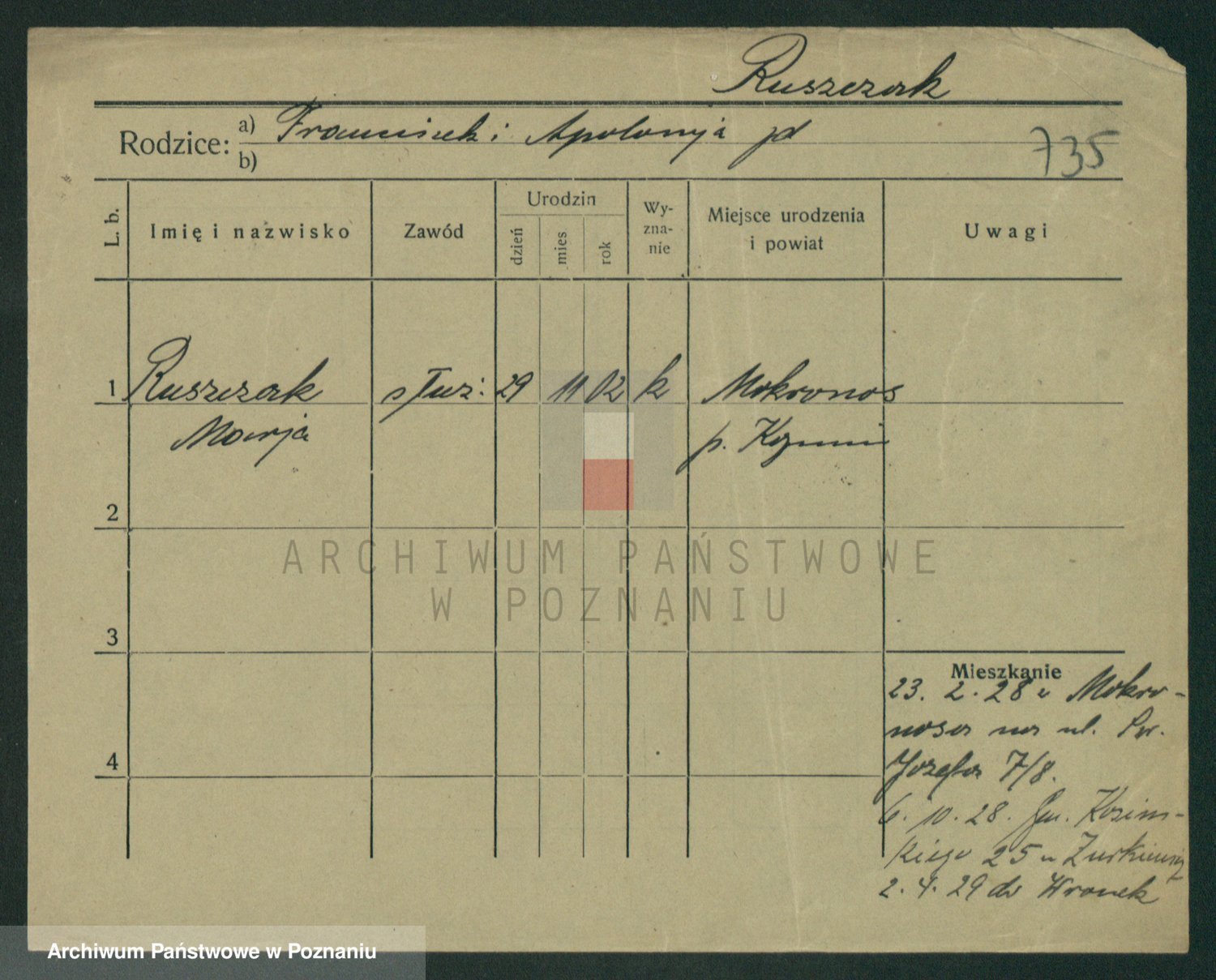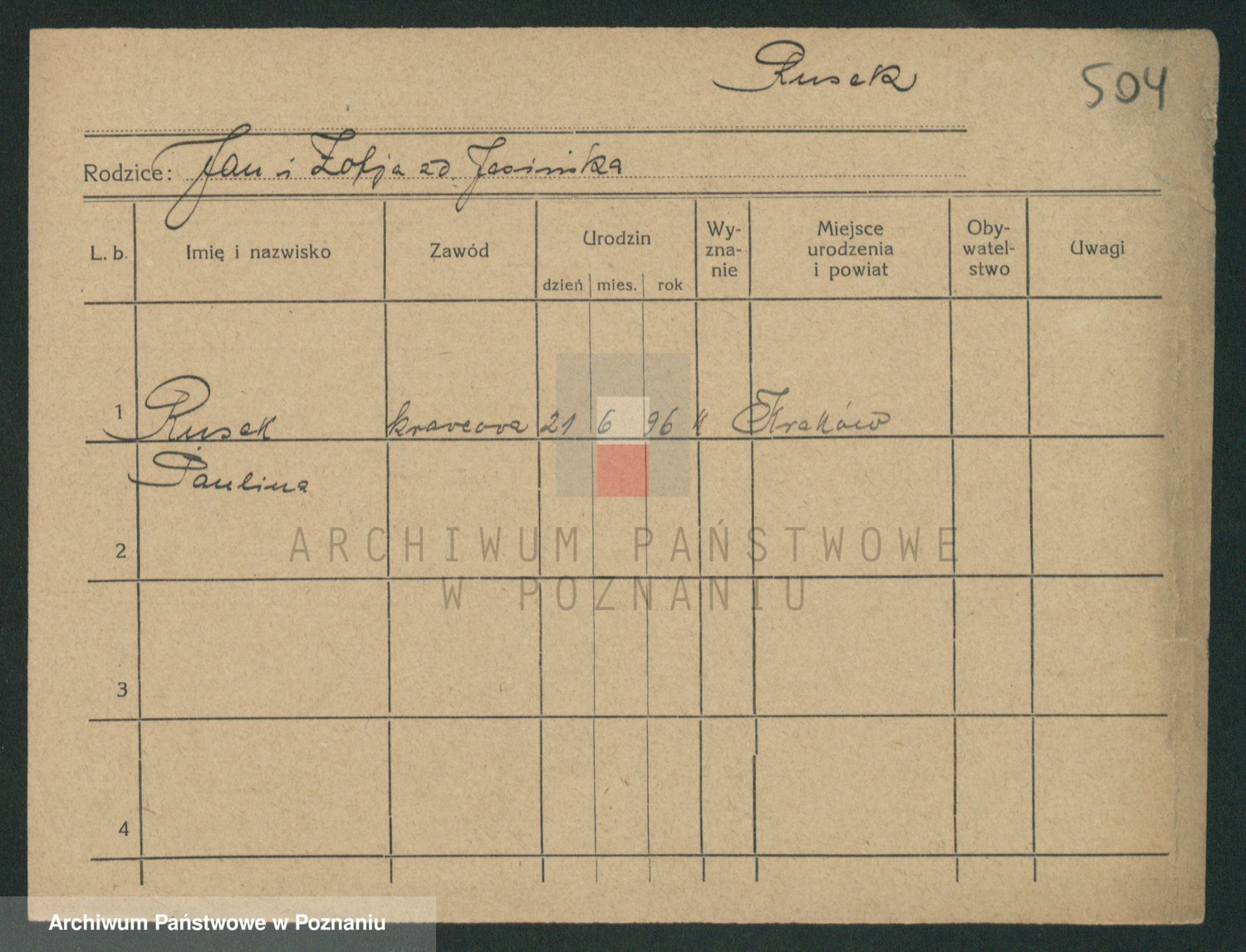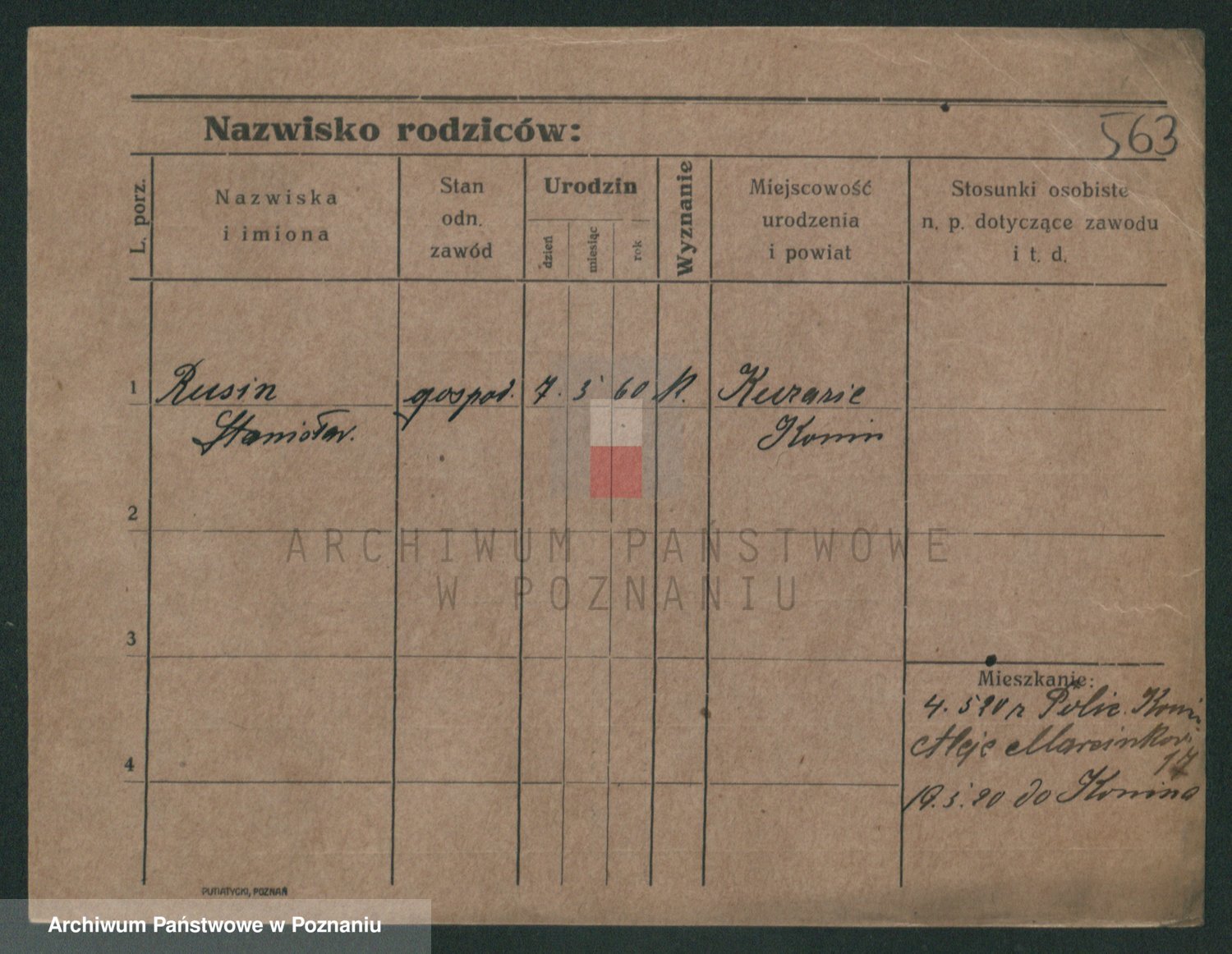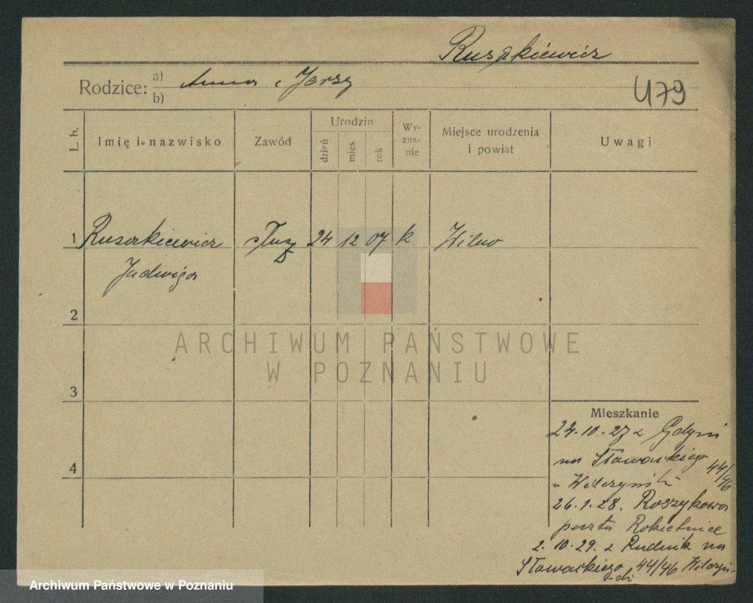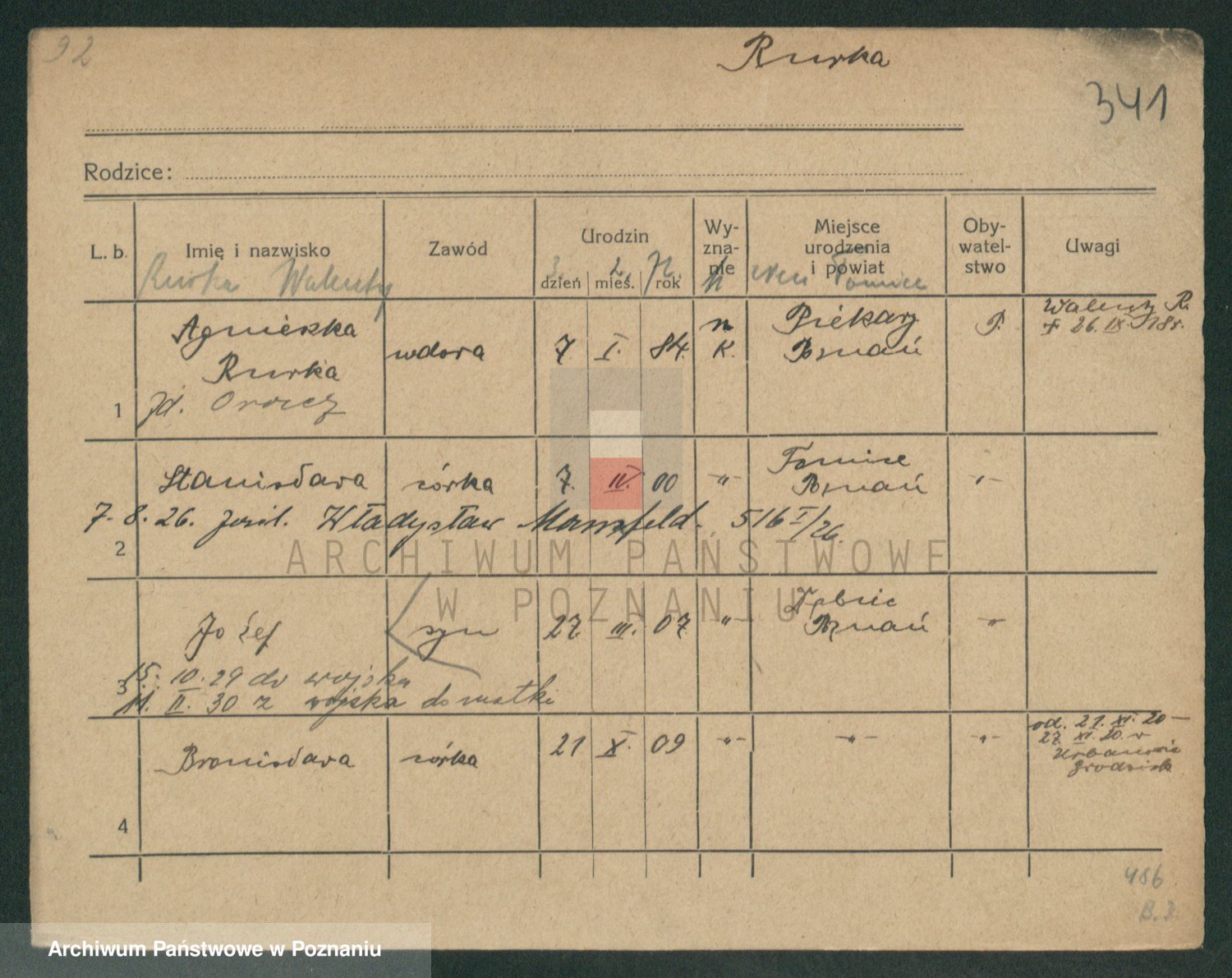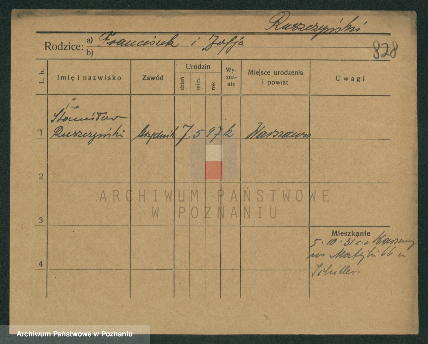 Podgląd karty osobowej dostępny jest po kliknięciu na nazwisko lub ikonkę karty. Można dokonywać powiększenia (ikony na górze) lub przechodzić między kolejnymi skanami (strzałki po bokach).