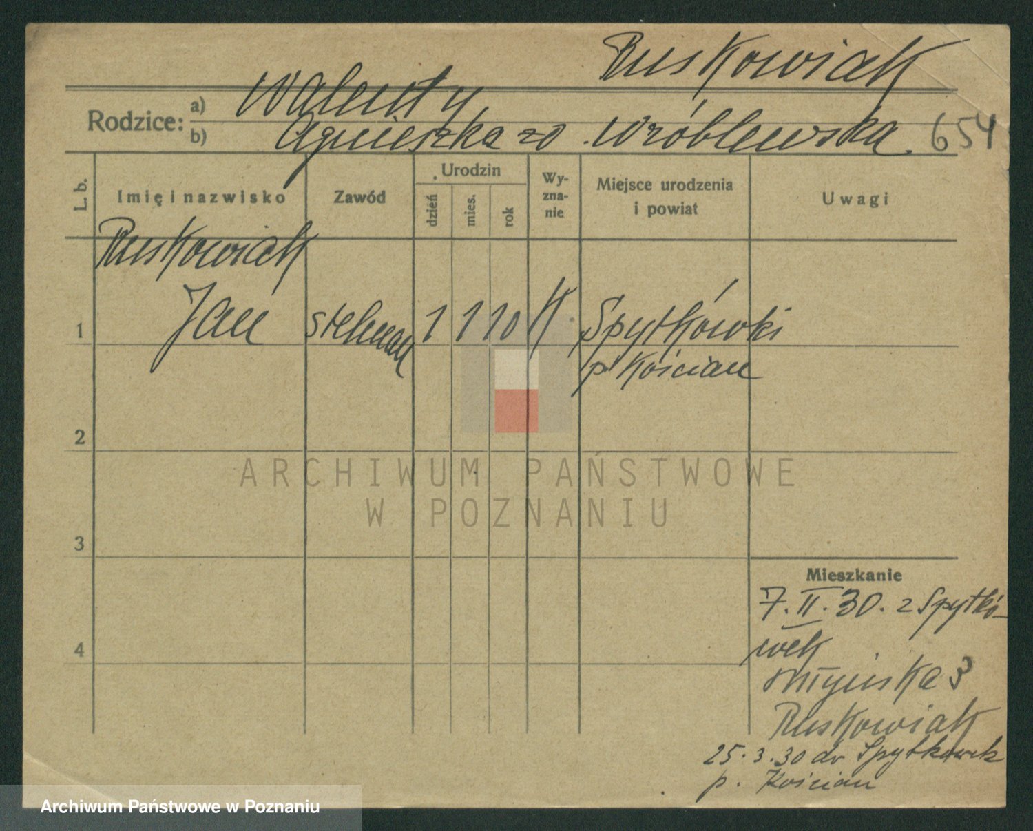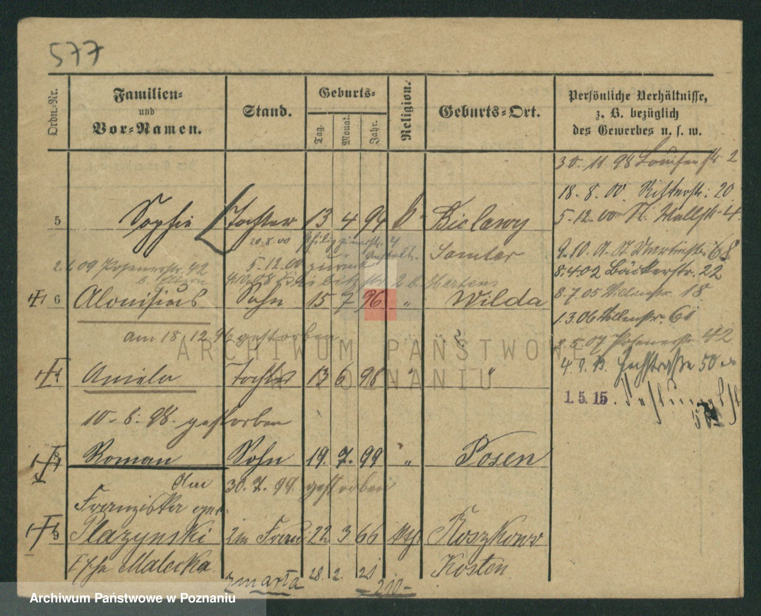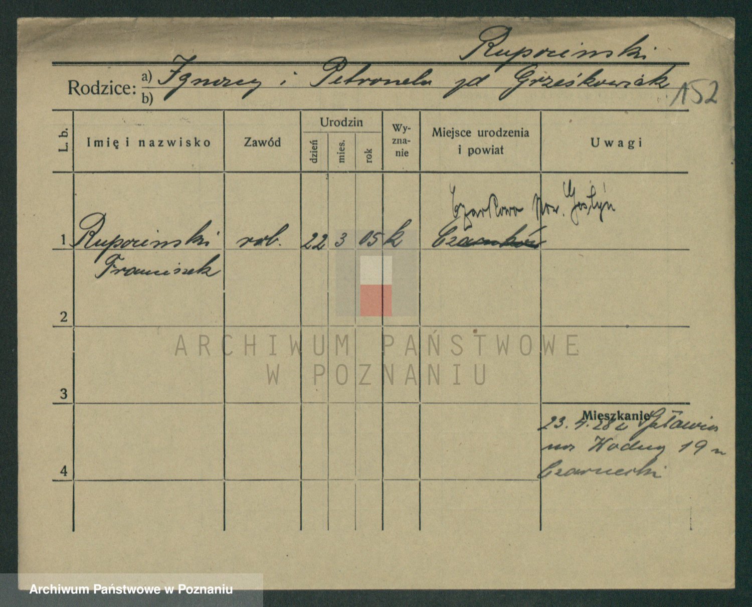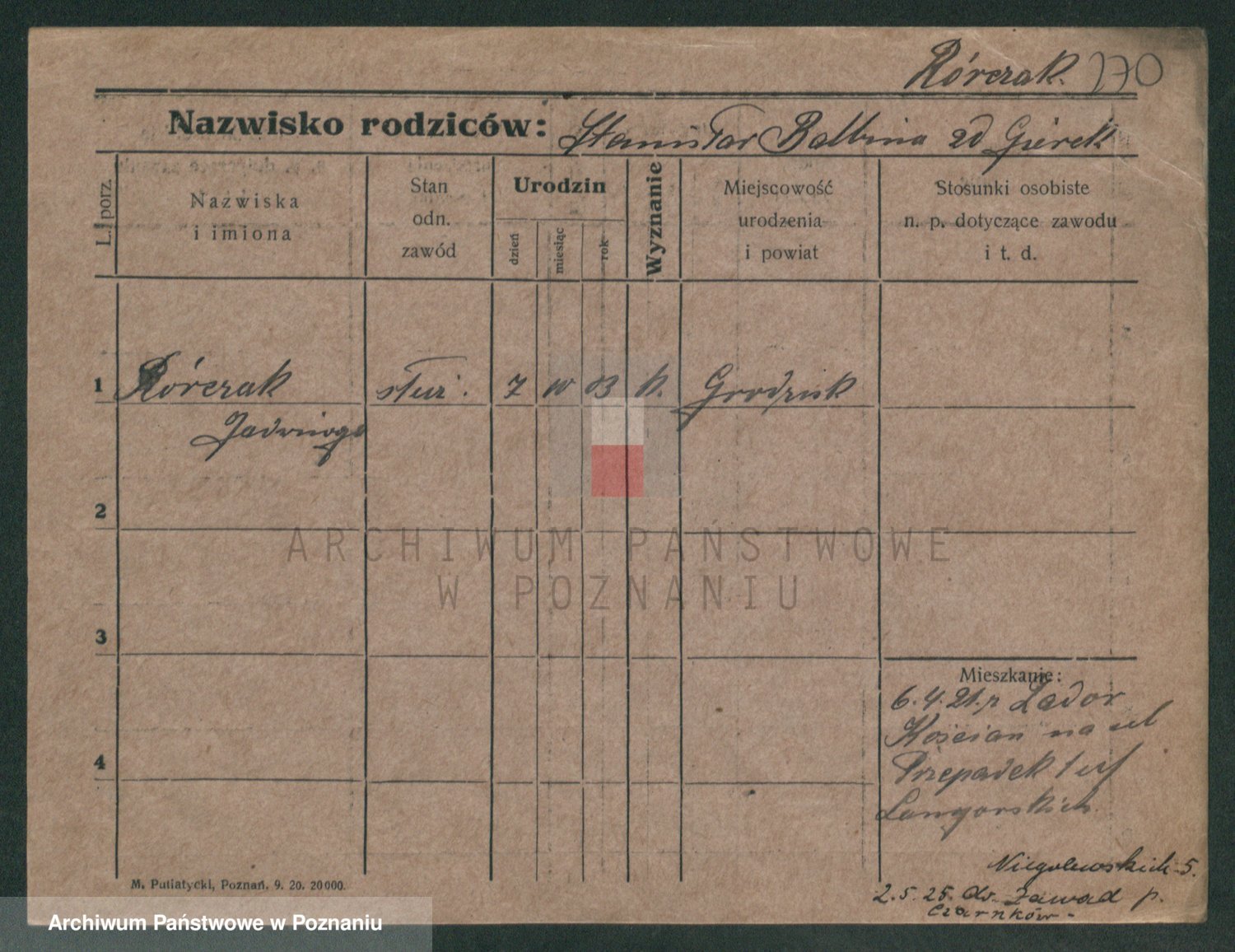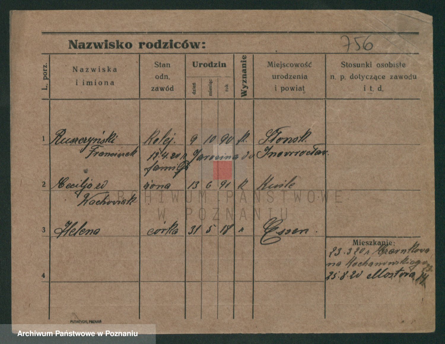 Podgląd karty osobowej dostępny jest po kliknięciu na nazwisko lub ikonkę karty. Można dokonywać powiększenia (ikony na górze) lub przechodzić między kolejnymi skanami (strzałki po bokach).