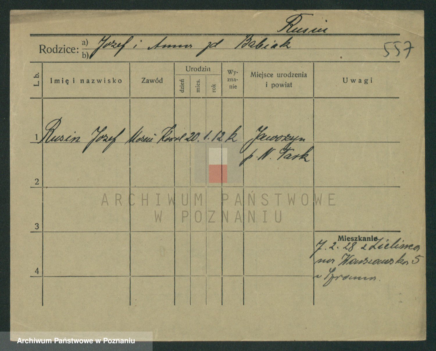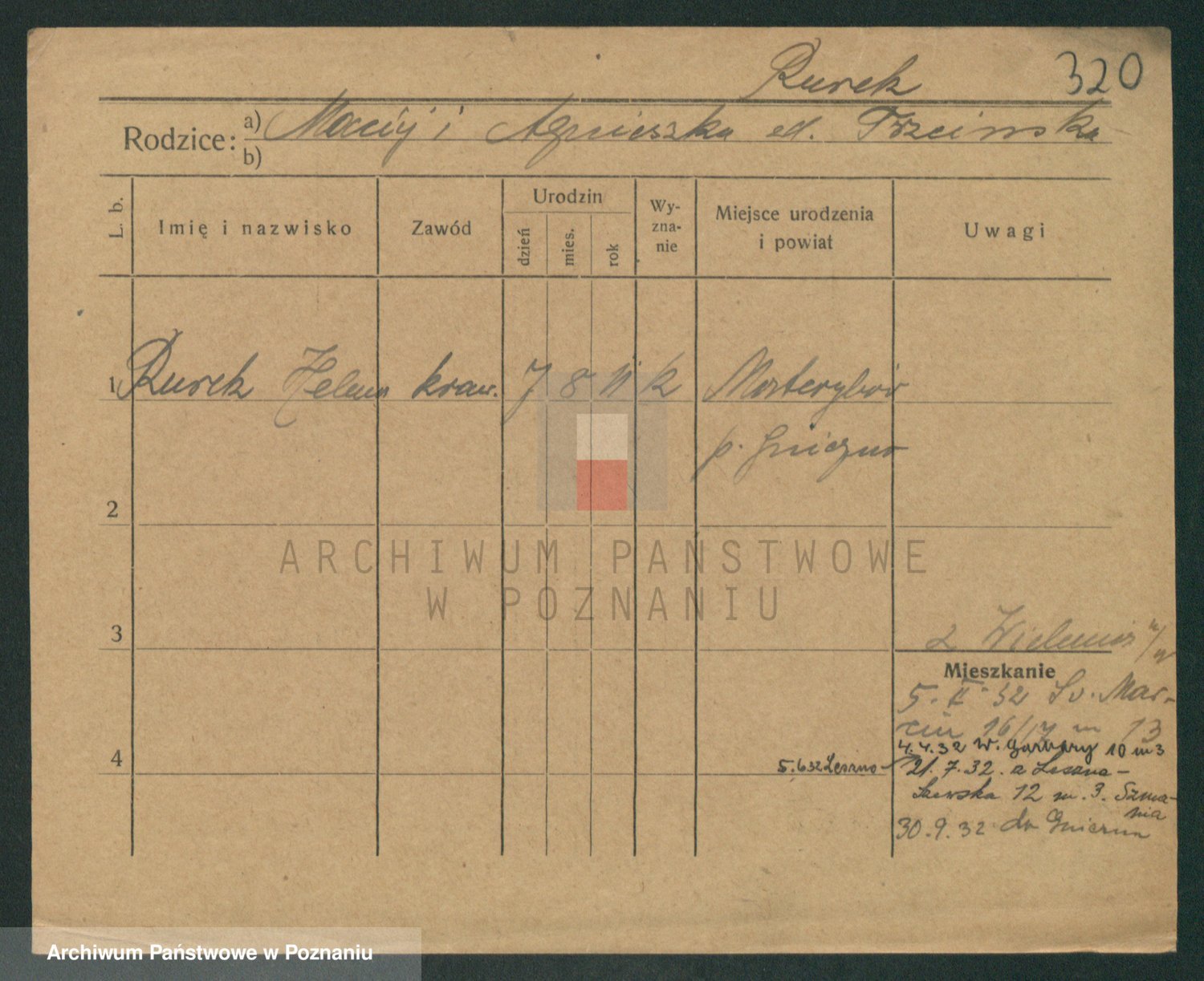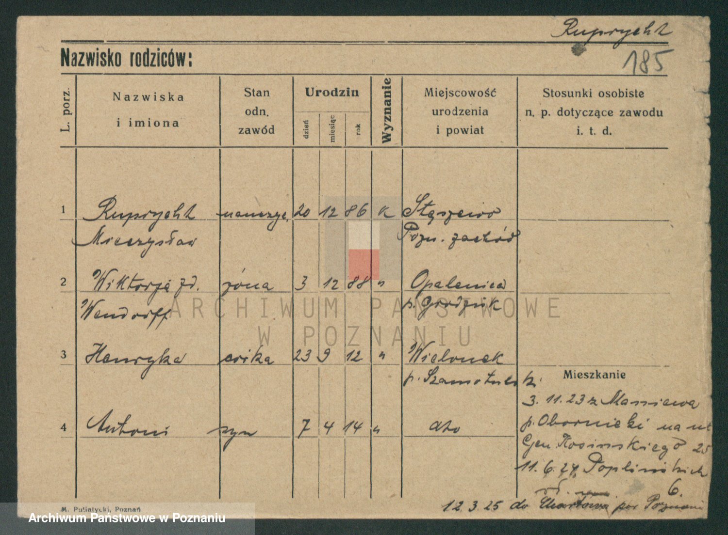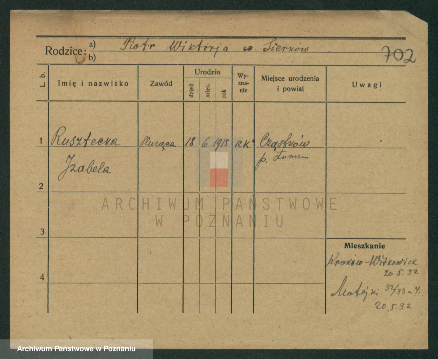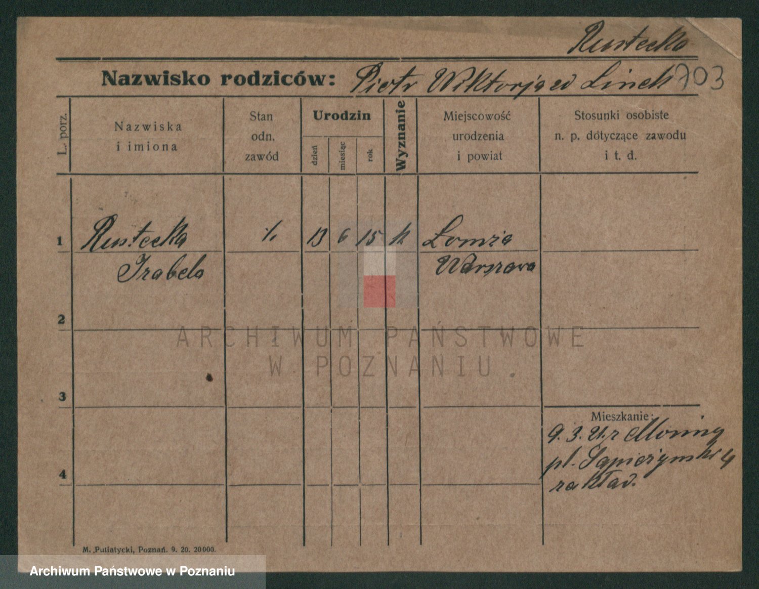 Podgląd karty osobowej dostępny jest po kliknięciu na nazwisko lub ikonkę karty. Można dokonywać powiększenia (ikony na górze) lub przechodzić między kolejnymi skanami (strzałki po bokach).