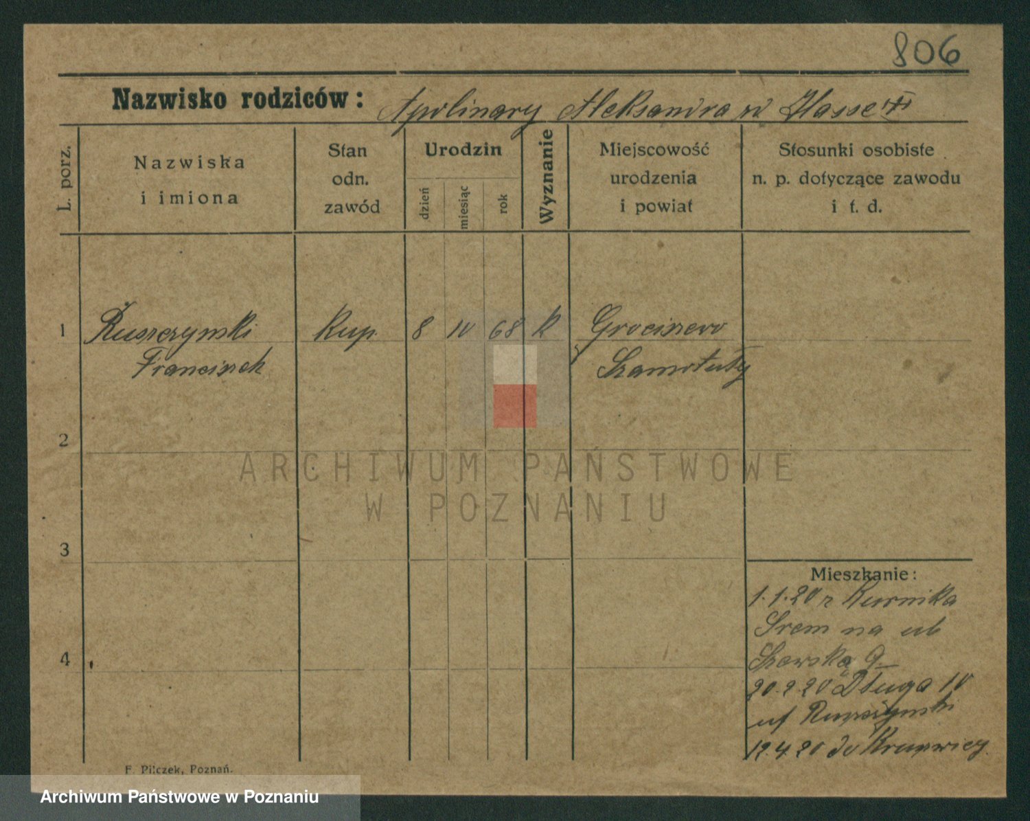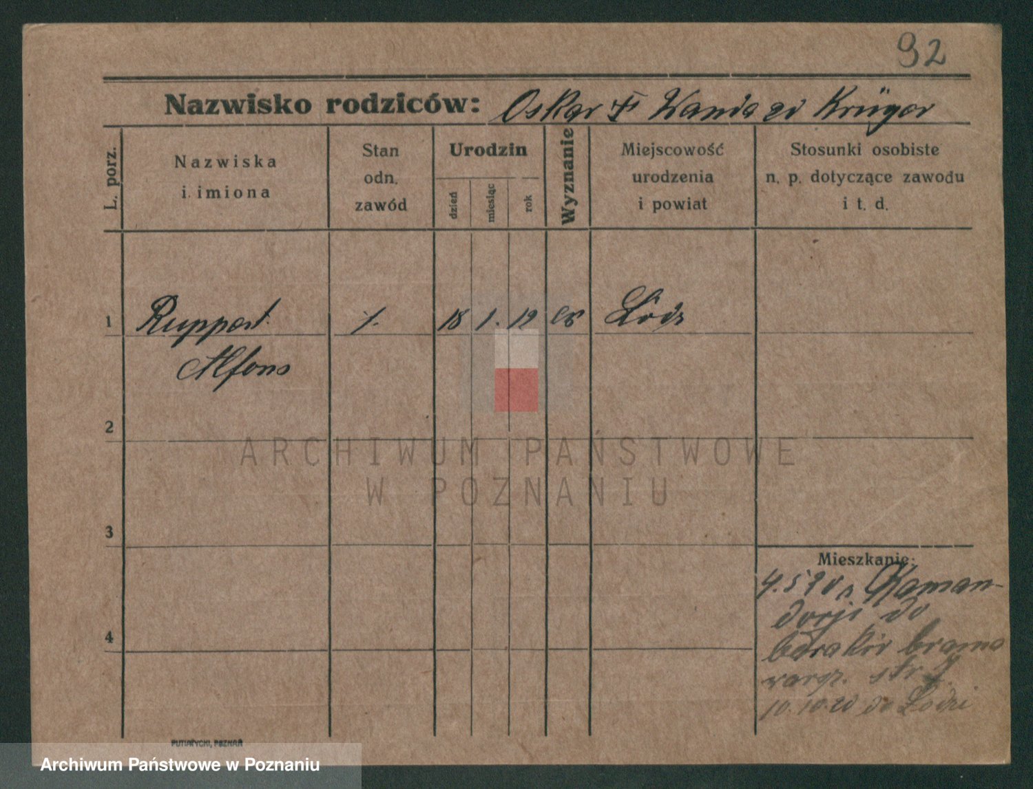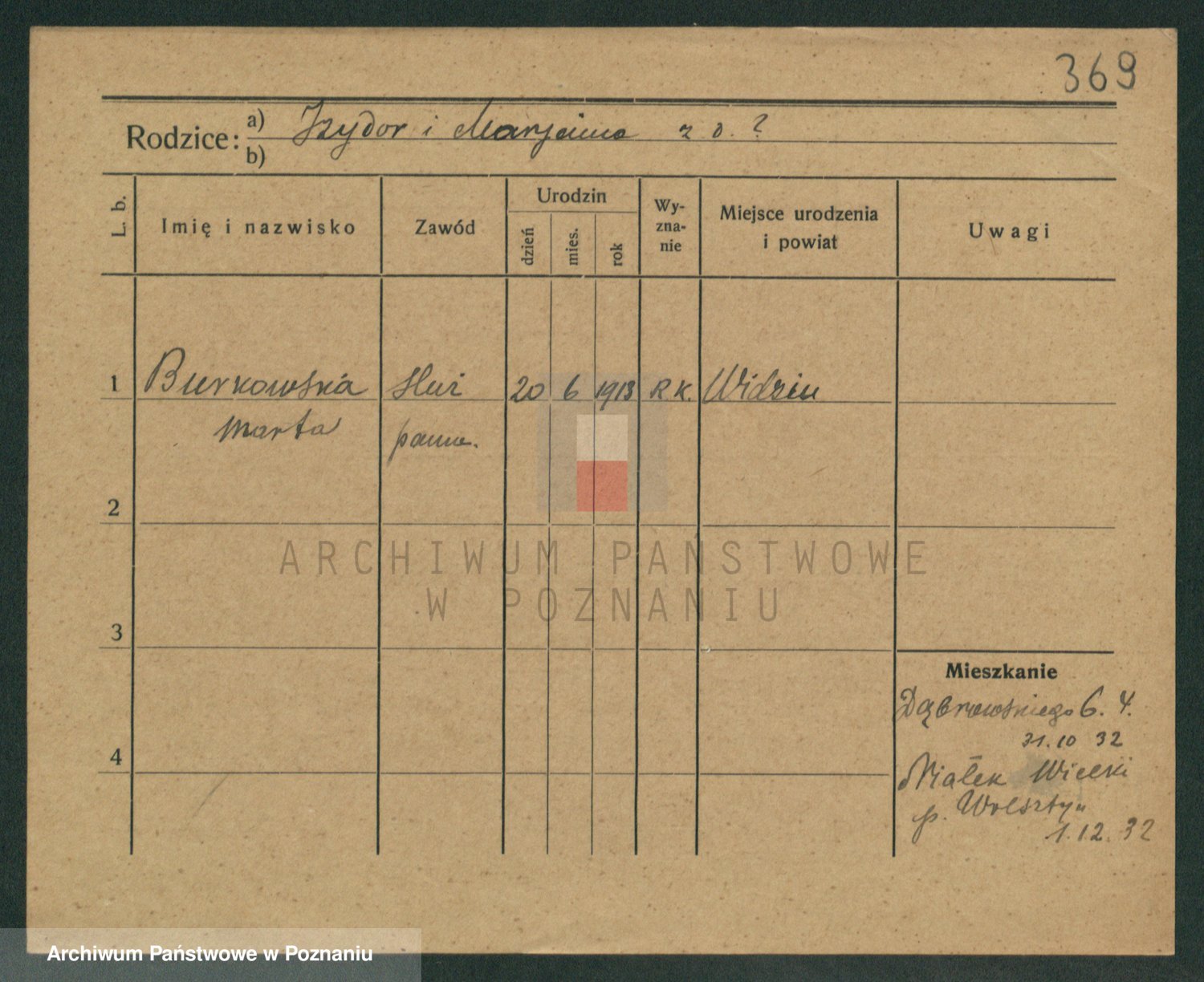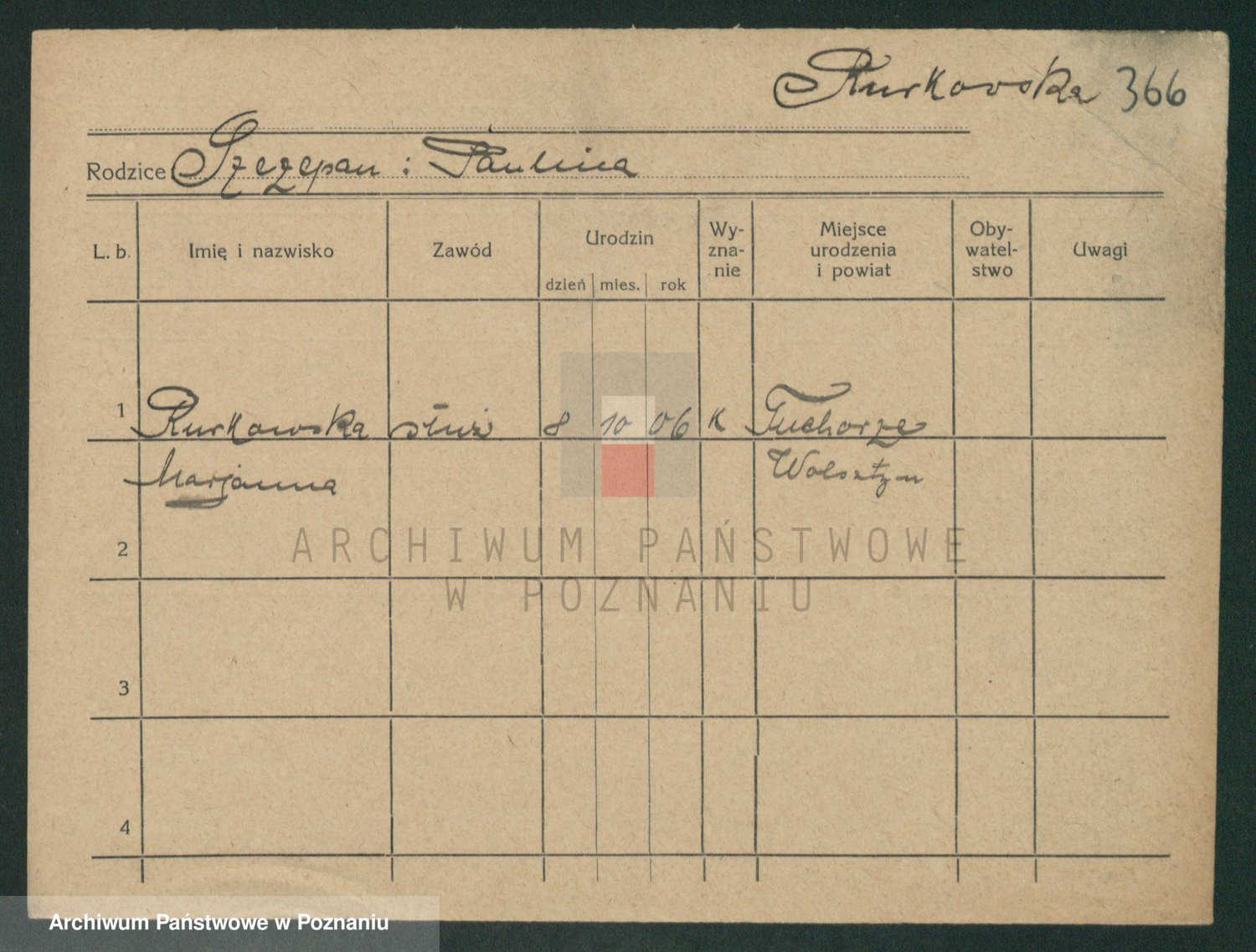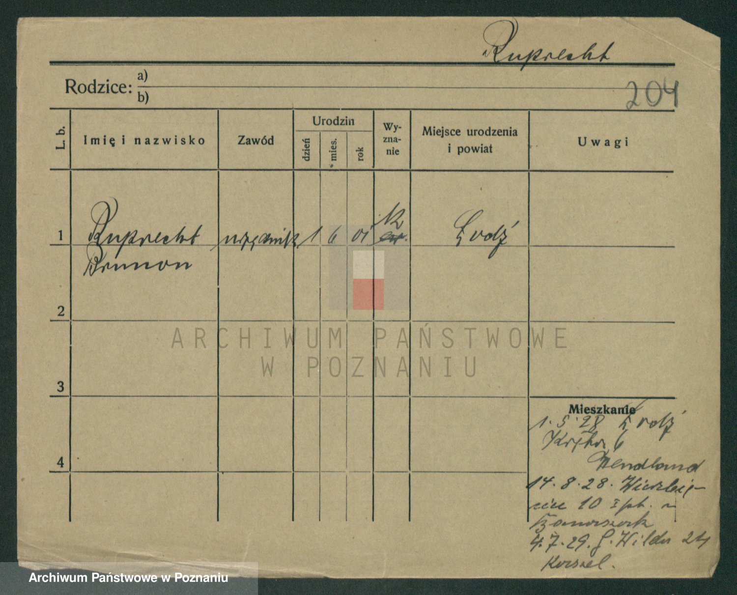 Podgląd karty osobowej dostępny jest po kliknięciu na nazwisko lub ikonkę karty. Można dokonywać powiększenia (ikony na górze) lub przechodzić między kolejnymi skanami (strzałki po bokach).