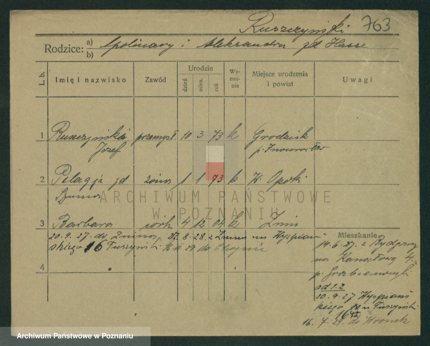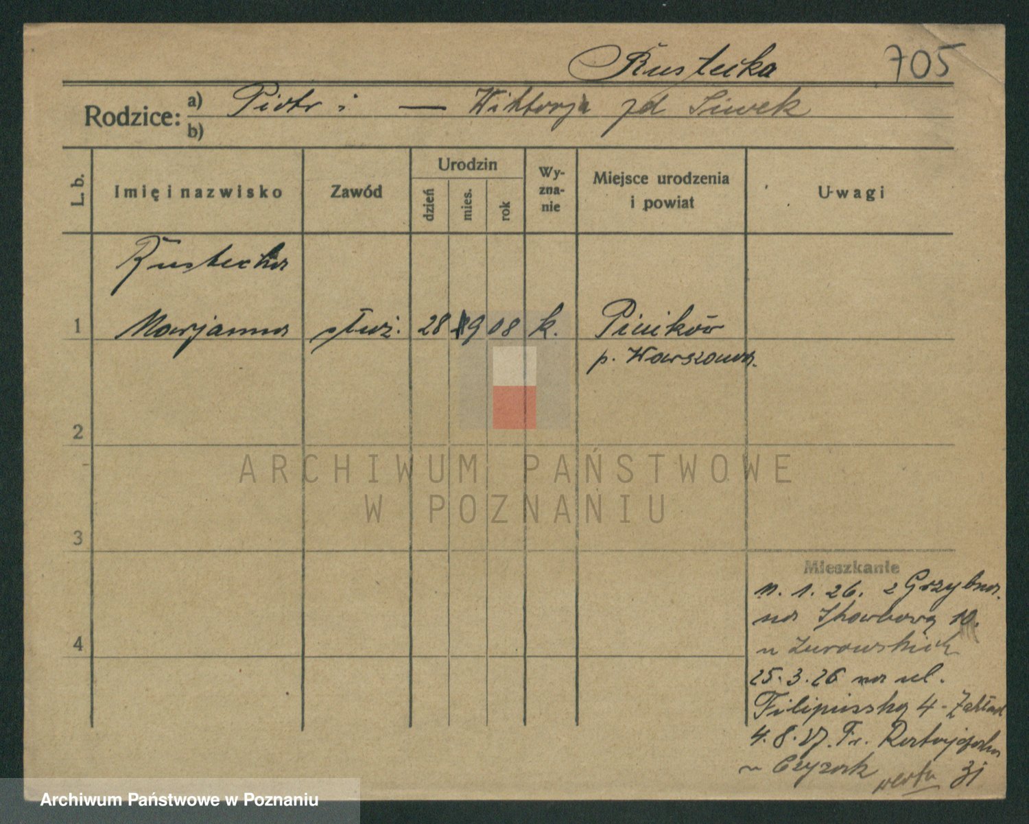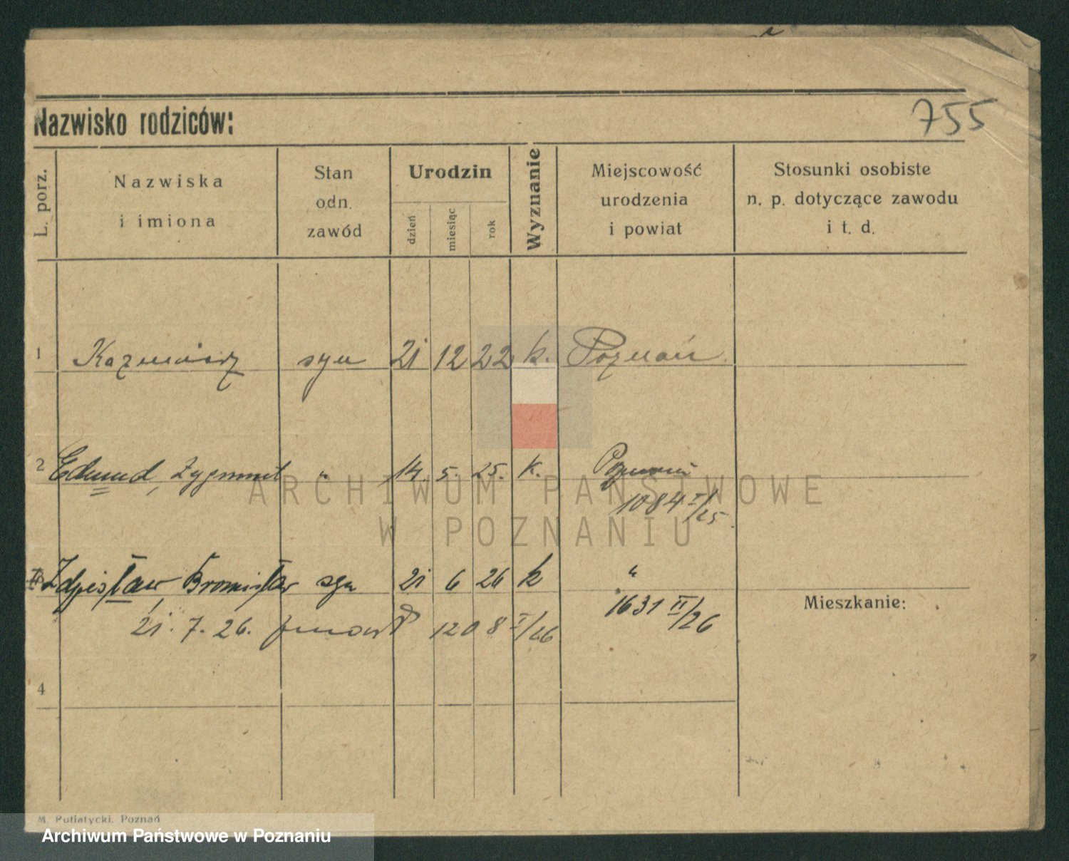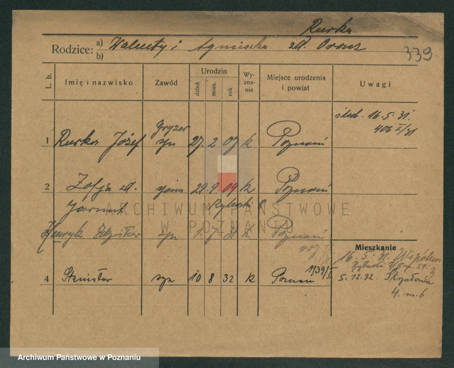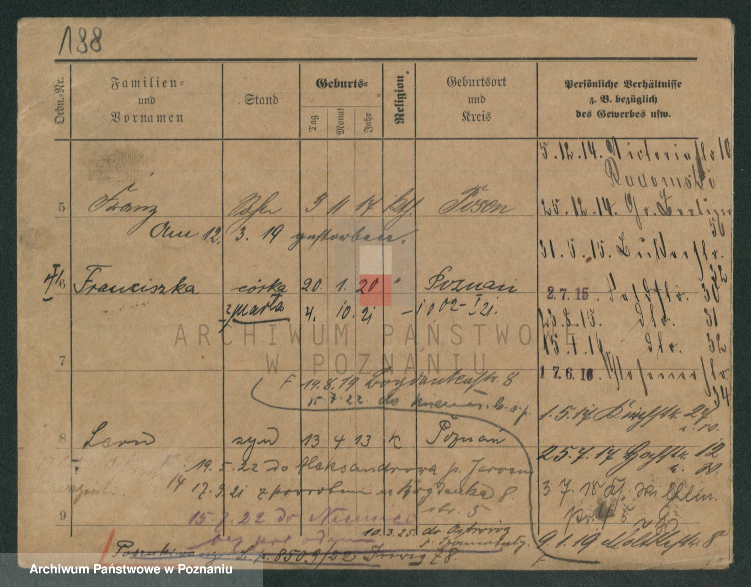 Podgląd karty osobowej dostępny jest po kliknięciu na nazwisko lub ikonkę karty. Można dokonywać powiększenia (ikony na górze) lub przechodzić między kolejnymi skanami (strzałki po bokach).