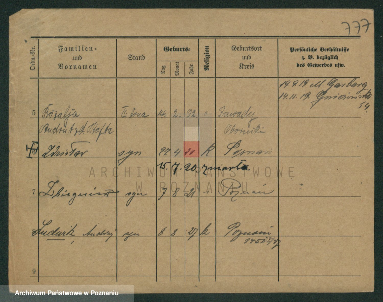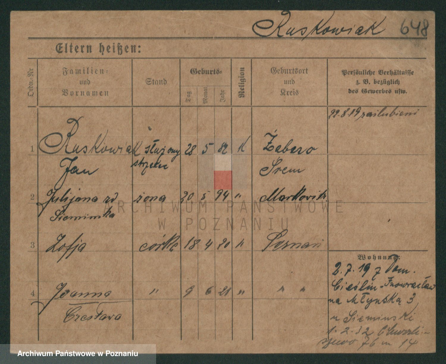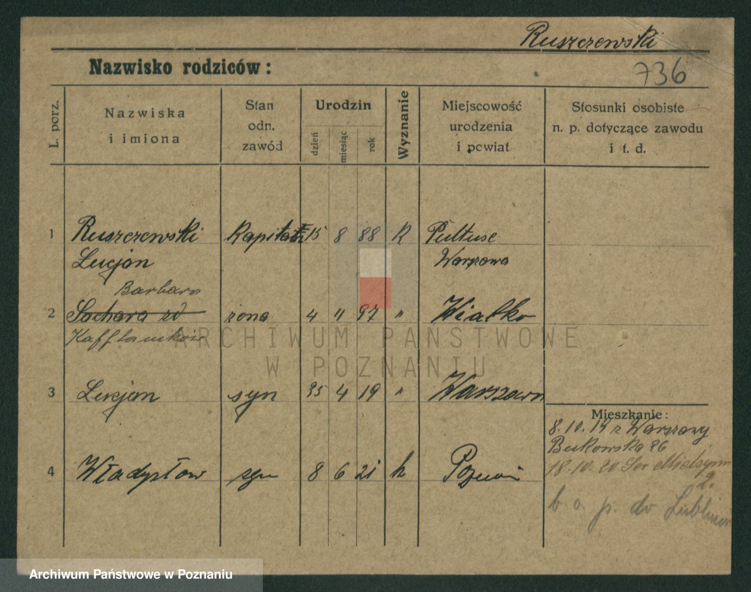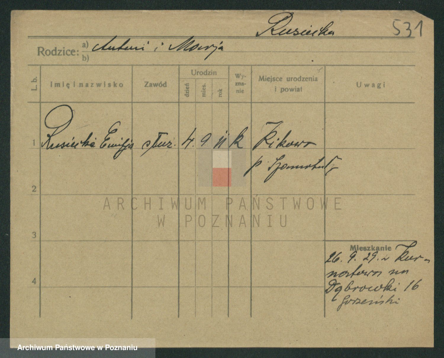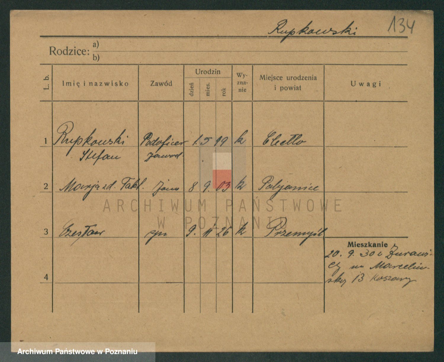Podgląd karty osobowej dostępny jest po kliknięciu na nazwisko lub ikonkę karty. Można dokonywać powiększenia (ikony na górze) lub przechodzić między kolejnymi skanami (strzałki po bokach).