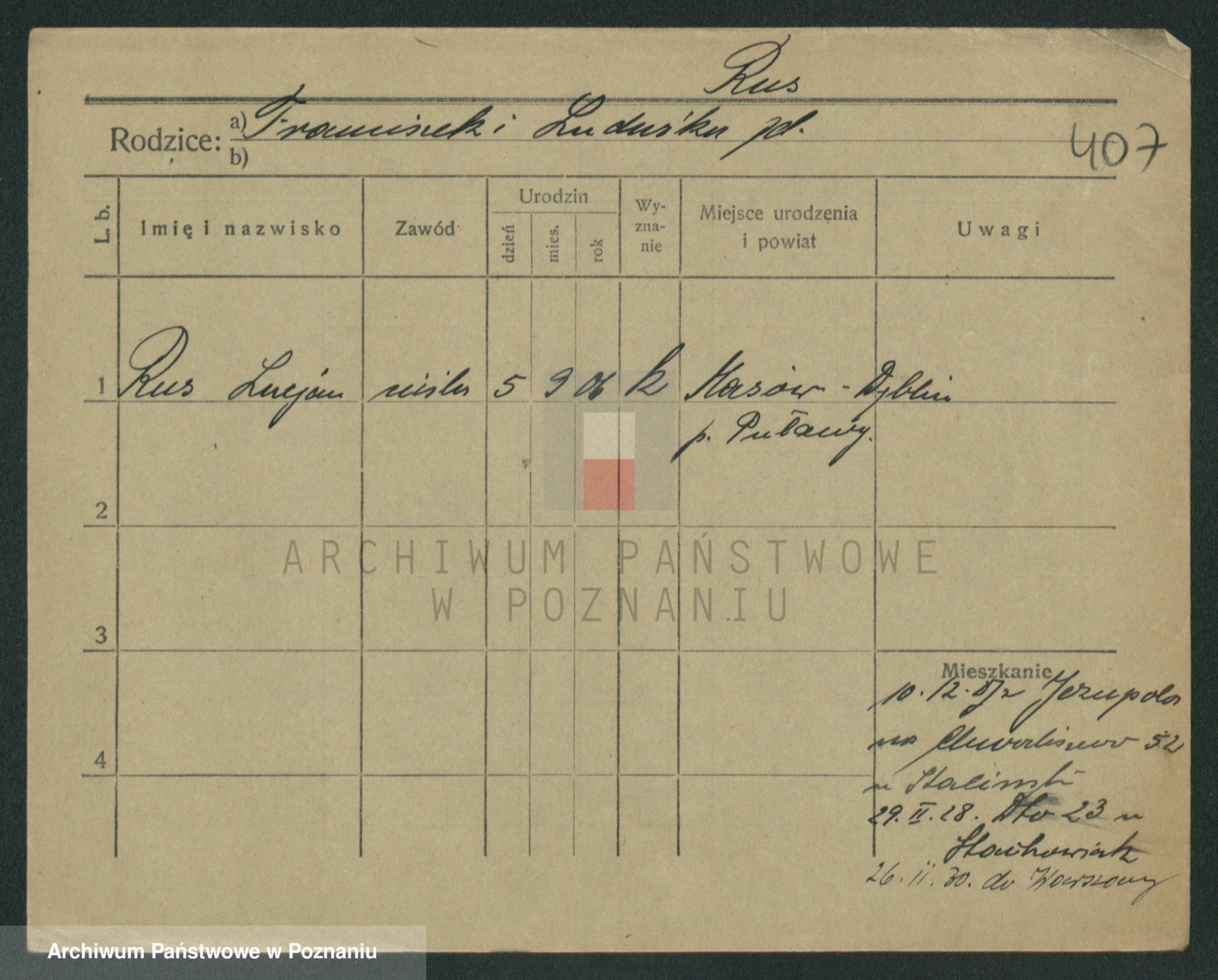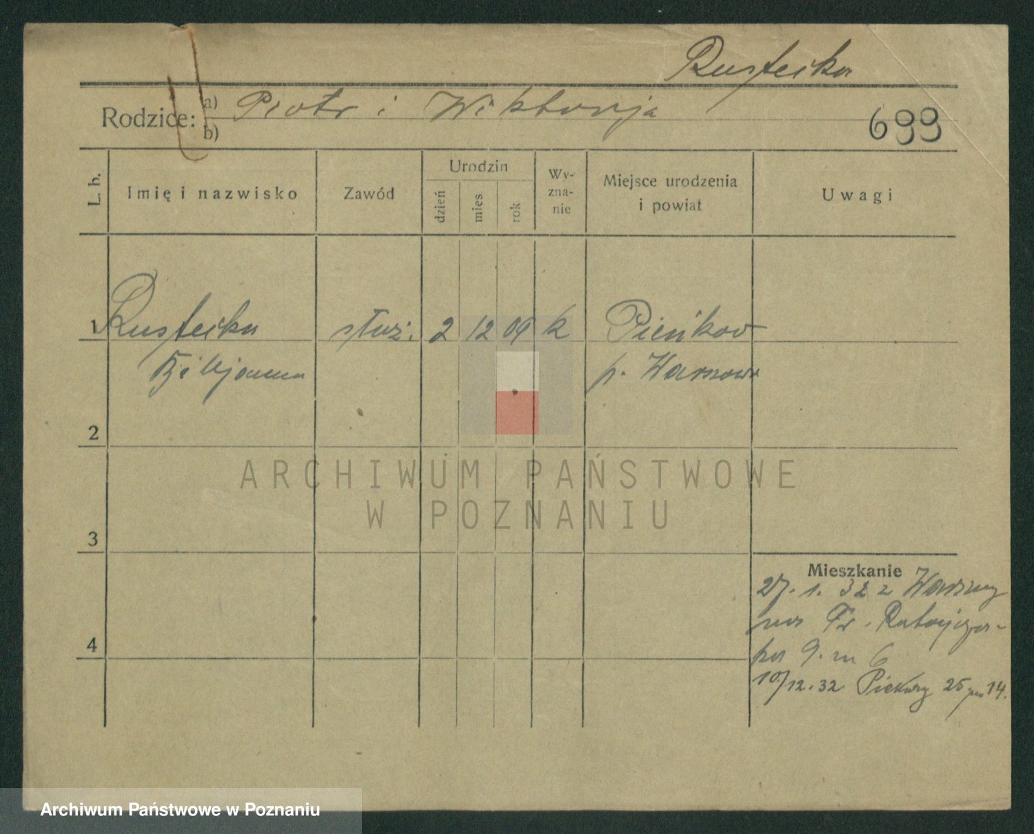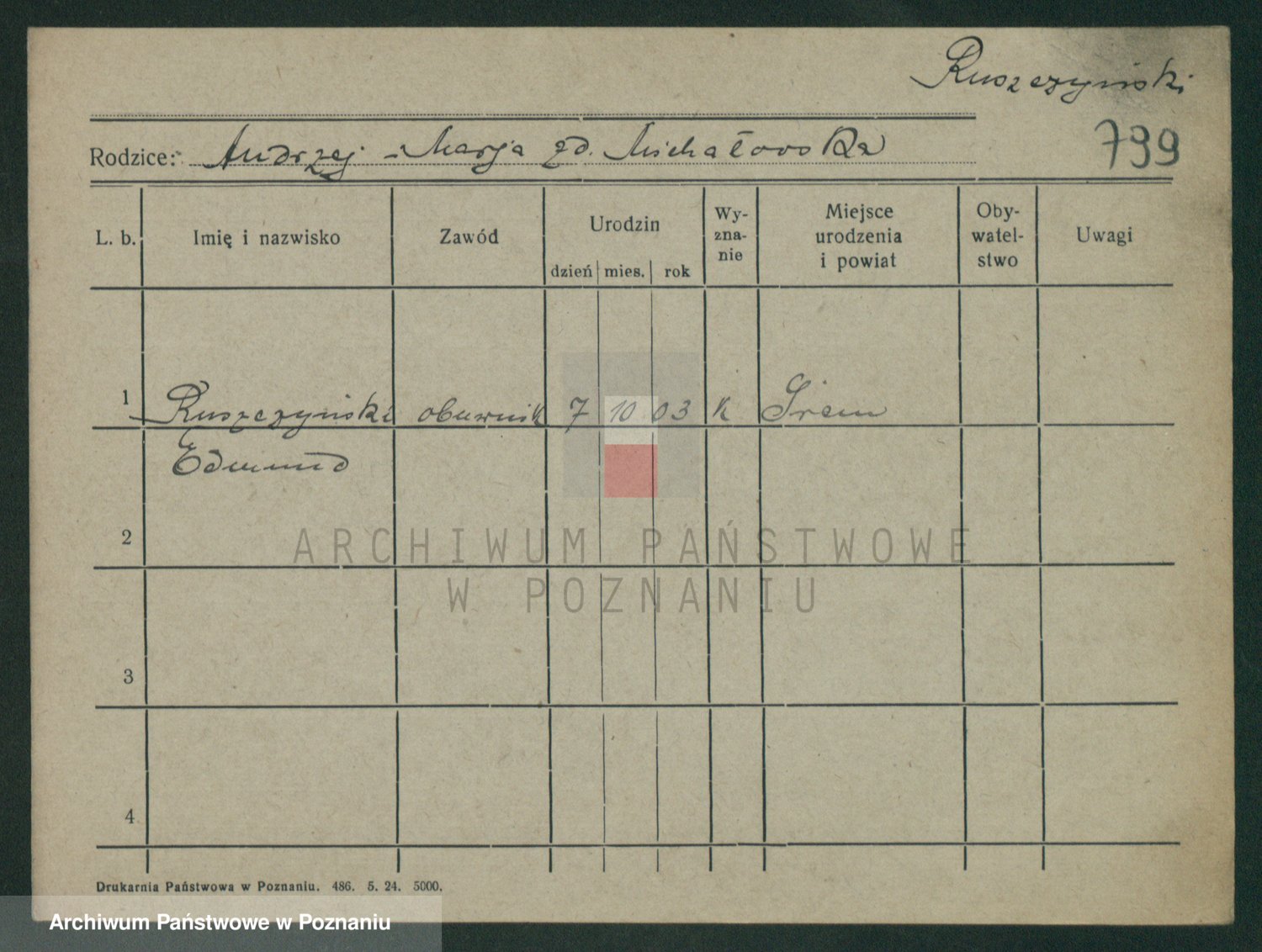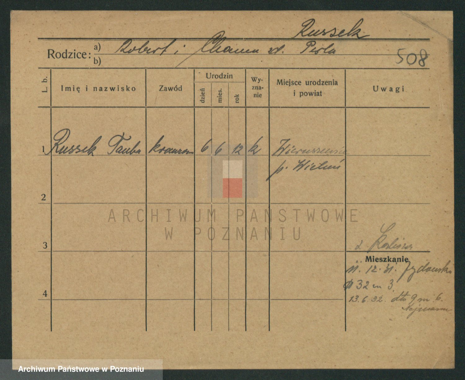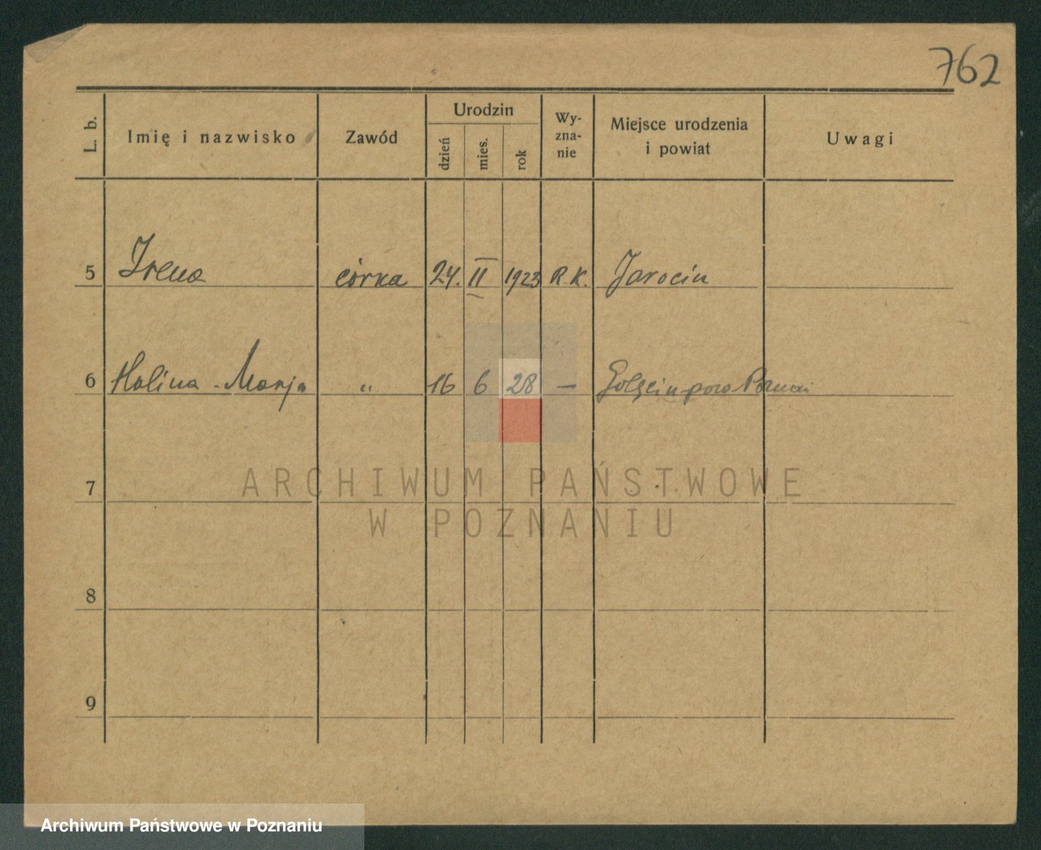 Podgląd karty osobowej dostępny jest po kliknięciu na nazwisko lub ikonkę karty. Można dokonywać powiększenia (ikony na górze) lub przechodzić między kolejnymi skanami (strzałki po bokach).