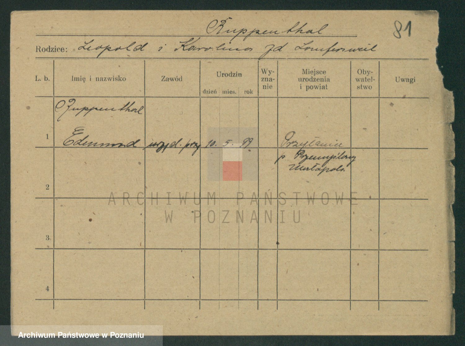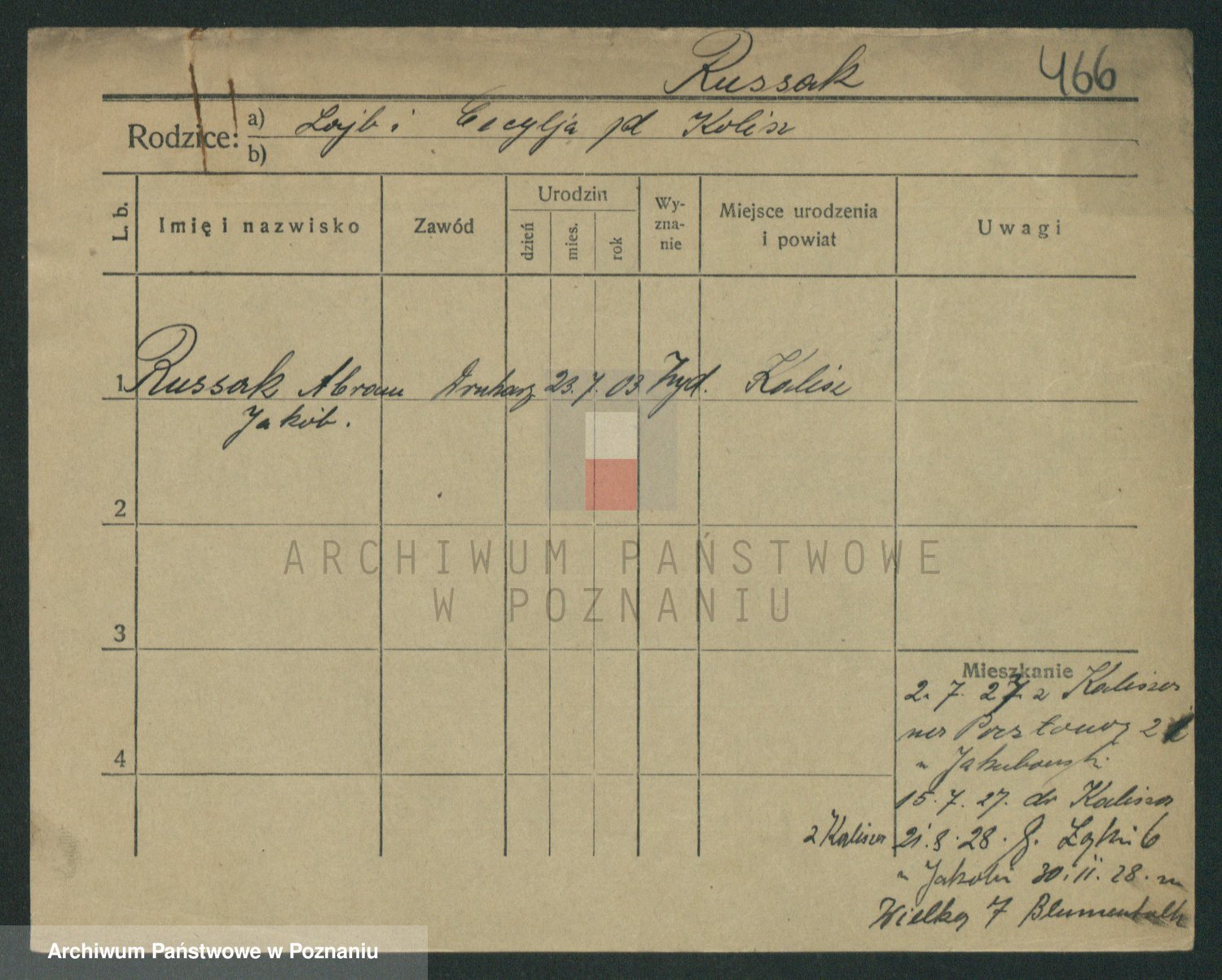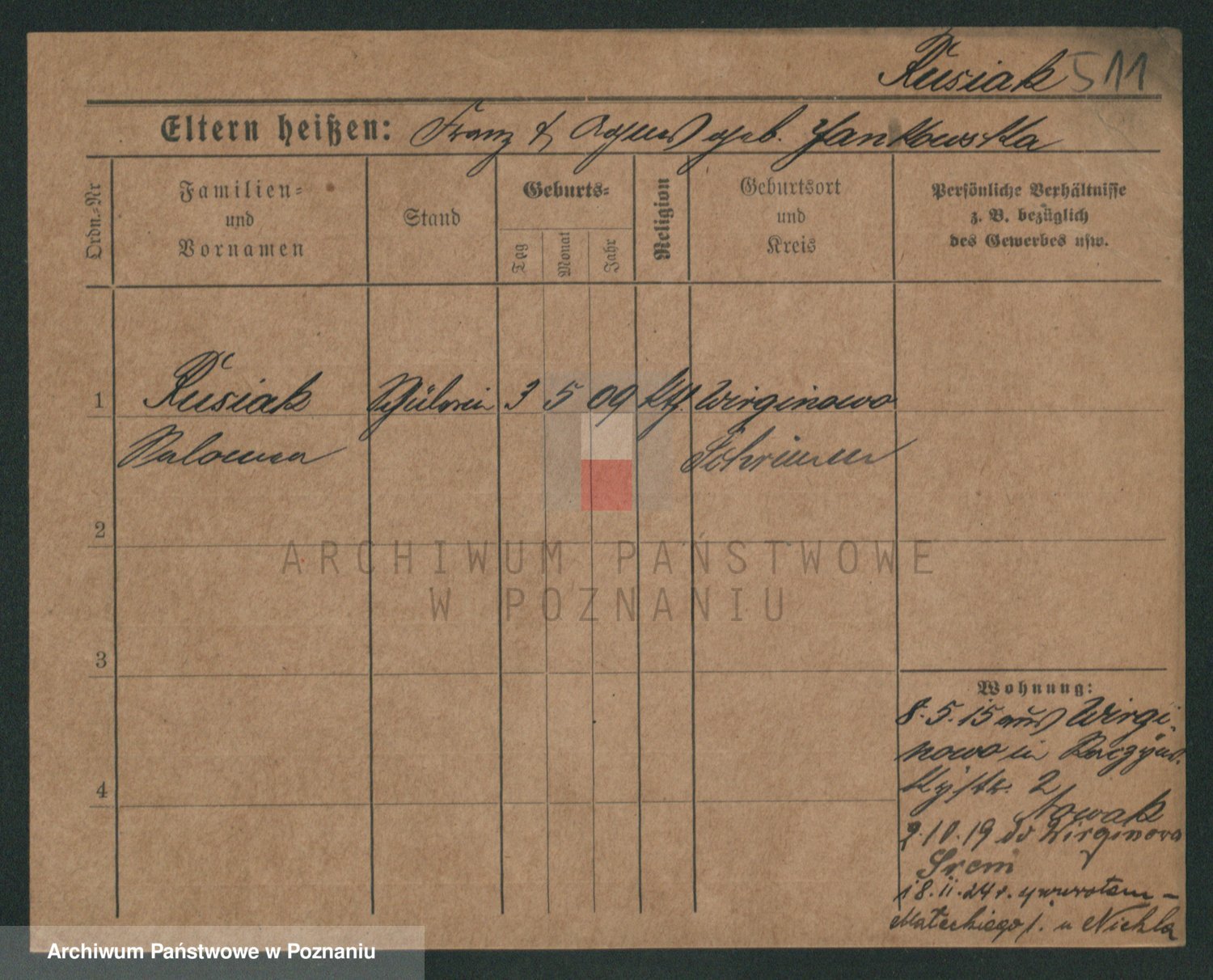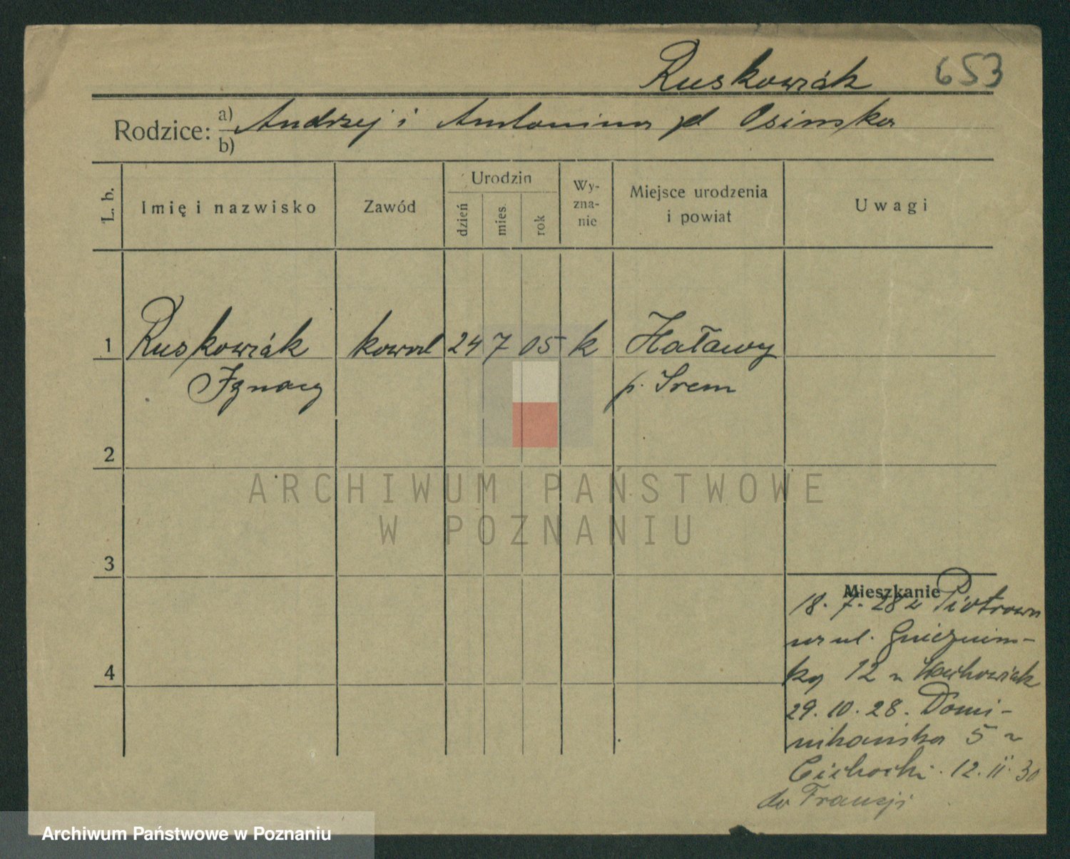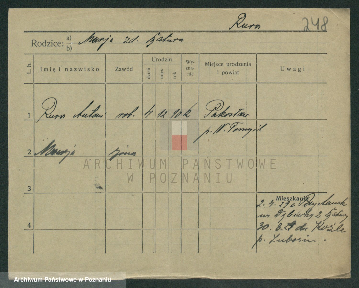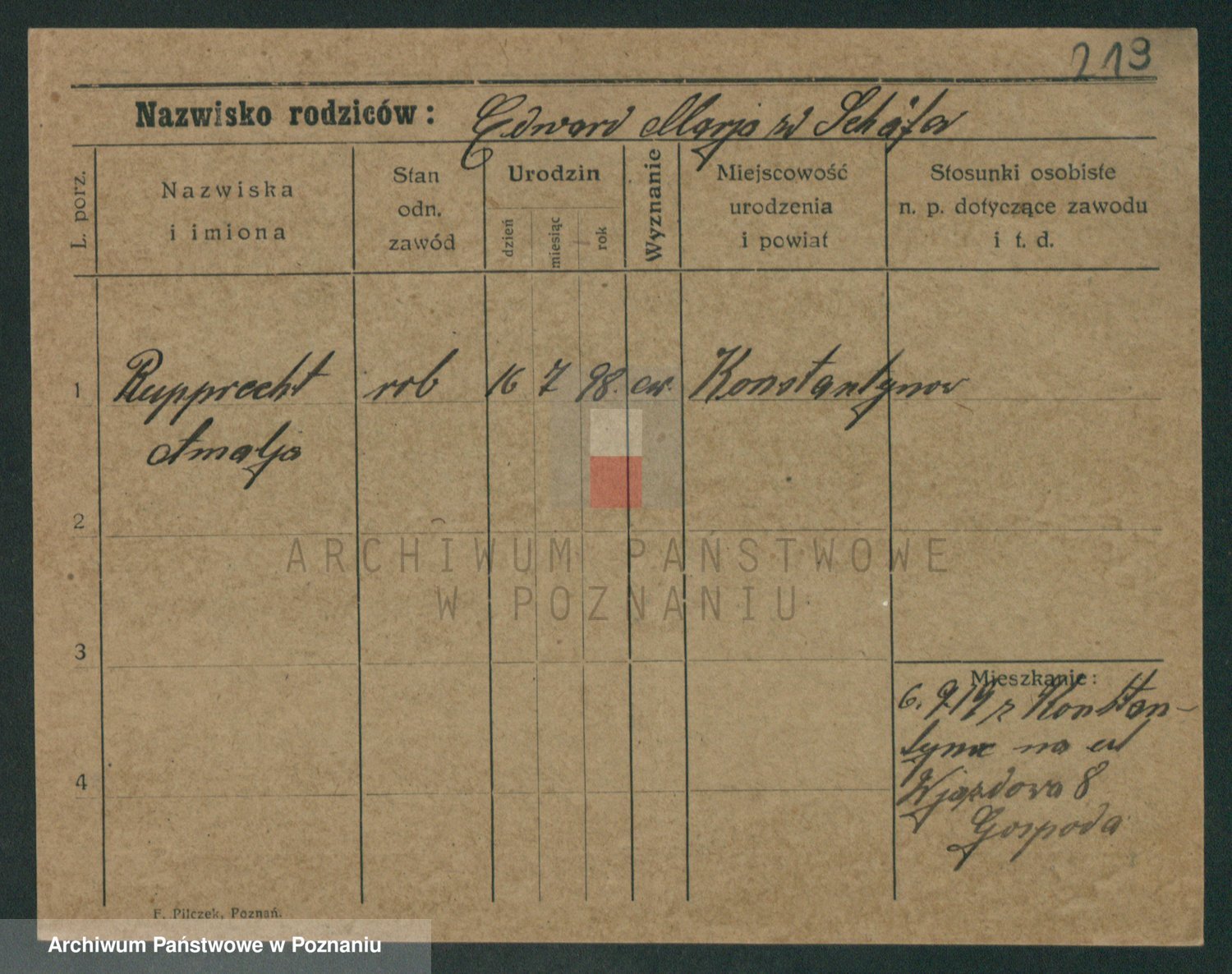 Podgląd karty osobowej dostępny jest po kliknięciu na nazwisko lub ikonkę karty. Można dokonywać powiększenia (ikony na górze) lub przechodzić między kolejnymi skanami (strzałki po bokach).