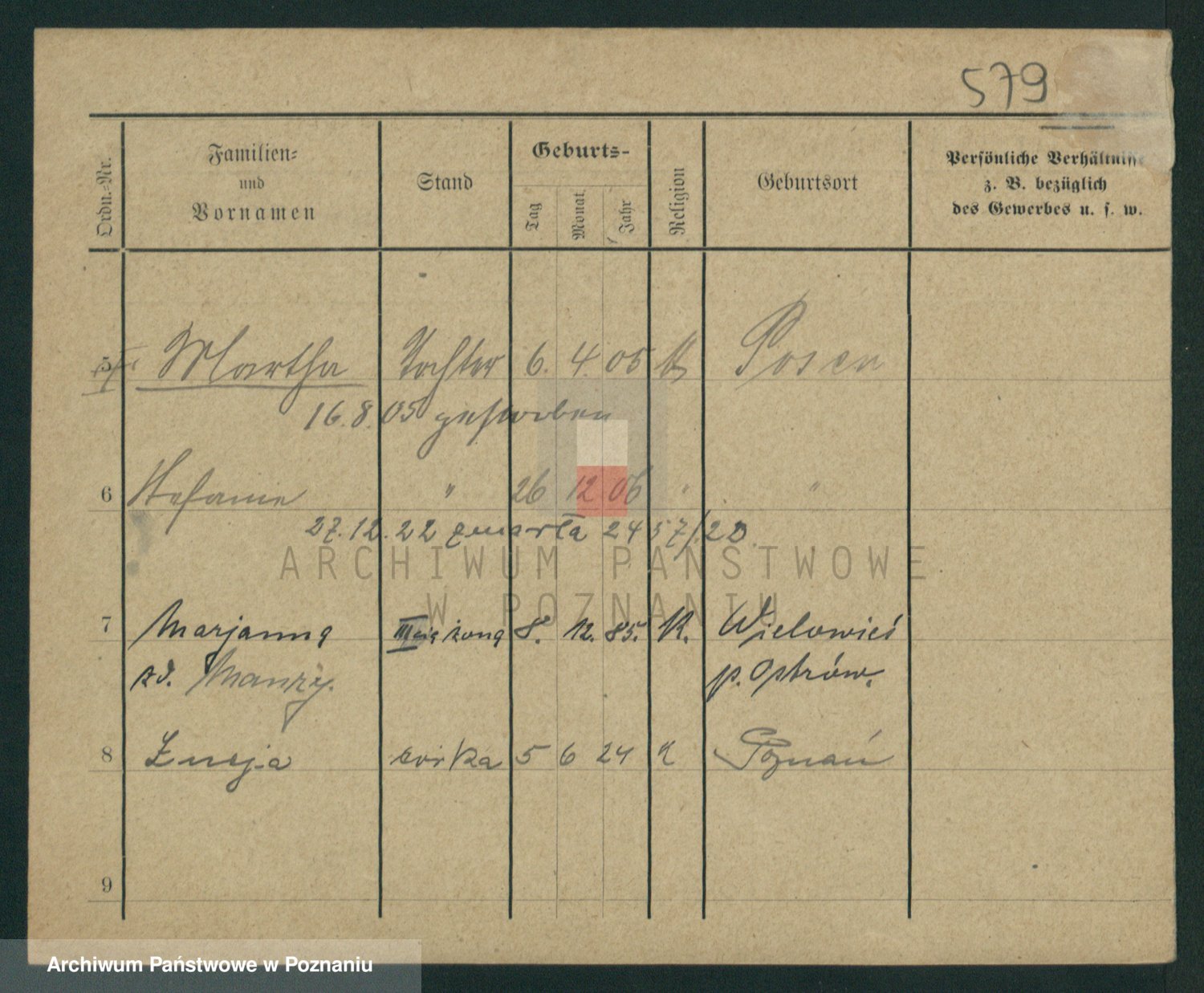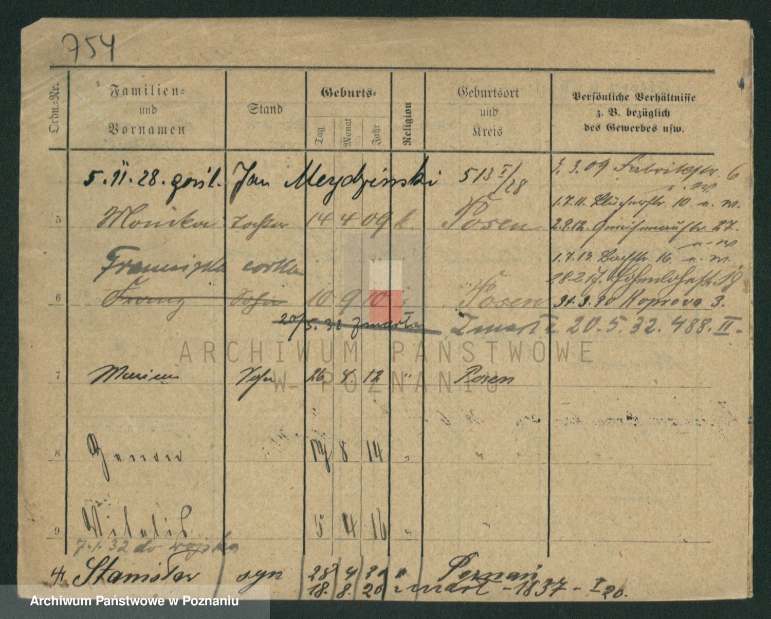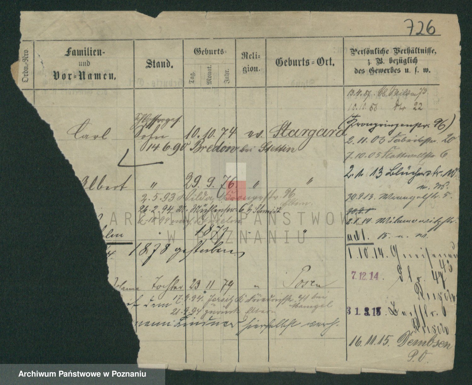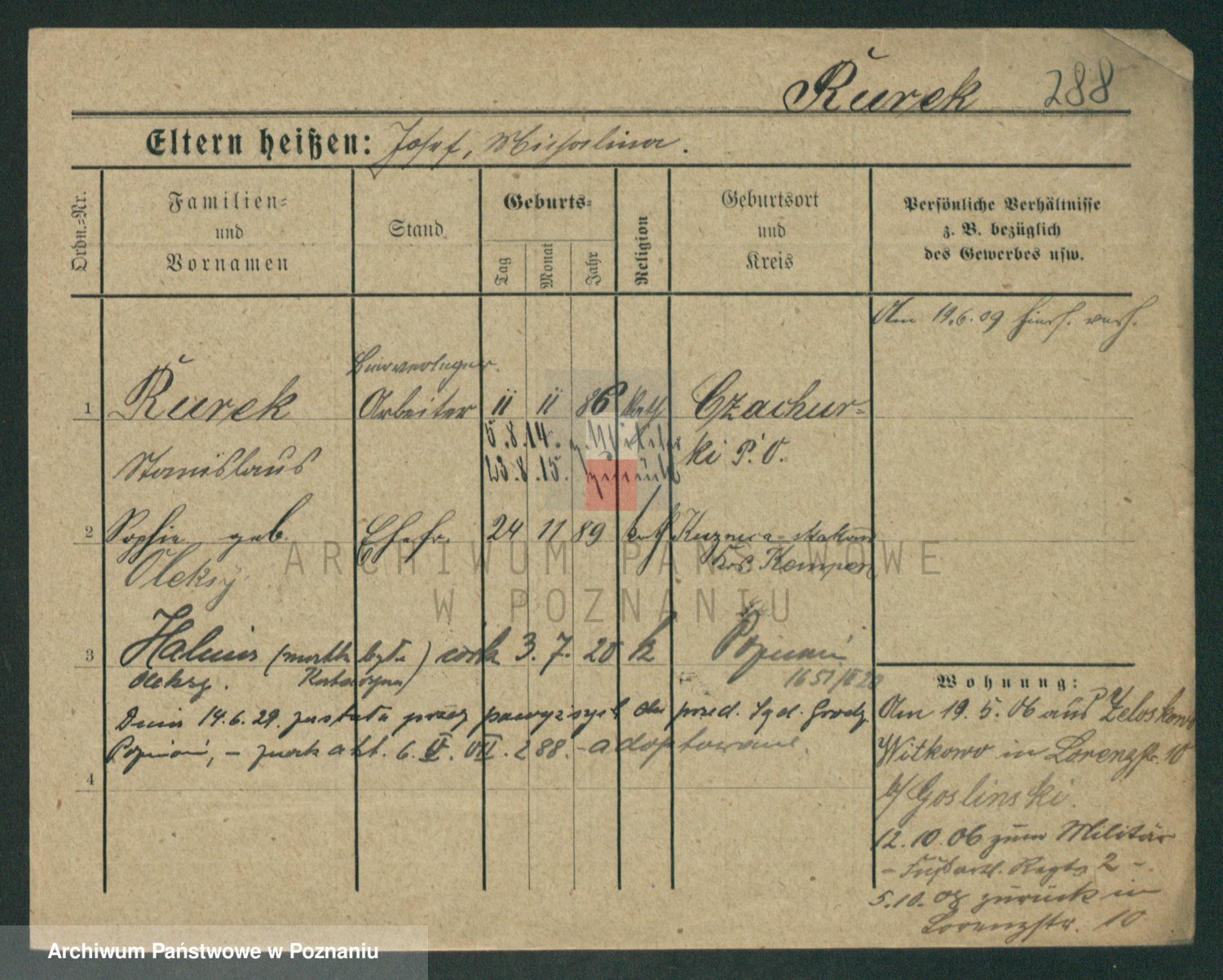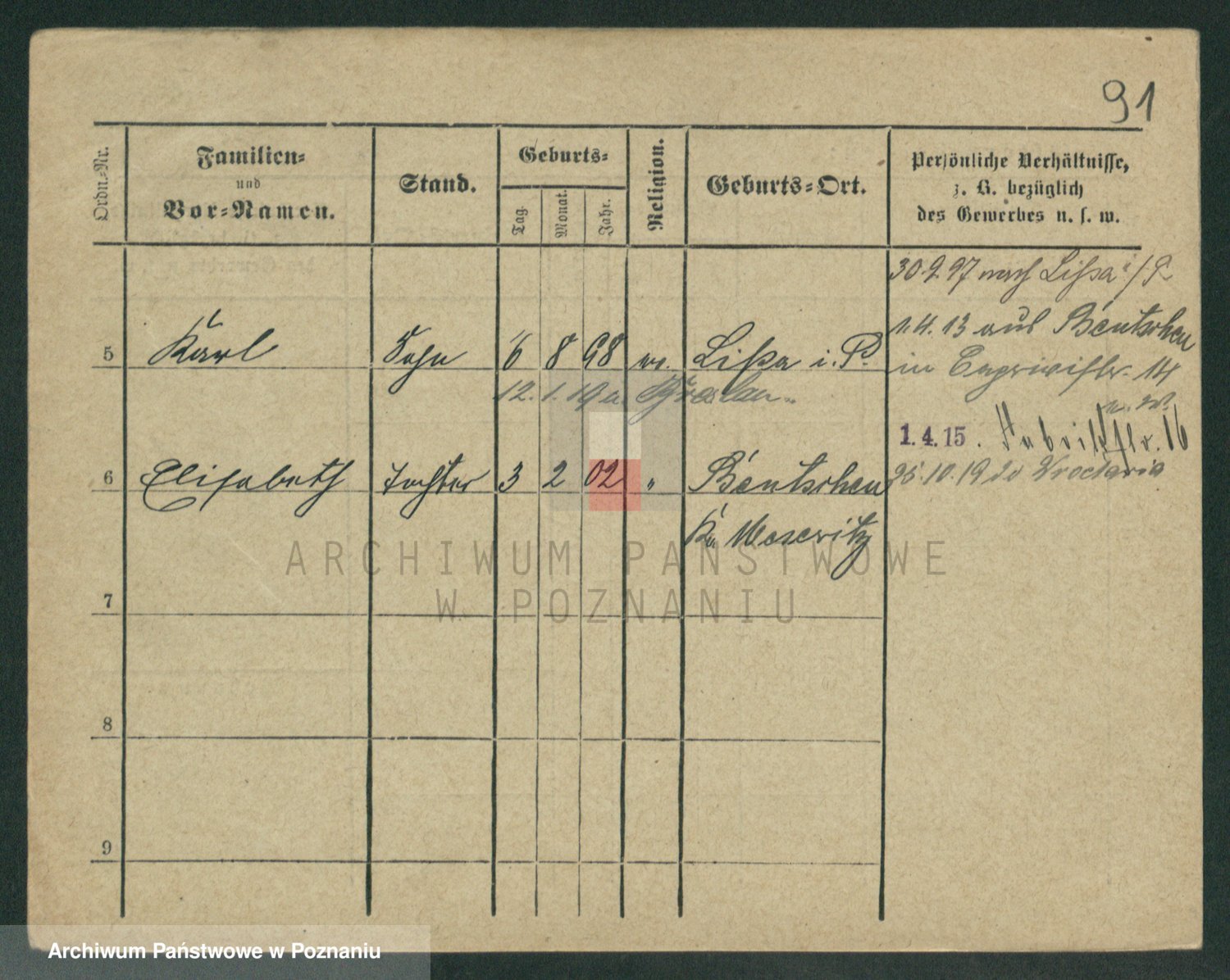 Podgląd karty osobowej dostępny jest po kliknięciu na nazwisko lub ikonkę karty. Można dokonywać powiększenia (ikony na górze) lub przechodzić między kolejnymi skanami (strzałki po bokach).