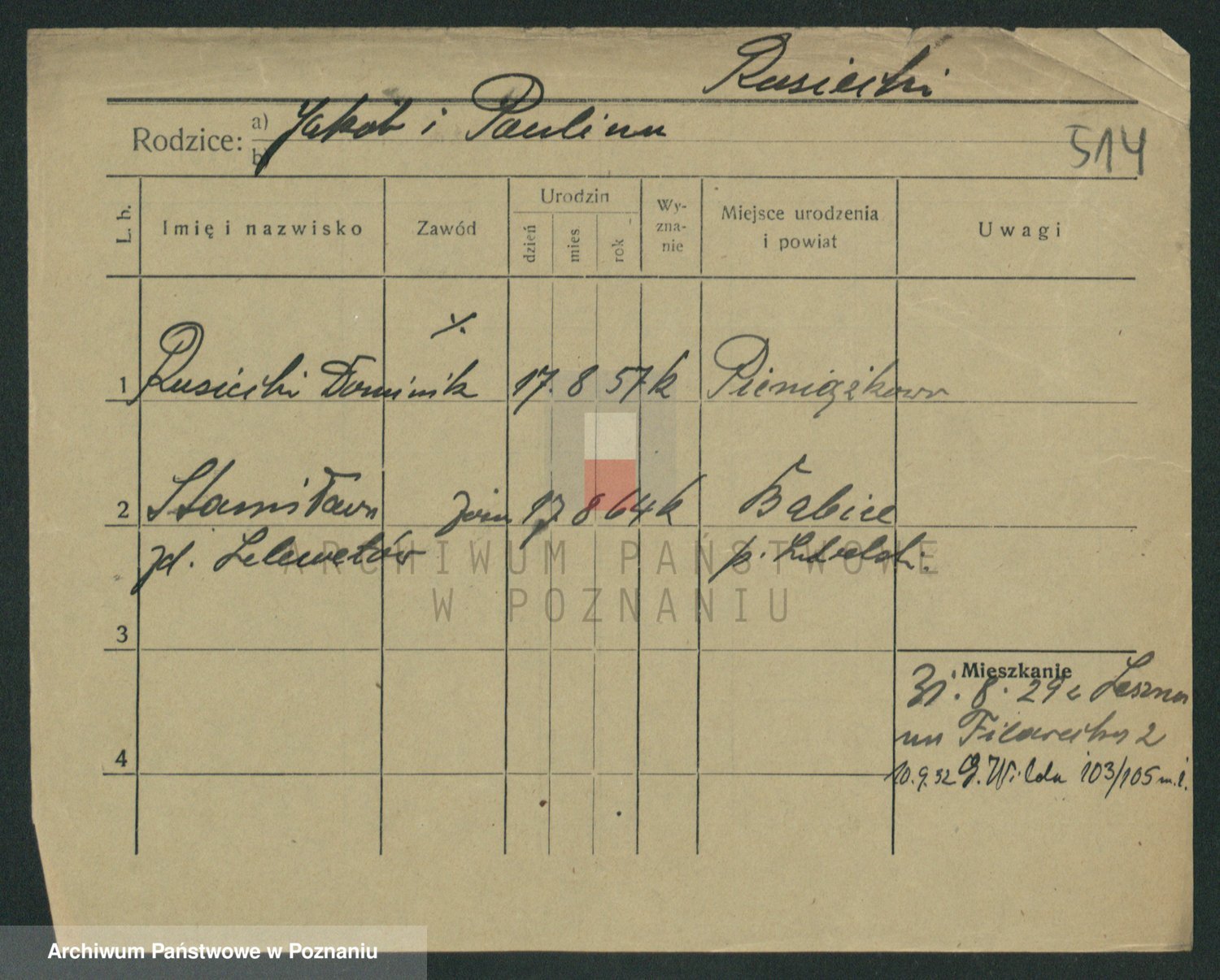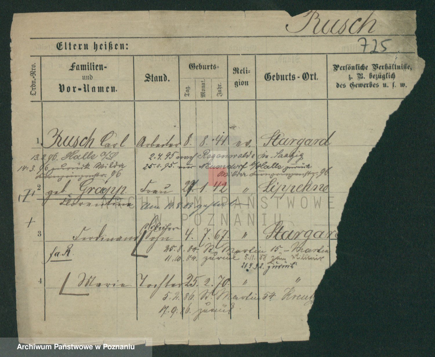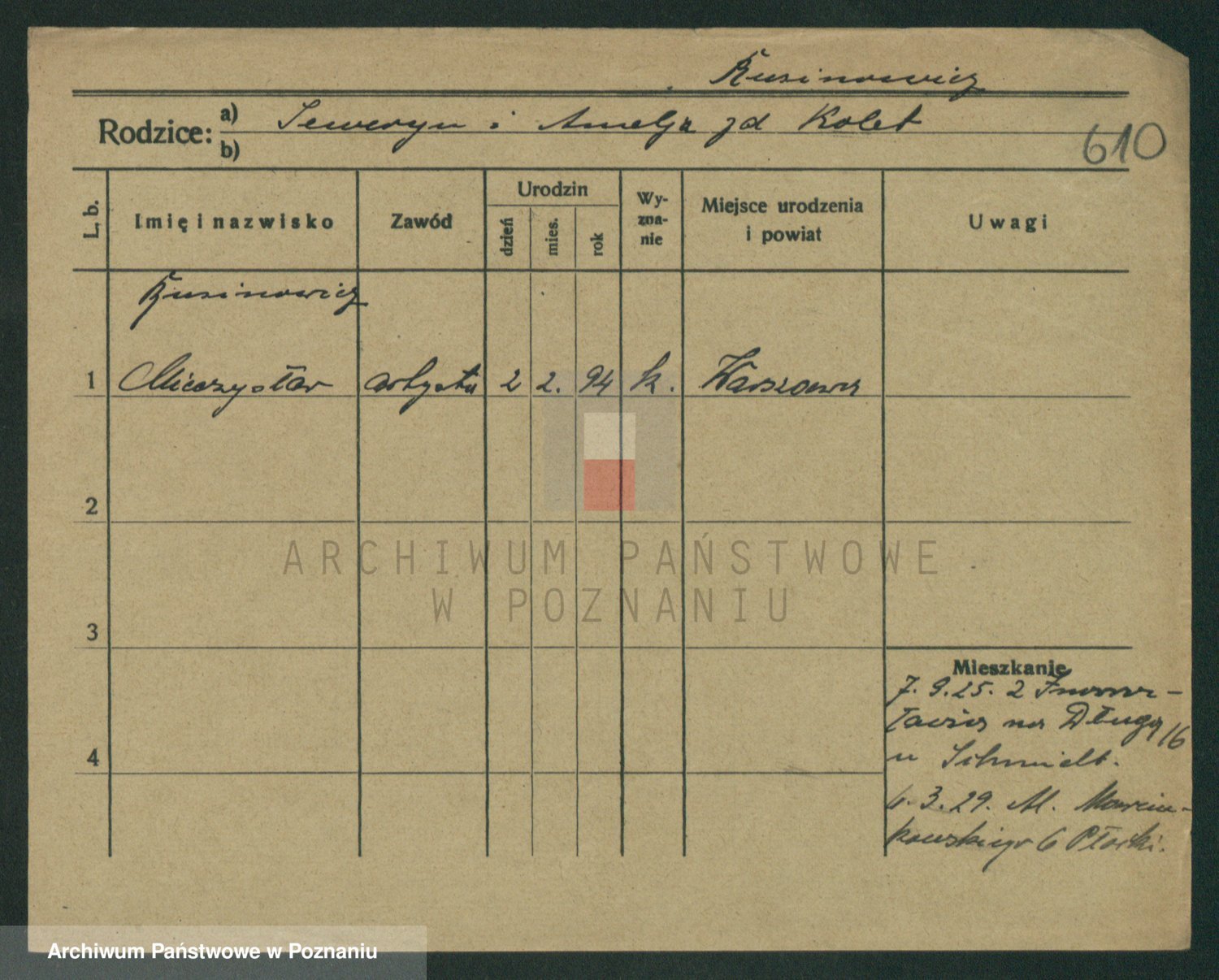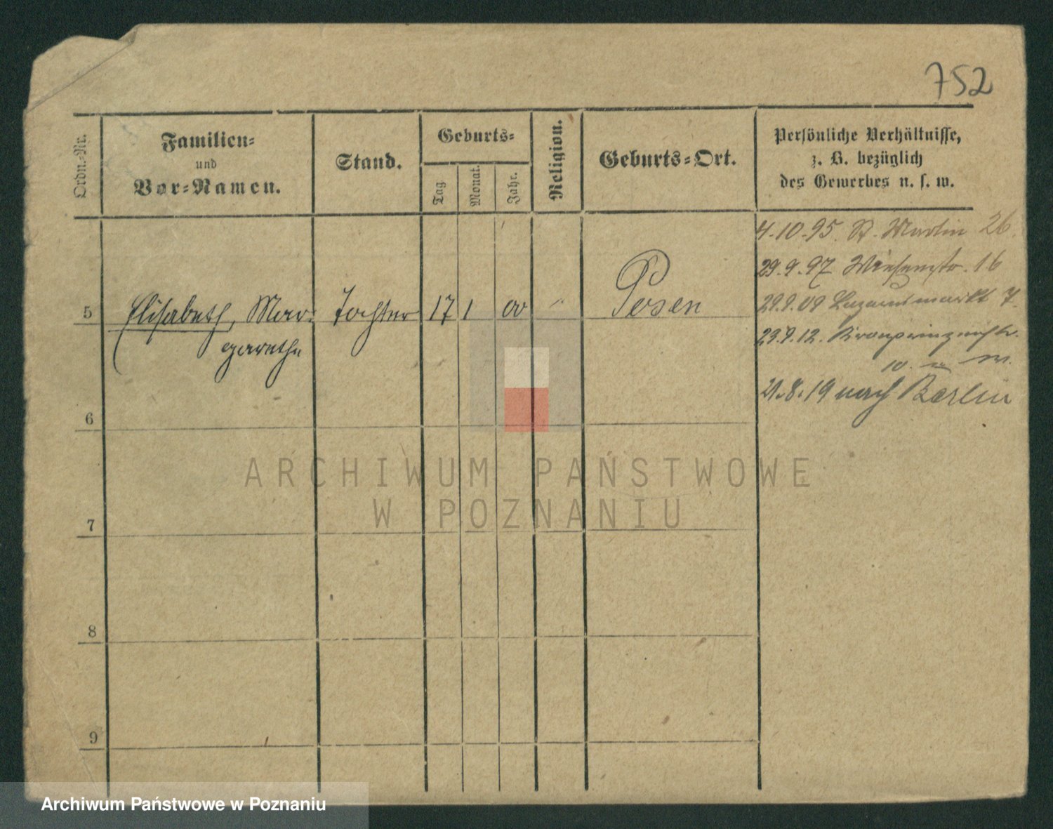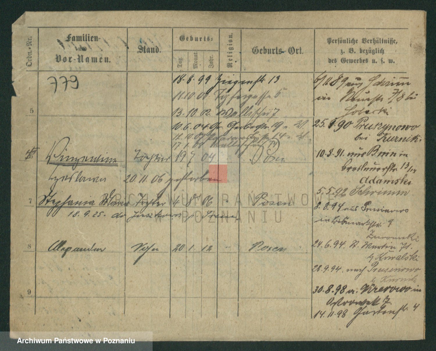 Podgląd karty osobowej dostępny jest po kliknięciu na nazwisko lub ikonkę karty. Można dokonywać powiększenia (ikony na górze) lub przechodzić między kolejnymi skanami (strzałki po bokach).