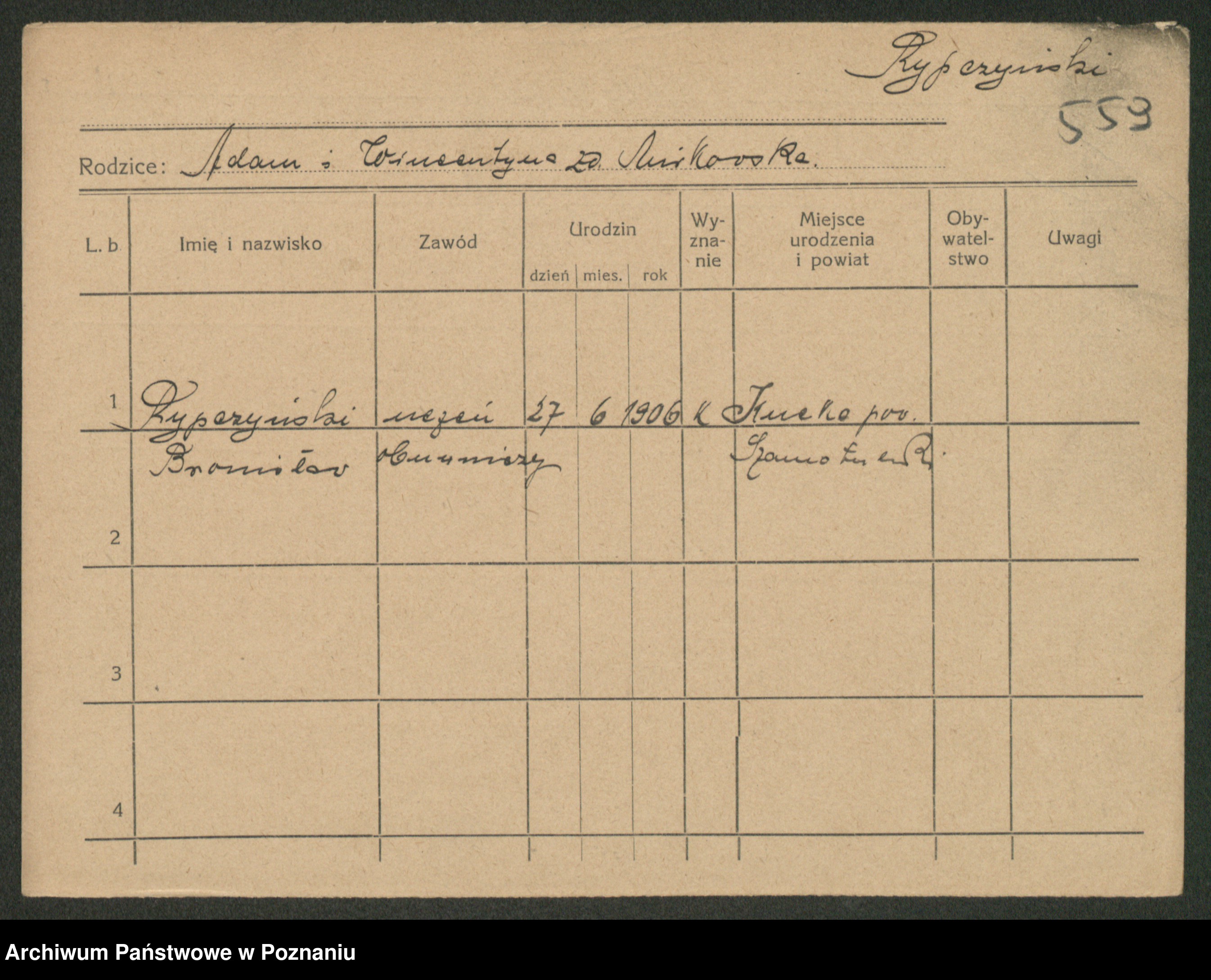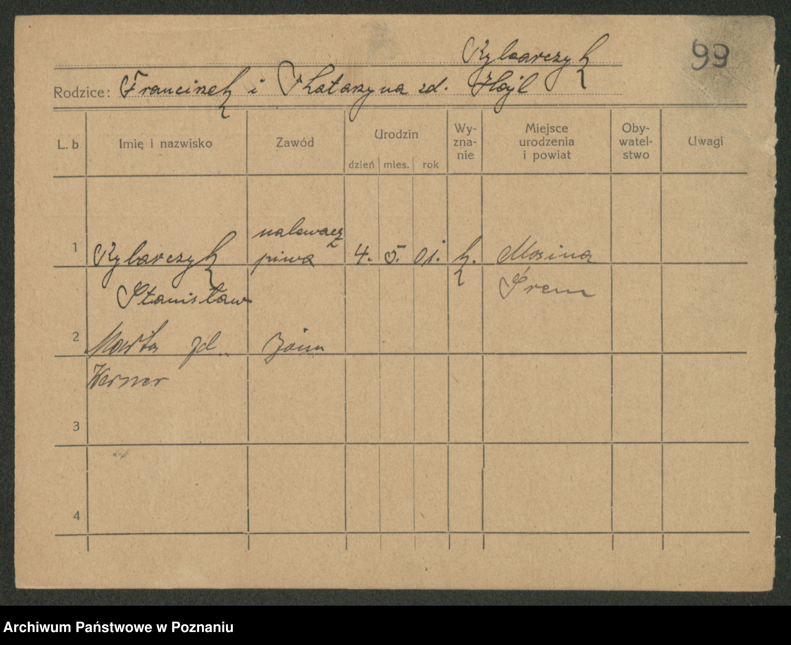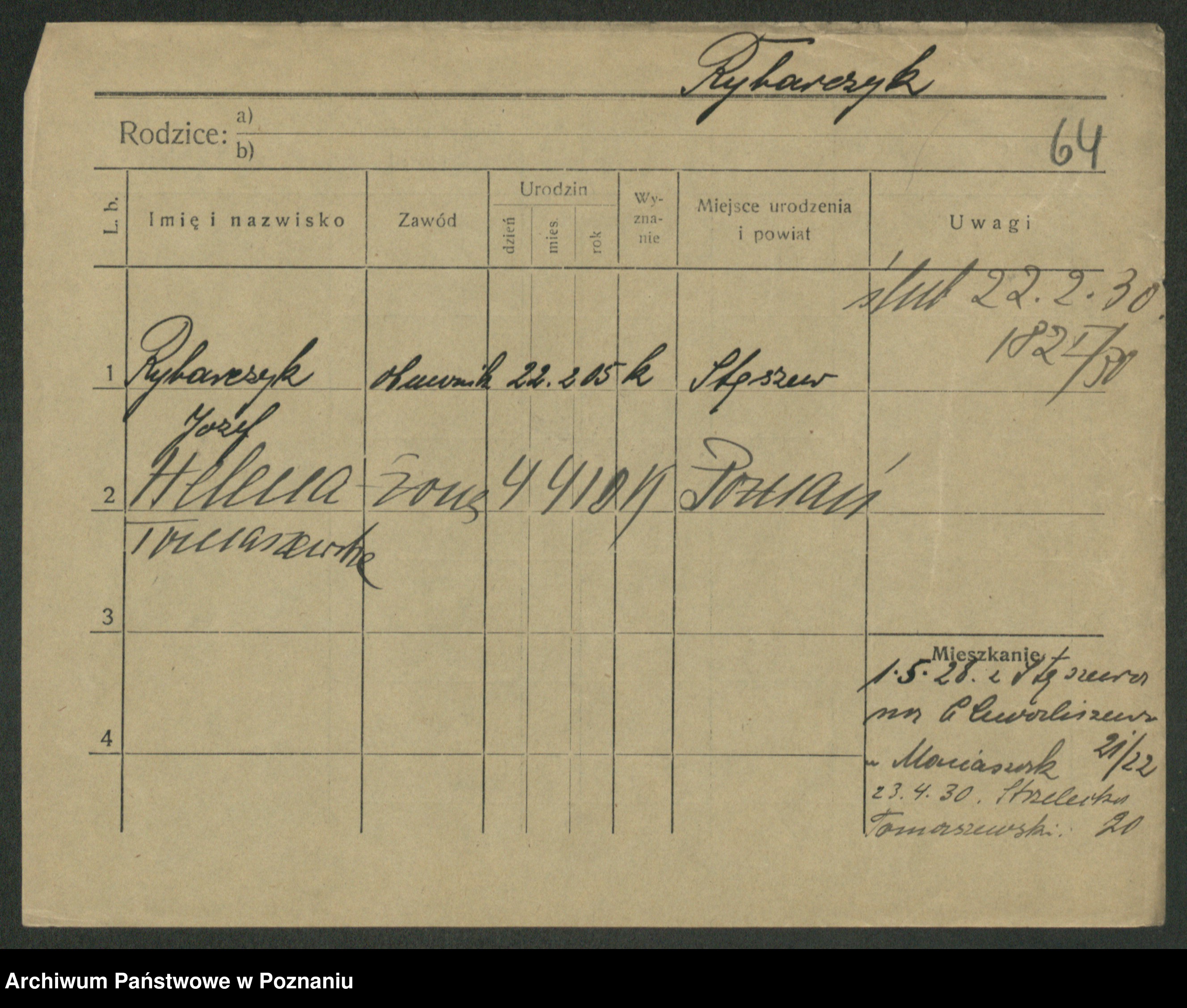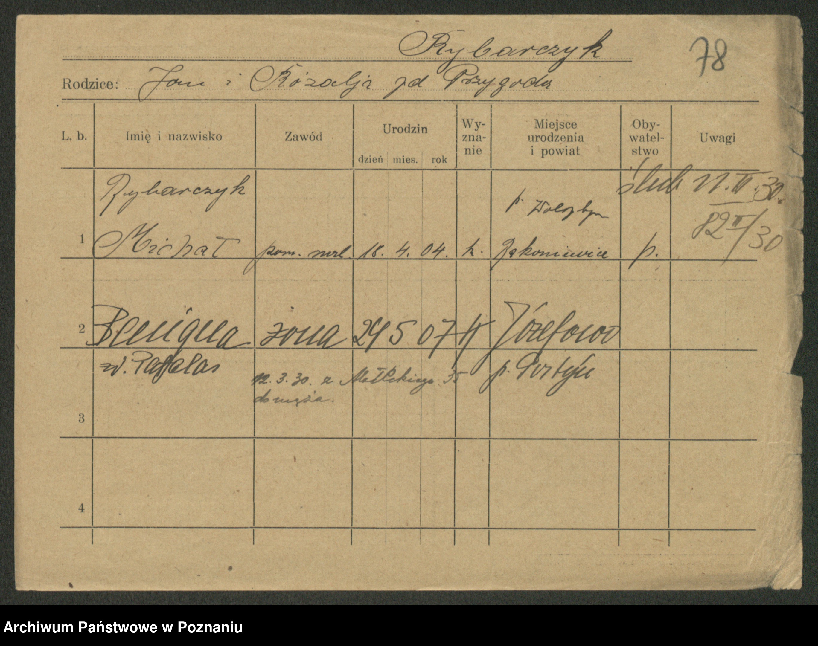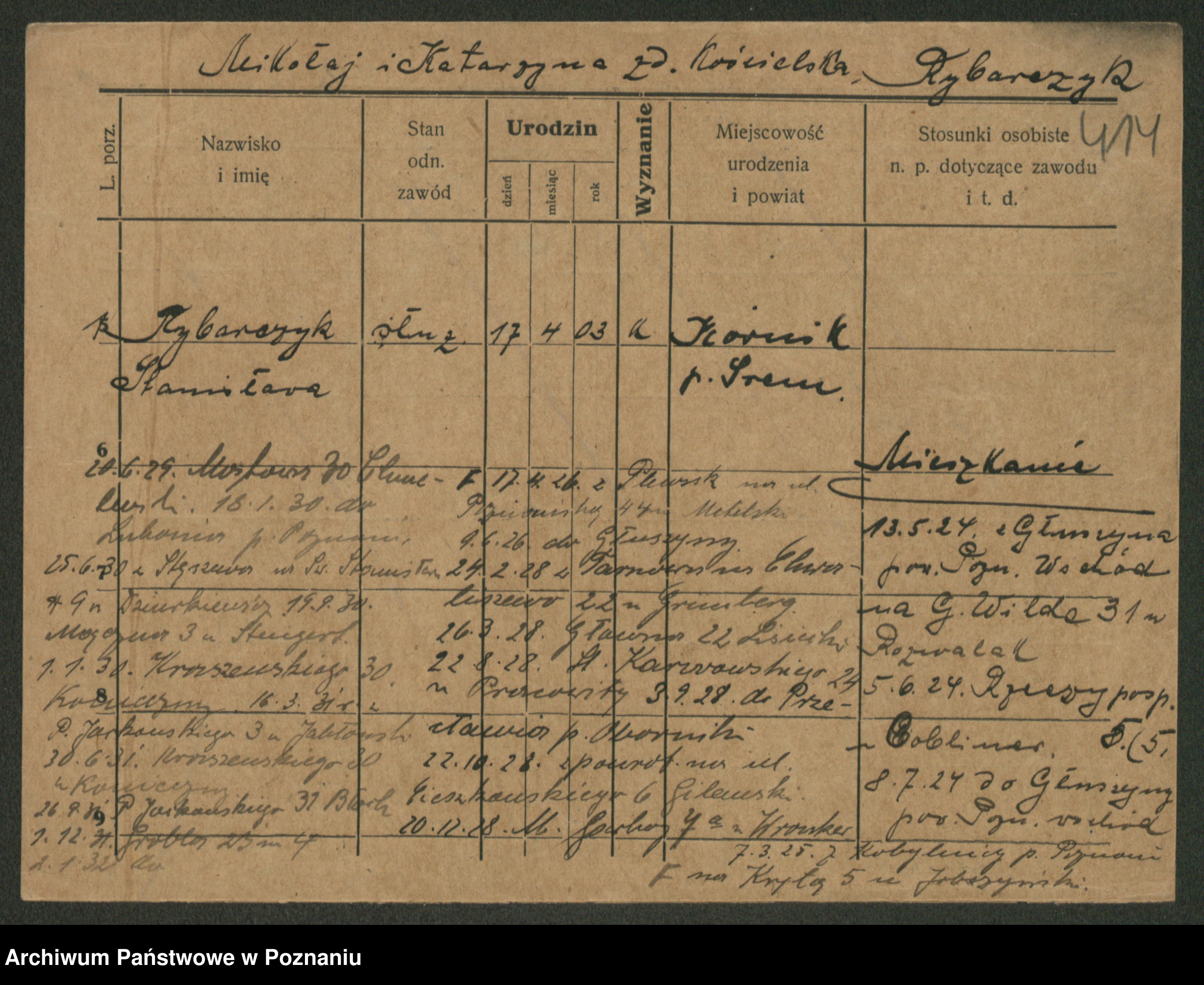 Podgląd karty osobowej dostępny jest po kliknięciu na nazwisko lub ikonkę karty. Można dokonywać powiększenia (ikony na górze) lub przechodzić między kolejnymi skanami (strzałki po bokach).