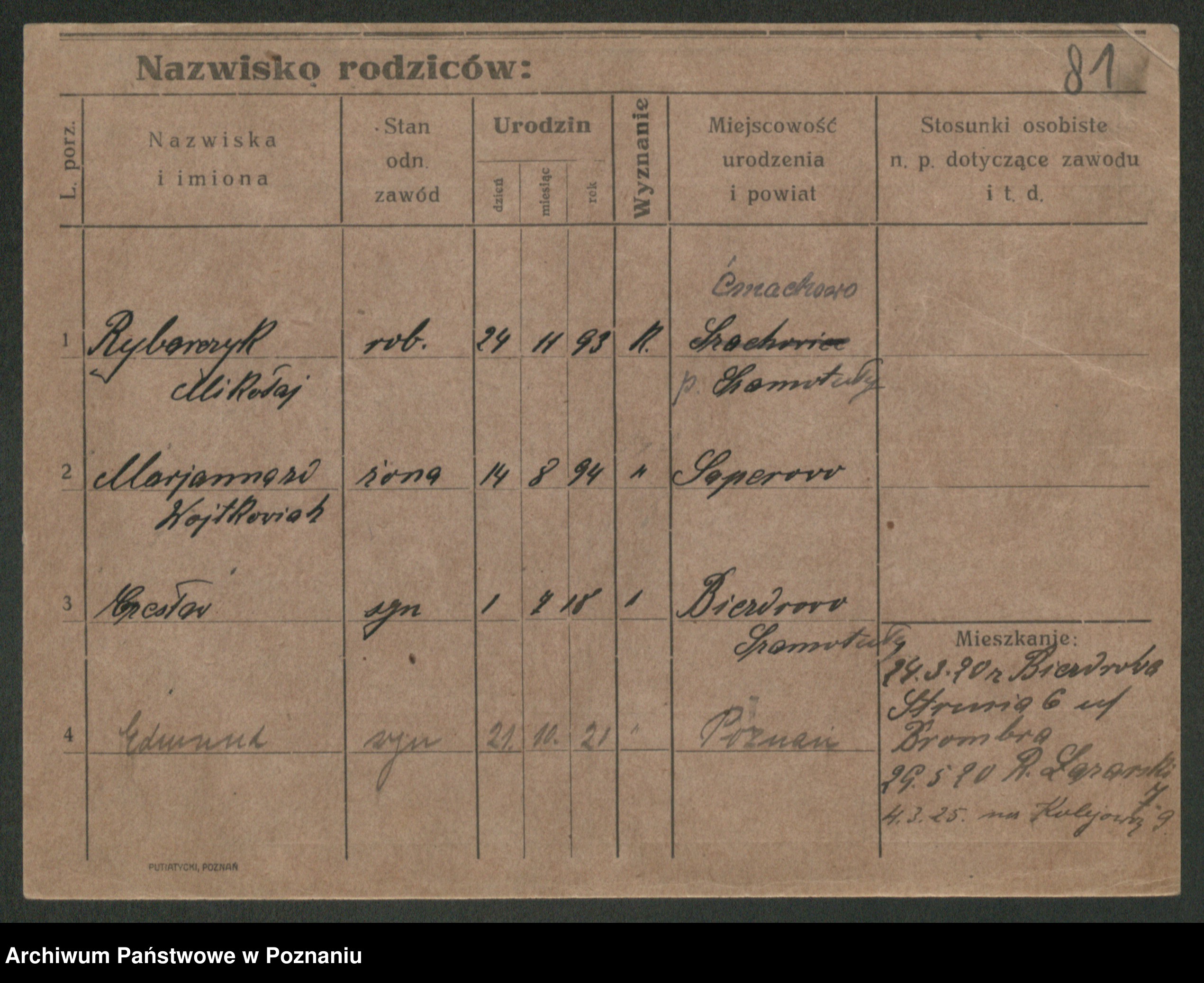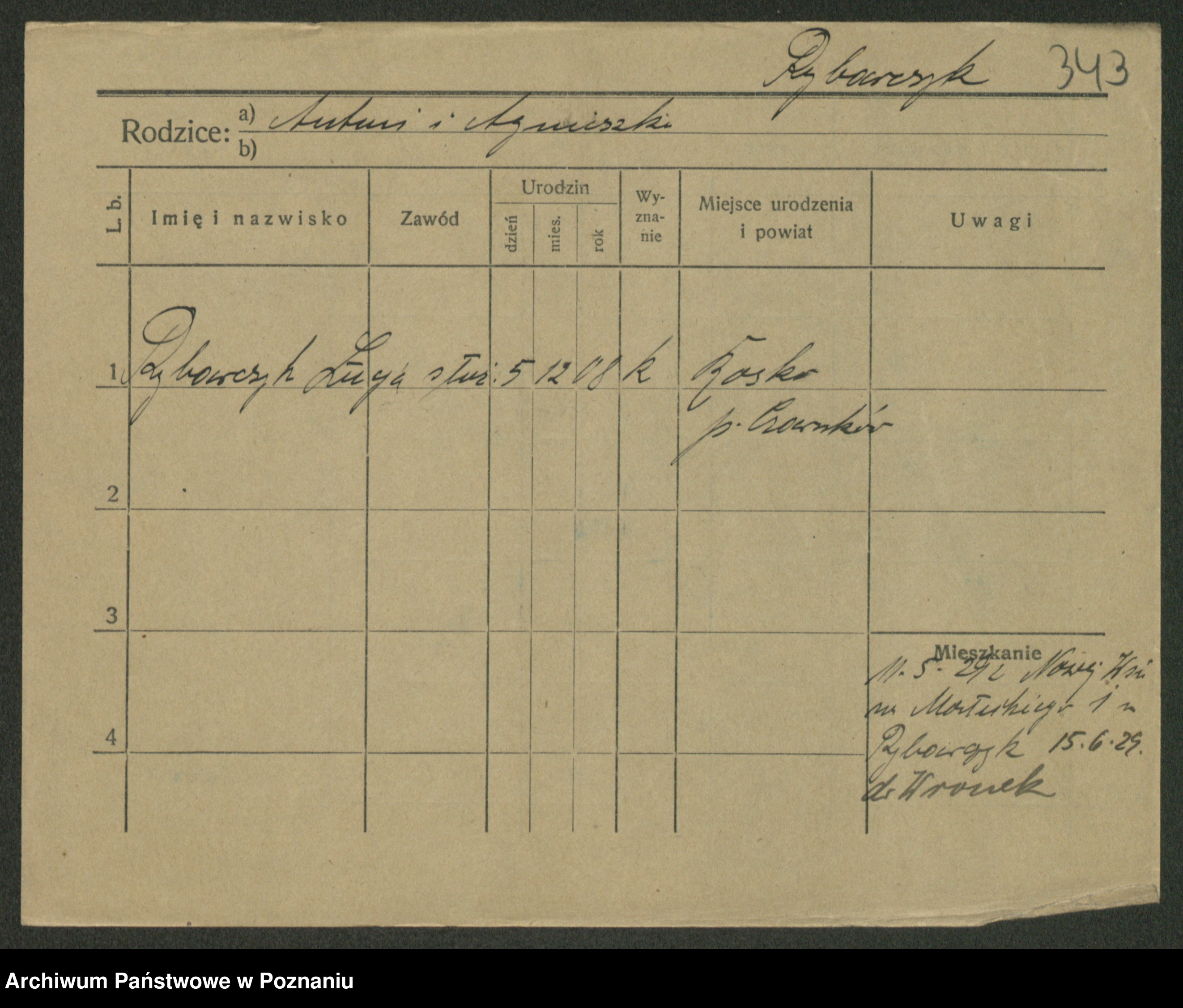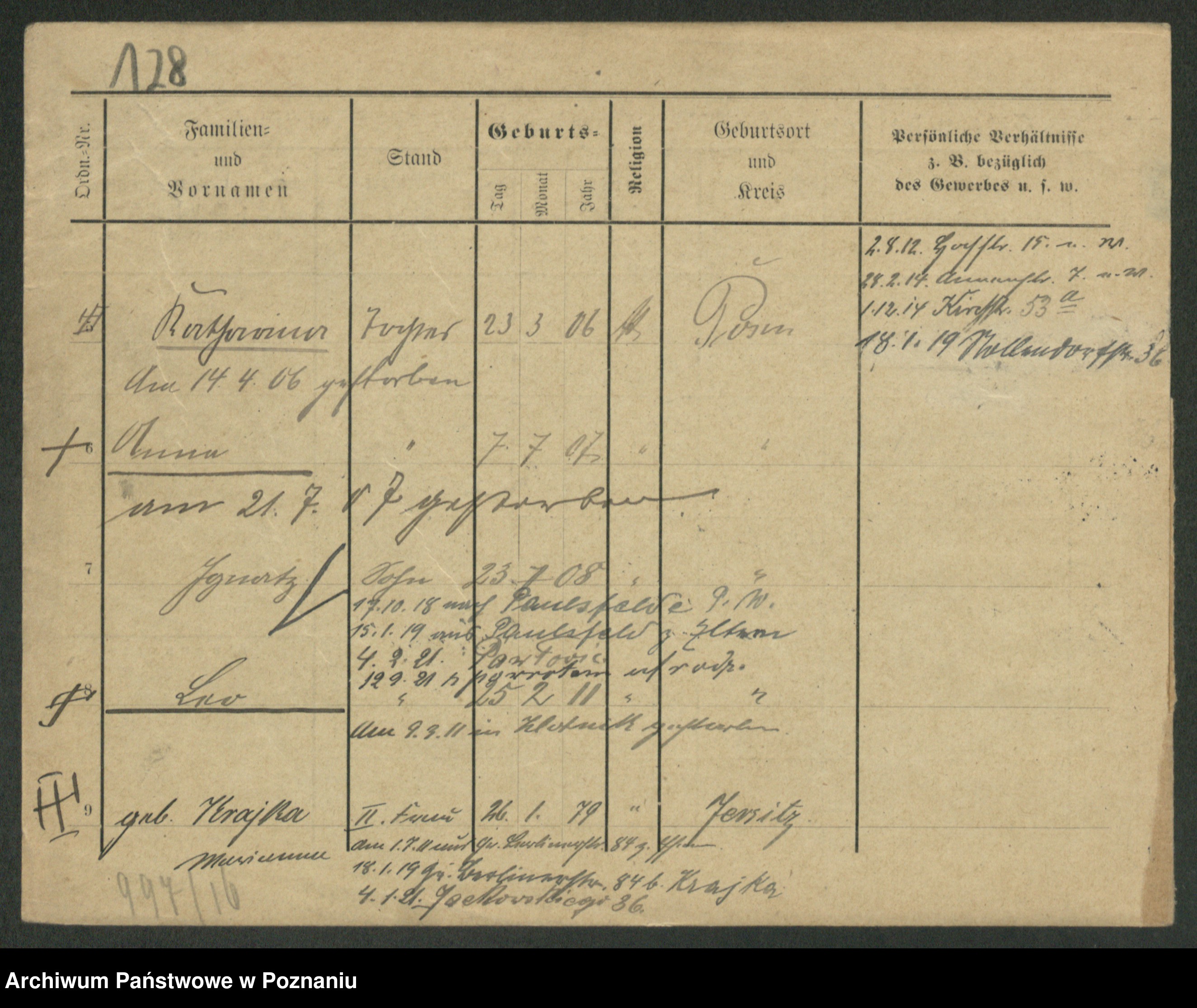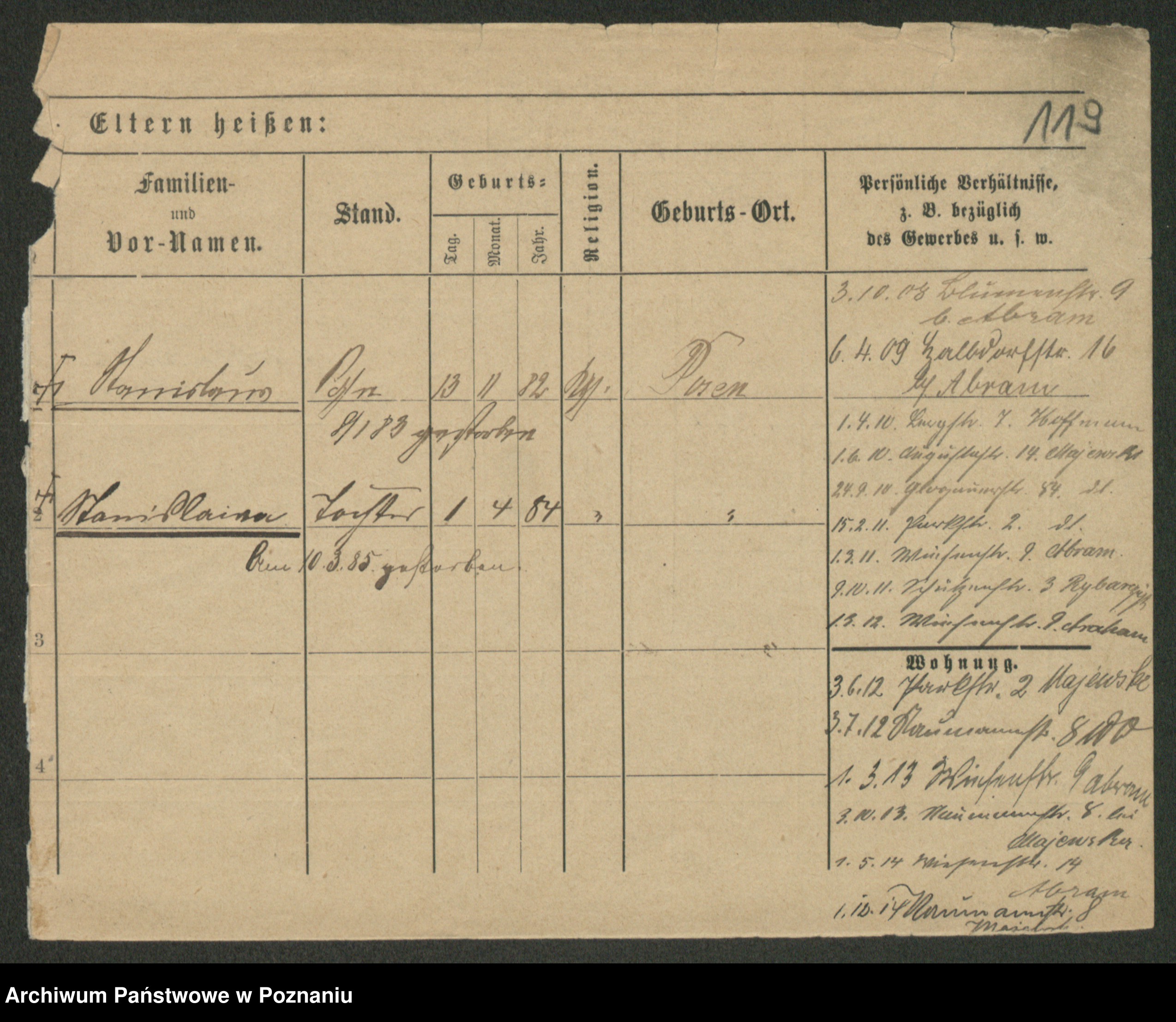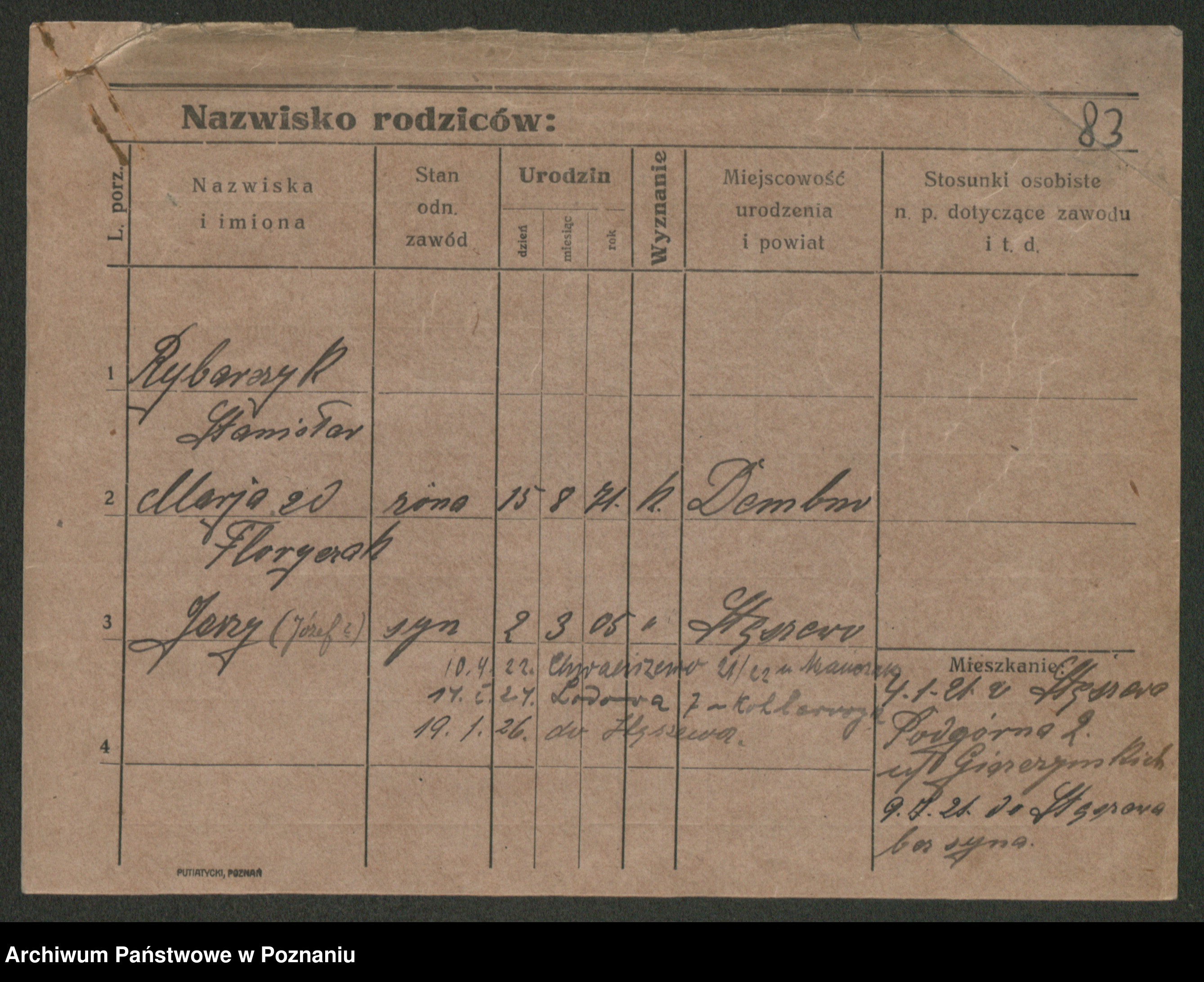Podgląd karty osobowej dostępny jest po kliknięciu na nazwisko lub ikonkę karty. Można dokonywać powiększenia (ikony na górze) lub przechodzić między kolejnymi skanami (strzałki po bokach).