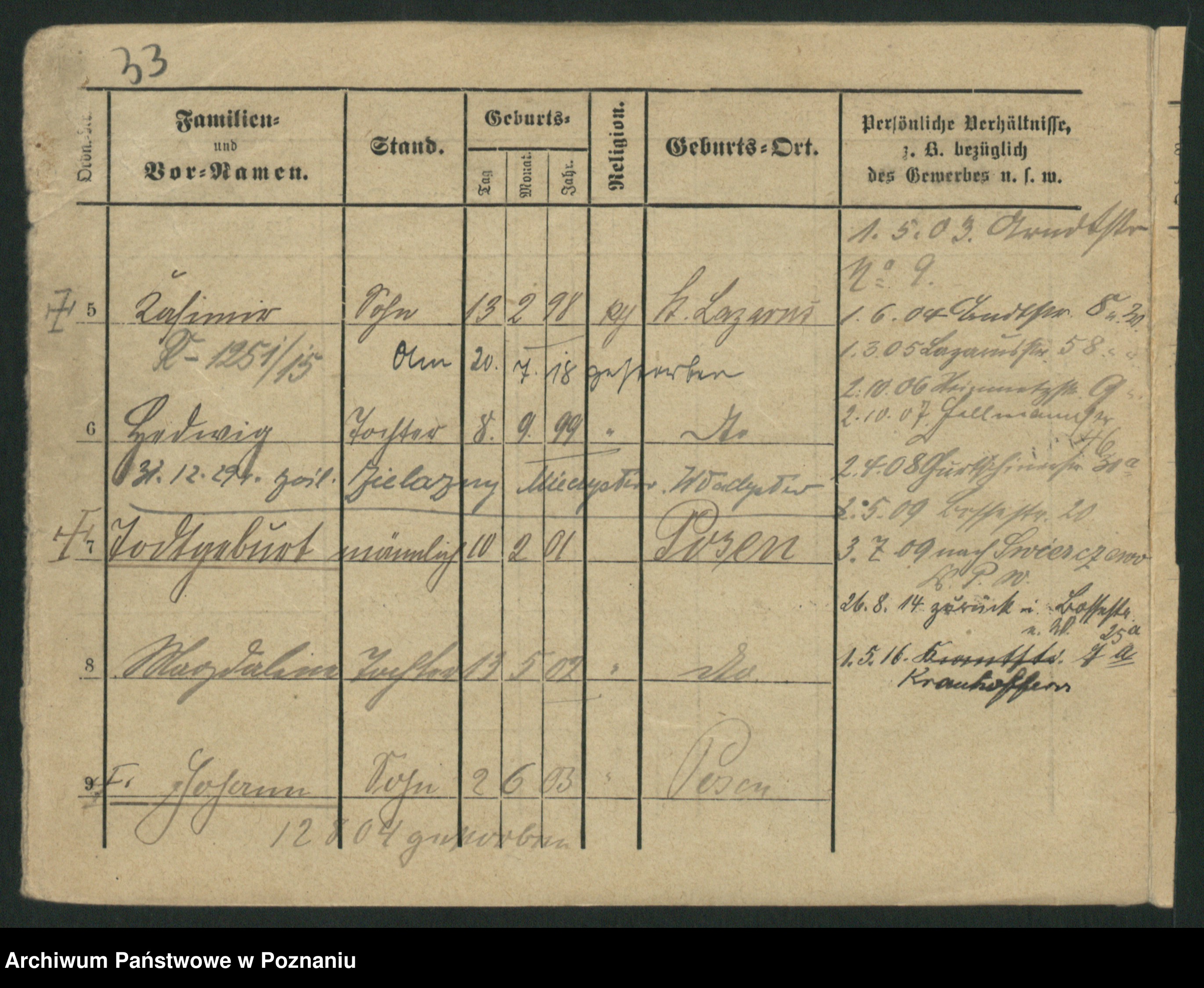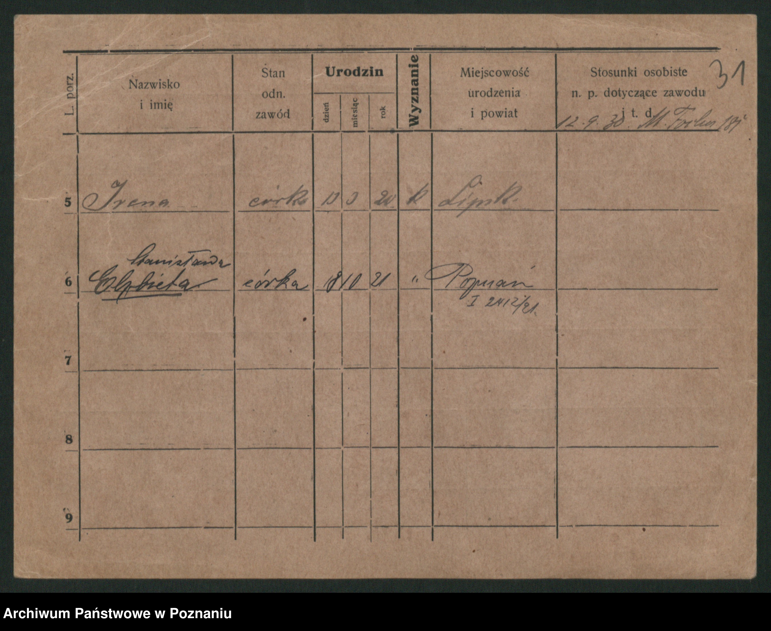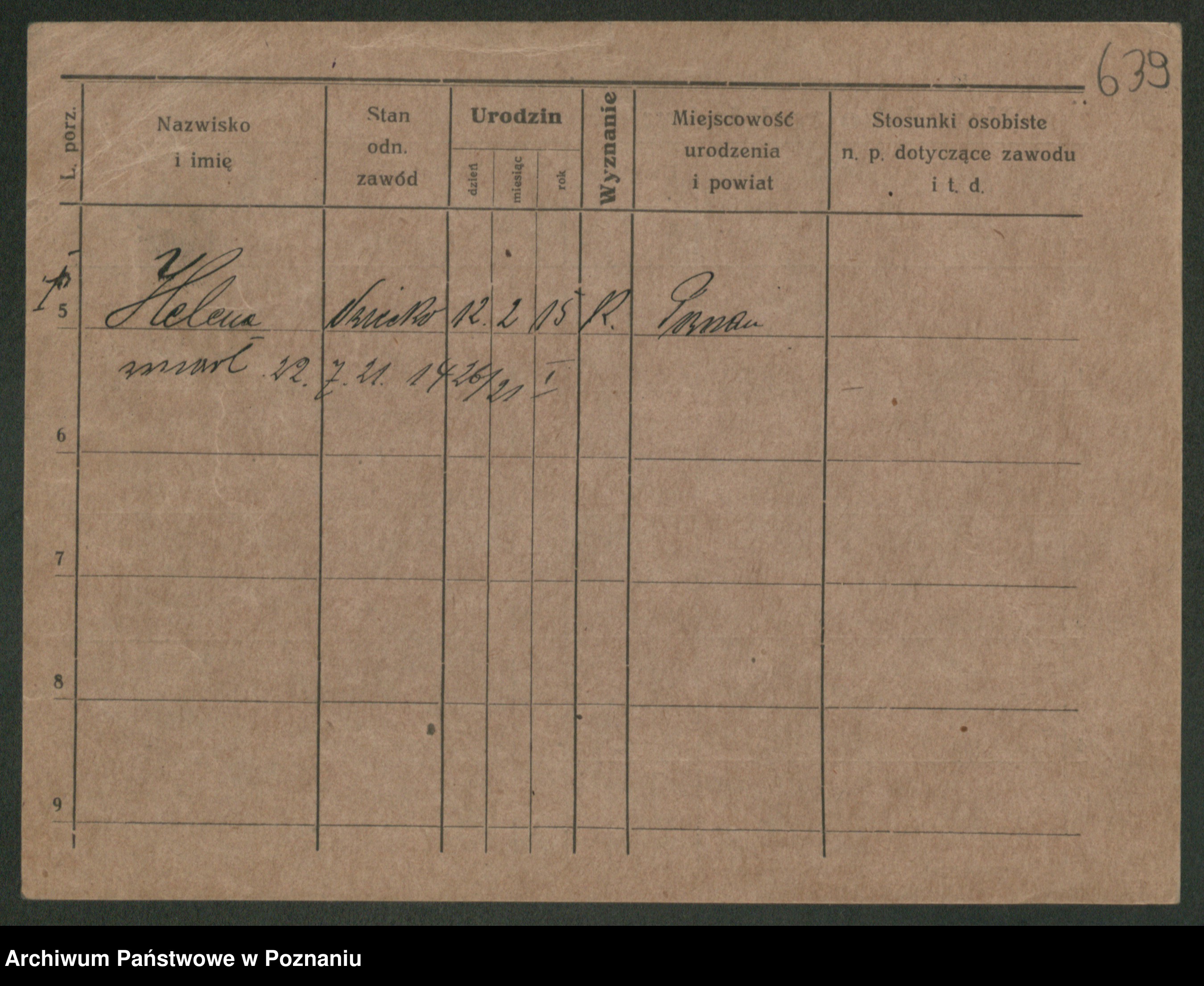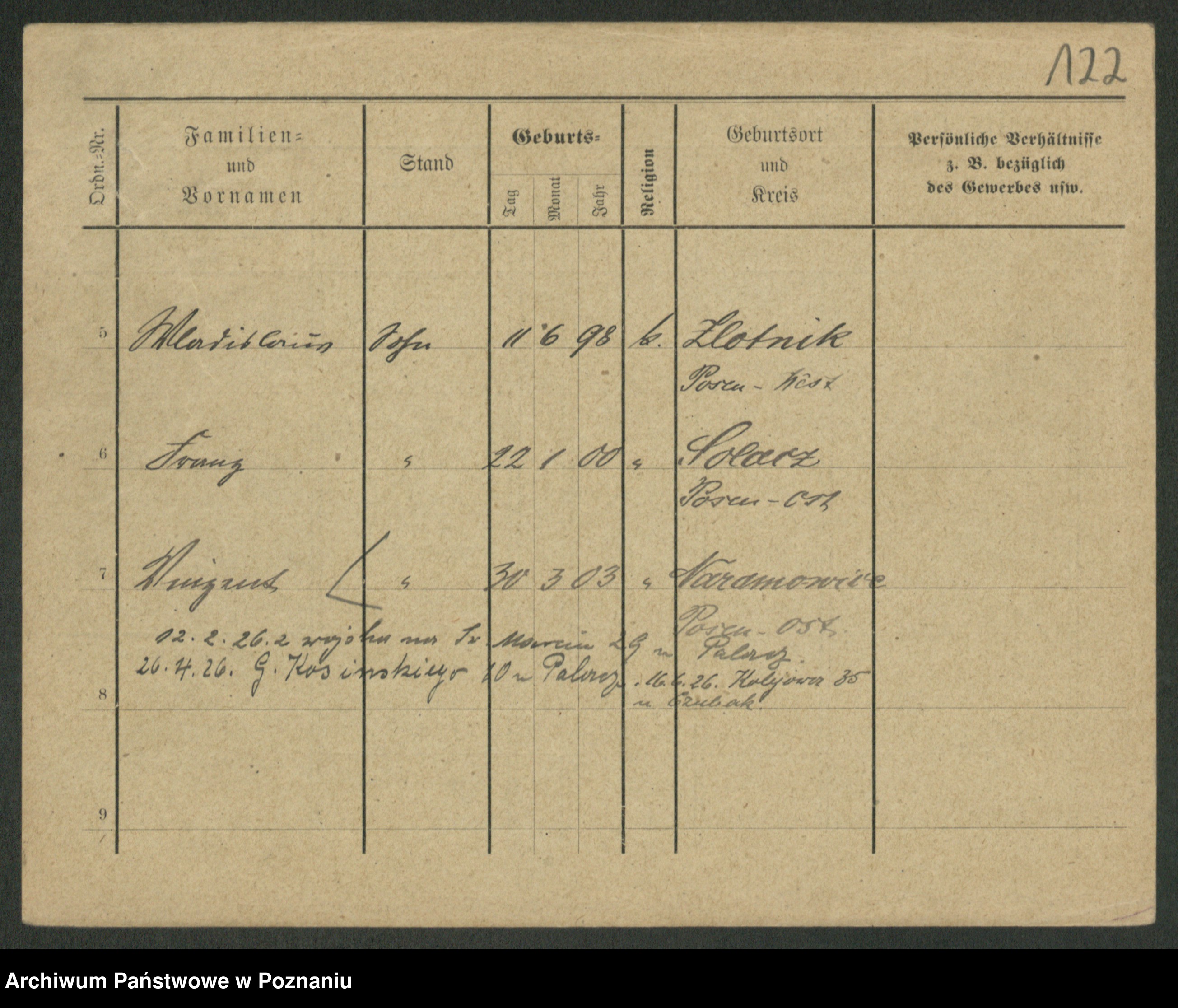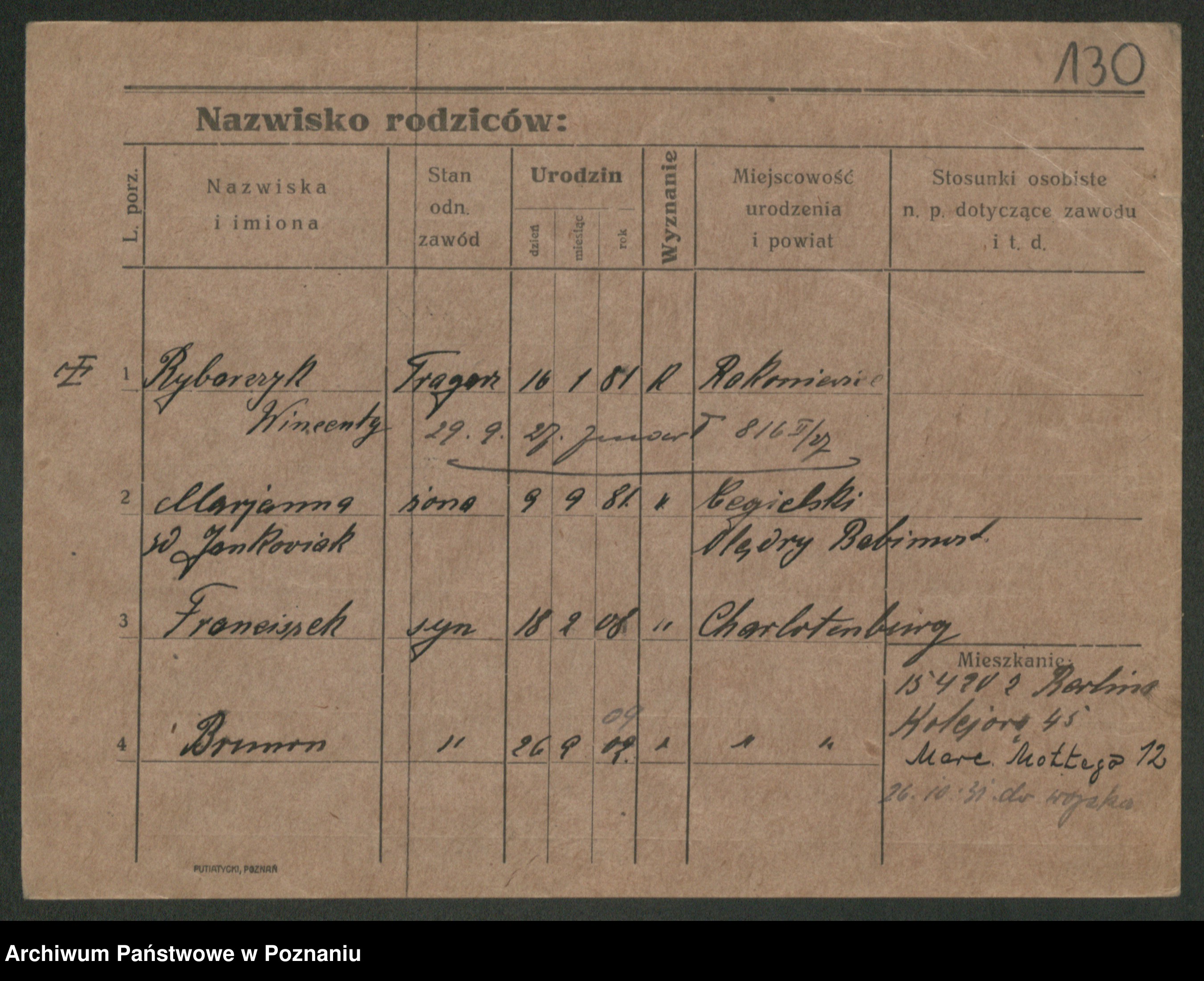 Podgląd karty osobowej dostępny jest po kliknięciu na nazwisko lub ikonkę karty. Można dokonywać powiększenia (ikony na górze) lub przechodzić między kolejnymi skanami (strzałki po bokach).