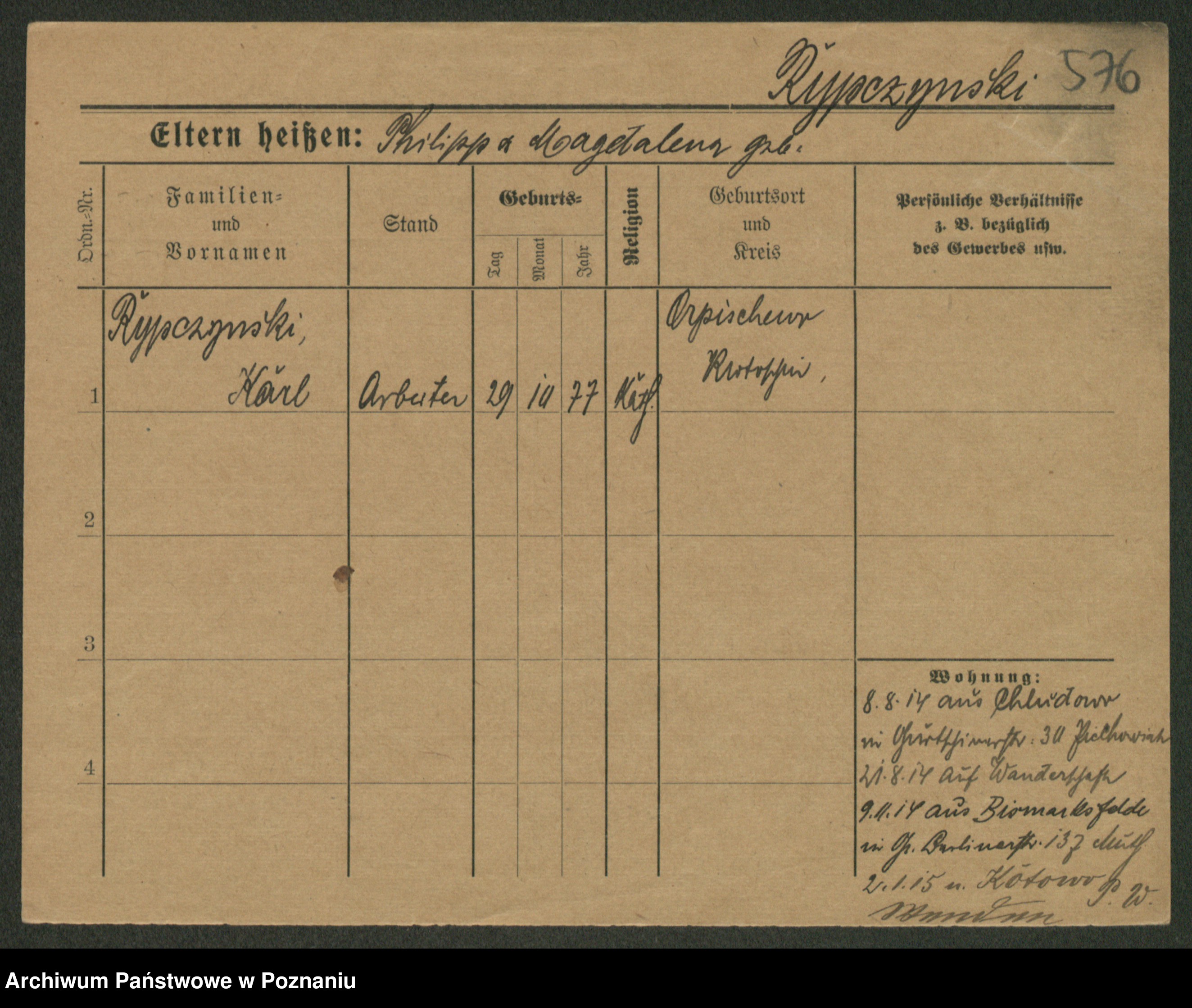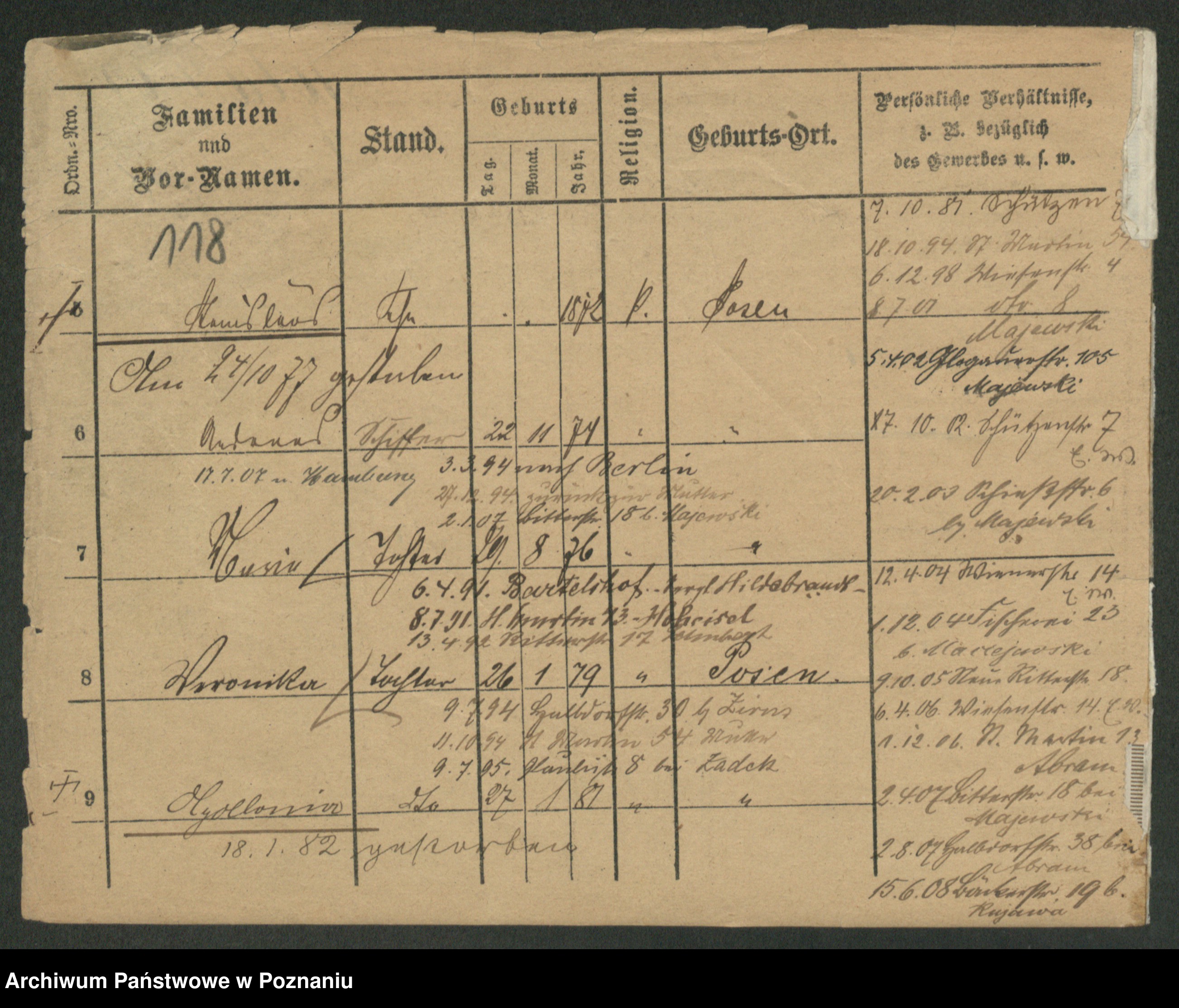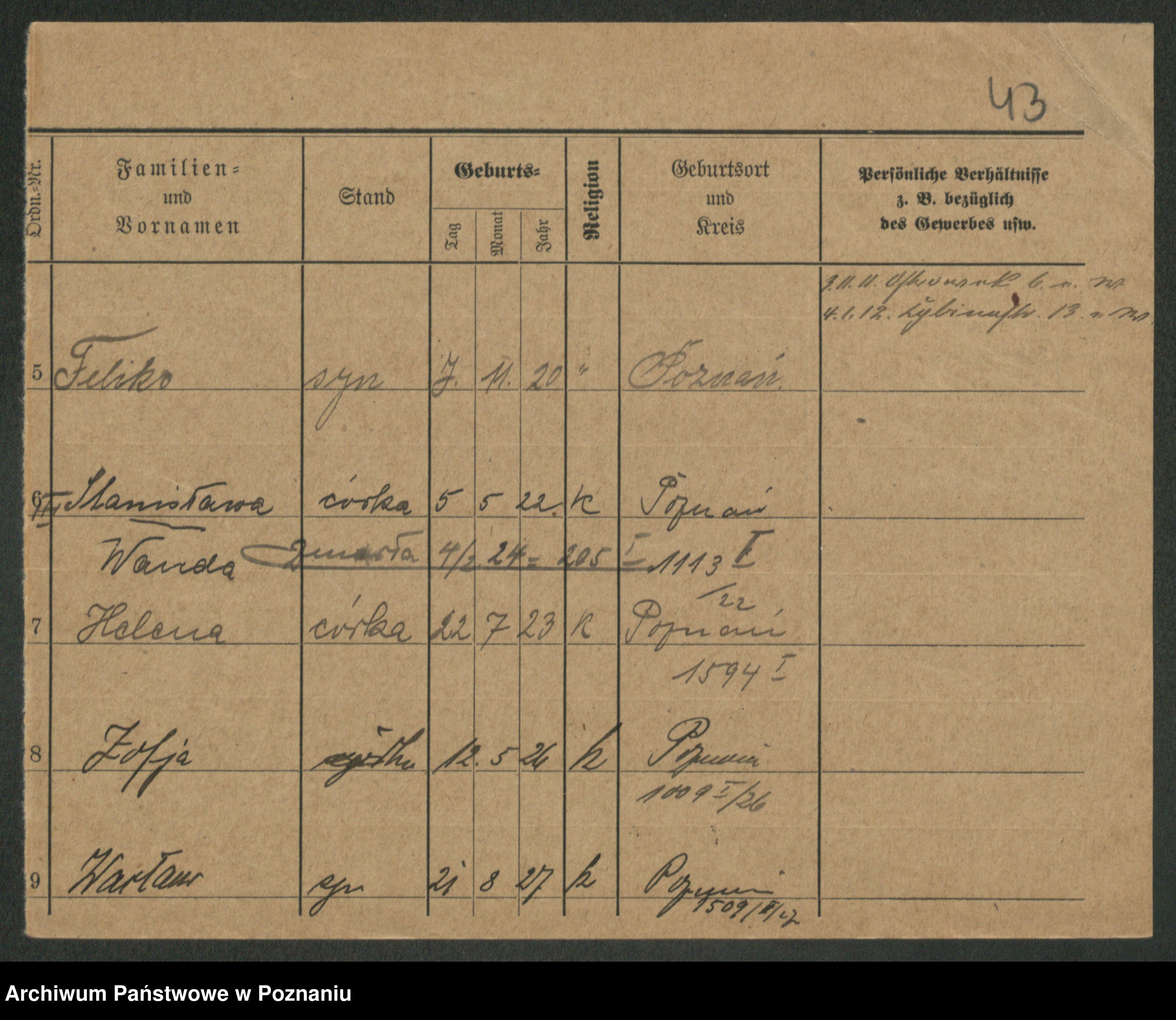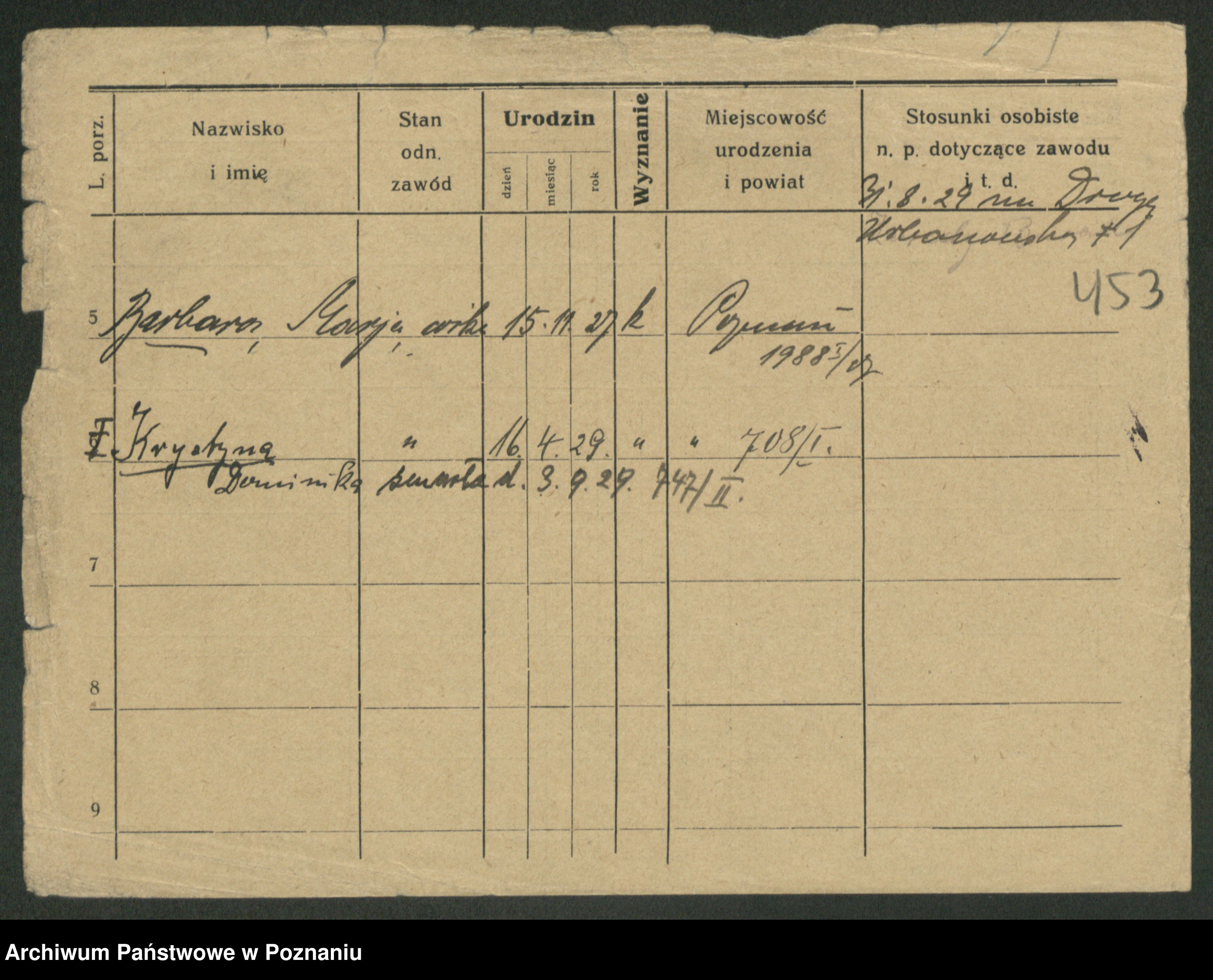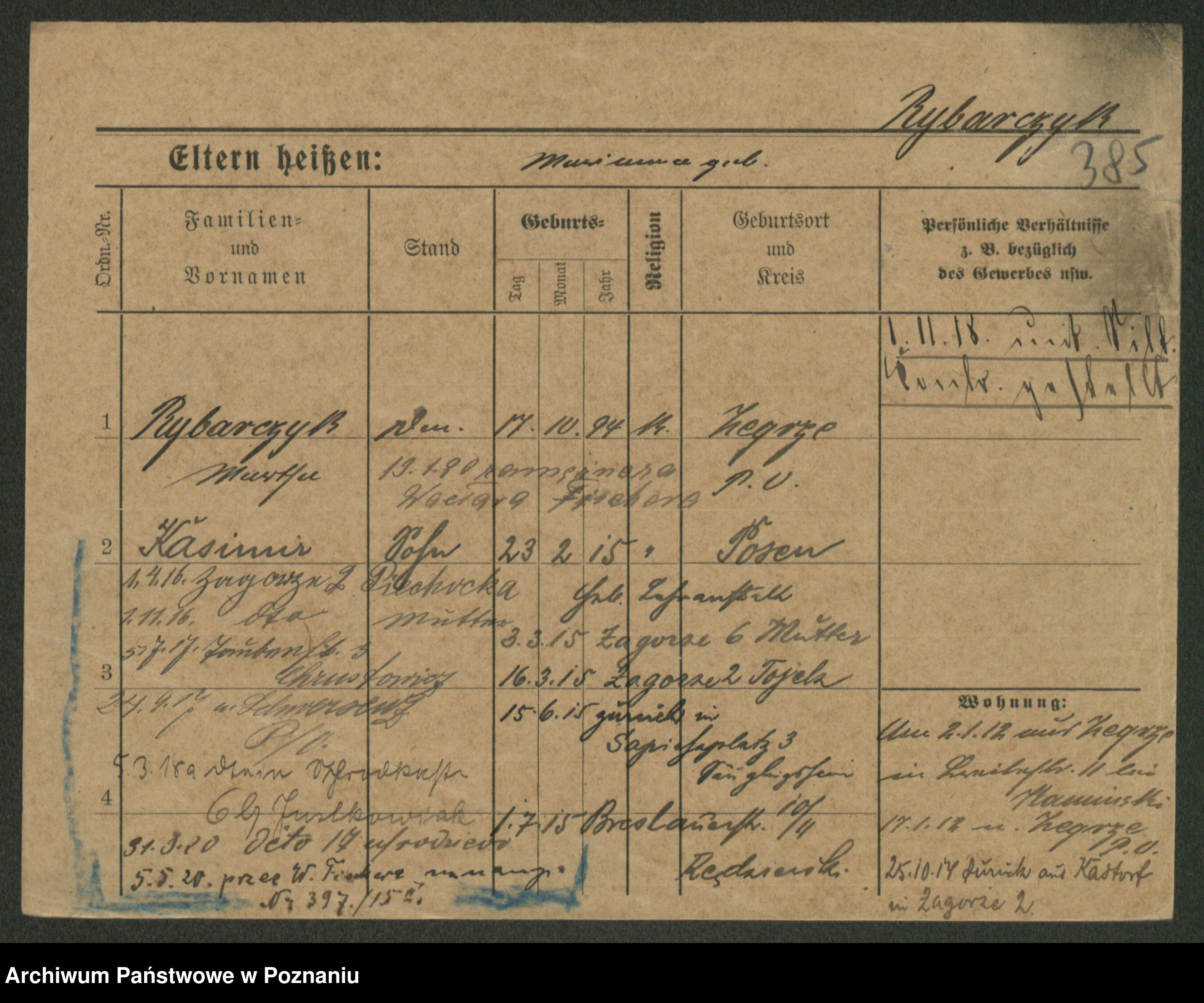 Podgląd karty osobowej dostępny jest po kliknięciu na nazwisko lub ikonkę karty. Można dokonywać powiększenia (ikony na górze) lub przechodzić między kolejnymi skanami (strzałki po bokach).