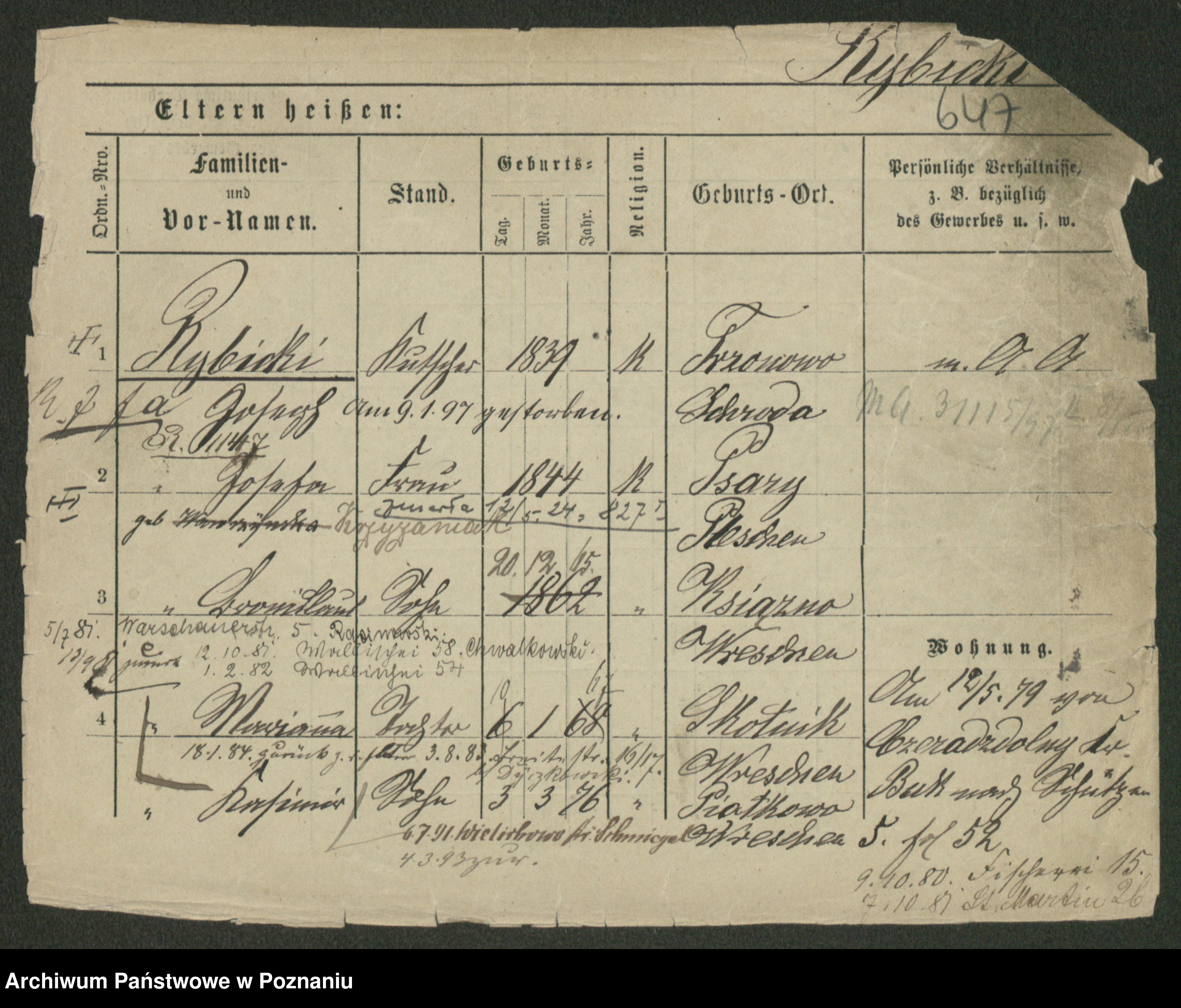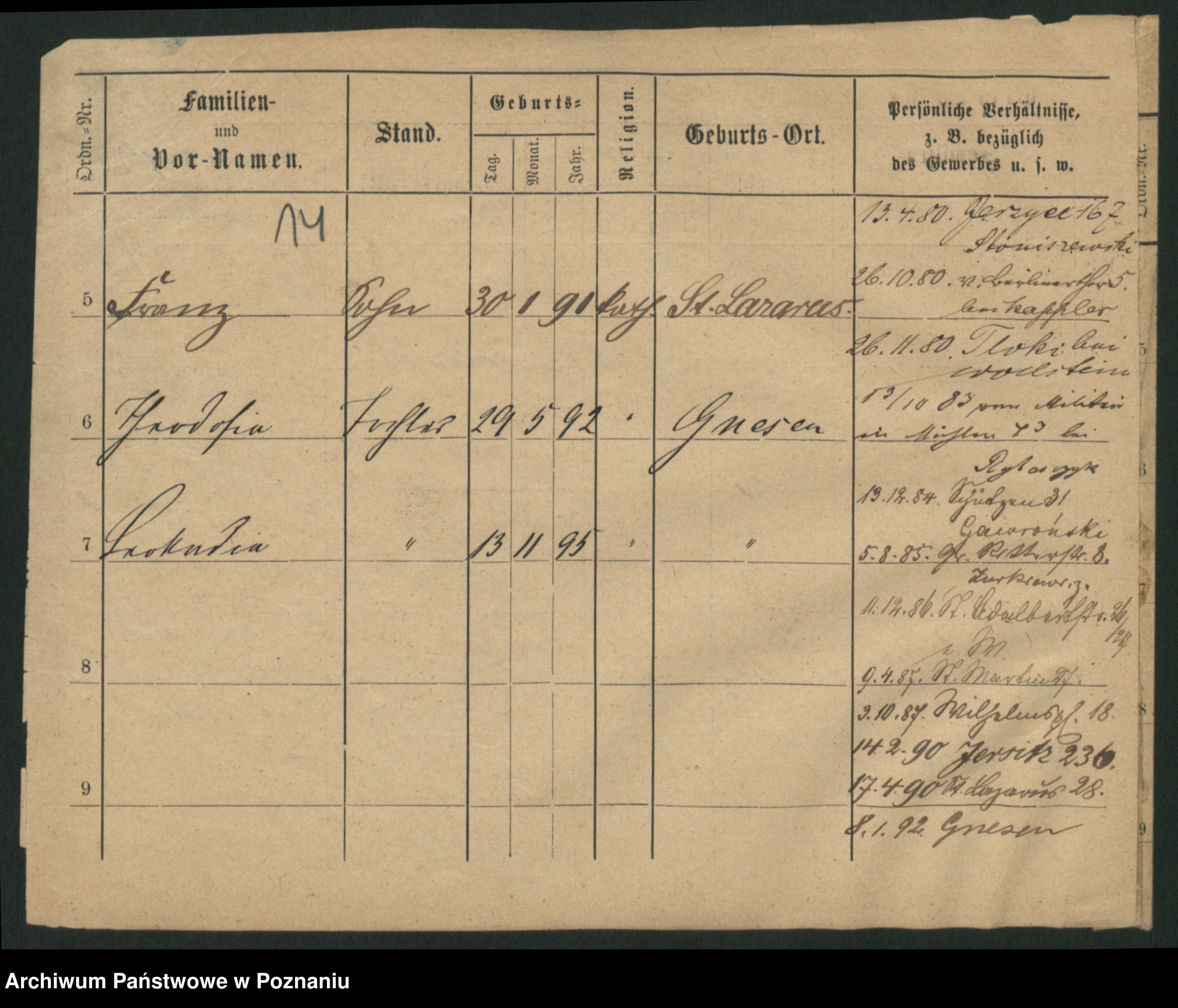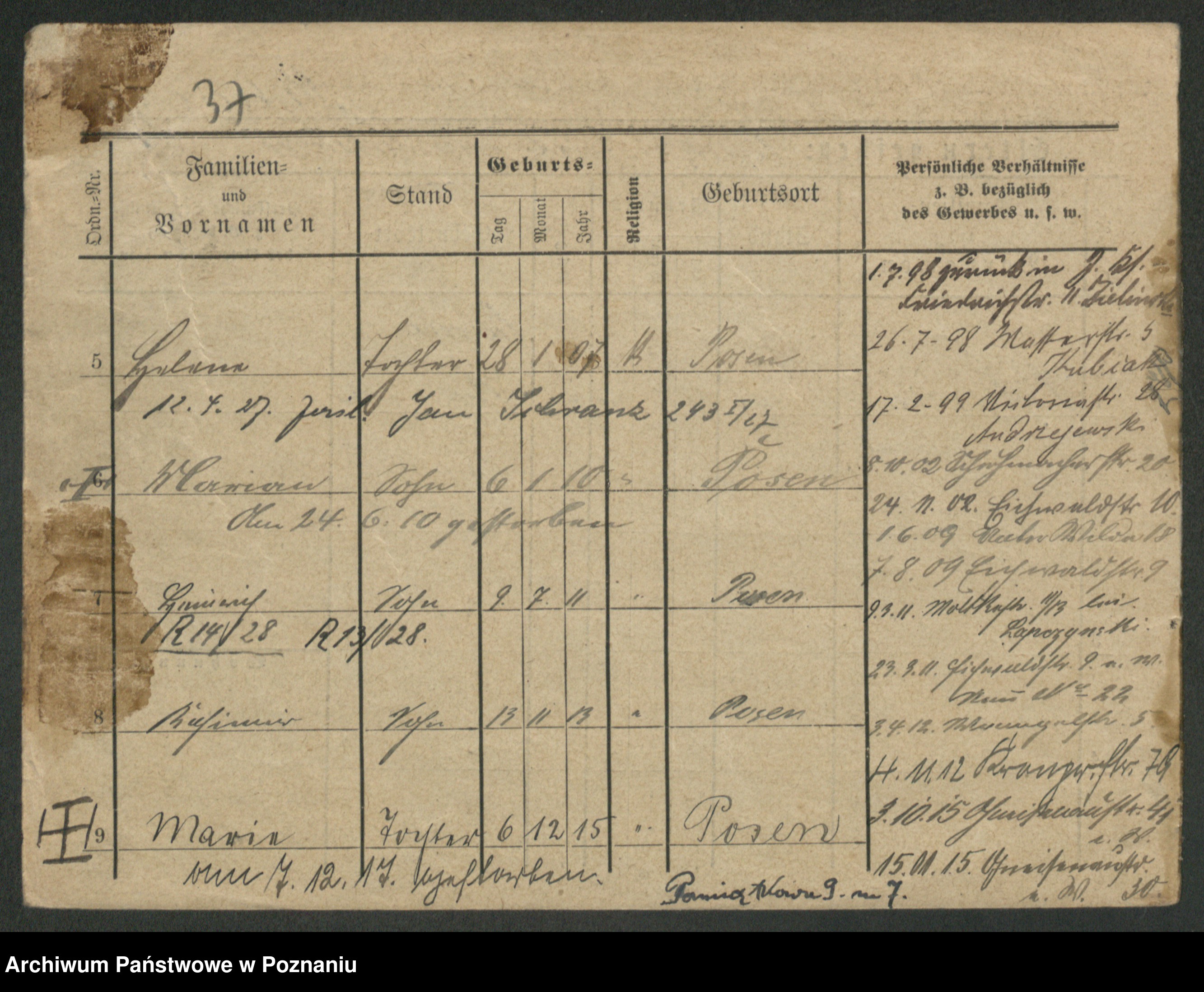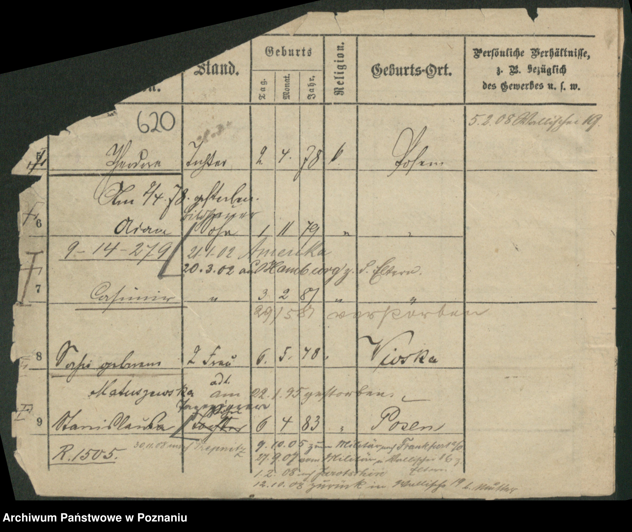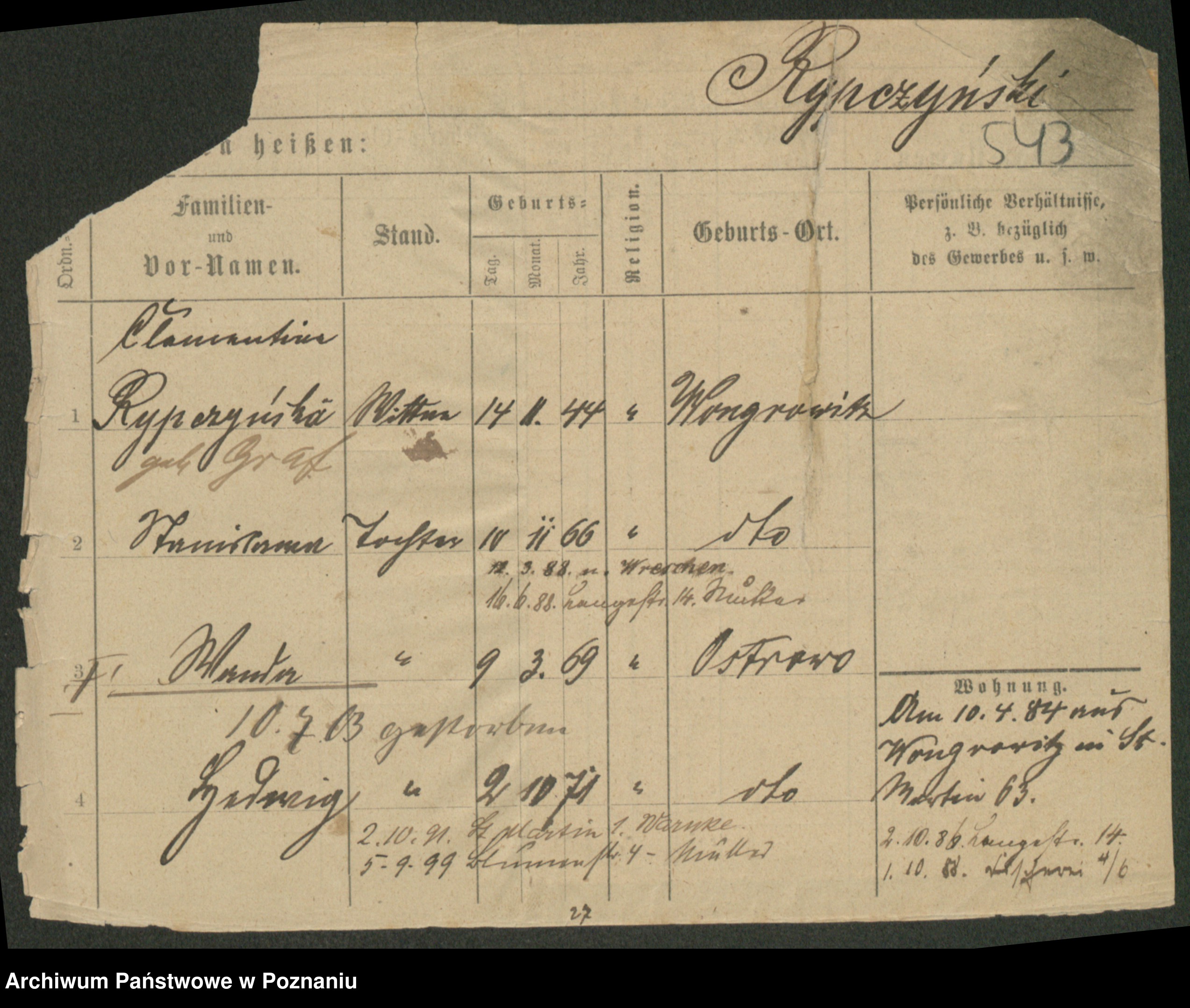 Podgląd karty osobowej dostępny jest po kliknięciu na nazwisko lub ikonkę karty. Można dokonywać powiększenia (ikony na górze) lub przechodzić między kolejnymi skanami (strzałki po bokach).