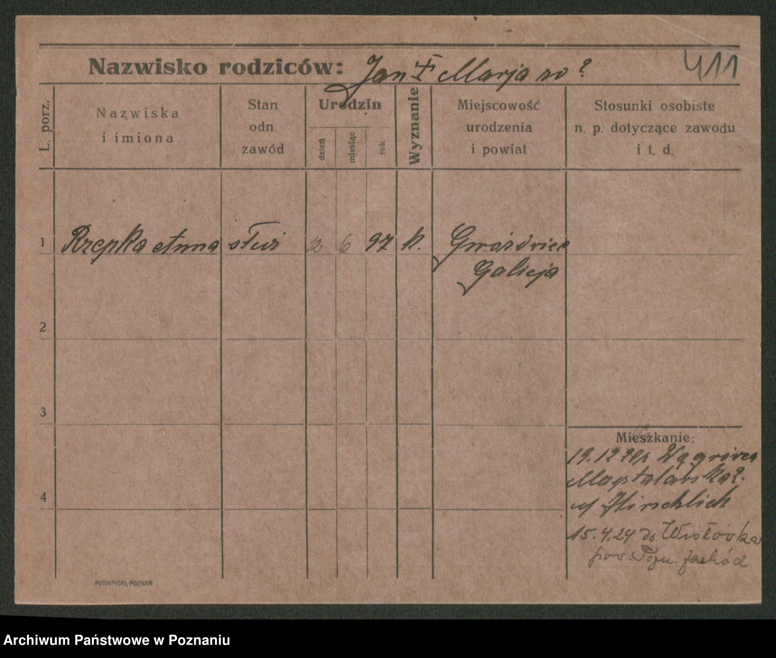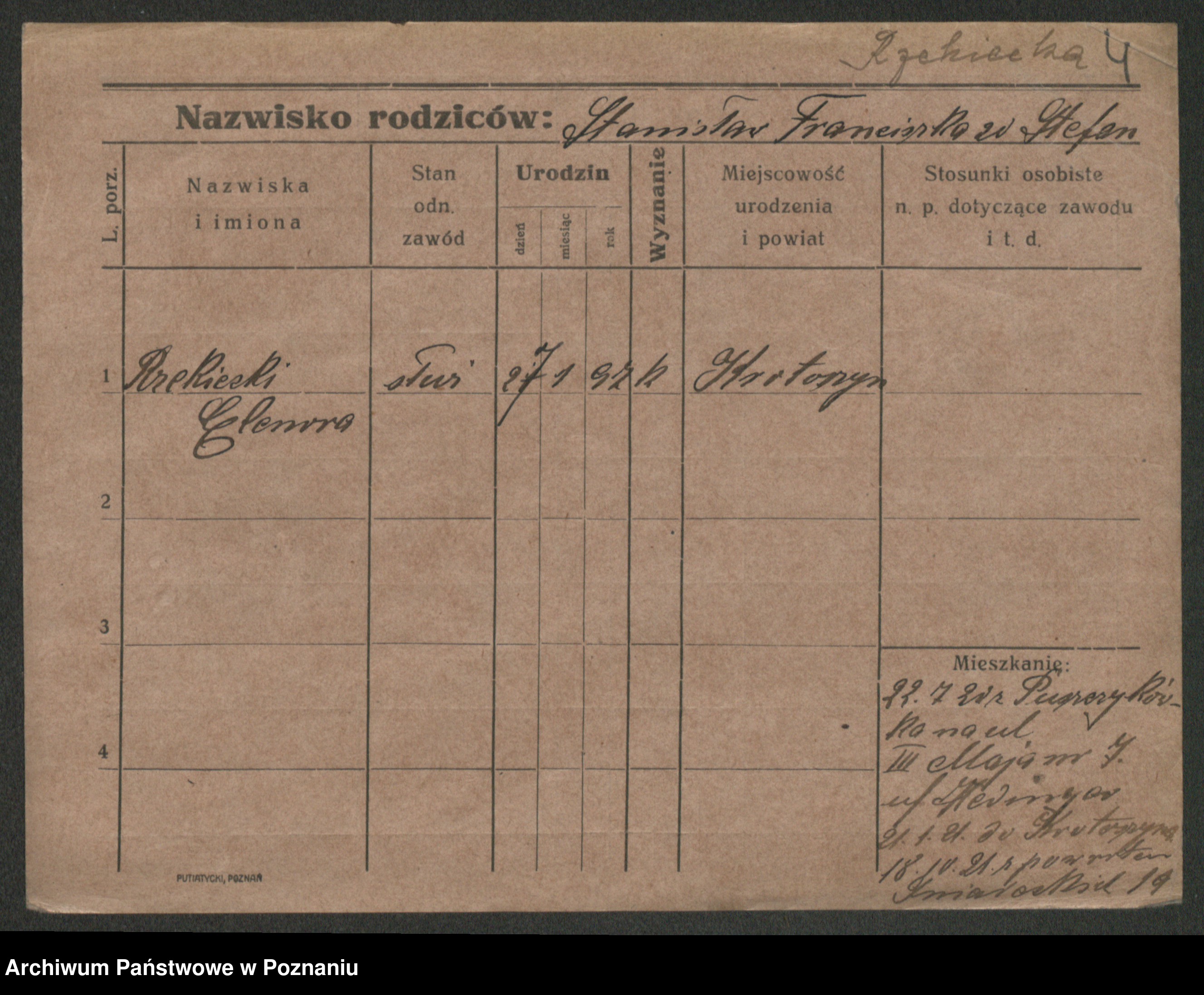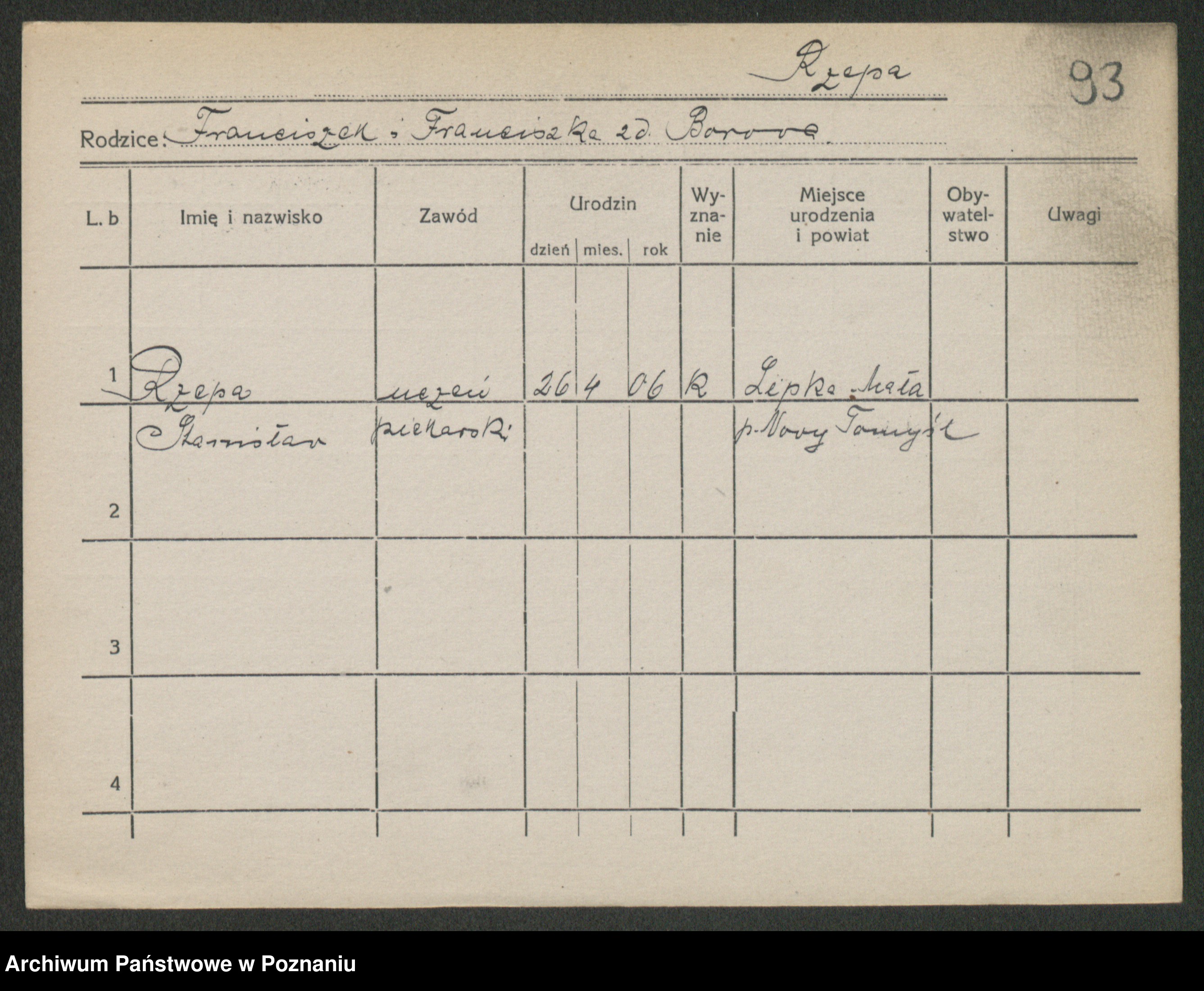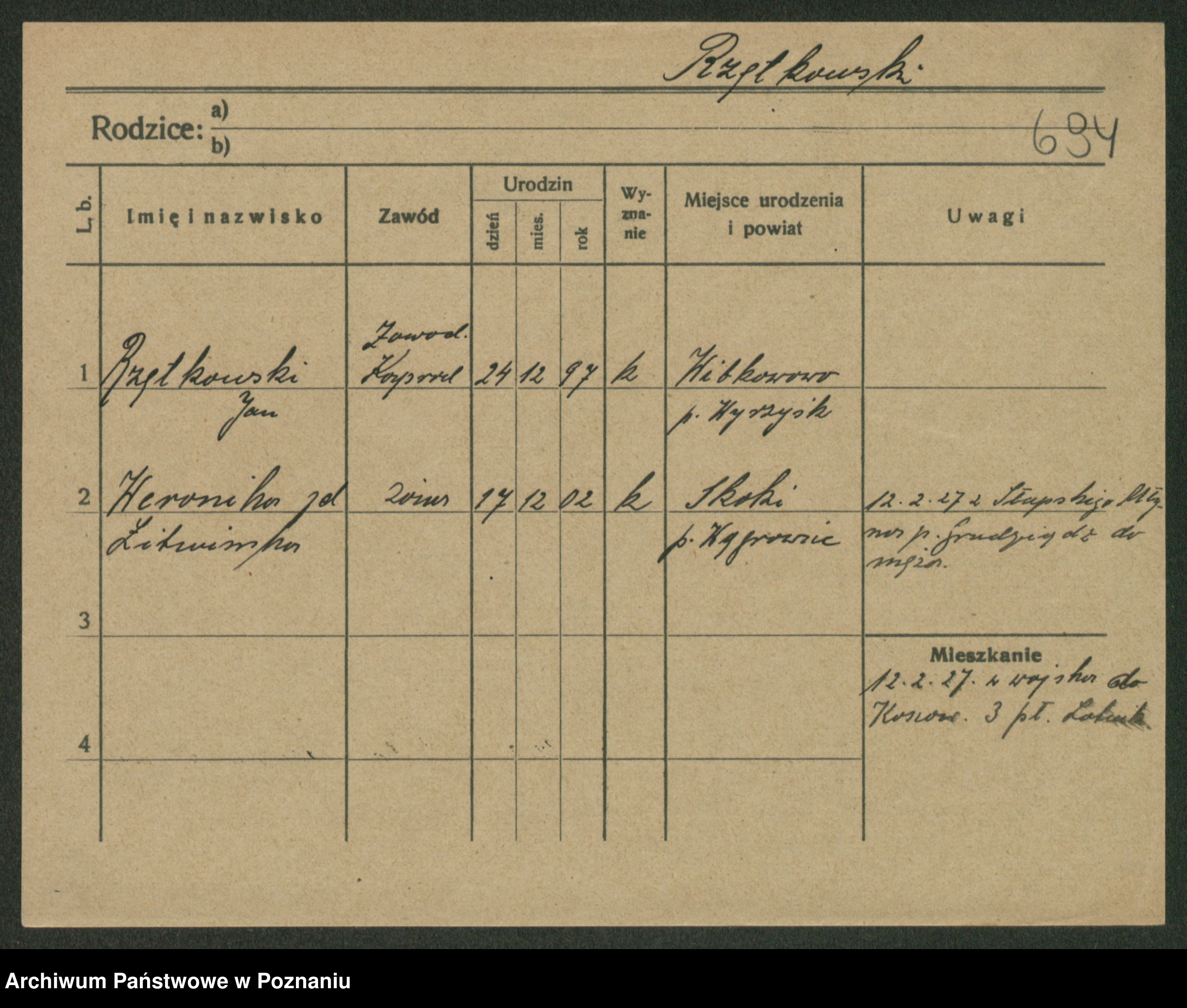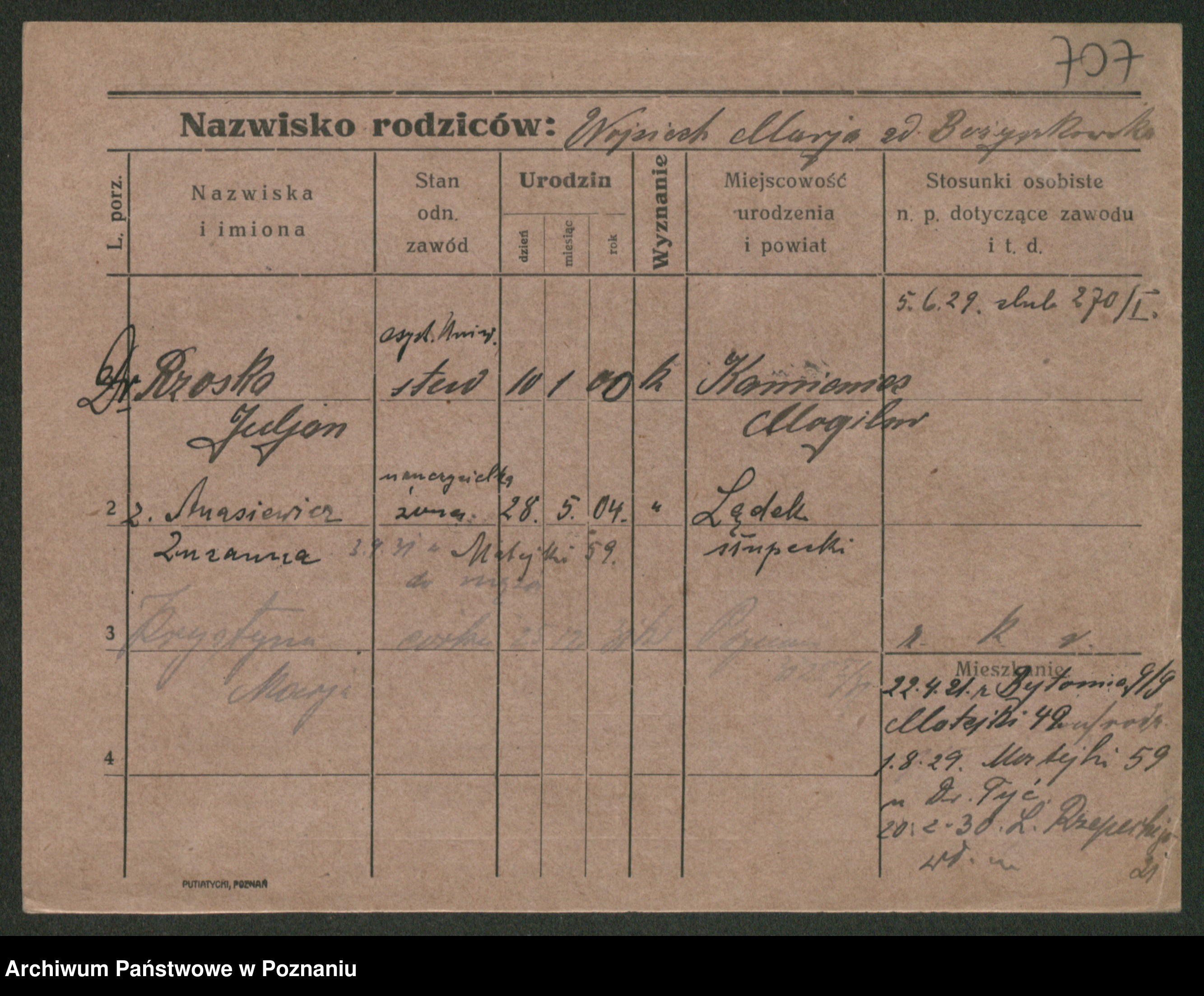 Podgląd karty osobowej dostępny jest po kliknięciu na nazwisko lub ikonkę karty. Można dokonywać powiększenia (ikony na górze) lub przechodzić między kolejnymi skanami (strzałki po bokach).