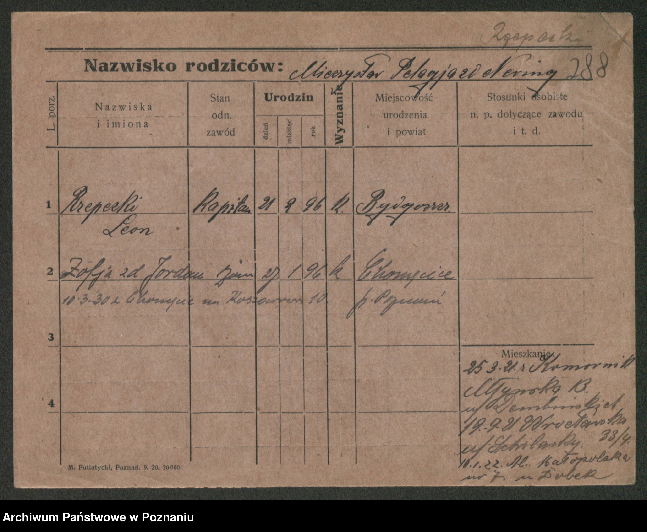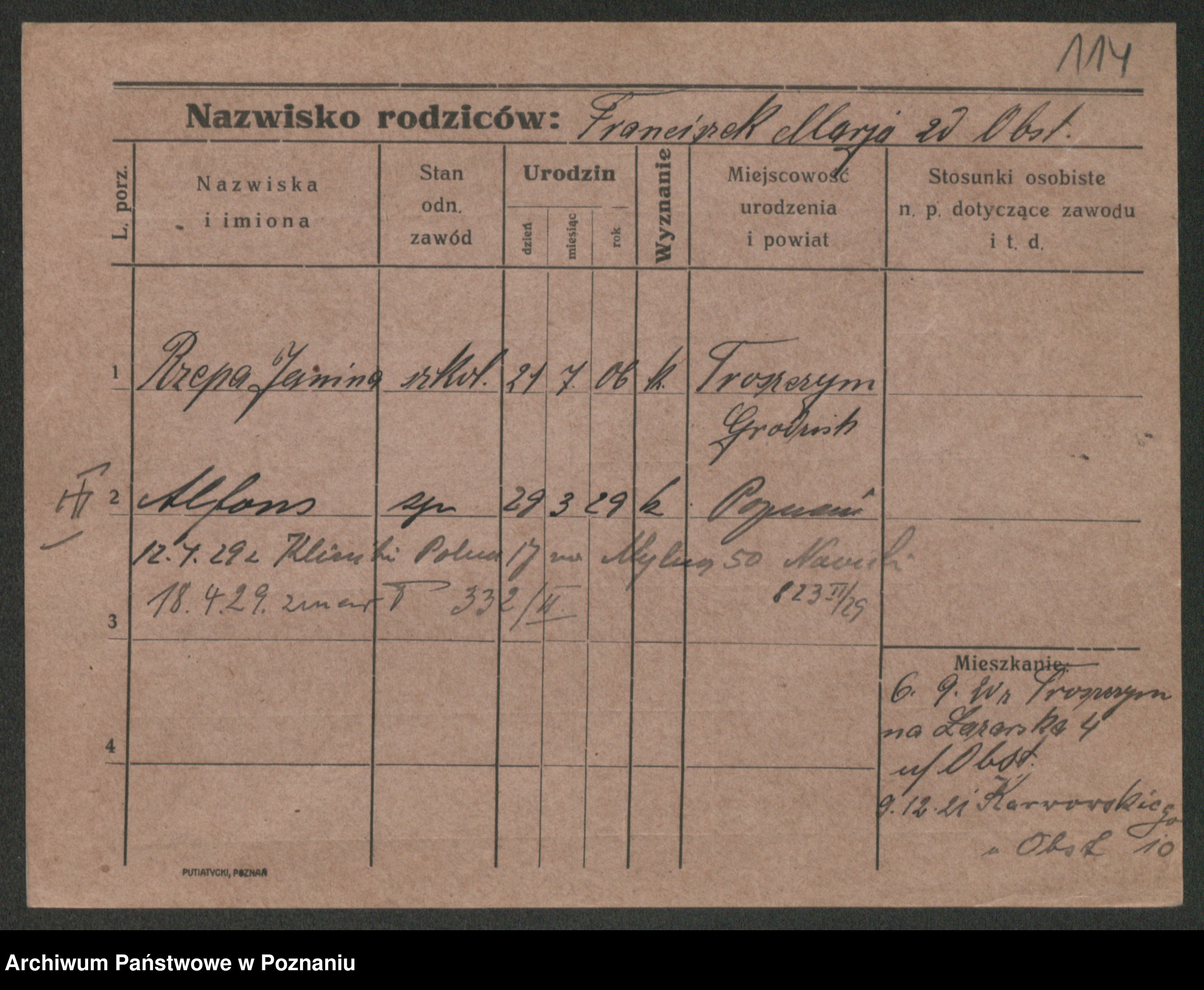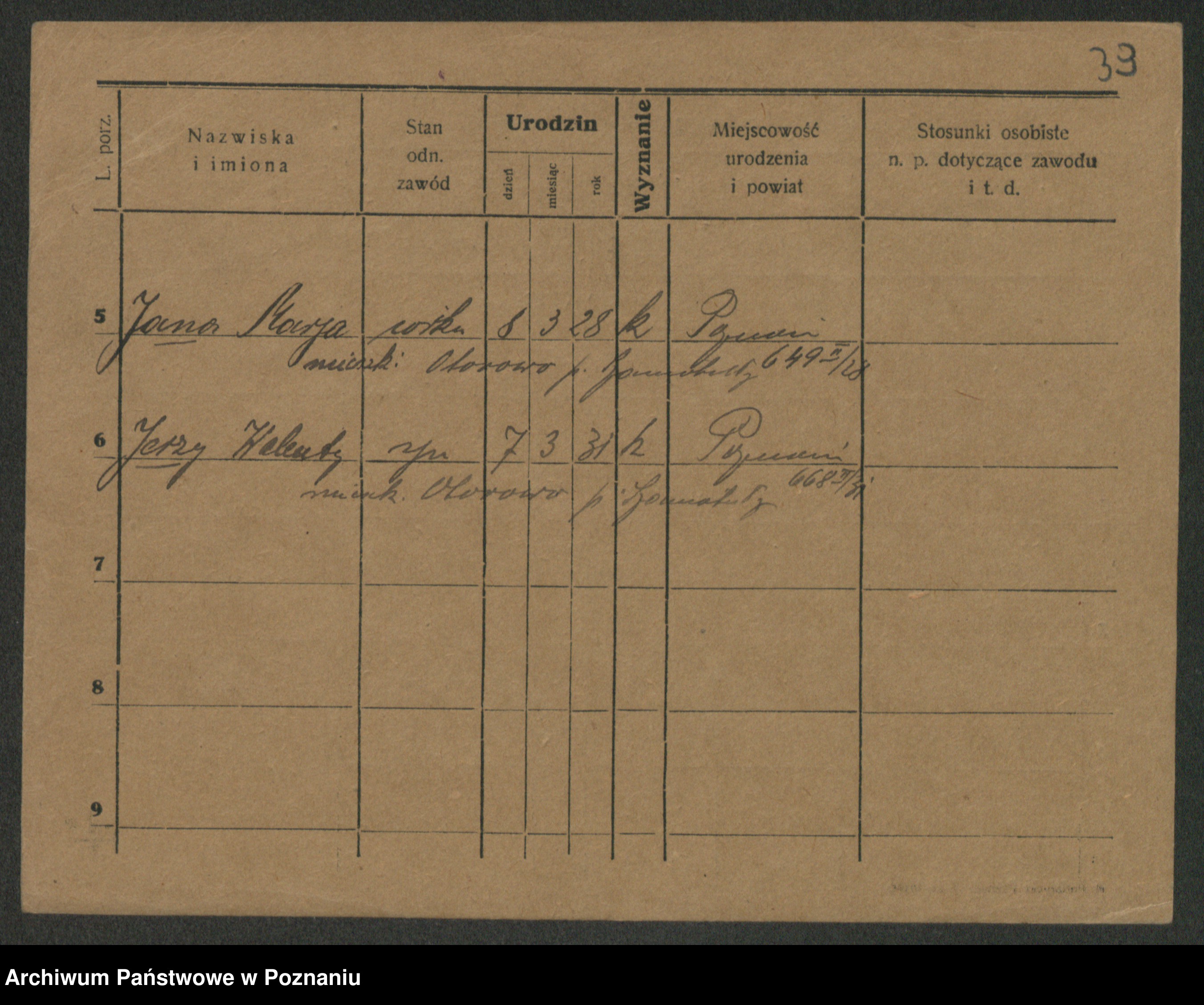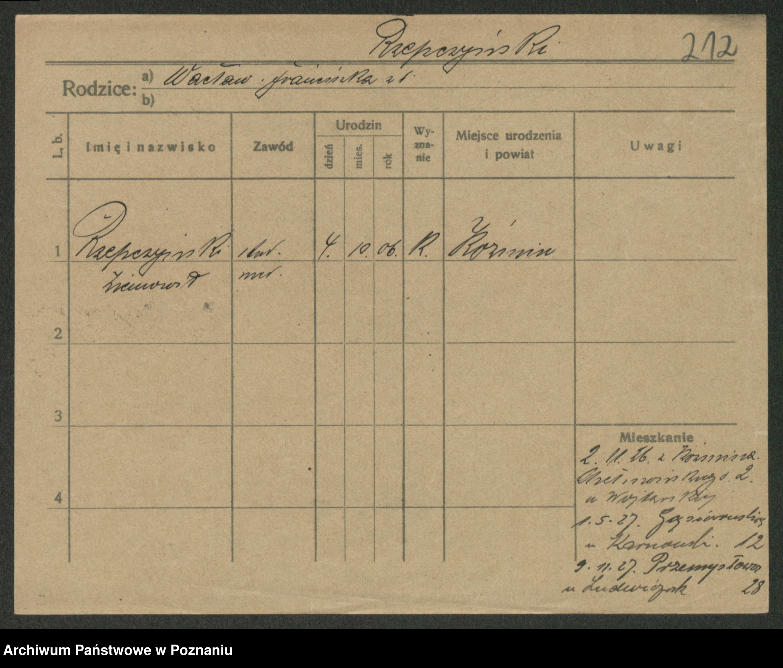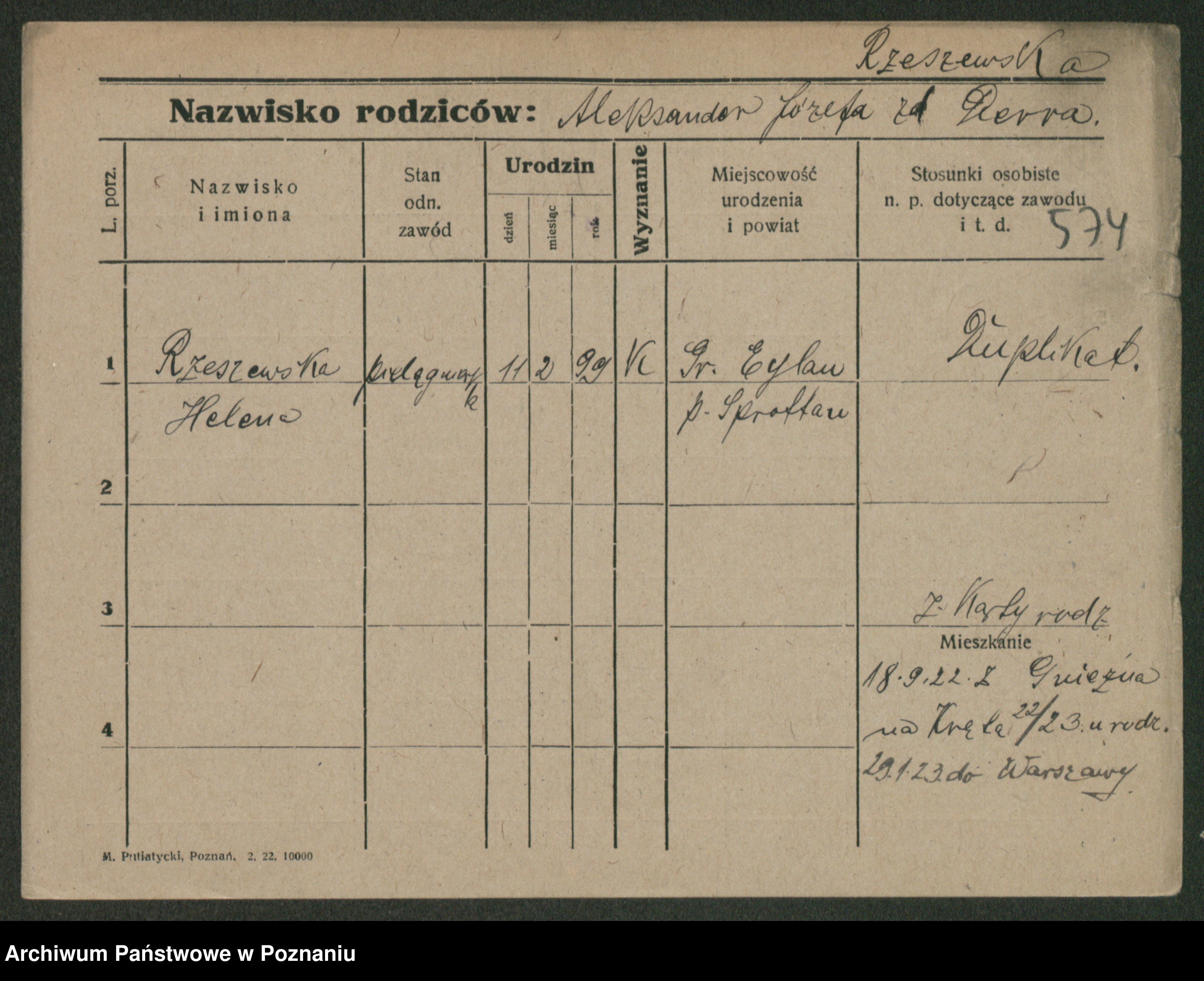 Podgląd karty osobowej dostępny jest po kliknięciu na nazwisko lub ikonkę karty. Można dokonywać powiększenia (ikony na górze) lub przechodzić między kolejnymi skanami (strzałki po bokach).